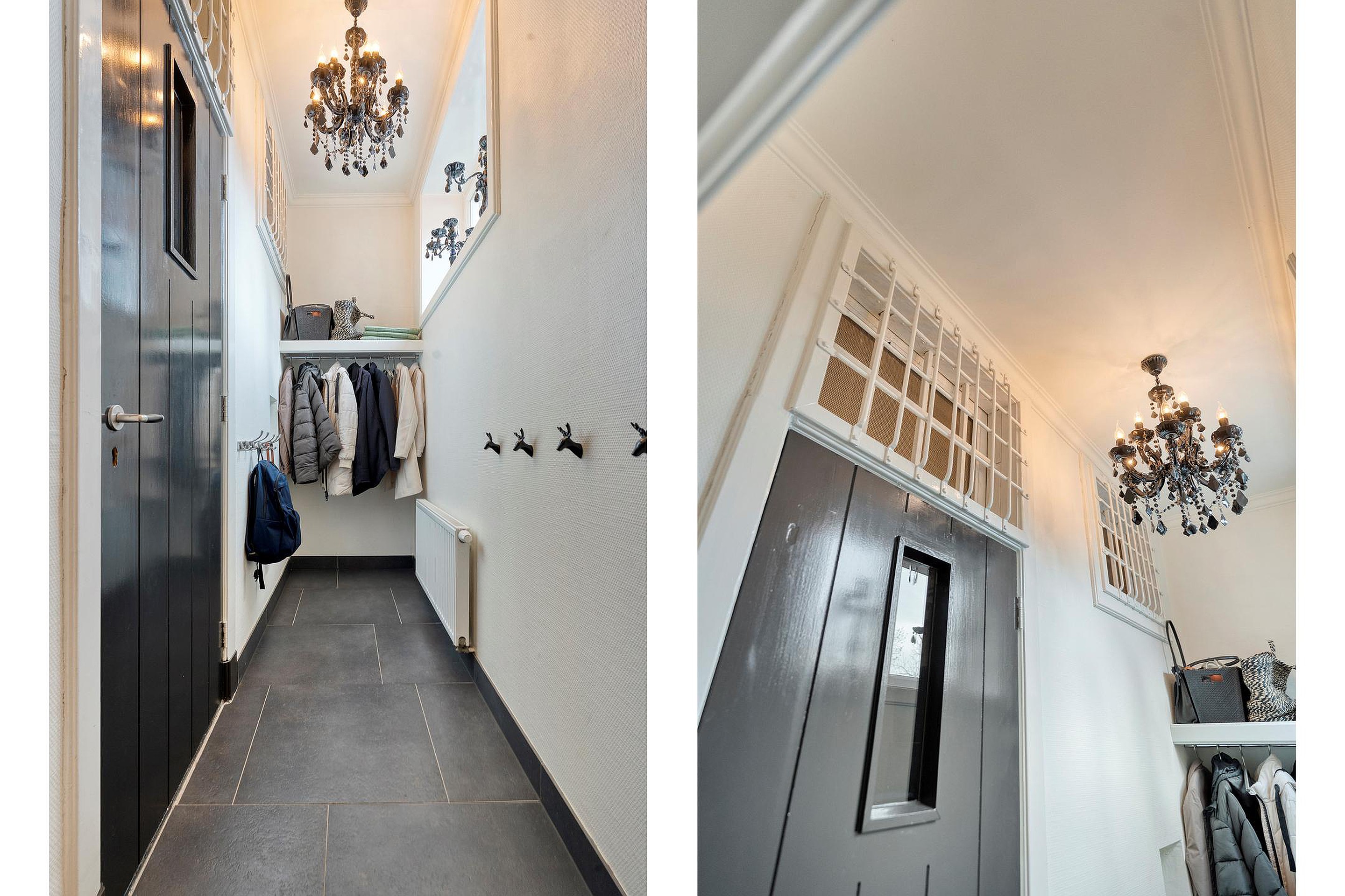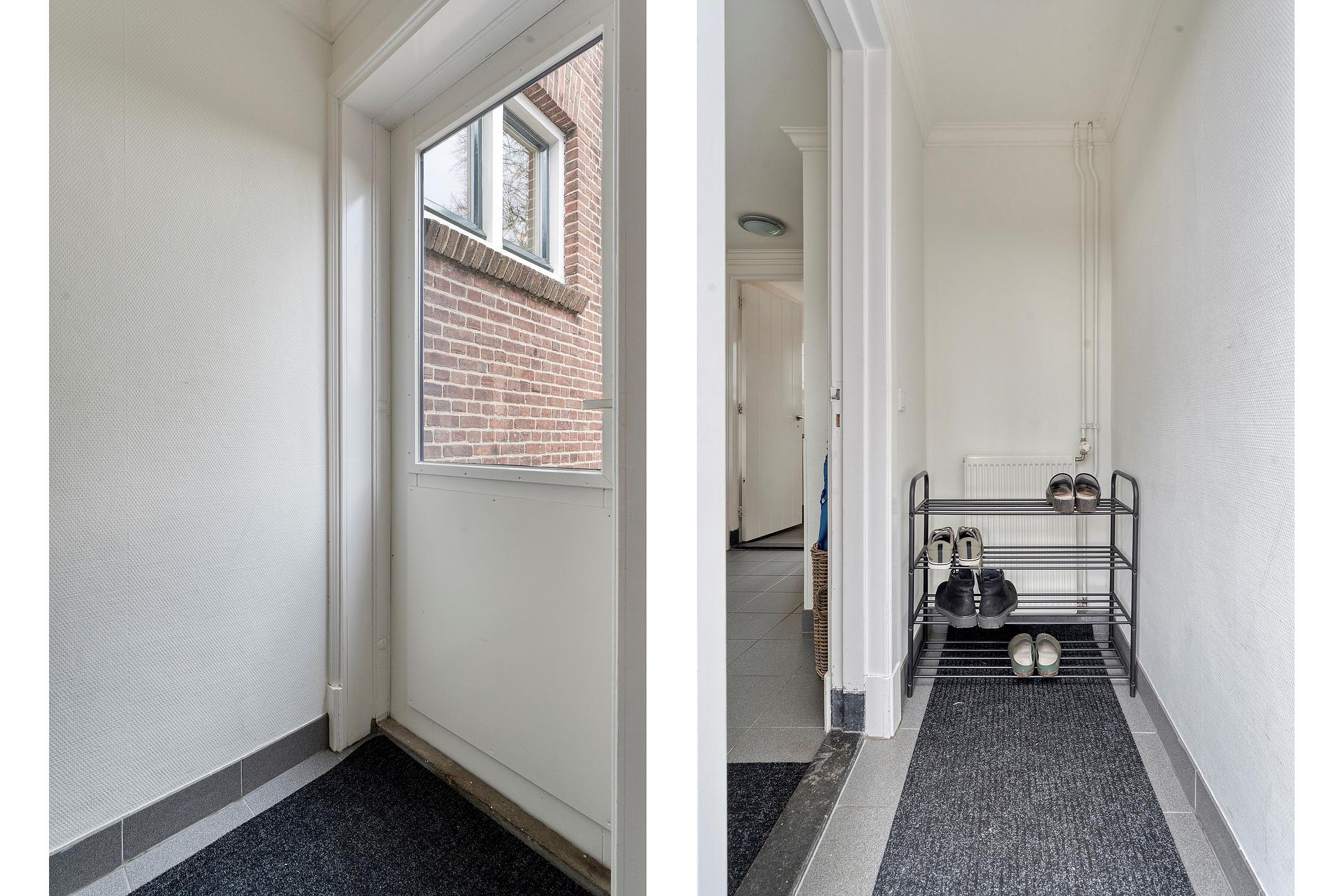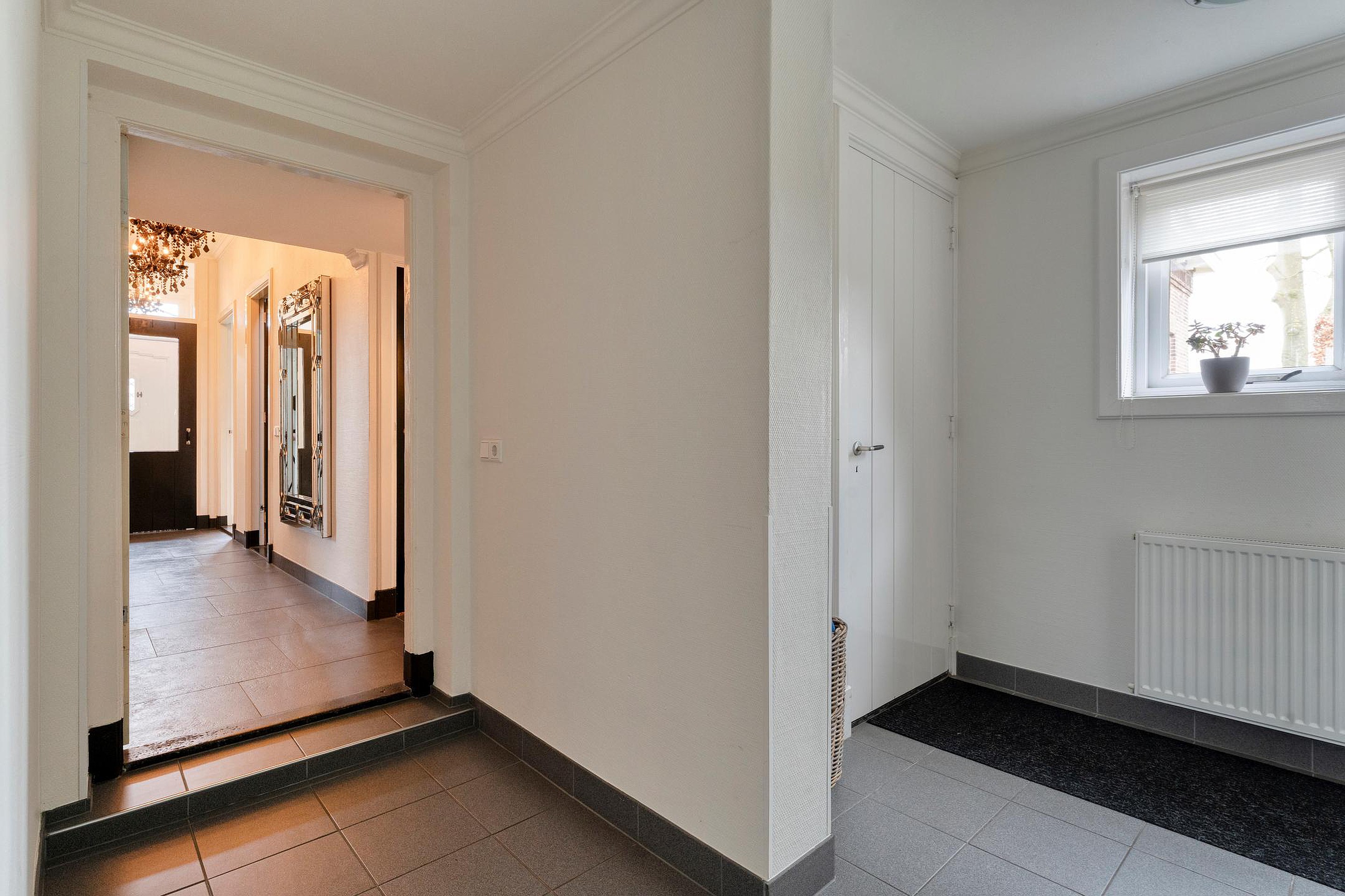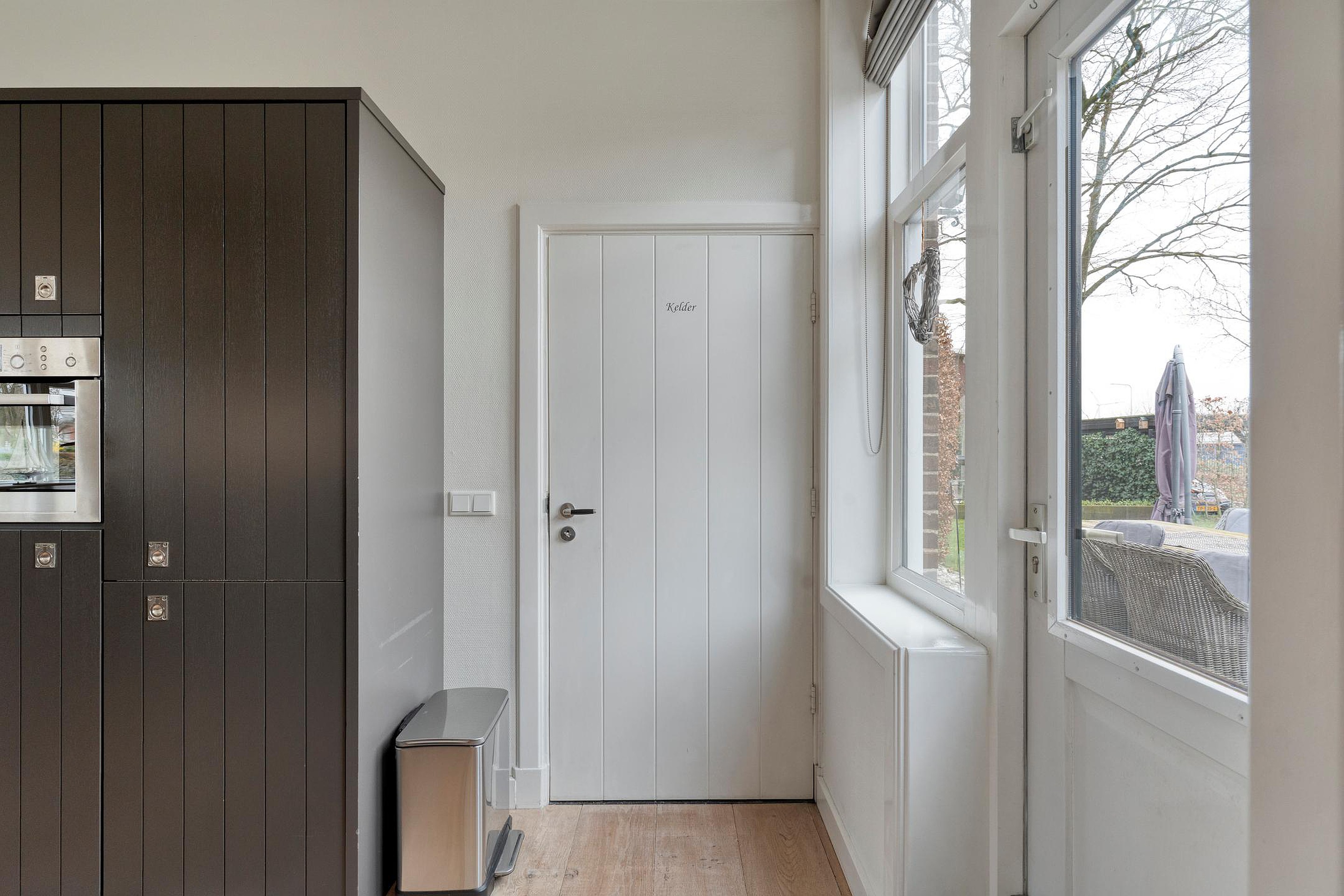 De bijkeuken is voorzien van schoenenkast, deur naarbuiten, wasruimte alsmede de tussenhal.