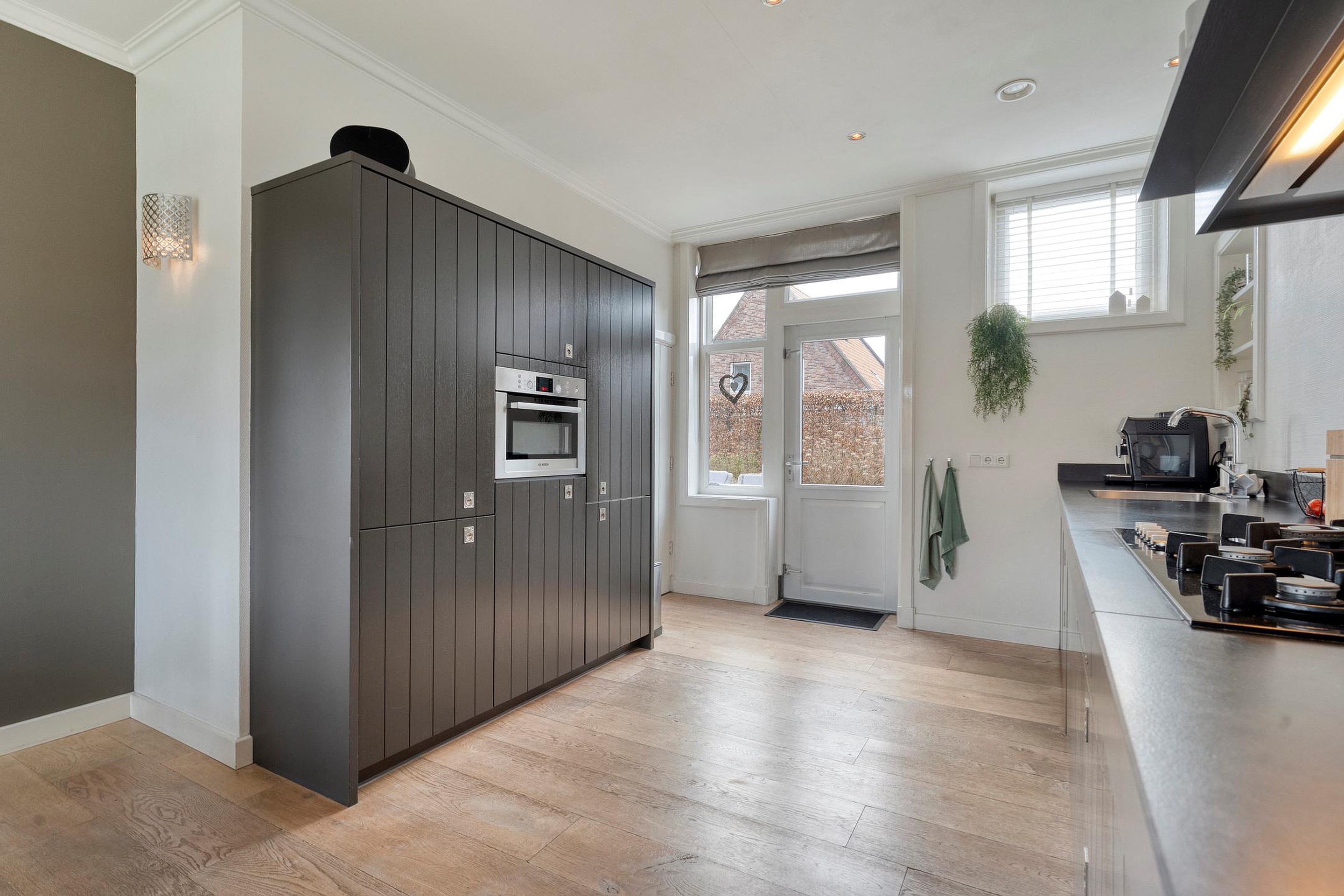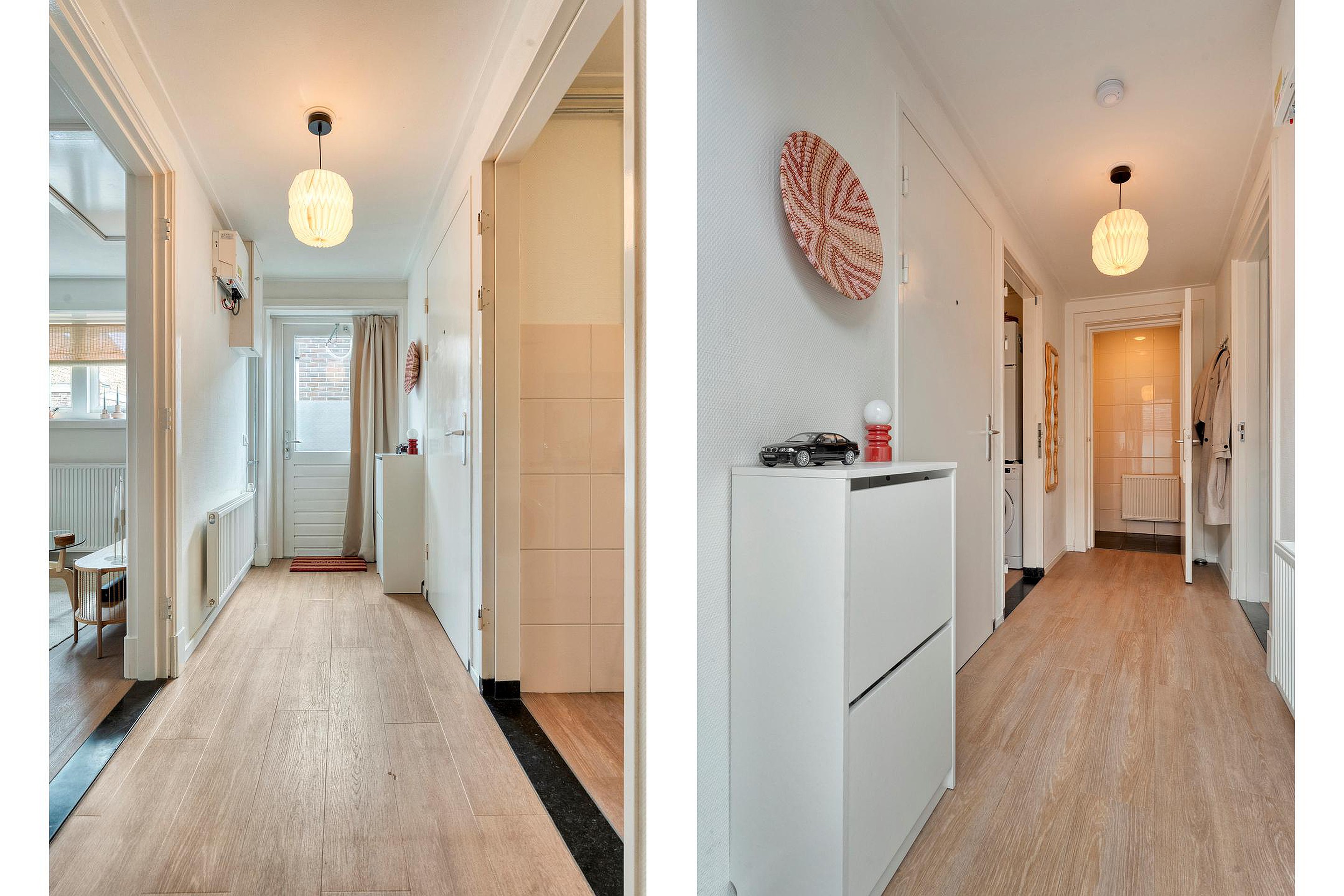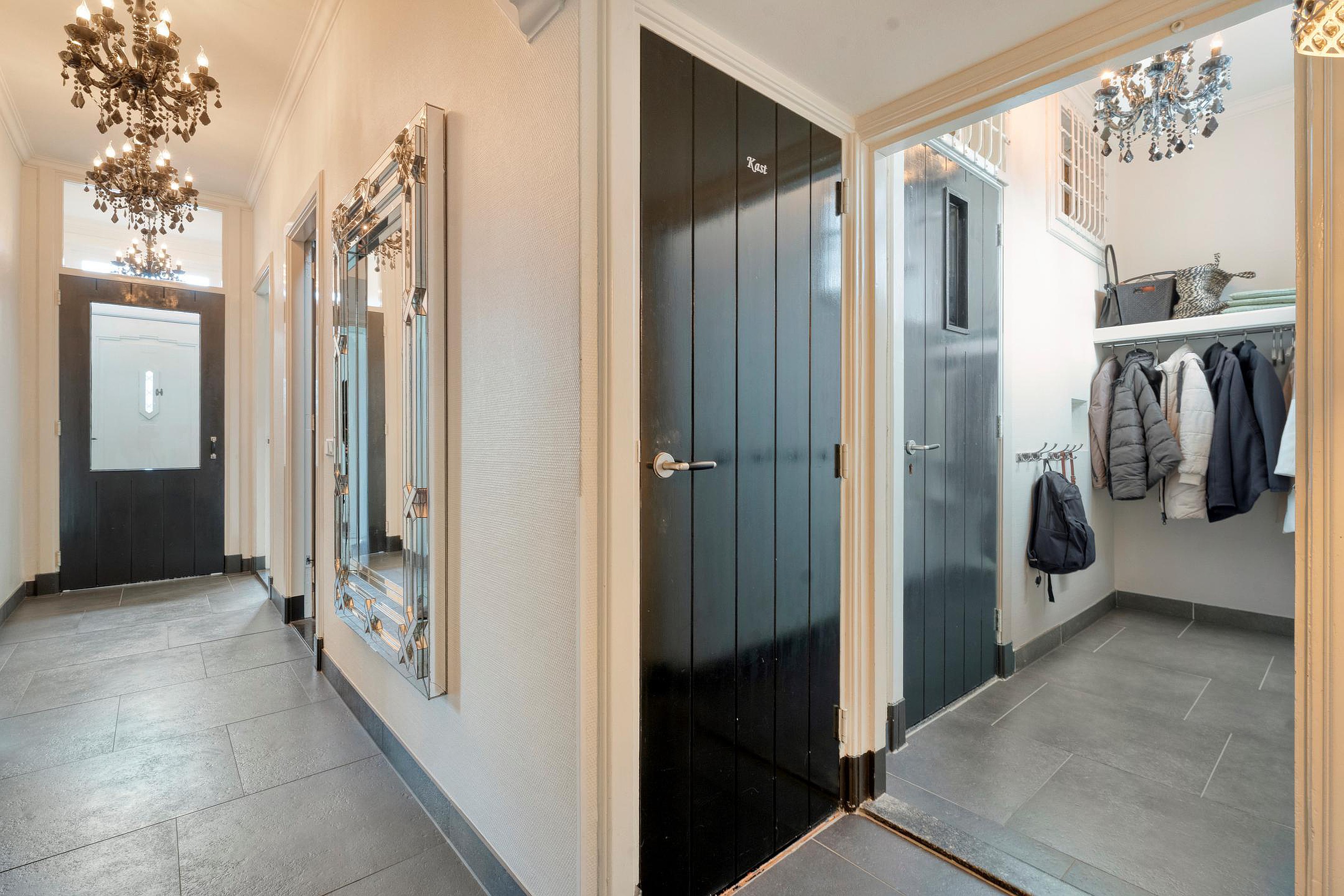 De bijkeuken is voorzien van schoenenkast, deur naarbuiten, wasruimte alsmede de tussenhal.
