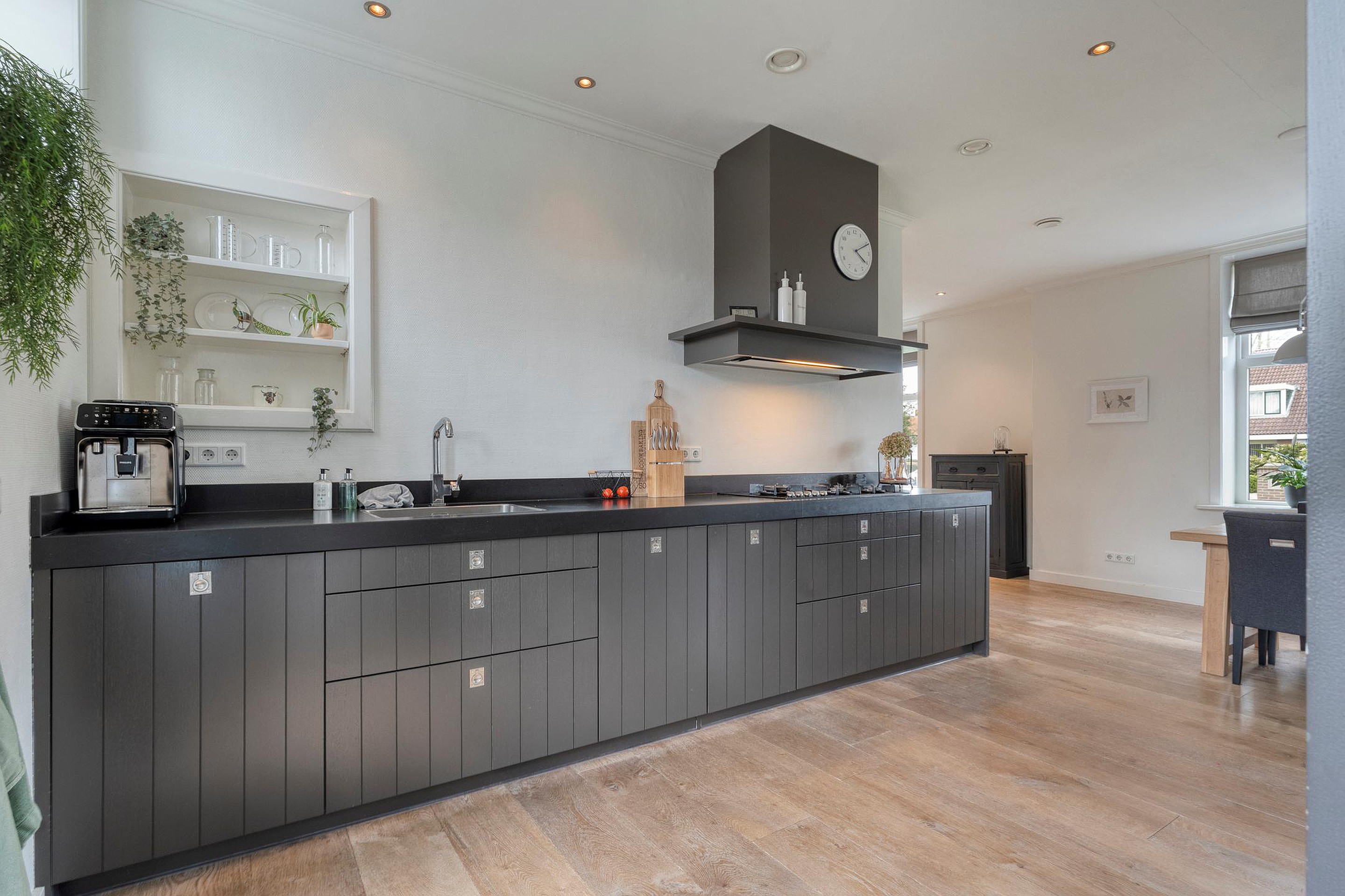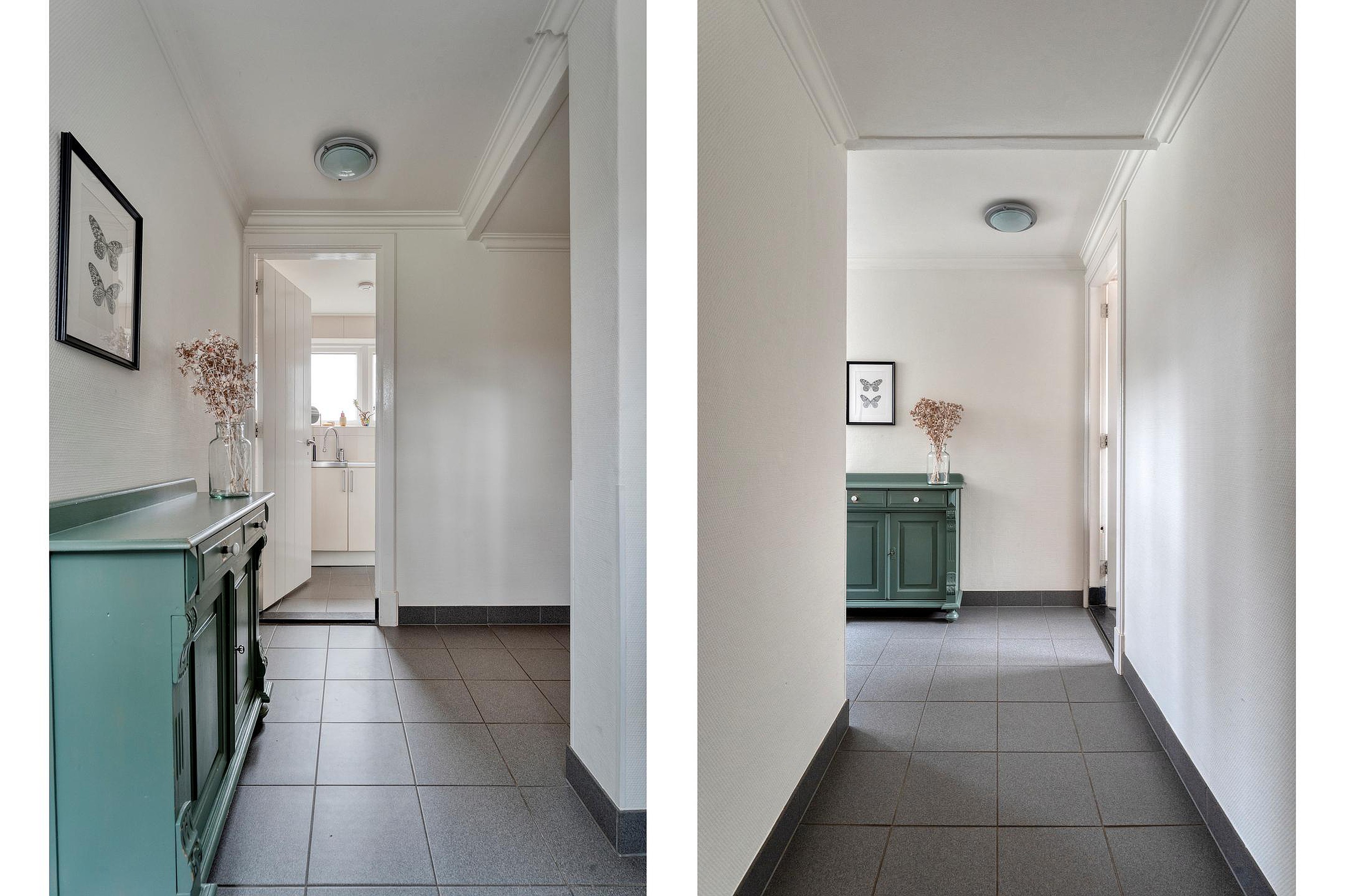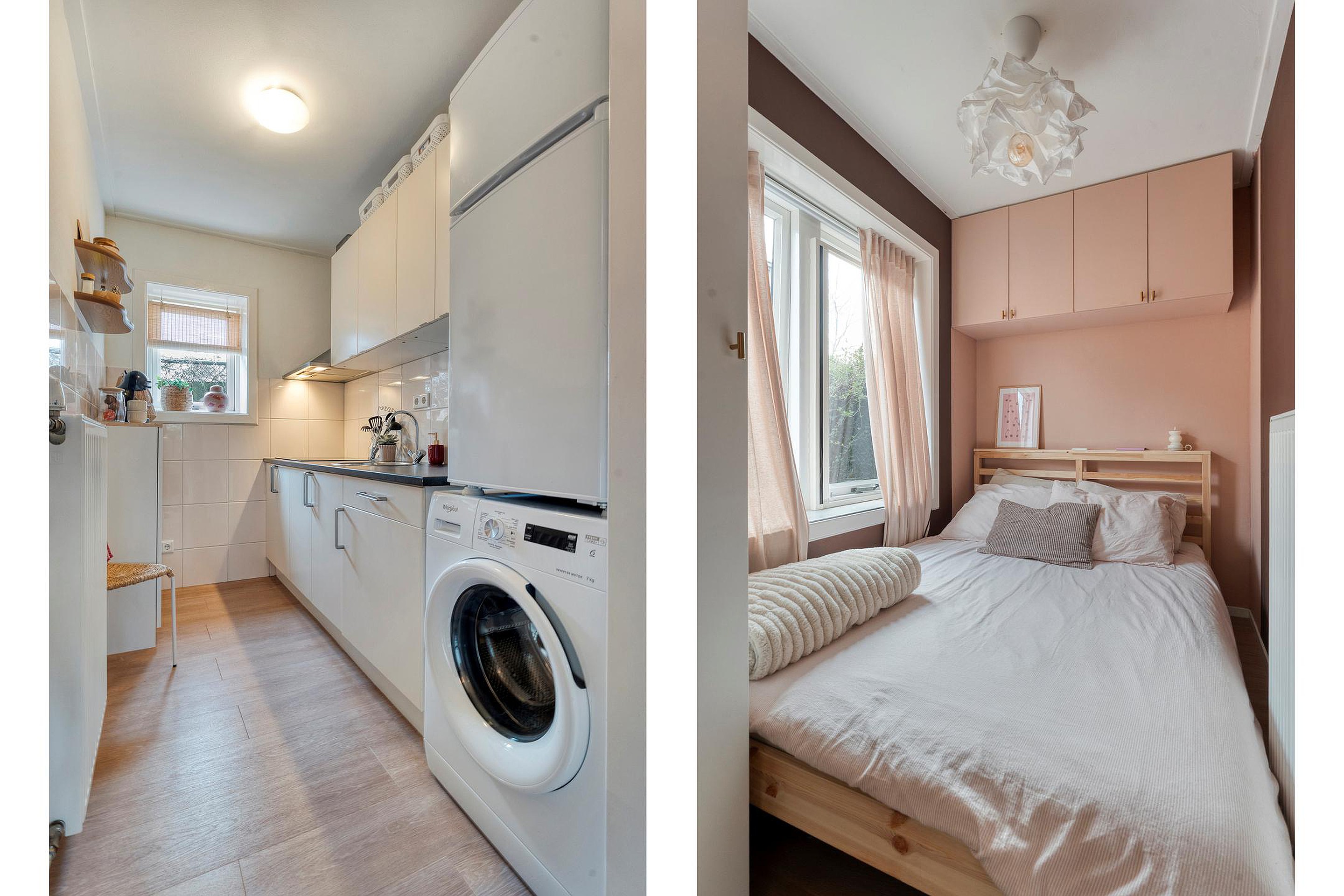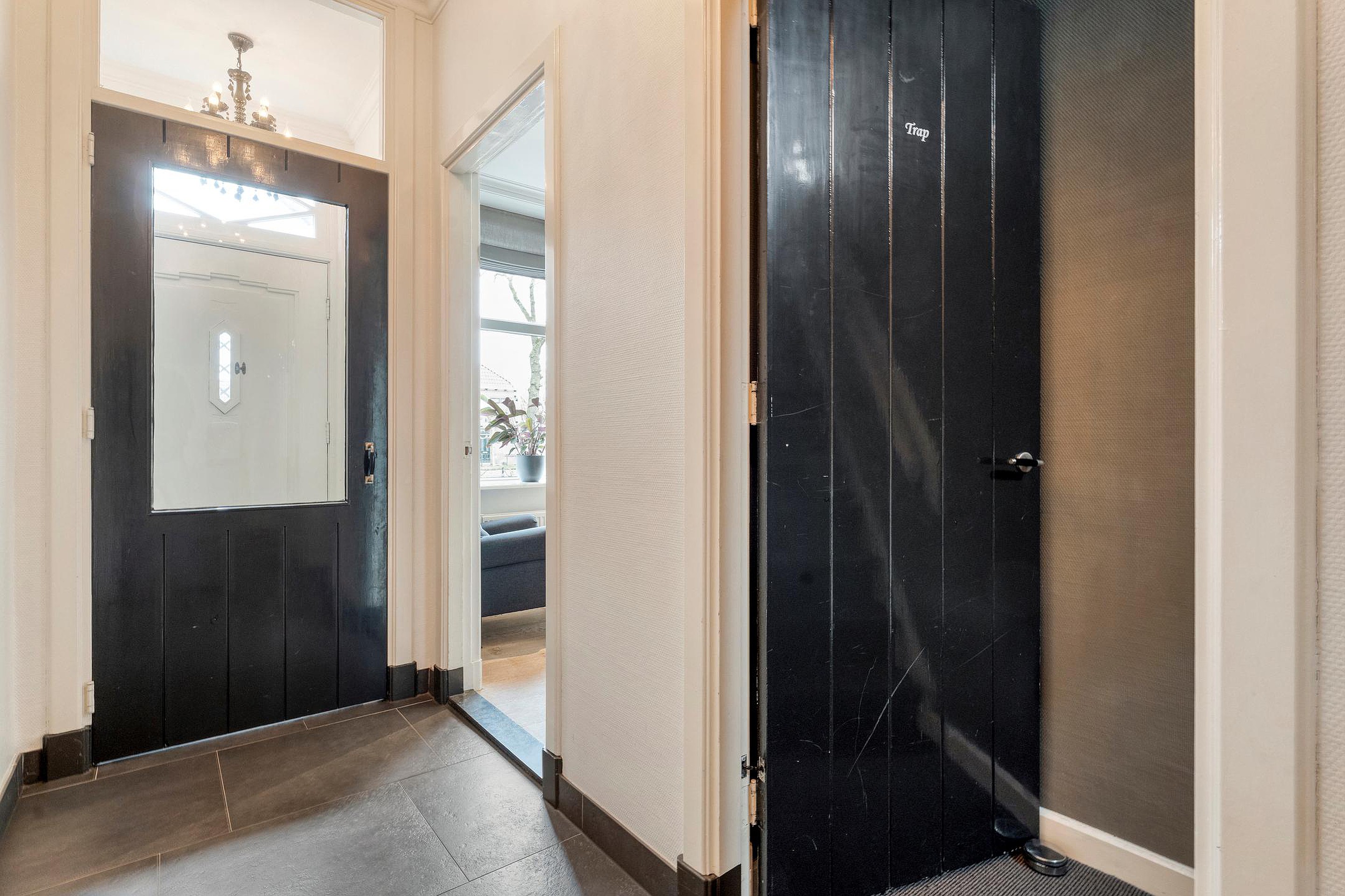 De bijkeuken is voorzien van schoenenkast, deur naarbuiten, wasruimte alsmede de tussenhal.