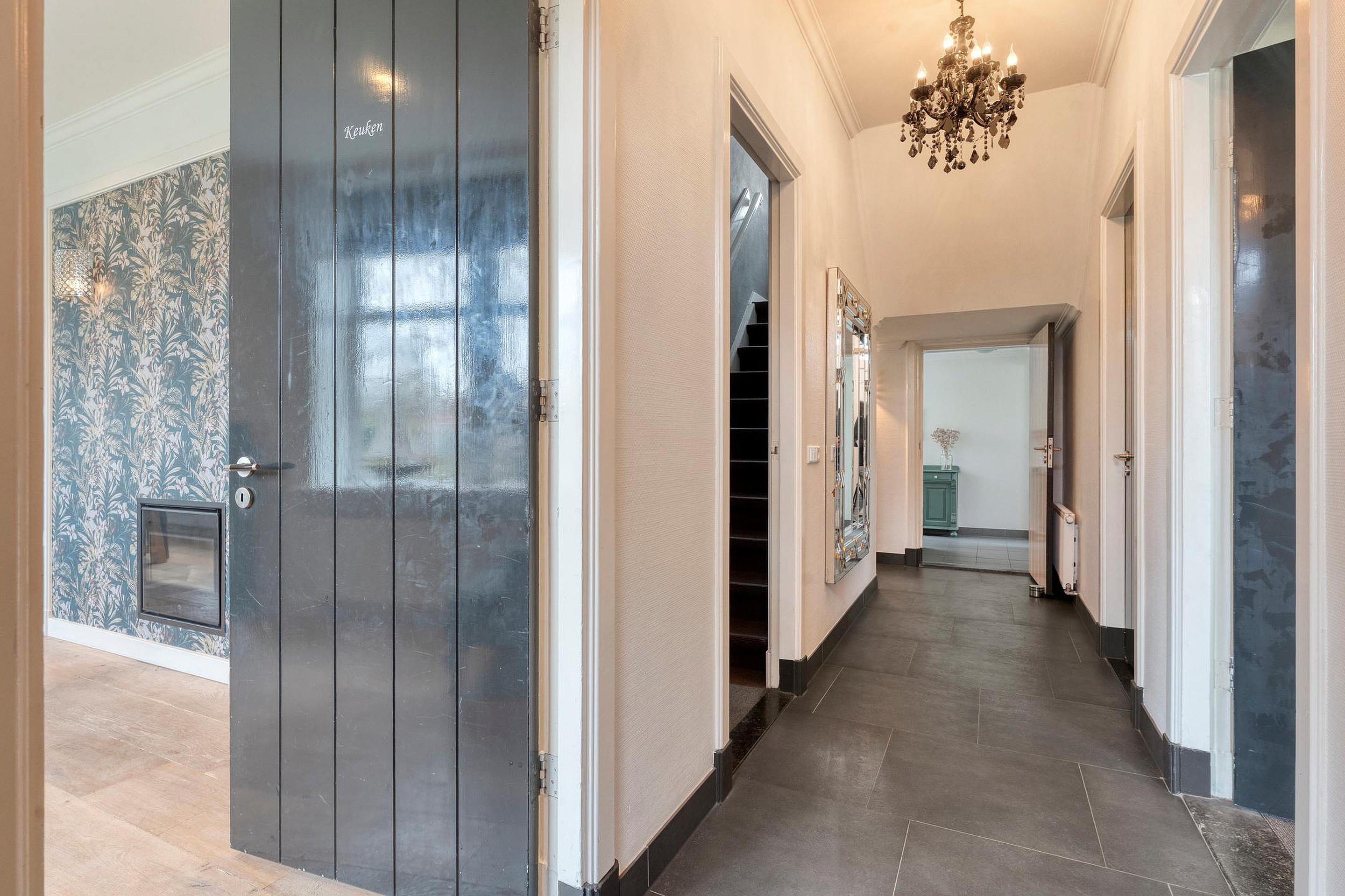 Middels een imposante entree betreedt men de hal van de oude marechaussee kazerne. De hal die vroeger toegang gaf tot de vroegere balie wat nu kantoorruimte is en de wapenkamer wat nu fungeert als toiletruimte met fonteintje. Aan de linkerzijde van de woning vindt u de royale woonkeuken met toegang tot de achtertuin, maar ook toegang tot de kelderruimte alsmede de woonkamer met kamer-en-suite deuren.