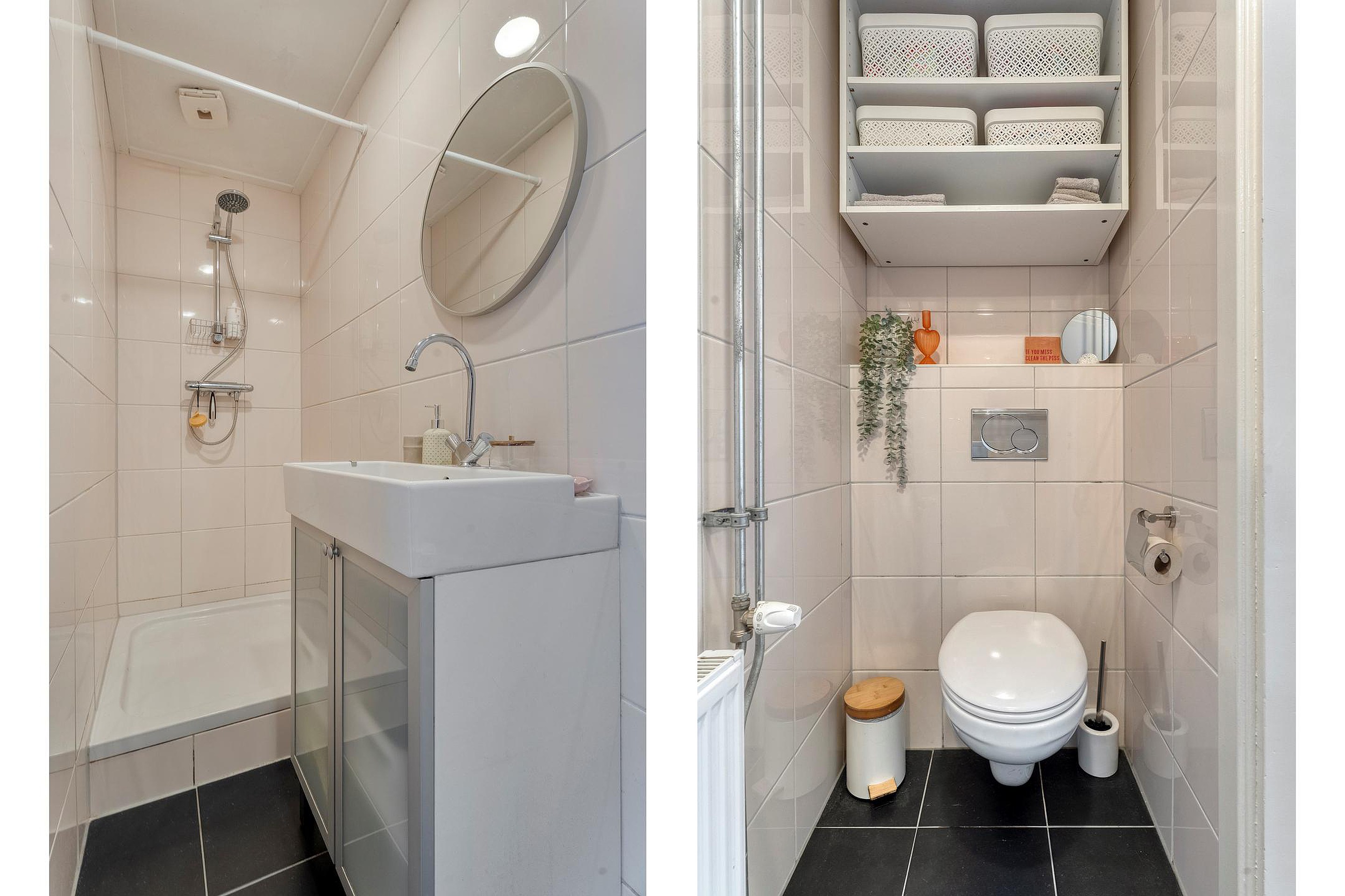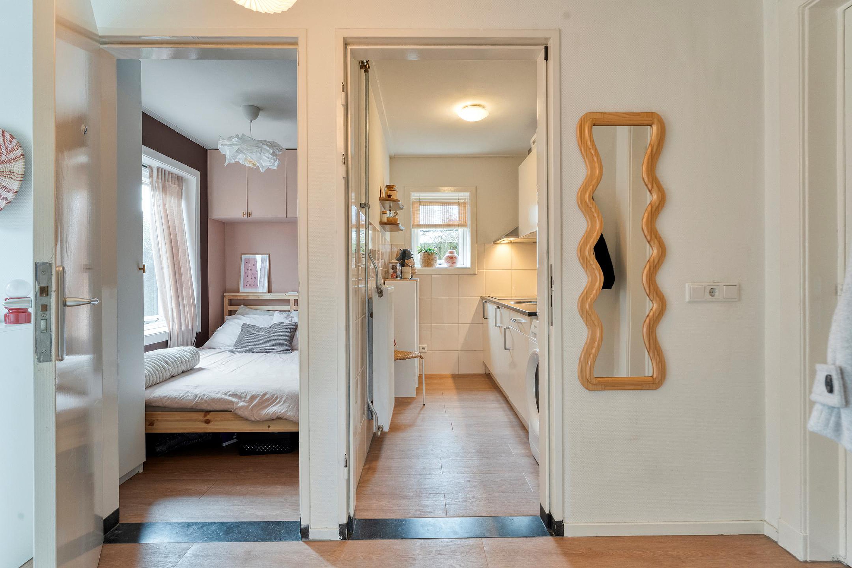 Een separate hal met meterkast biedt toegang tot een woonkamer, keukenruimte (met keramische kookplaat en afzuigkap), badkamer v.v. douche, wastafel, toilet en één slaapkamer.