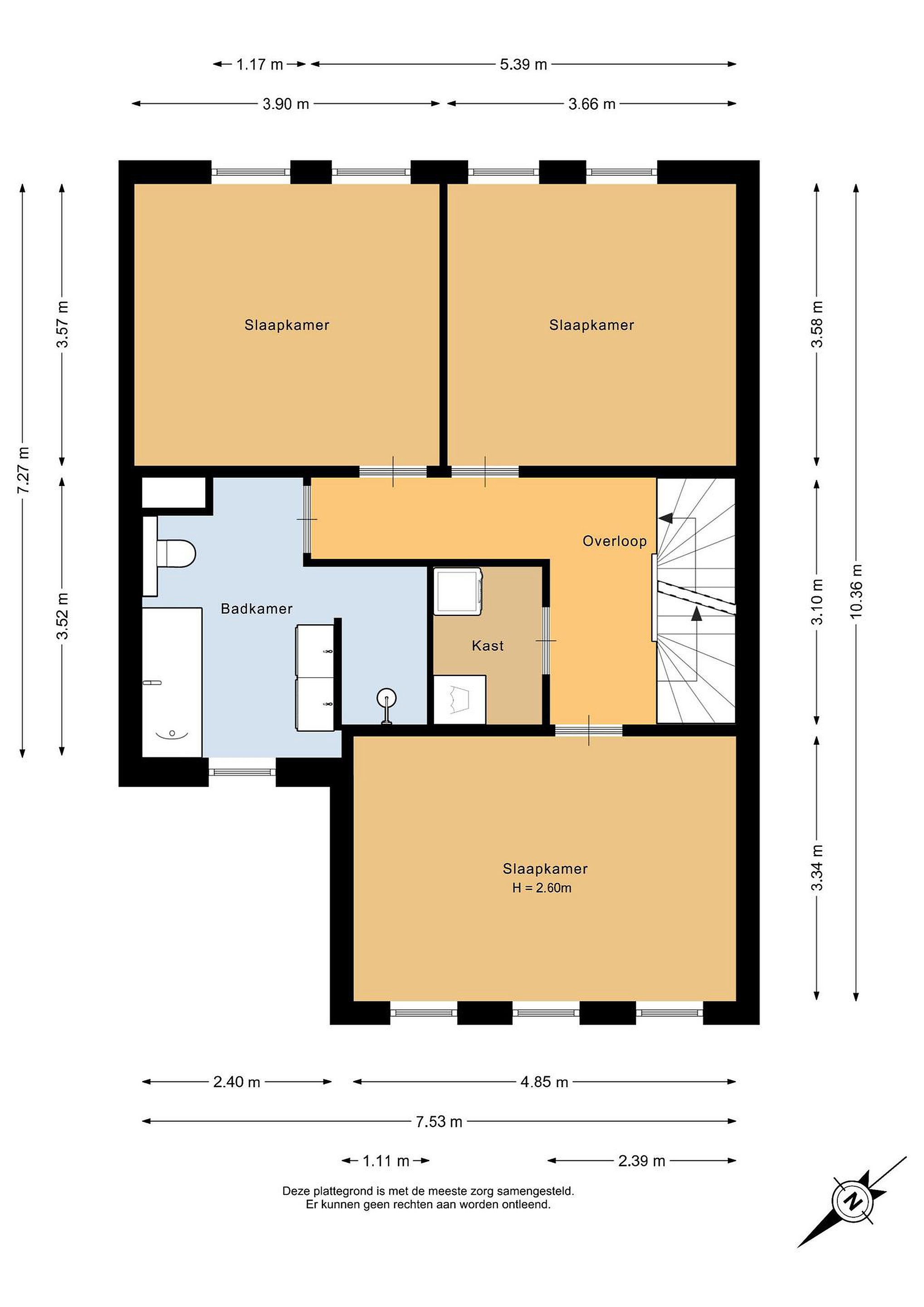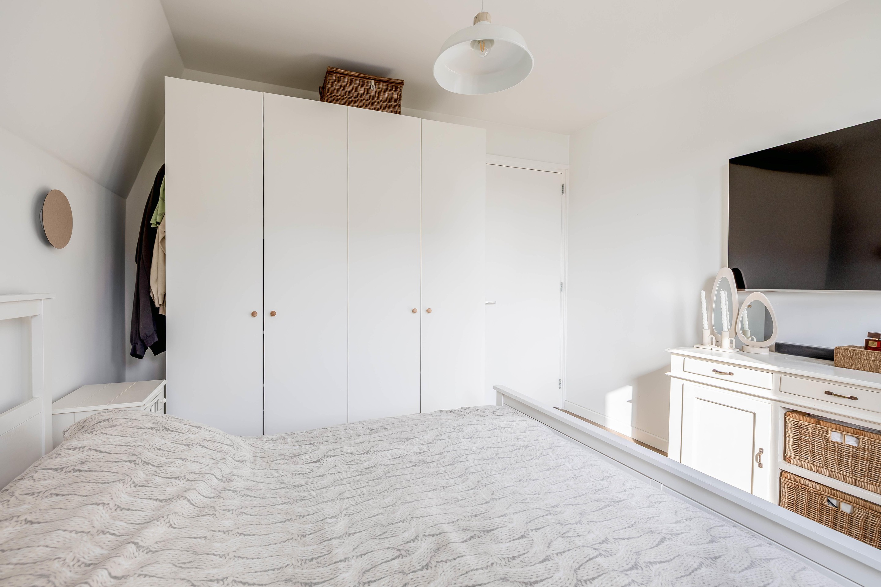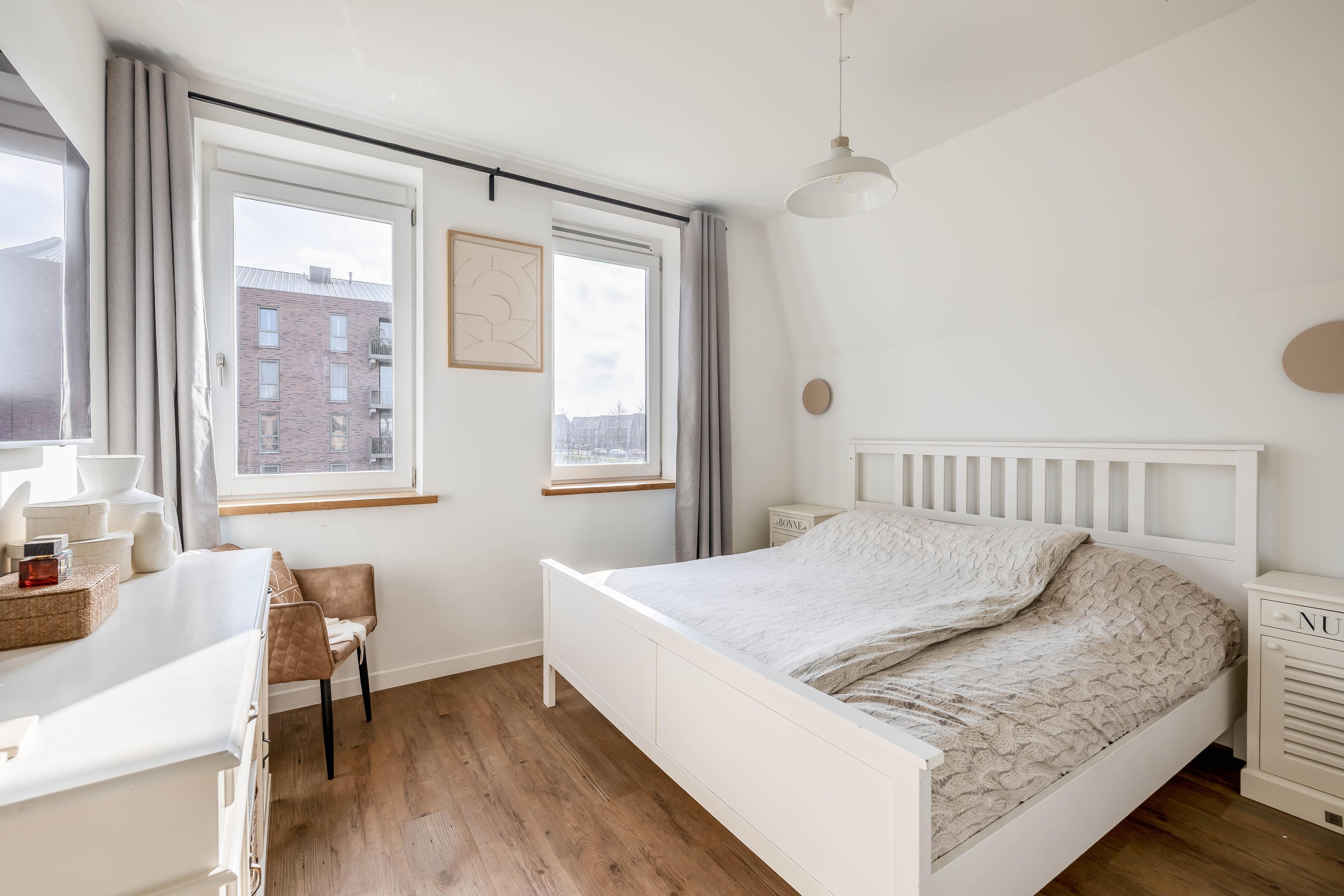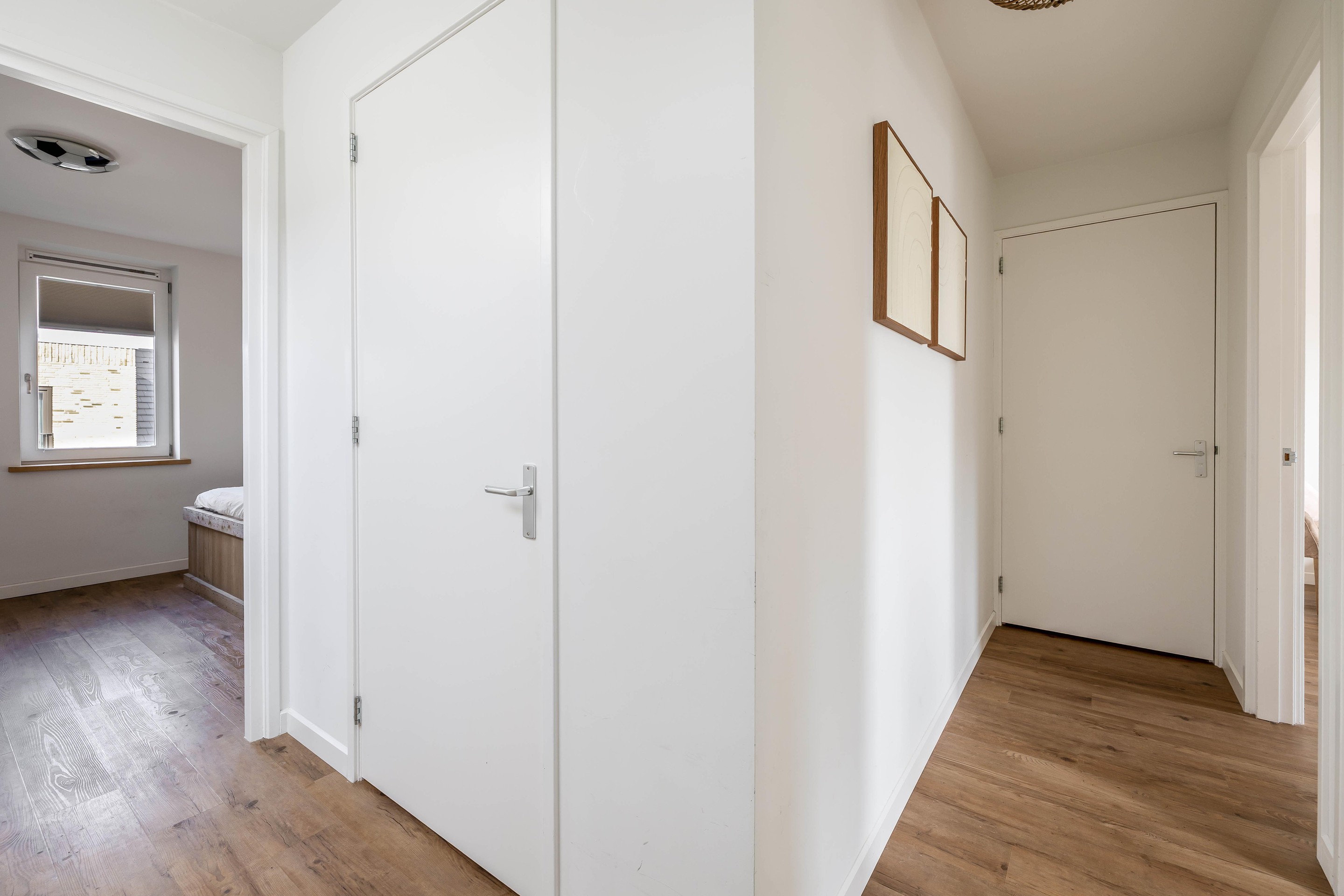 De overloop op de eerste verdieping biedt toegang tot drie volwaardige slaapkamers, waarbij de master bedroom direct indruk maakt. Deze master bedroom aan de voorzijde strekt zich uit over de volledige breedte van de woning (4,85 m) en heeft een plafondhoogte van 2,60 meter, wat zorgt voor een rustgevende en luchtige sfeer. Aan de achterzijde bevinden zich nog twee slaapkamers van uitstekend formaat, ideaal als kinder- of logeerkamers.