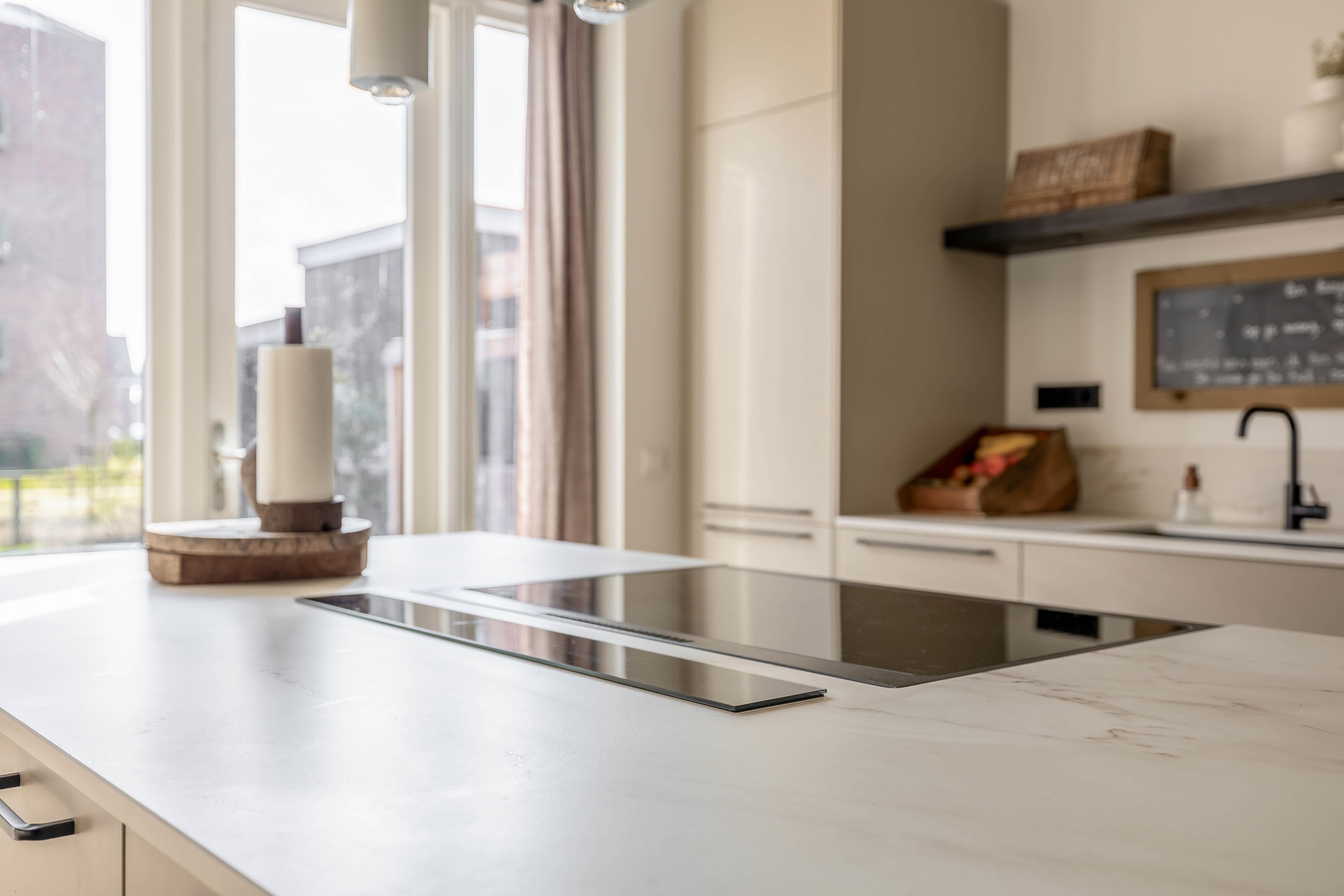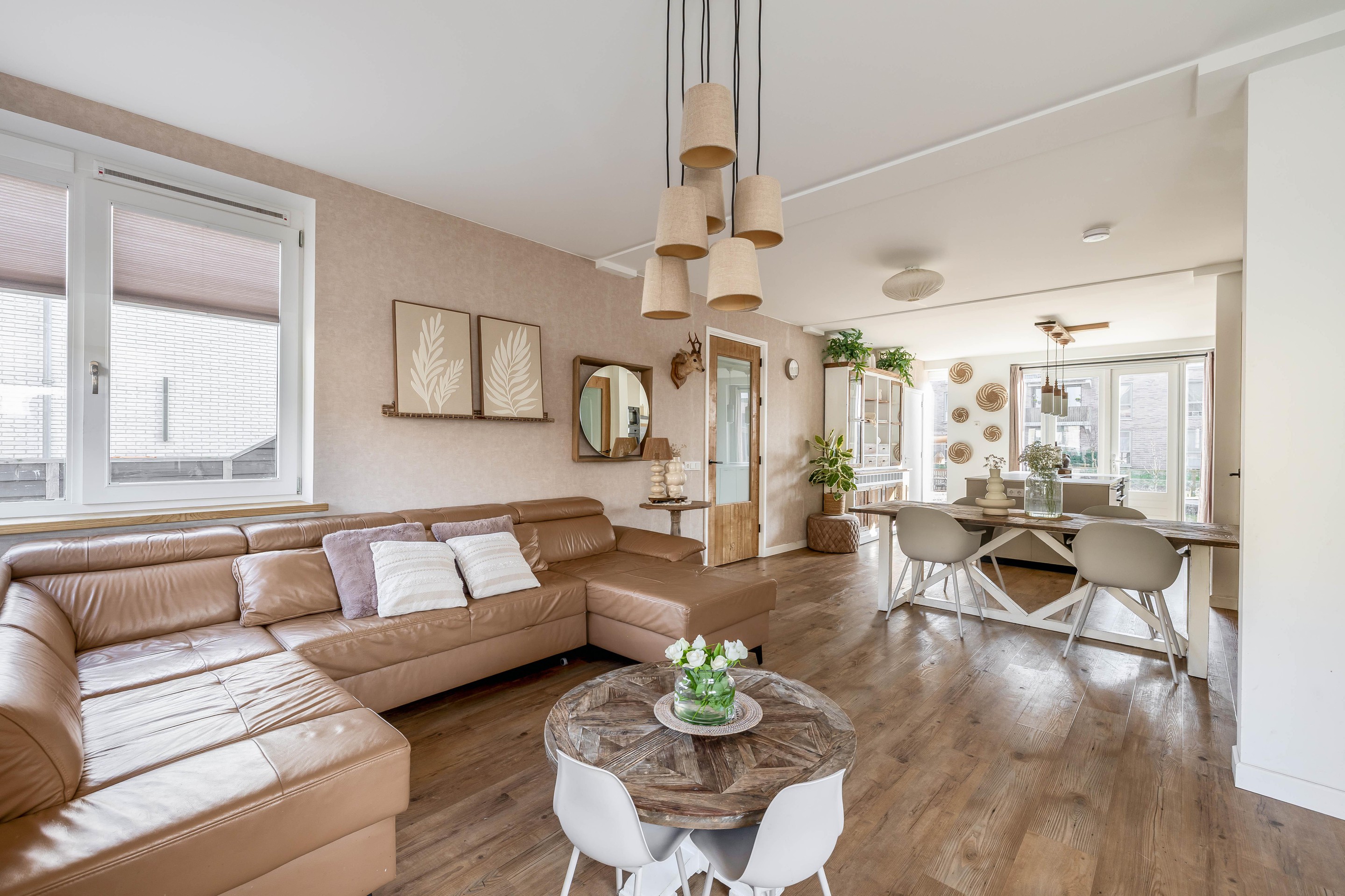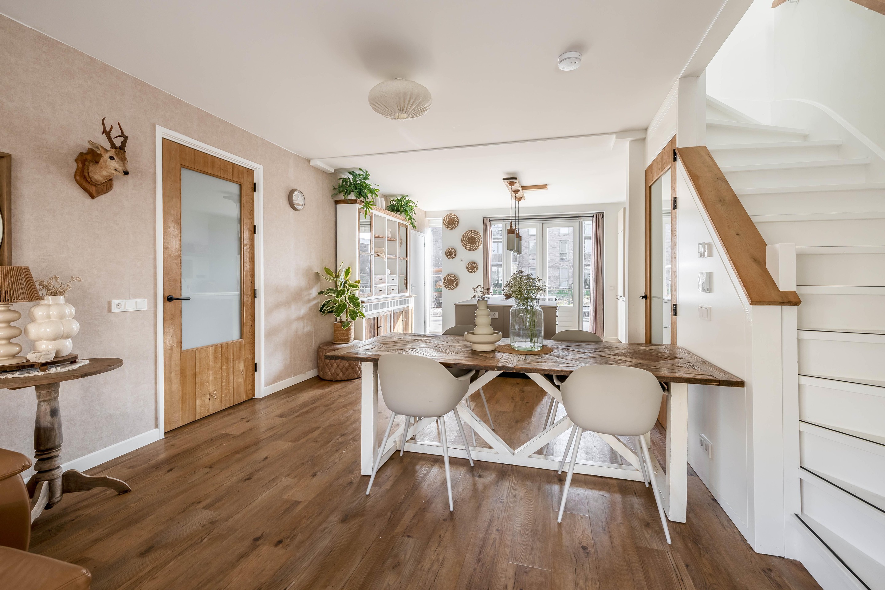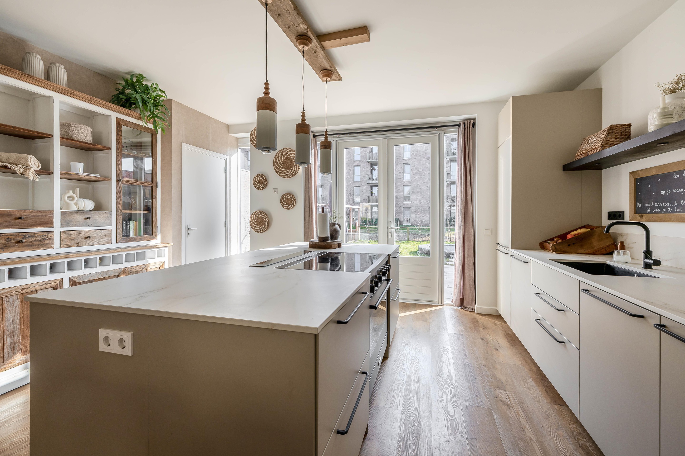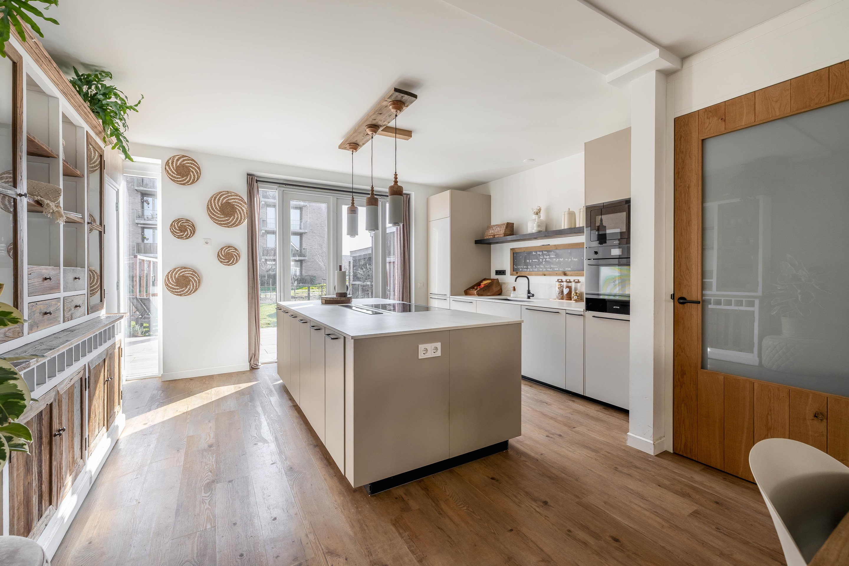 De centrale eetkamer vormt het hart van de woning en verbindt de zithoek naadloos met de open leefkeuken. De keuken is uitgerust met een royaal kookeiland en kwaliteitsapparatuur van Smeg en Bosch/Siemens.