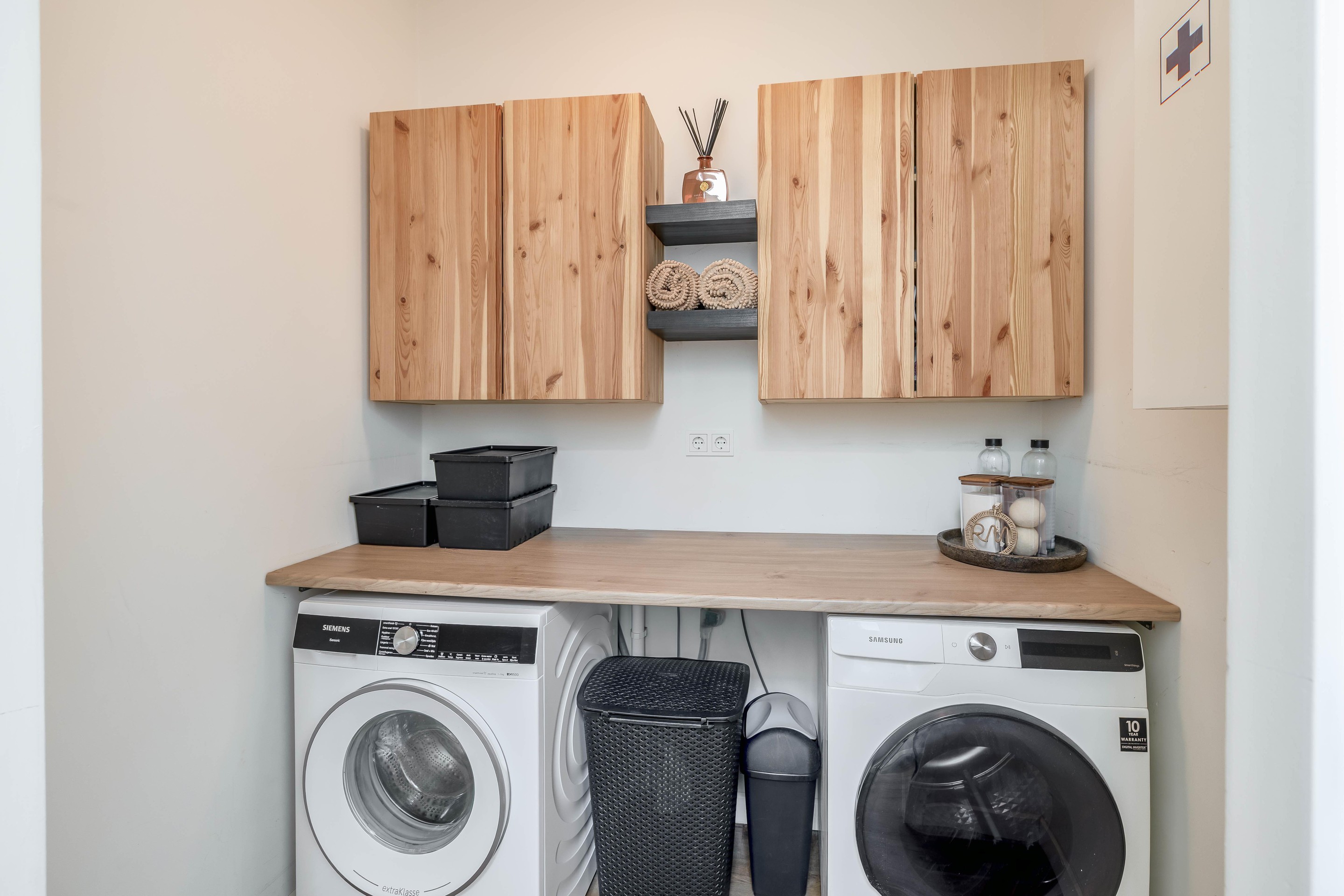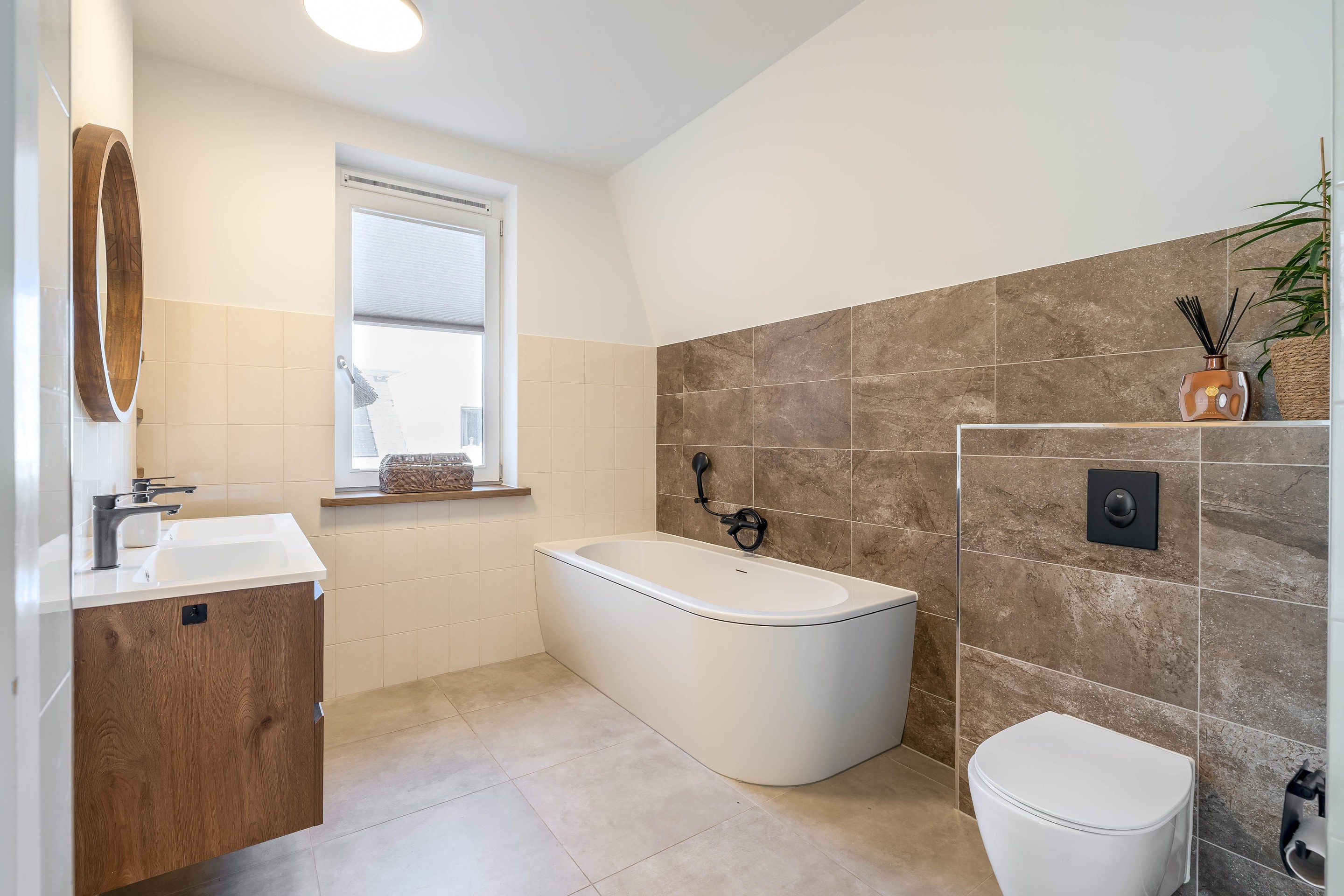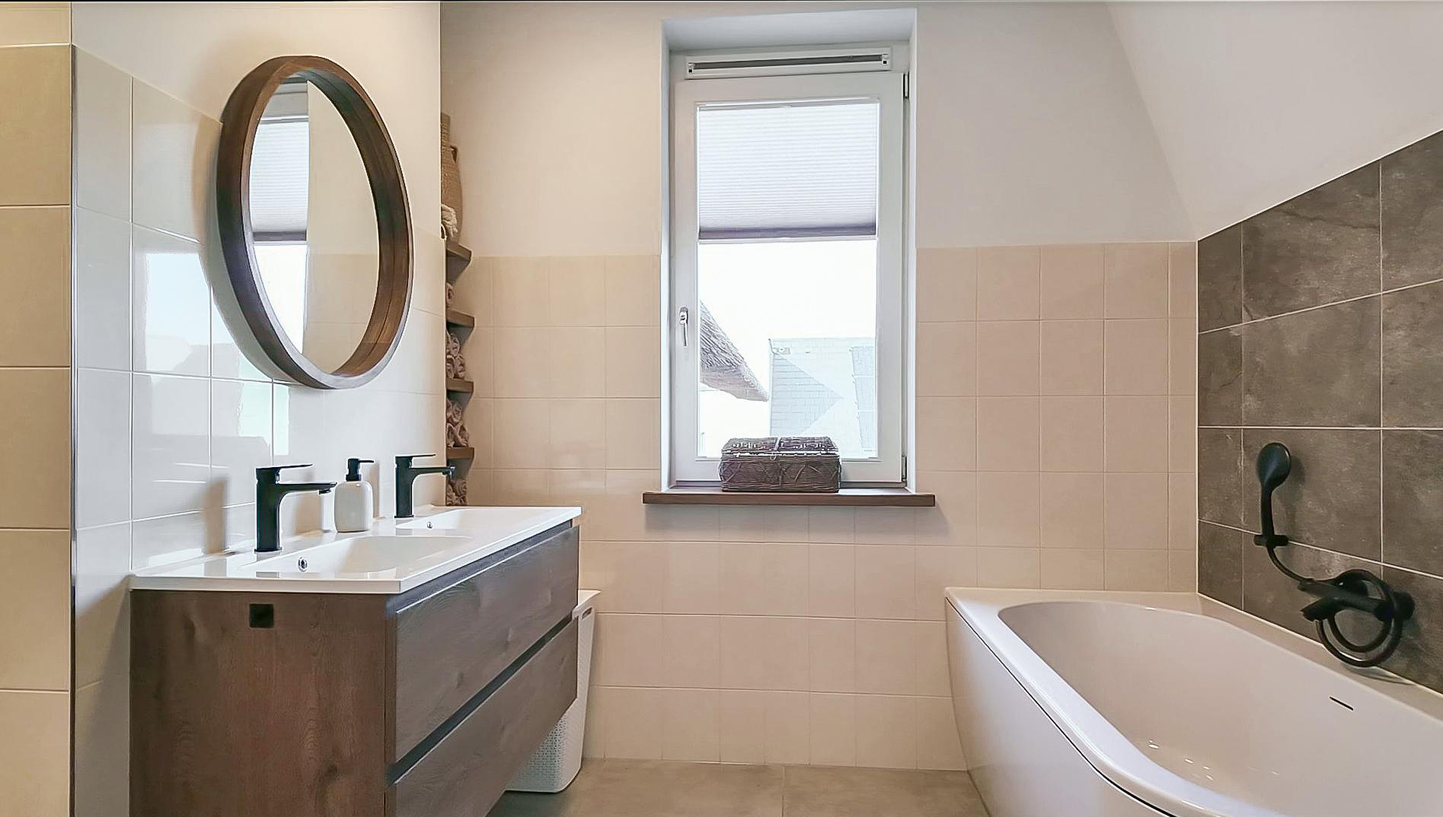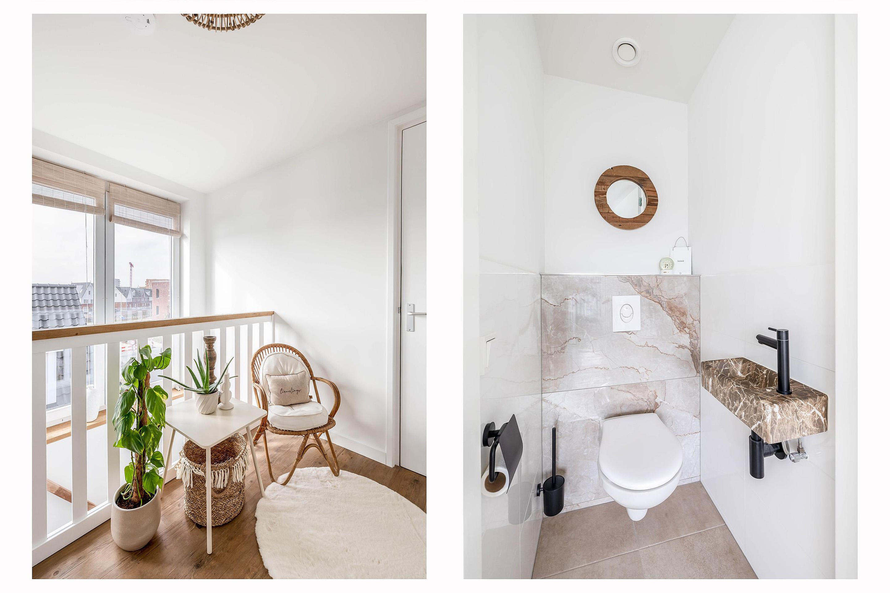 De luxe badkamer (ca. 8,5 m2) is een plek voor ontspanning, compleet met een riante inloopdouche, een heerlijk ligbad en smaakvol tegelwerk. Uniek op deze verdieping is de diepe, vaste kast op de overloop, waarin de wasmachine en droger netjes uit het zicht zijn weggewerkt.
