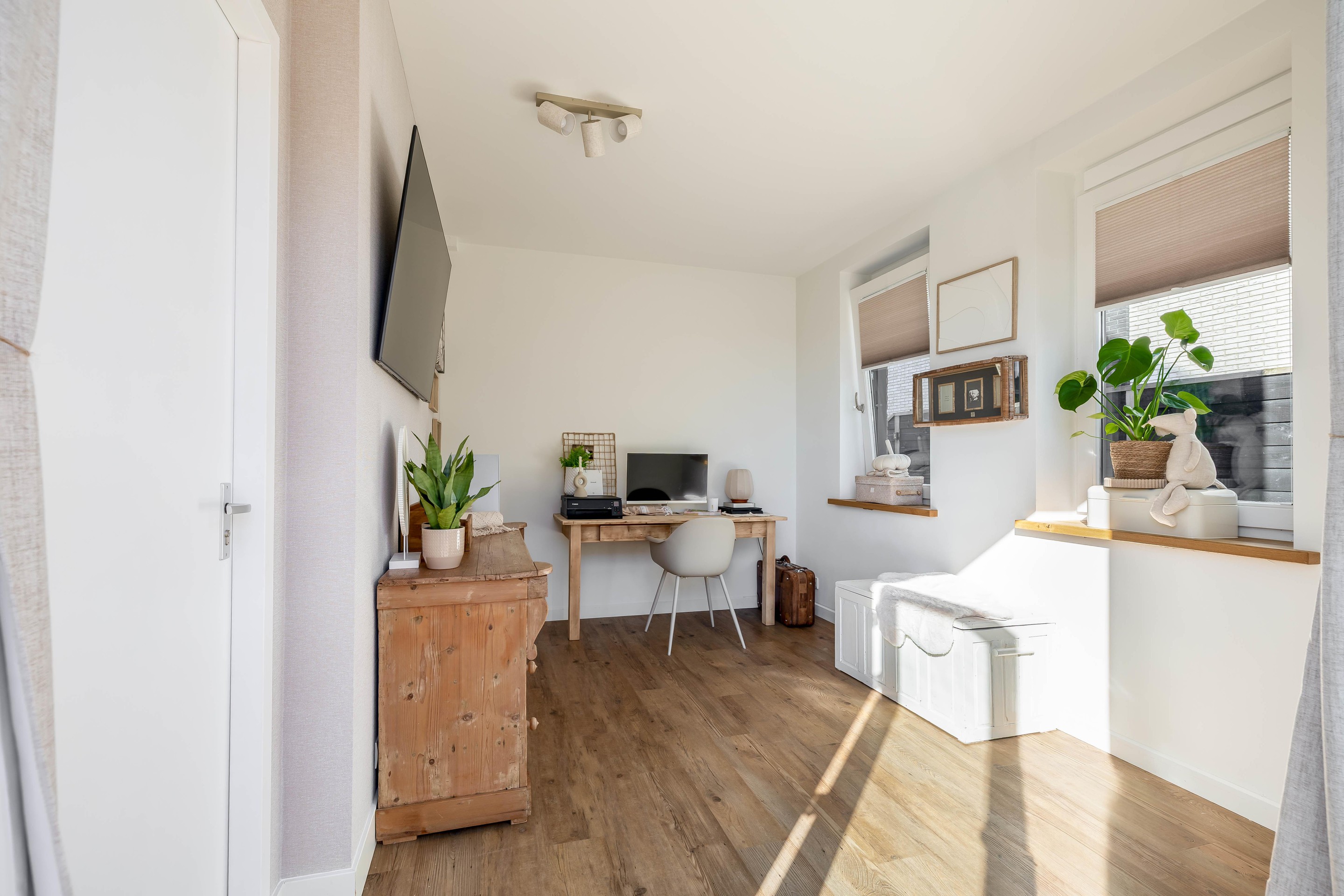 Aan de achterzijde van de woning bevindt zich het kantoor van circa 11 m2 (3,90 m x 2,82 m). Deze ruimte beschikt over een eigen entree en is dankzij de grote raampartijen en de hoekligging een inspirerende plek voor een praktijk aan huis of een rustige thuiswerkplek. De scheidende muur is later toegevoegd en ook weer eenvoudige te verwijderen.