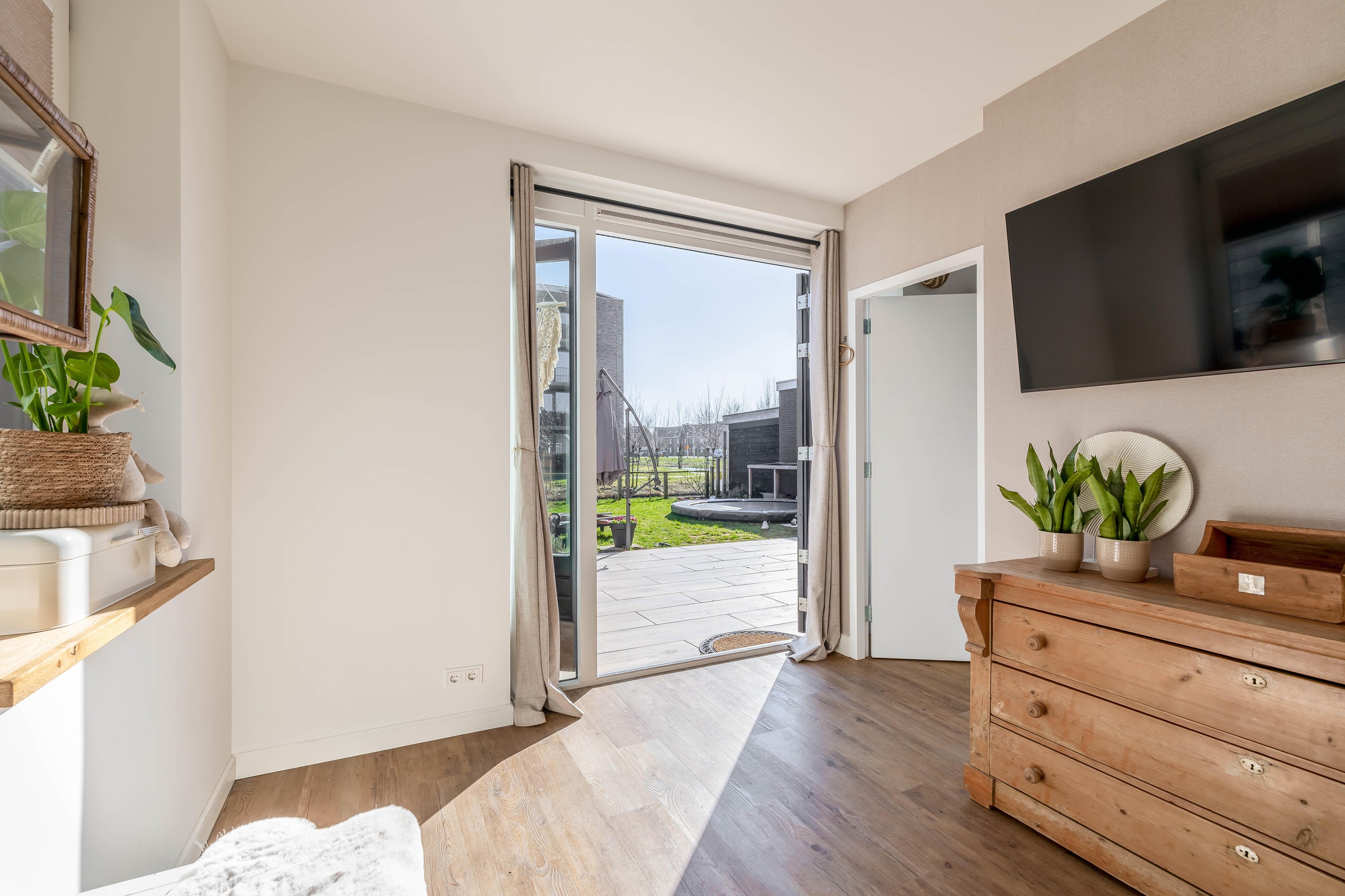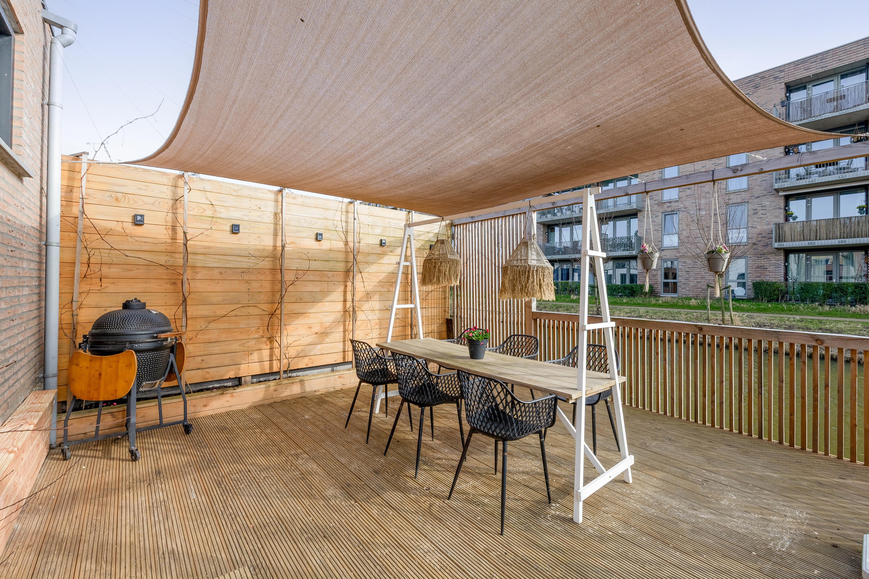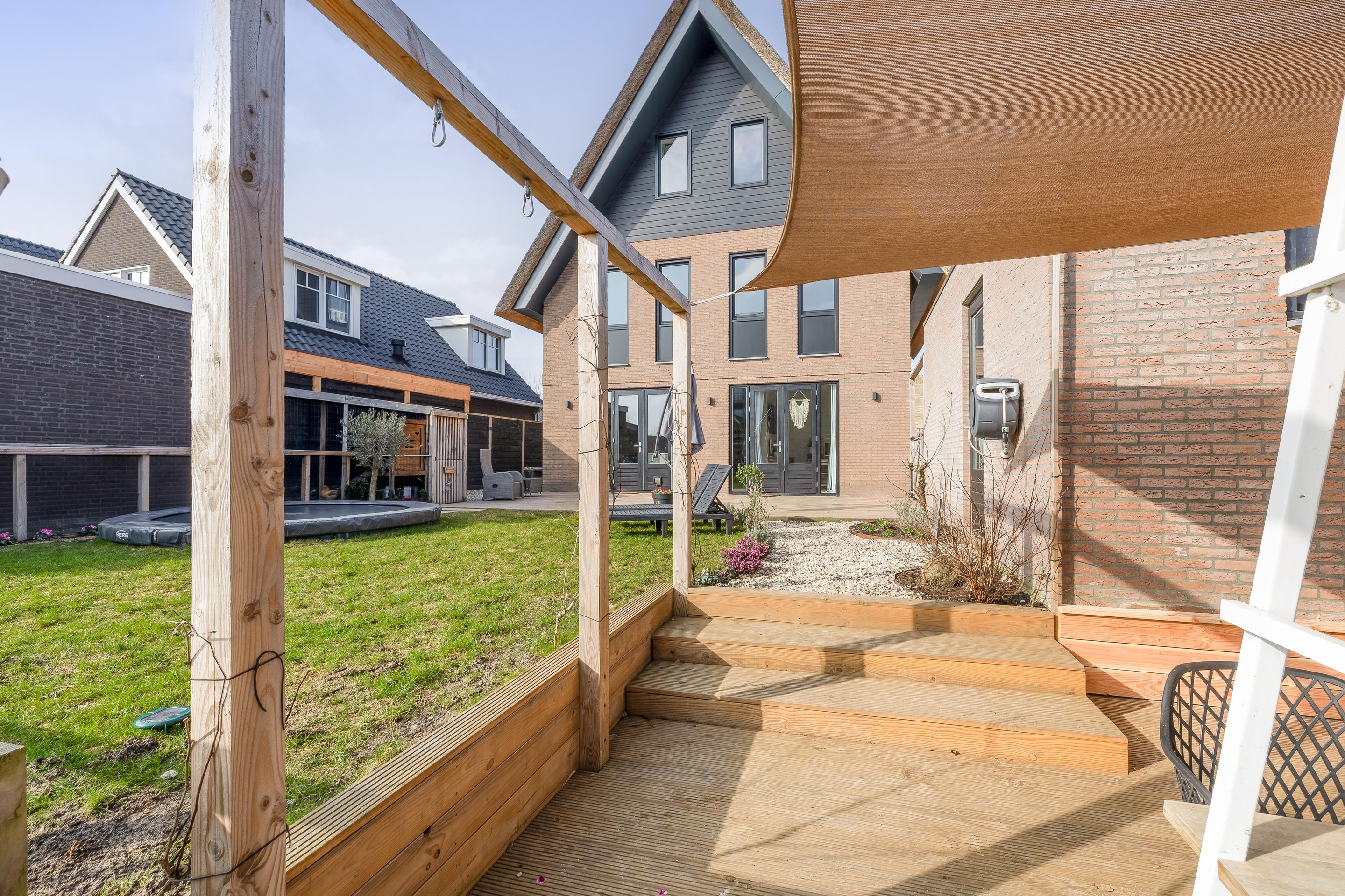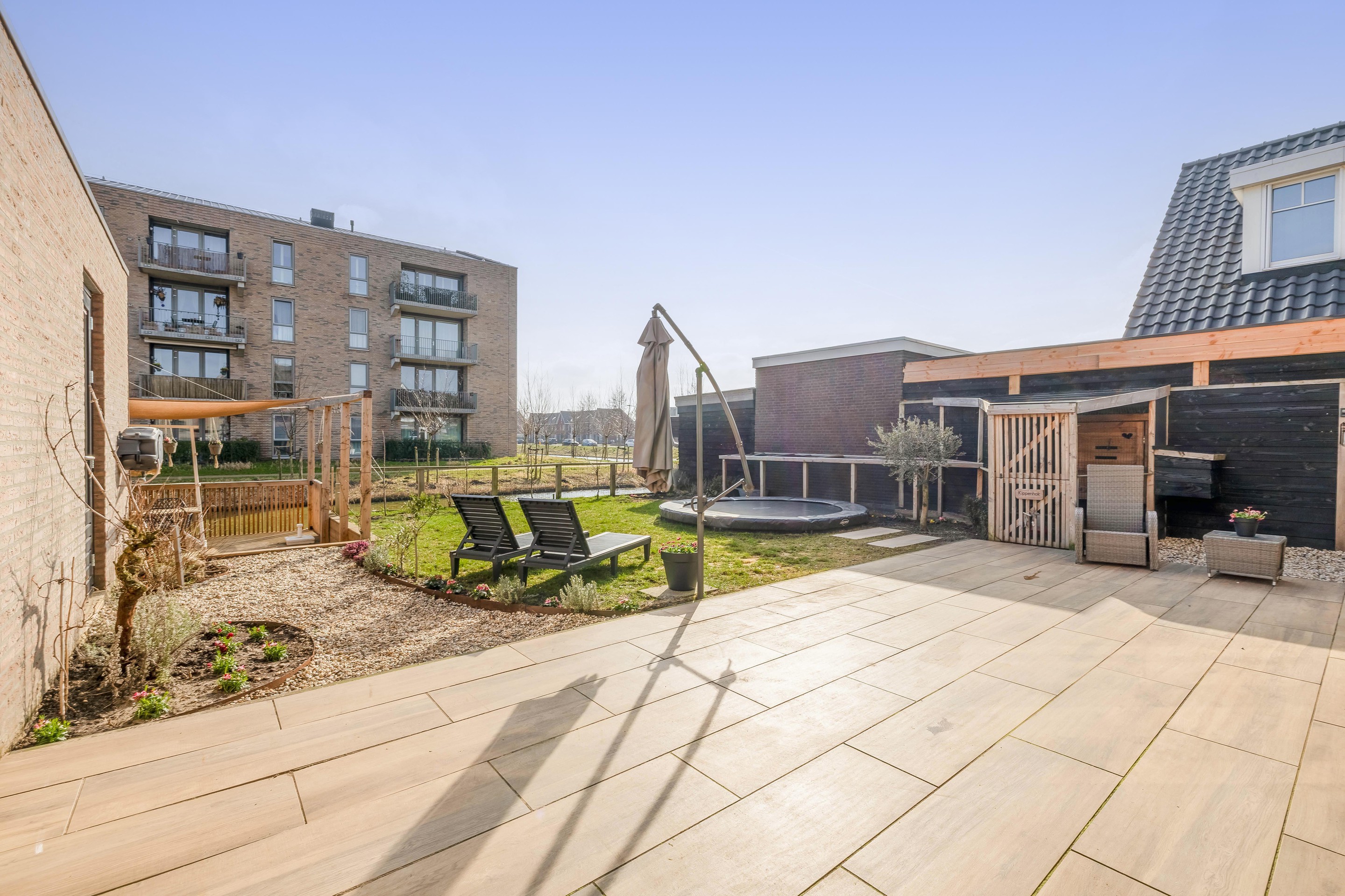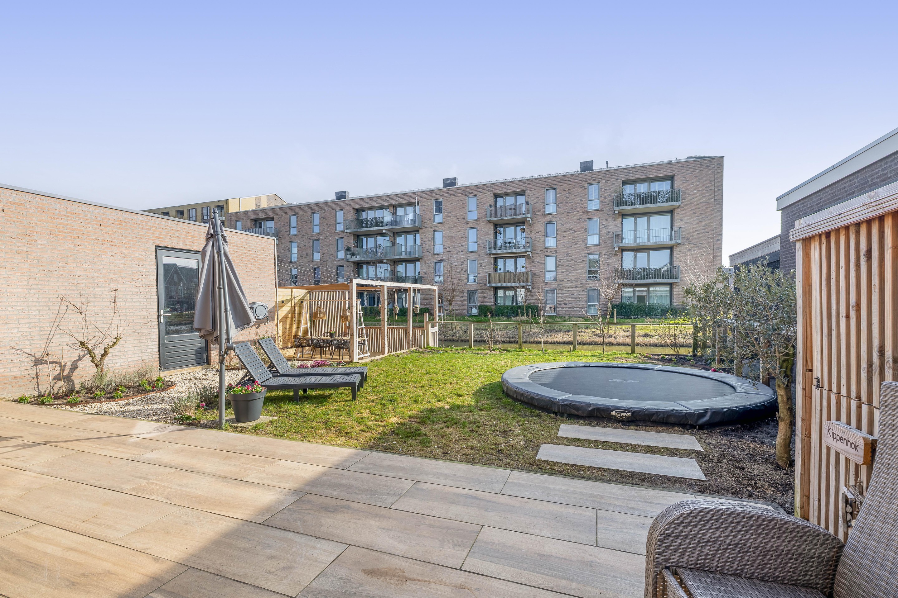 De achtertuin is een paradijs voor het hele gezin. Er is gekozen voor een kindvriendelijke inrichting met een groot gazon waar volop ruimte is voor een trampoline of speeltoestellen. Het absolute pronkstuk van de tuin is het houten terras direct aan het water. De ligging aan de vaart past perfect bij de waterrijke sfeer van Westergouwe. Of het nu gaat om een kop koffie in de ochtendzon of een glas wijn in de avond: op dit vlonderterras is het puur genieten tot in de laatste uurtjes.