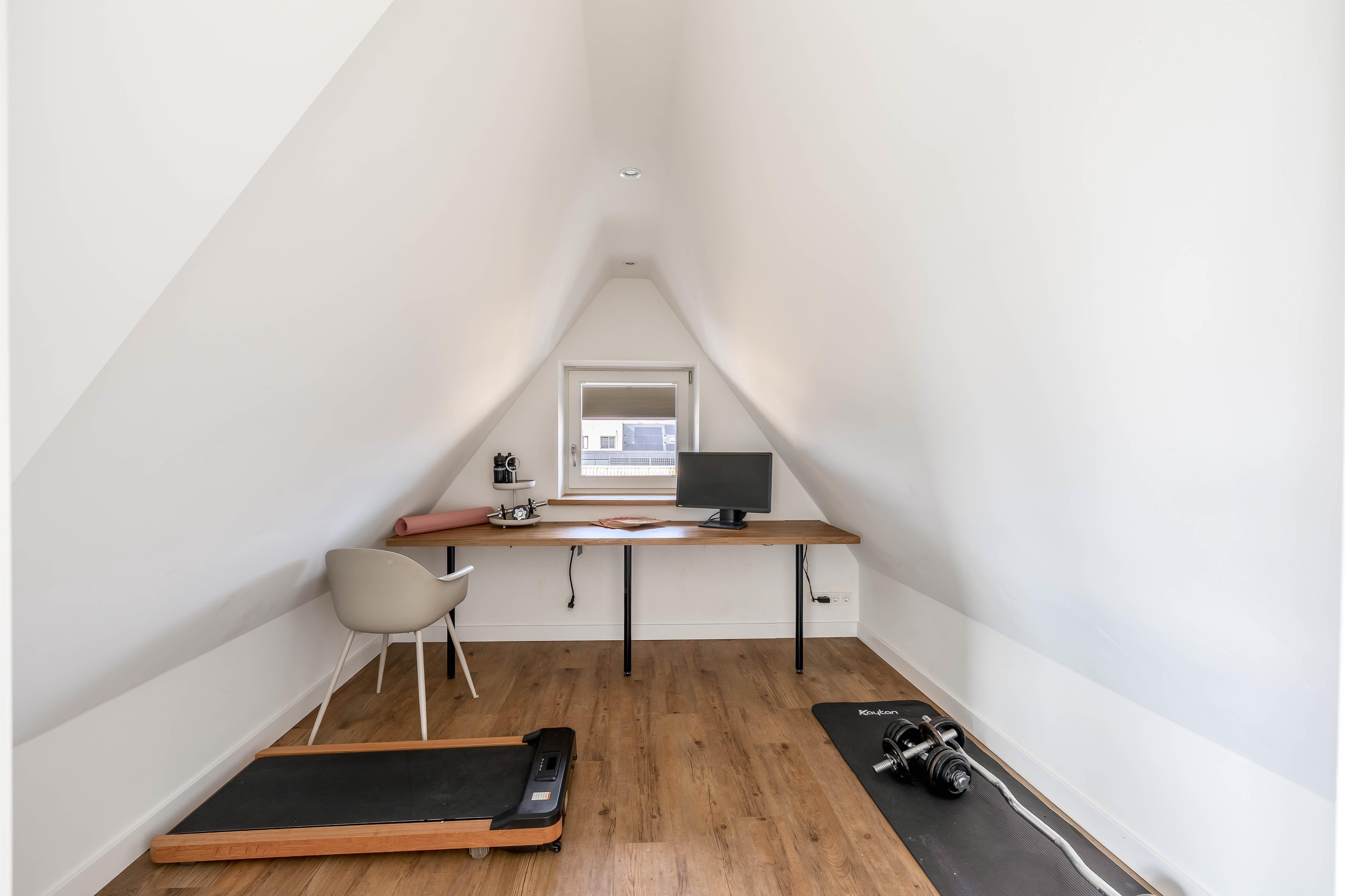 De verdieping is uiterst praktisch ingedeeld met een tweede toilet en een zeer royale berging waarin de warmtepomp en overige technische installaties zijn ondergebracht. De overloop is met een hoogte van 2,42 meter ruim opgezet en is, evenals de rest van de verdieping, reeds volledig voorbereid op de realisatie van een tweede badkamer. Dankzij de knieschotten en vaste kasten in de kamers wordt elke vierkante meter onder de kap optimaal benut als opbergruimte.