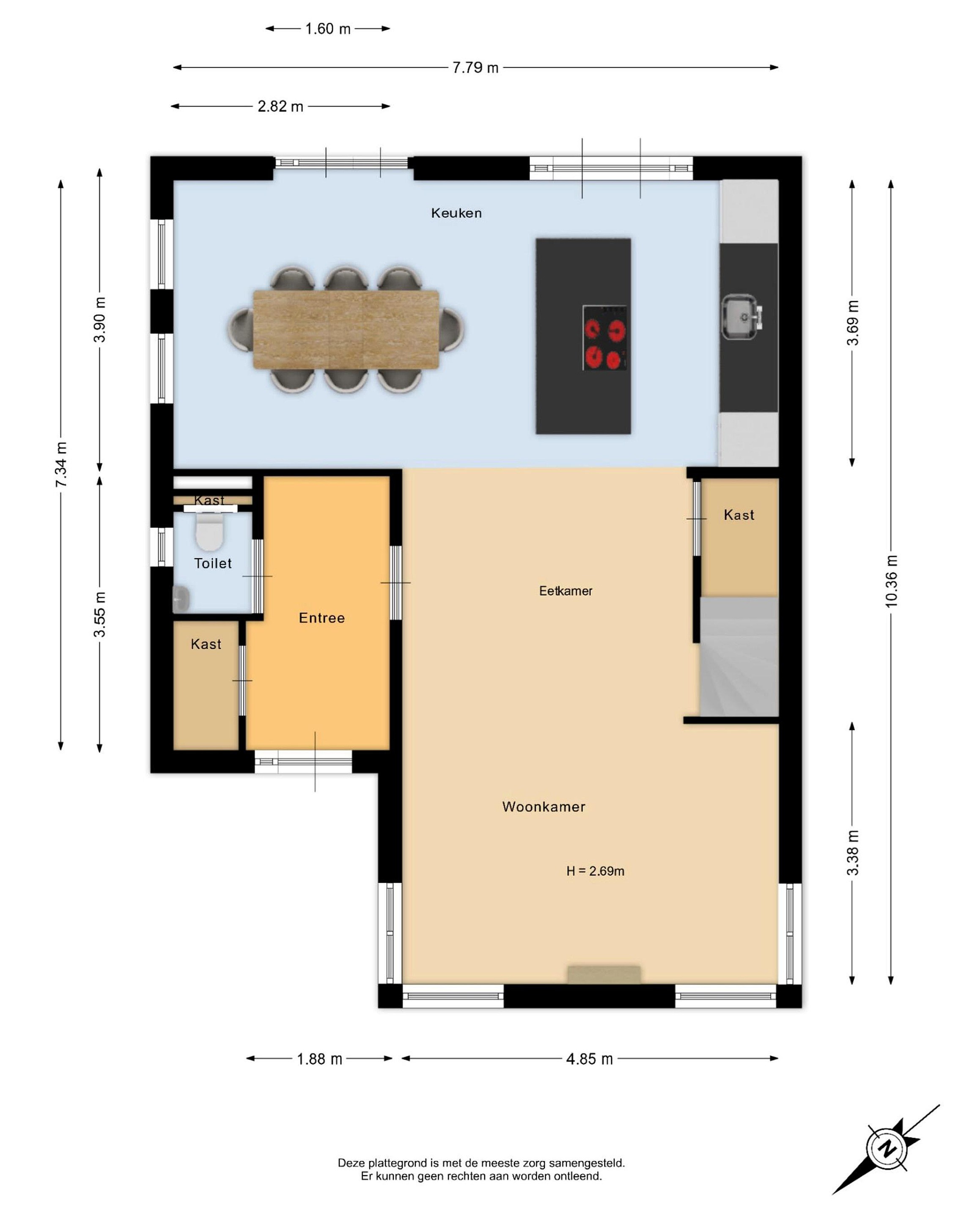 Bij binnenkomst via de ruime entree ervaart u direct de kwaliteit van deze villa. De hal is slim ingedeeld met een moderne toiletruimte, een handige garderobekast en een aparte kast voor extra voorraad. De woonkamer aan de voorzijde is een ware blikvanger; met een breedte van bijna 5 meter (4,85 m) en een indrukwekkende hoogte van 2,69 meter voelt de ruimte groots en licht aan.