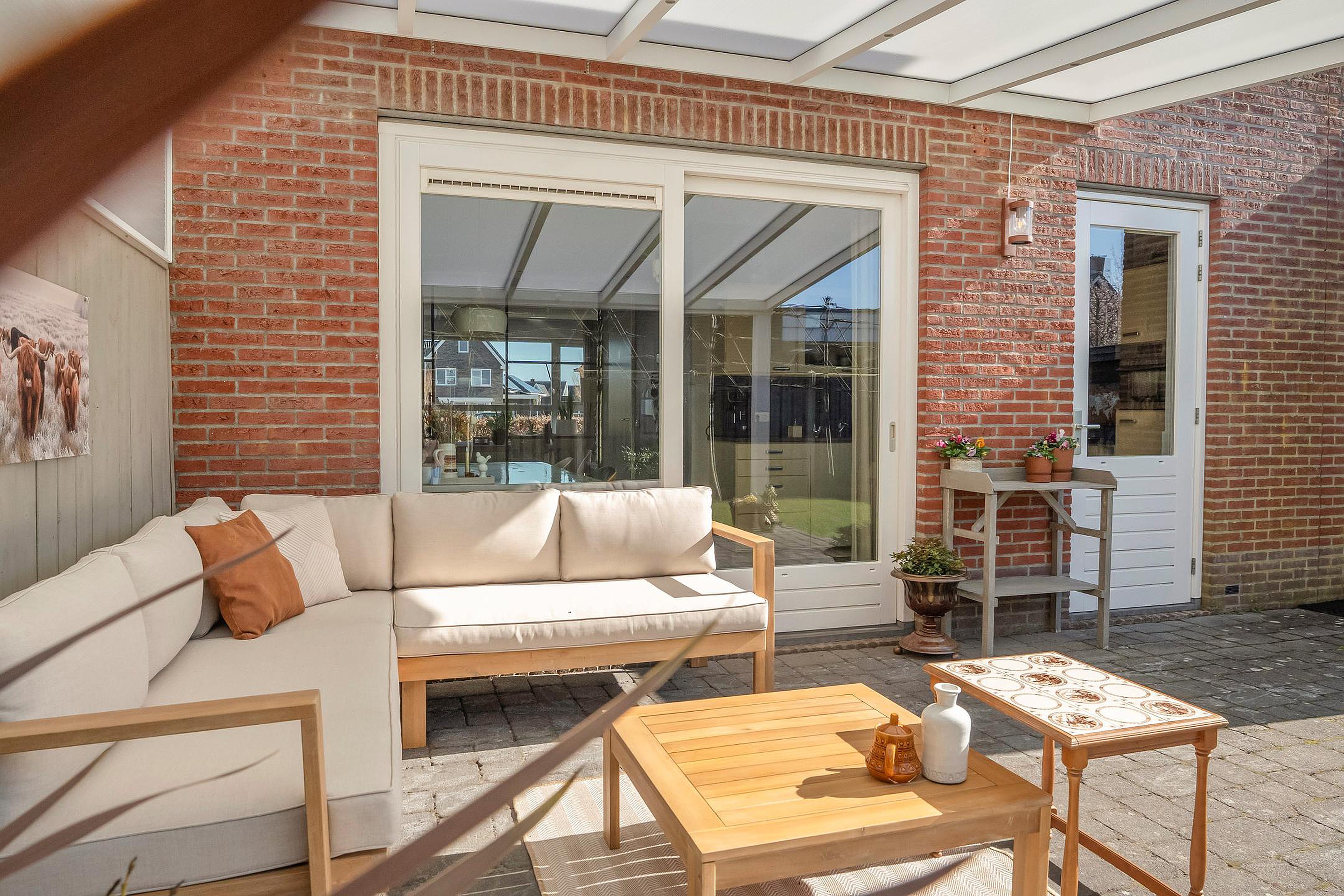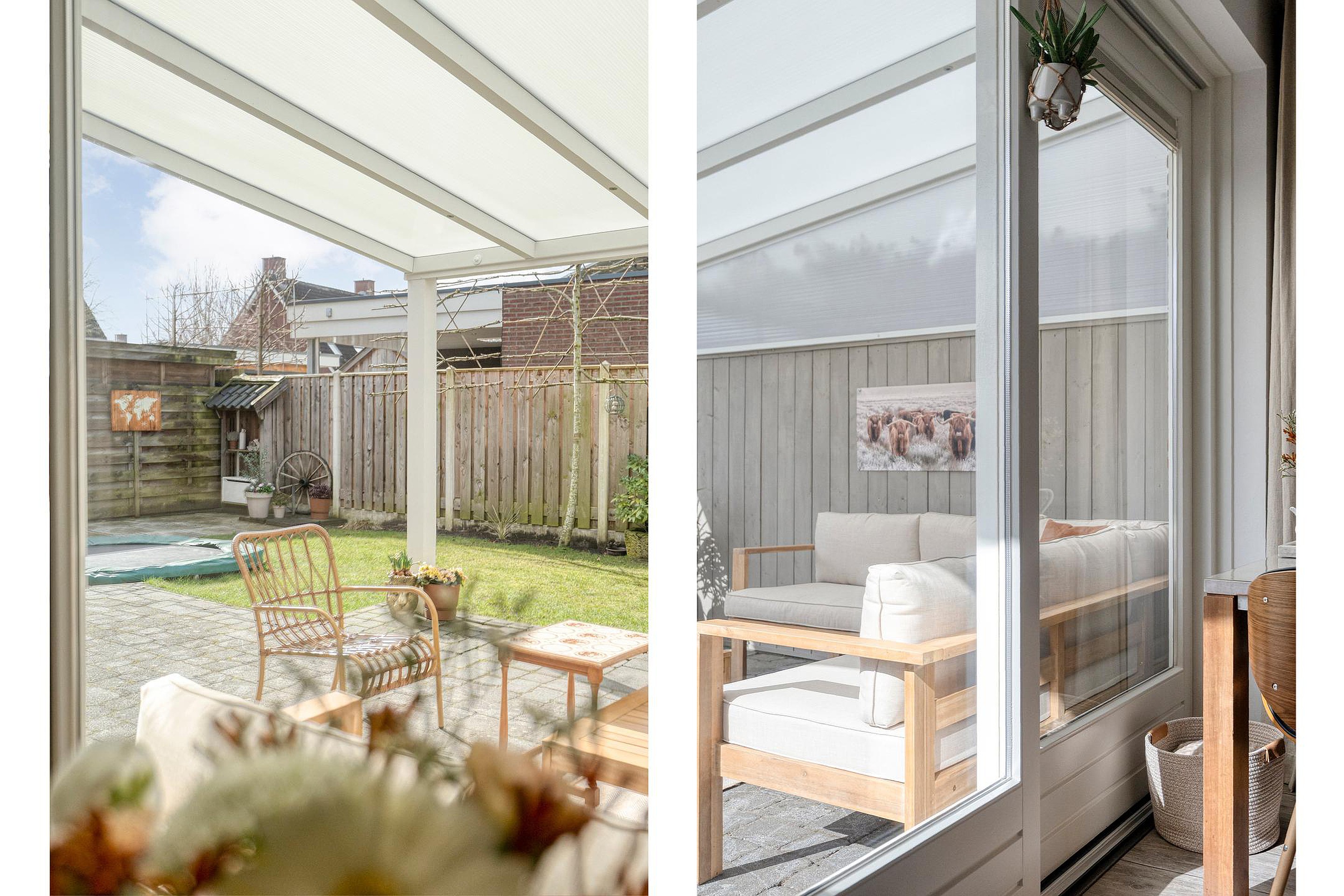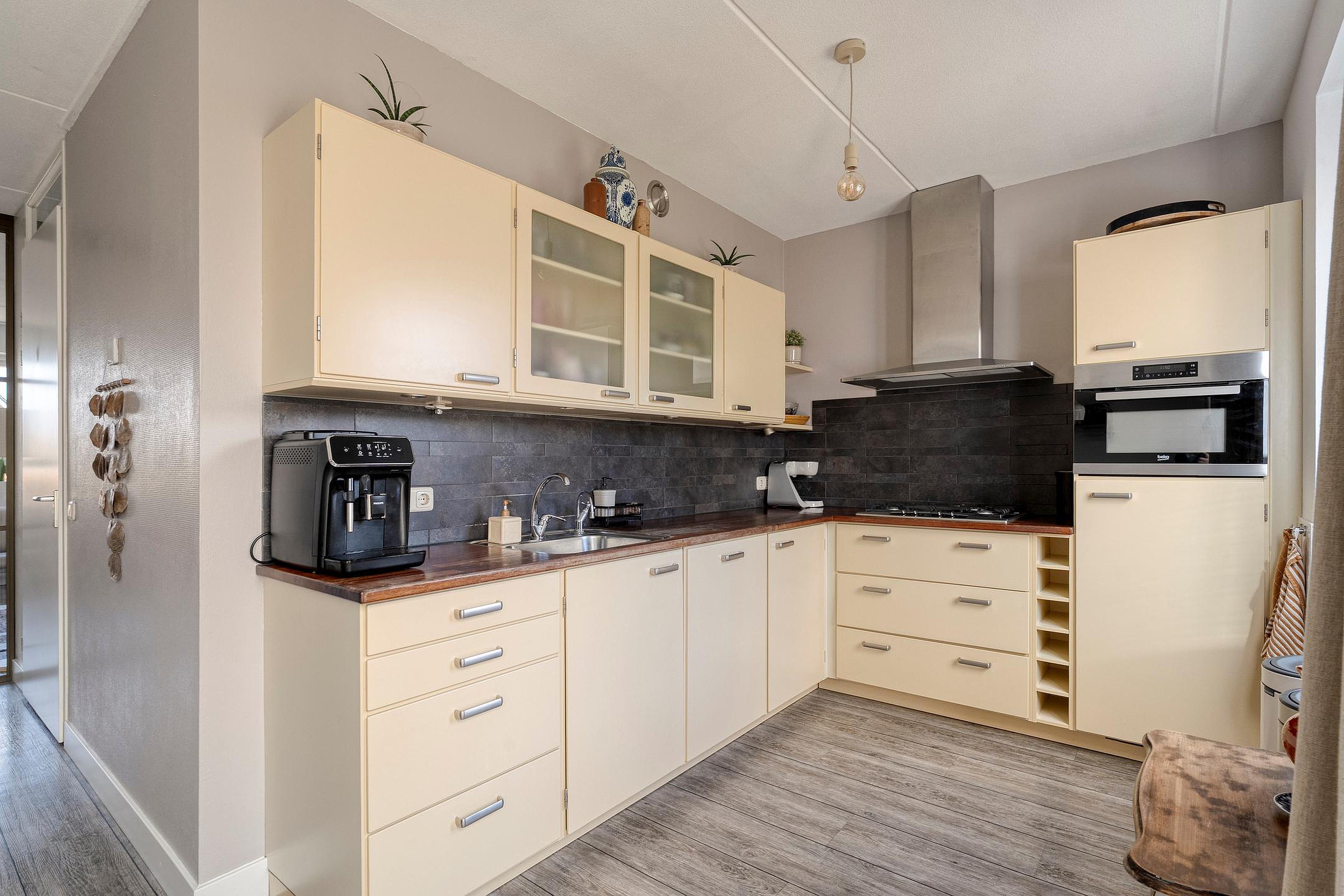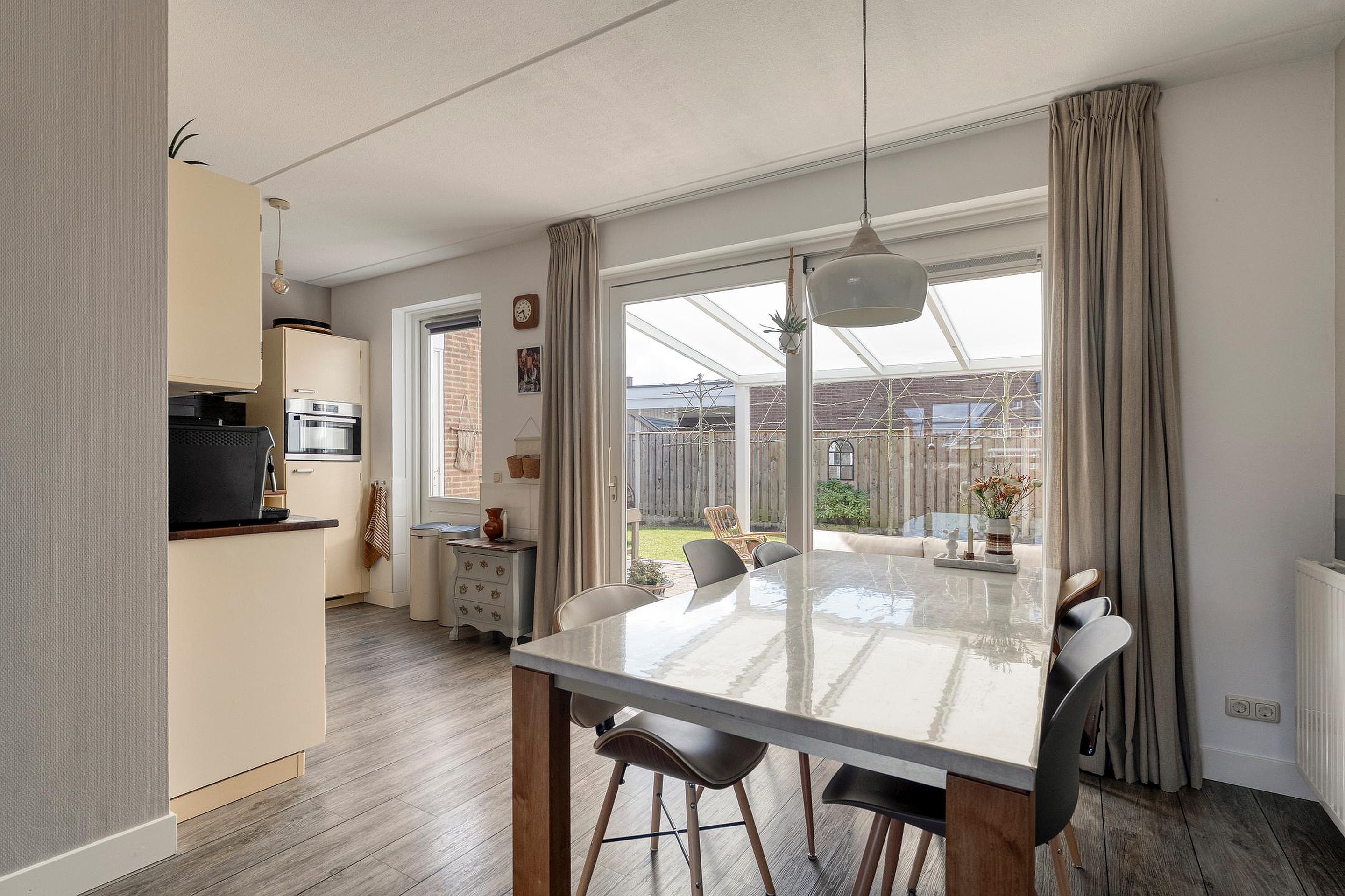 Dankzij de moderne industriële kamer-en-suite deuren sluit je de leefkeuken bij de woonkamer af, of maak je er juist één groot geheel van. De leefkeuken is het hart van het huis. Uitgevoerd met inbouwapparatuur zoals een koelkast, vaatwasser, oven en een 4-pits gaskookplaat met afzuigkap, laat je hier moeiteloos je culinaire kunsten zien. Via de schuifpui kom je direct in de zonnige, brede achtertuin met die prachtige veranda.