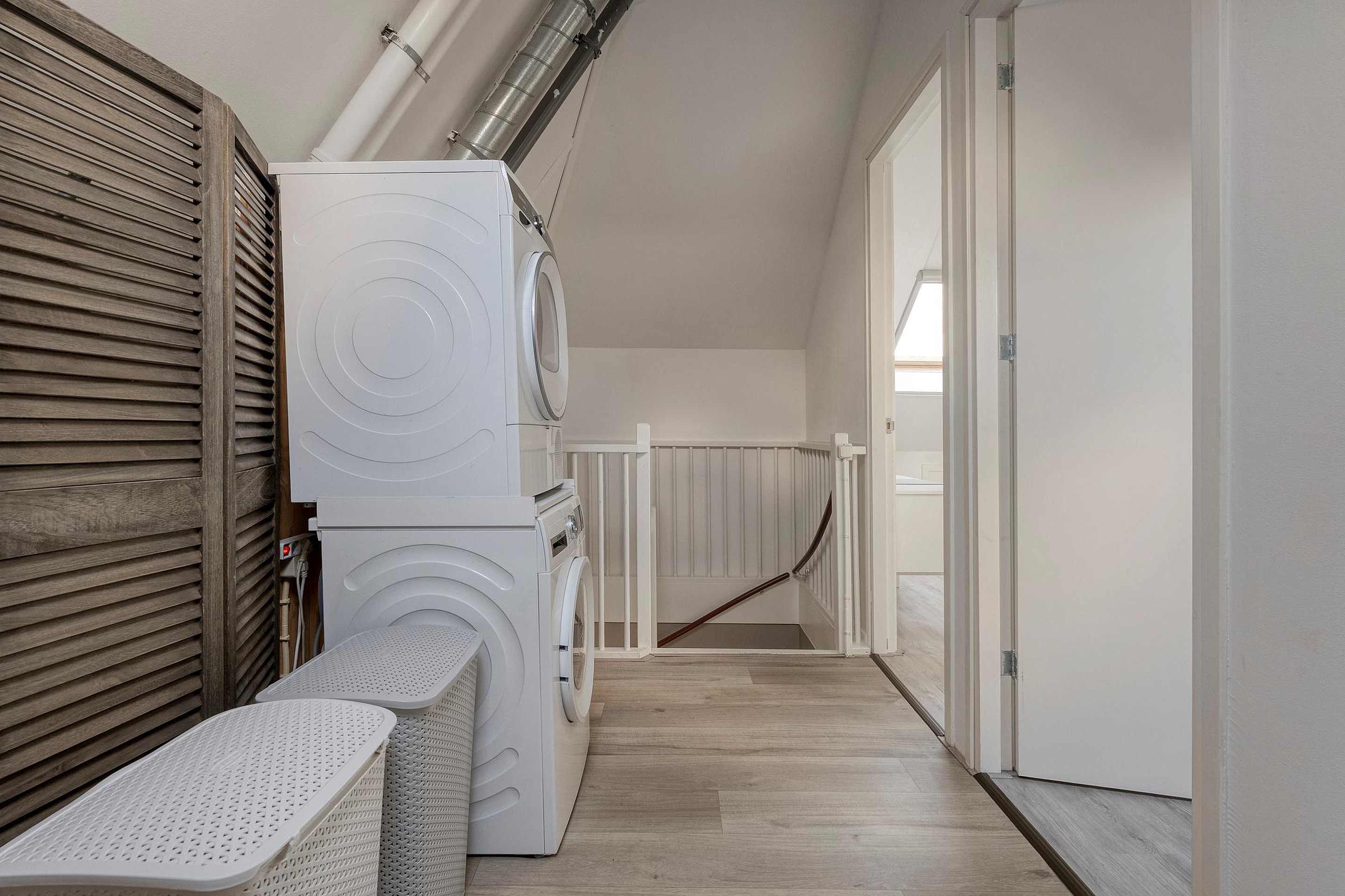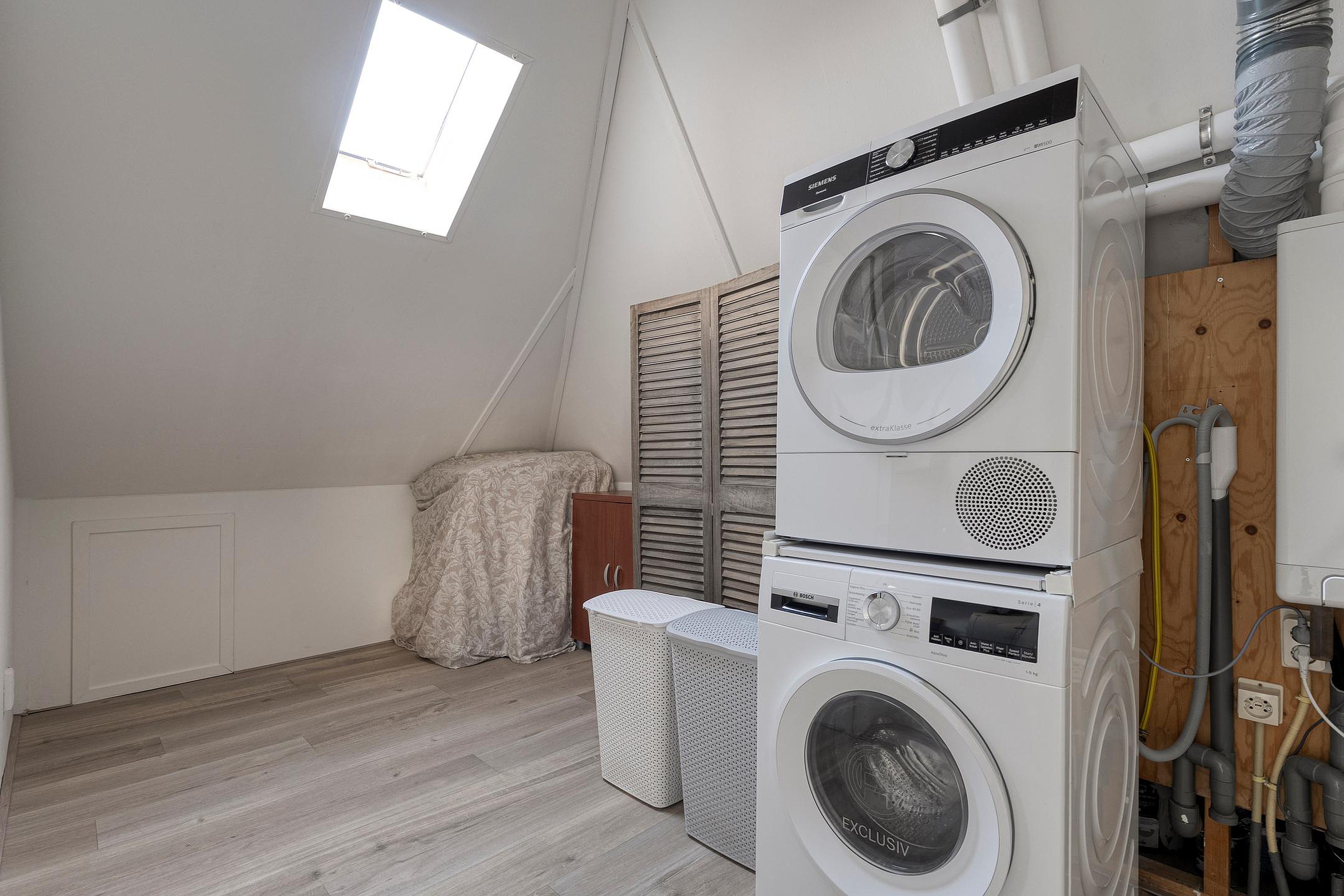 Op de overloop vind je de wasmachineaansluiting, een dakraam voor daglicht en uiteraard de superzuinige Intergas HR c.v.-installatie uit 2024.