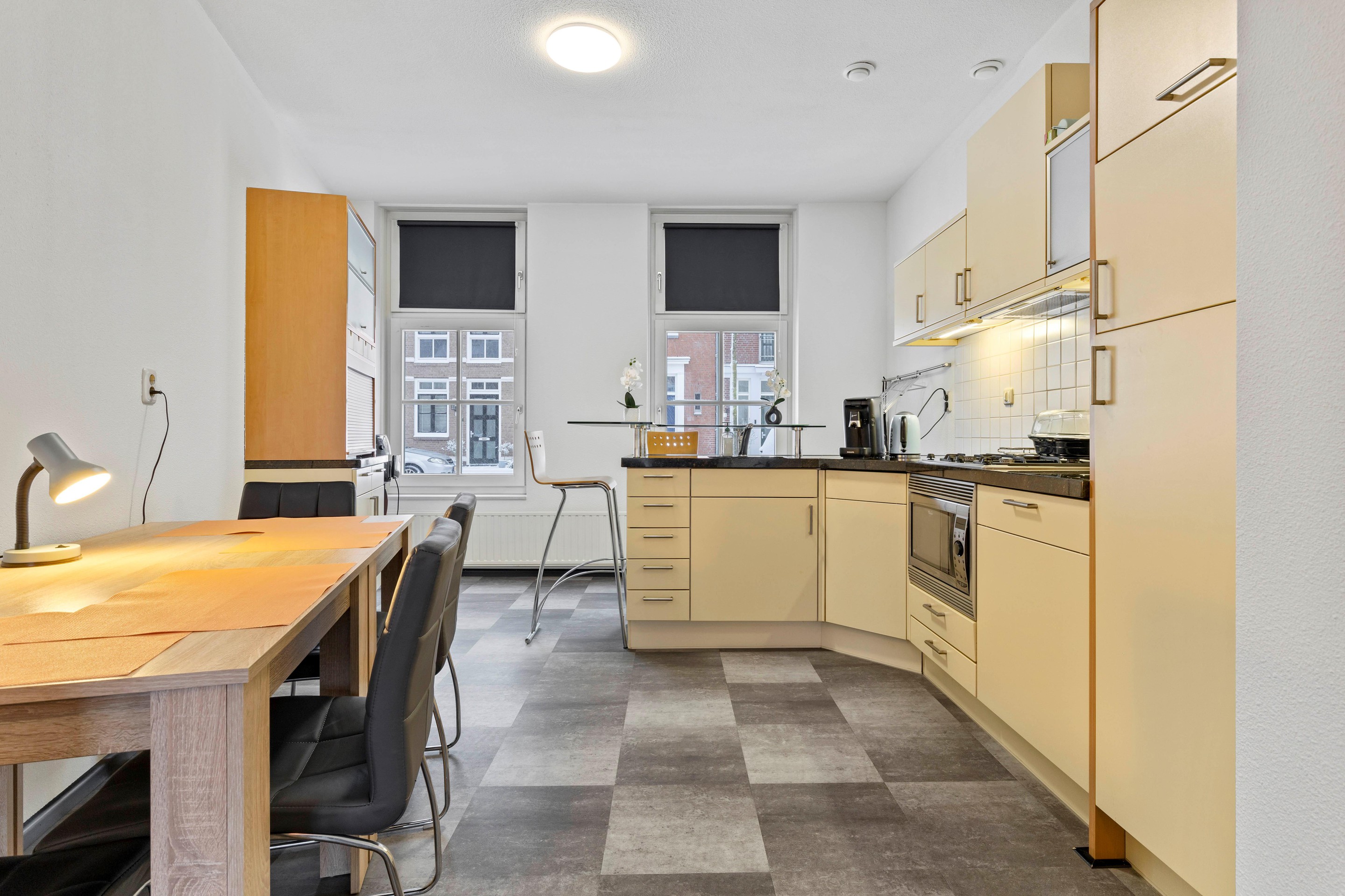 Aan de voorzijde bevindt zich de open keuken in hoekopstelling met barzit. Het keukenblok is voorzien van een hardstenen werkblad en compleet uitgerust met een 4-pits gaskookplaat, spoelbak met close-in boiler, inbouw combi-oven/magnetron, vaatwasser, koelkast, vriezer en diverse kastruimte. Onder de trap bevindt zich een praktische trapkast met volop berg- en proviandruimte.