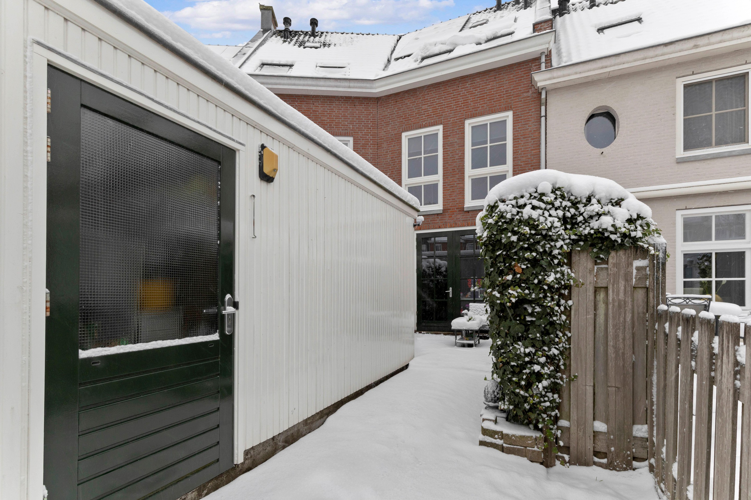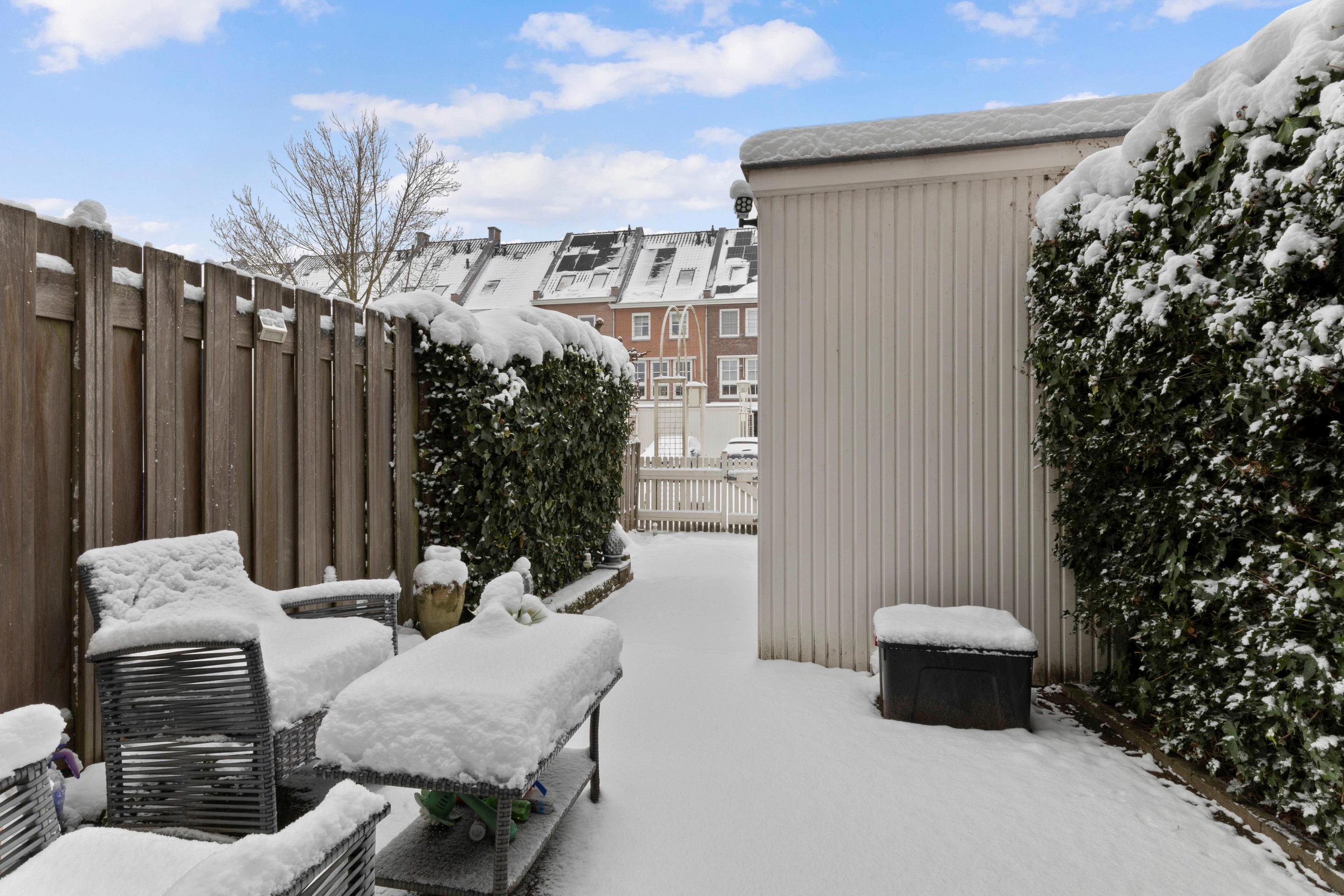 De achtertuin beschikt over een betegeld terras, een ruime berging en een achterom naar het gemeenschappelijke binnenterrein met een privé parkeerplaats.