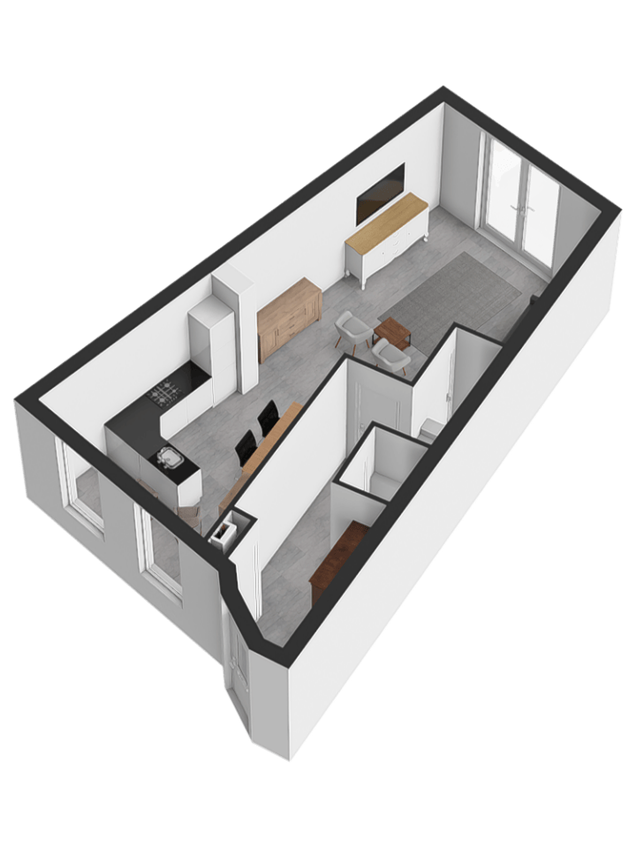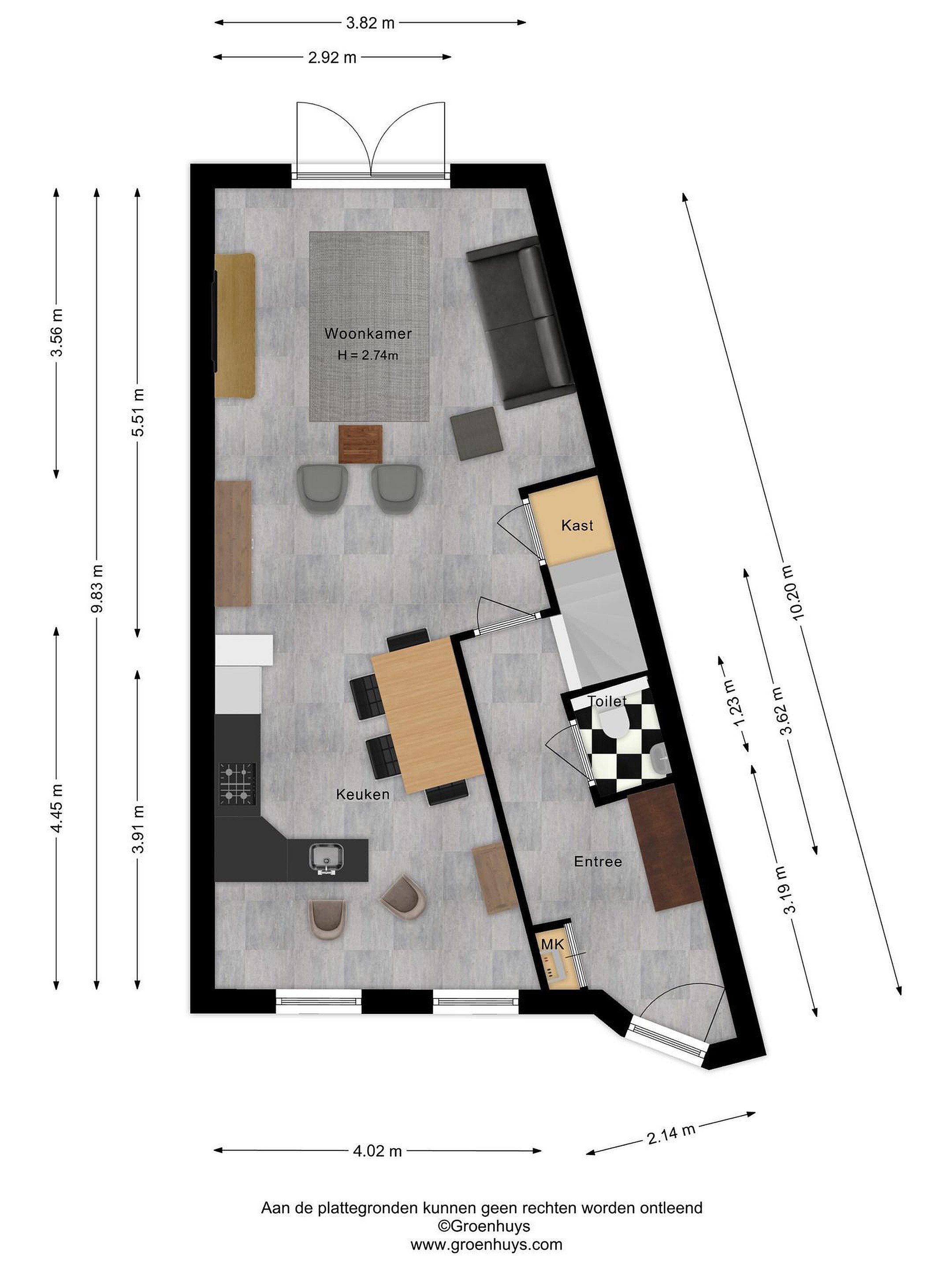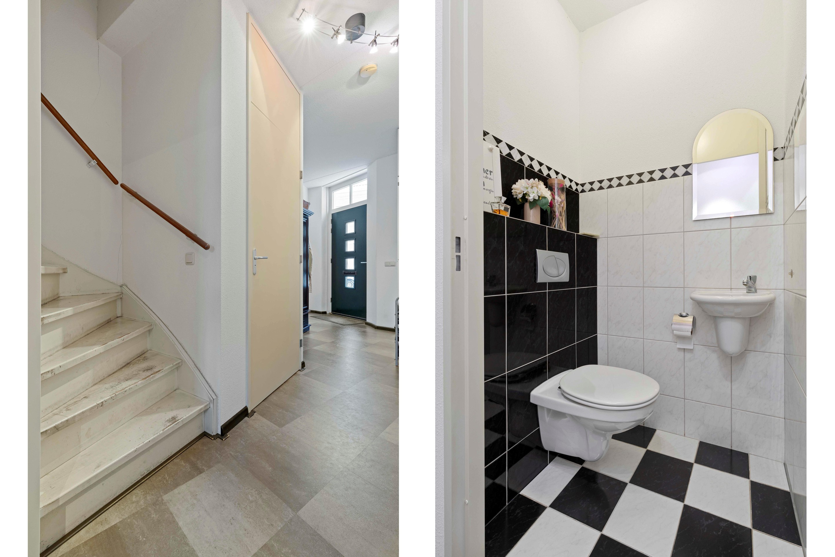 Through the entrance, you enter the hallway with access to the living room, staircase to the upper floors, toilet, and the utility meter cupboard with fiber optic connection.