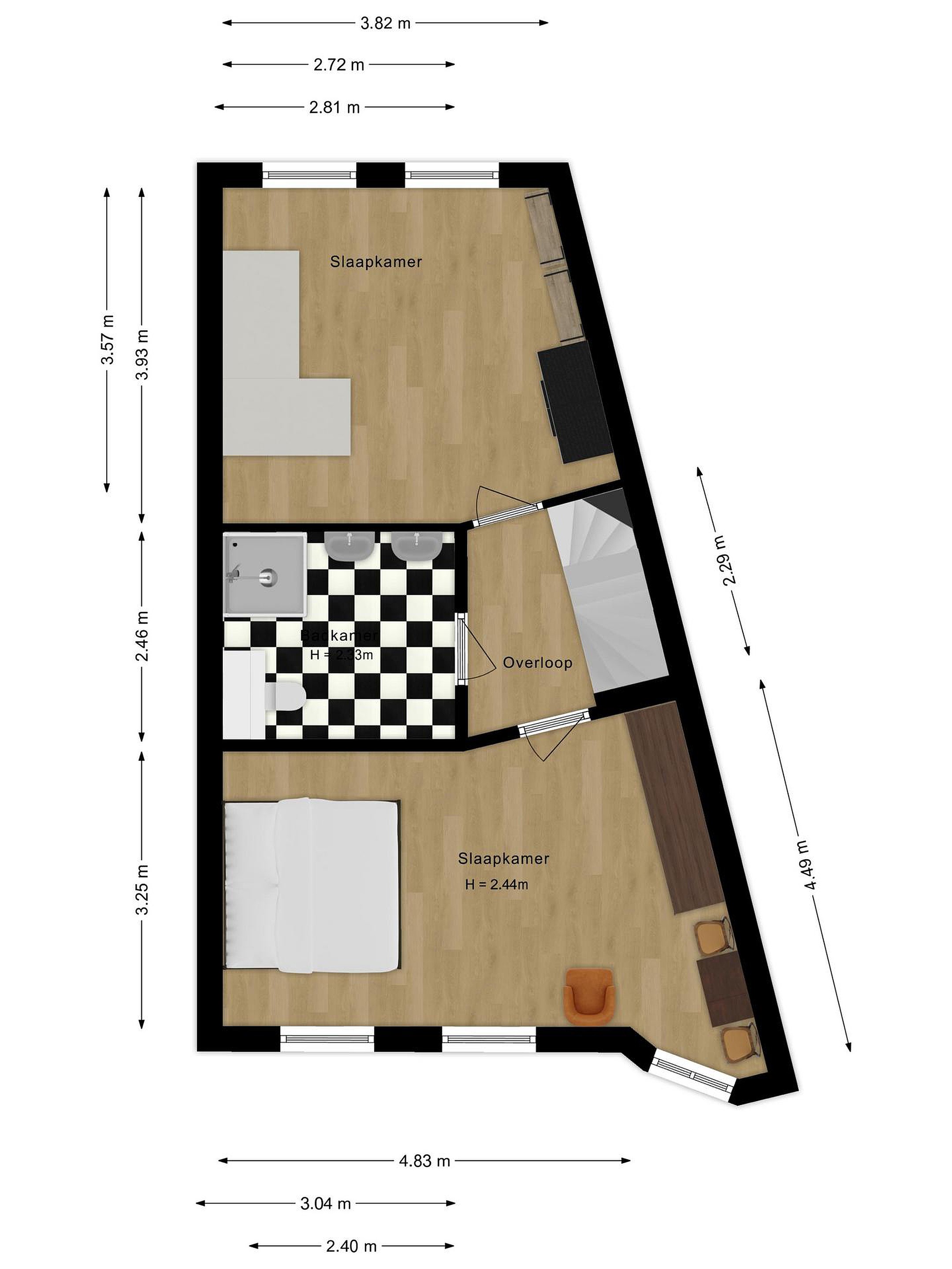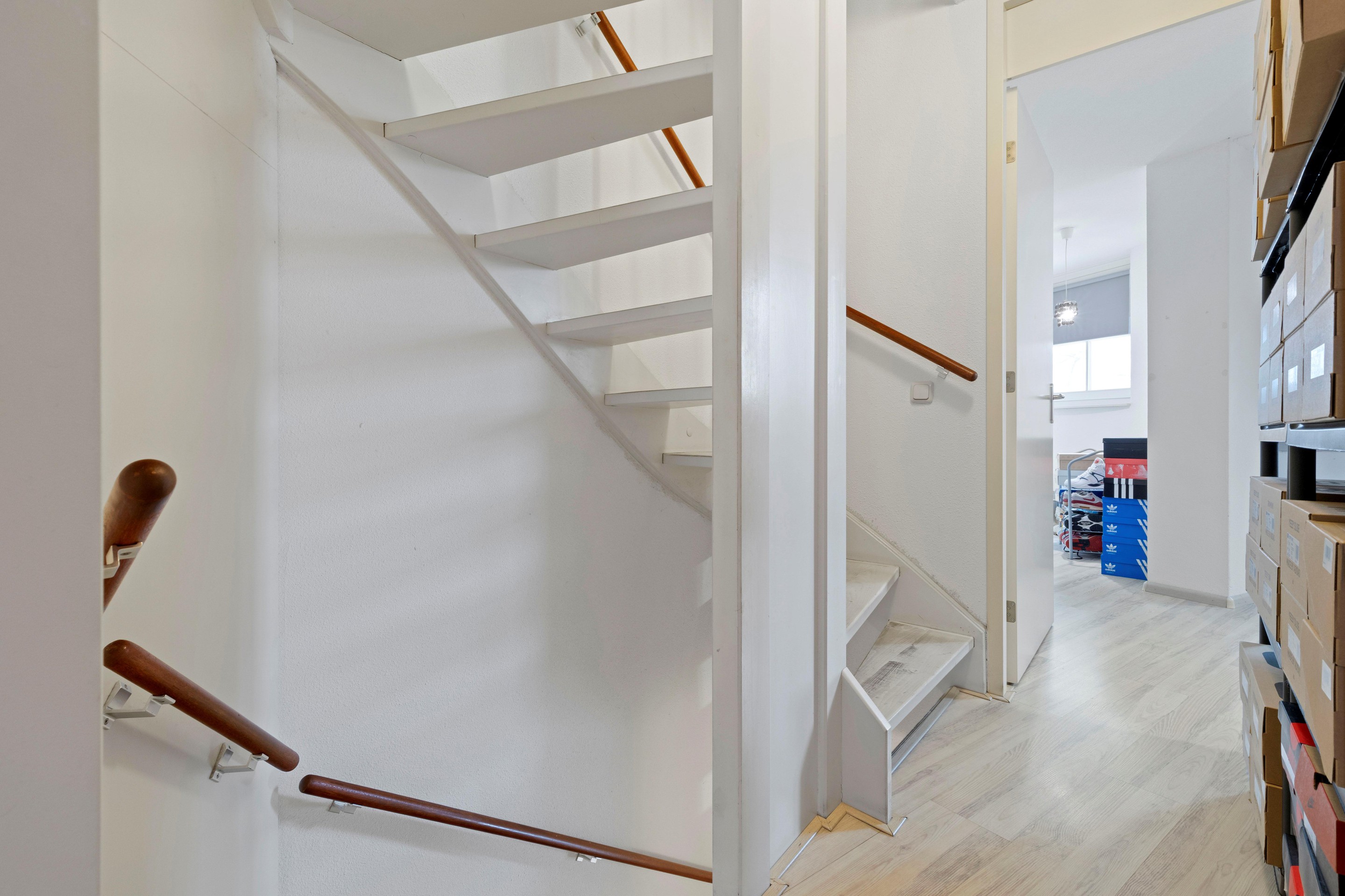 De overloop geeft toegang tot twee ruime slaapkamers, de badkamer en een vaste trap naar de tweede verdieping.