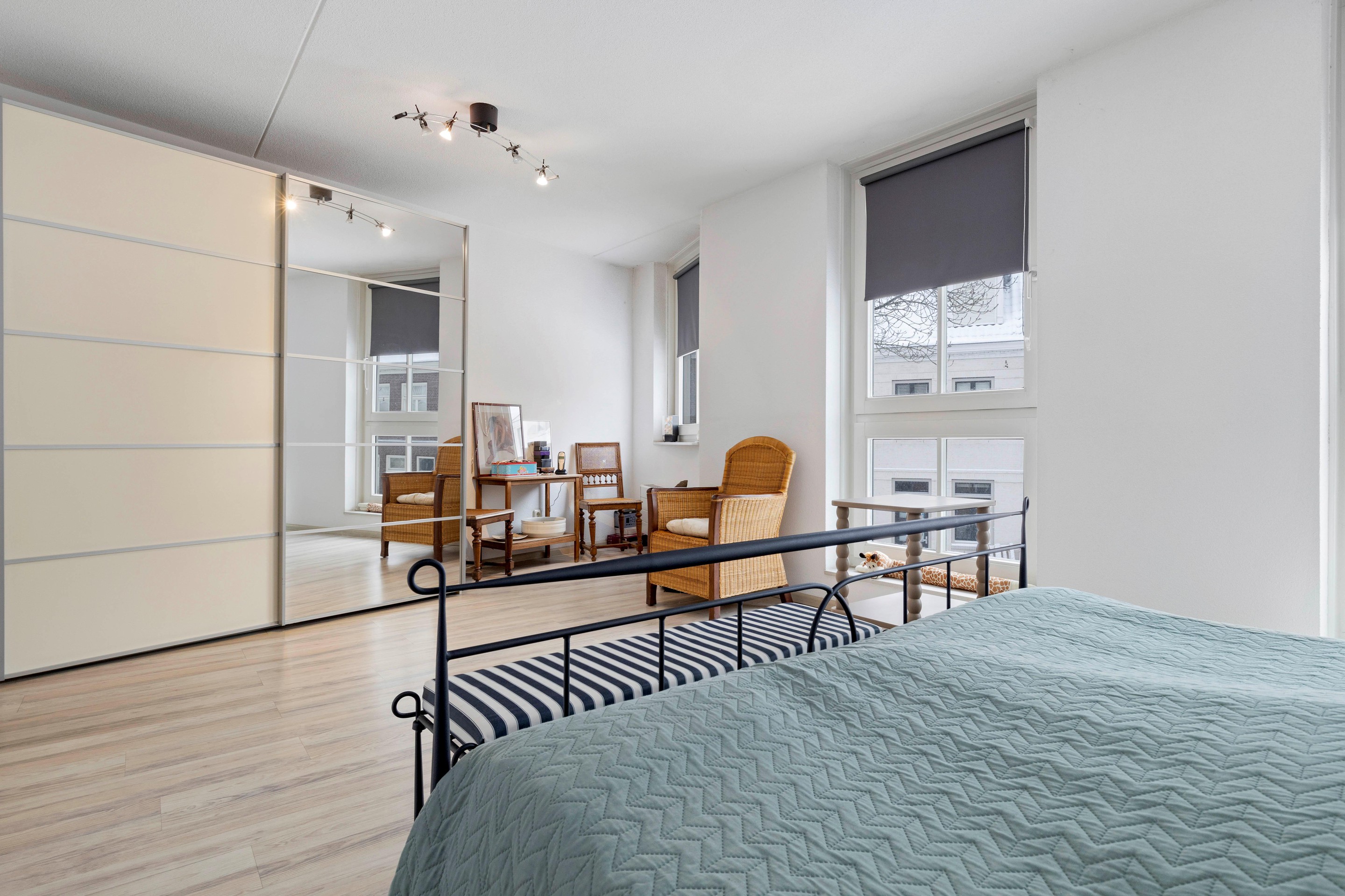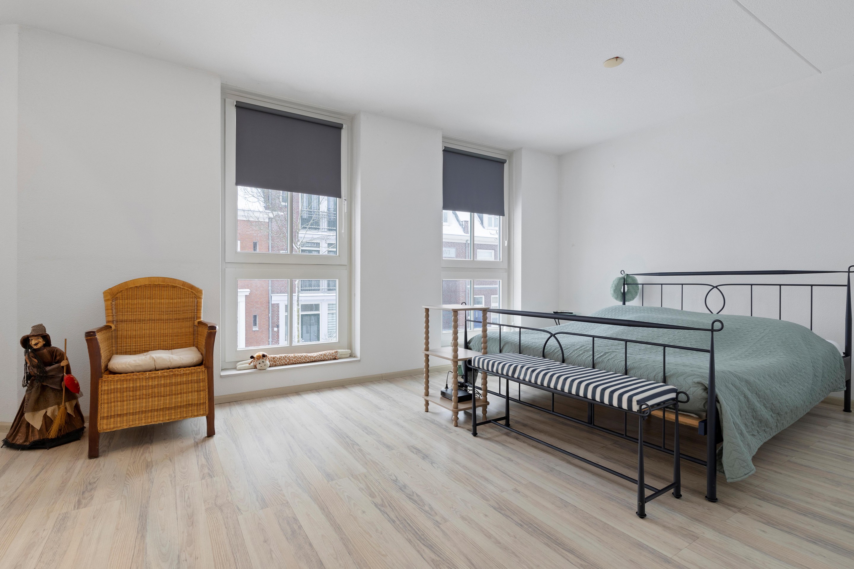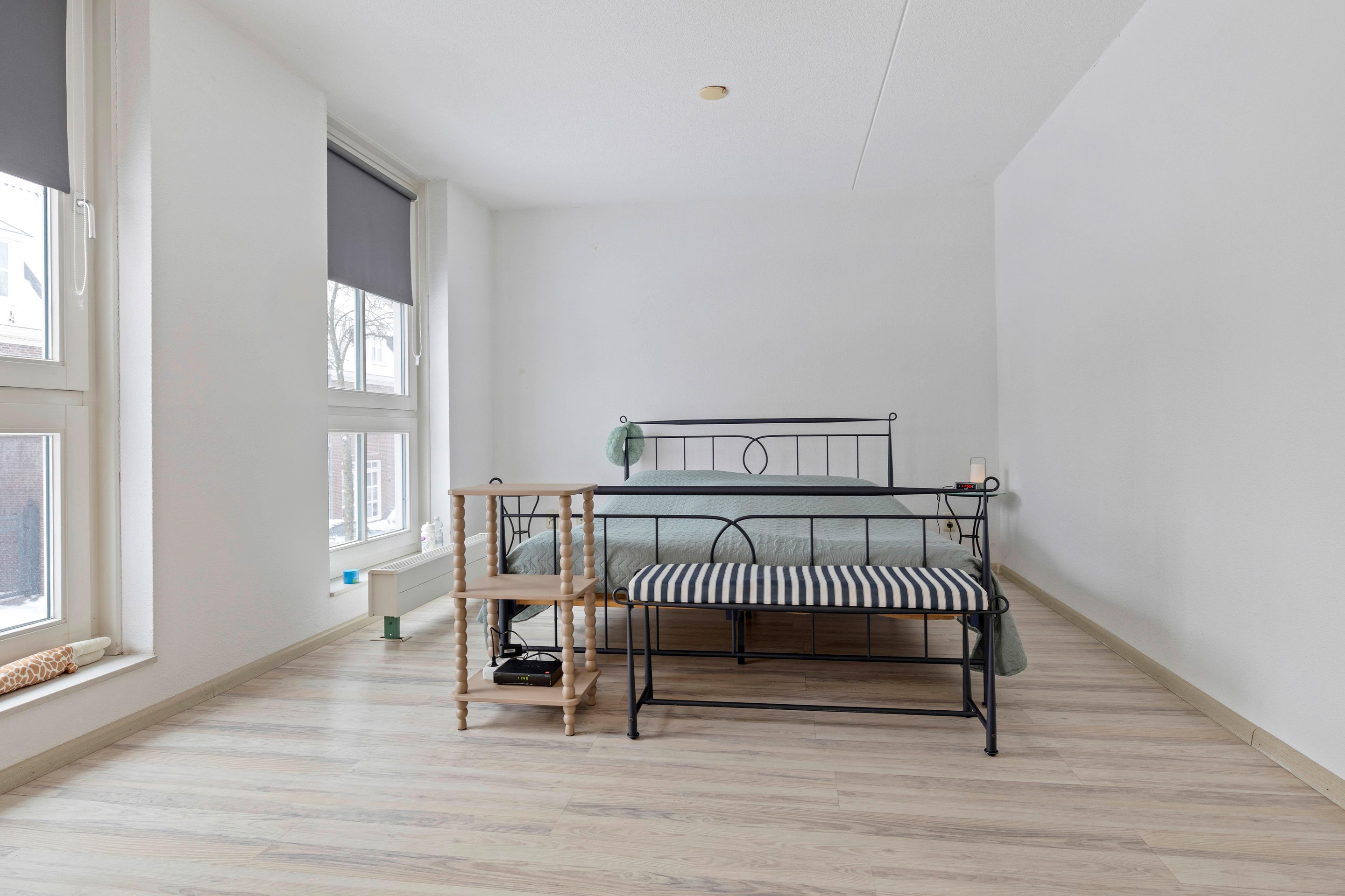 De slaapkamer aan de achterzijde is voorzien van grote draai-/kiepramen met uitzicht over het binnenterrein en een laminaatvloer met elektrische vloerverwarming.