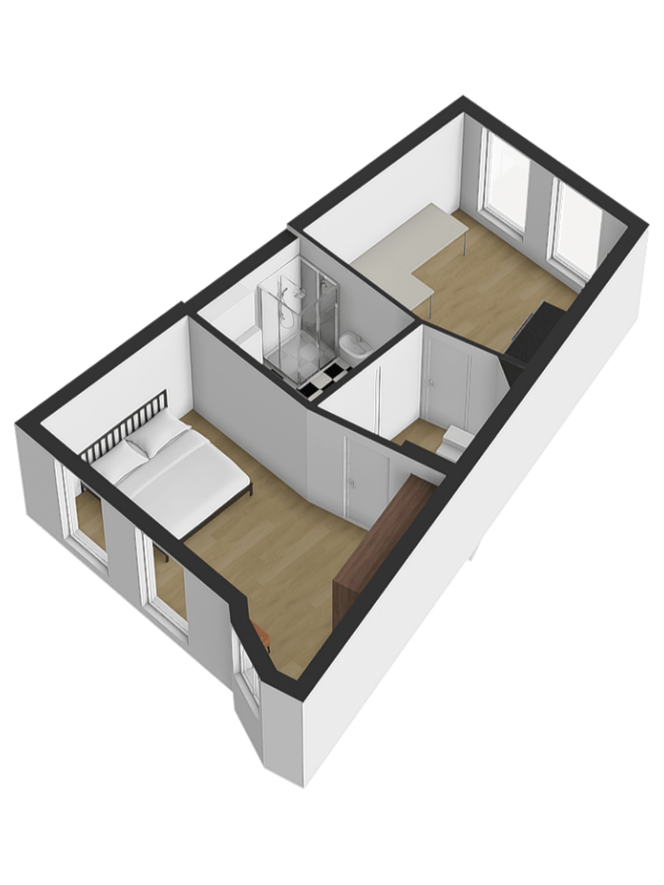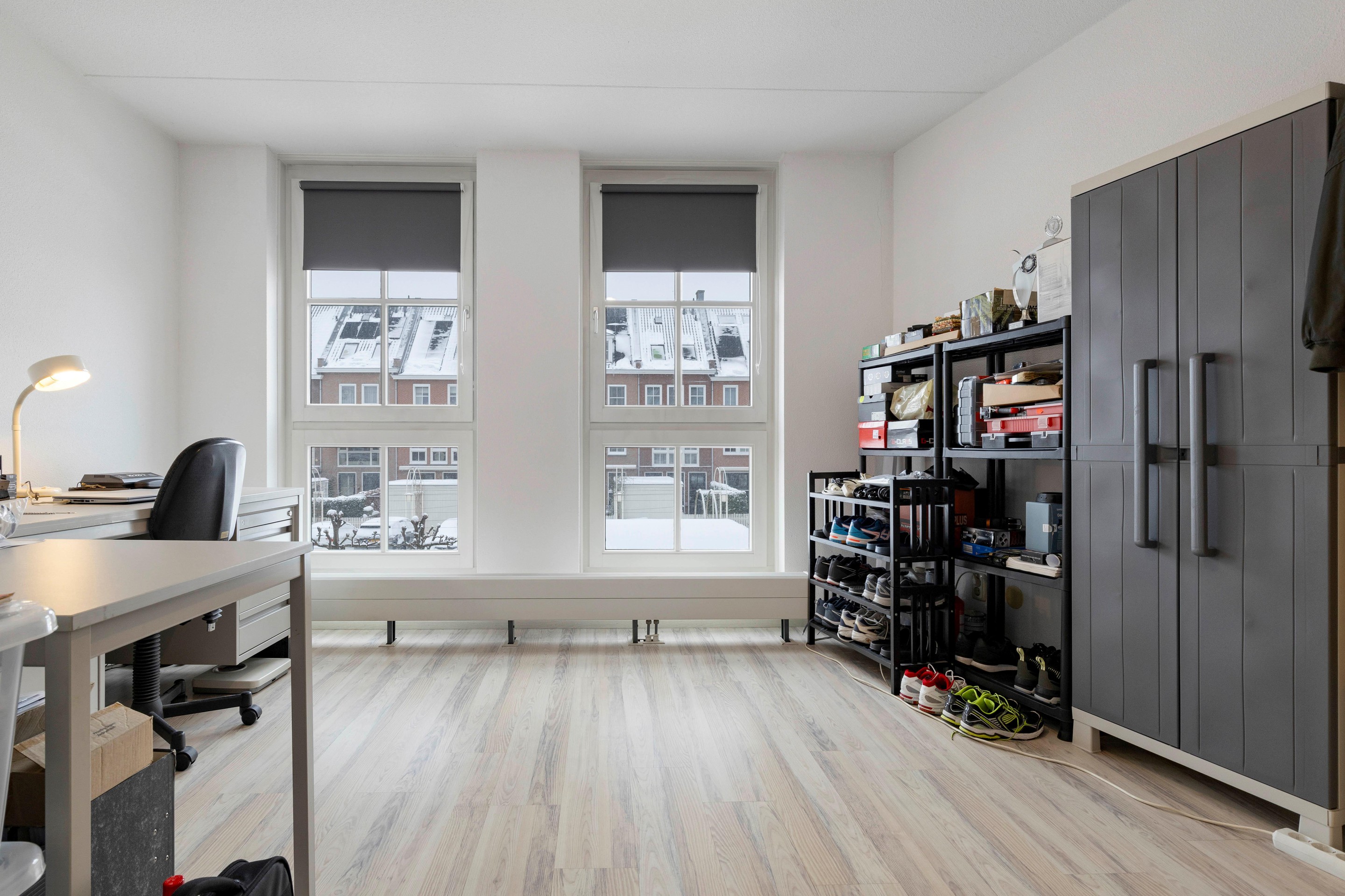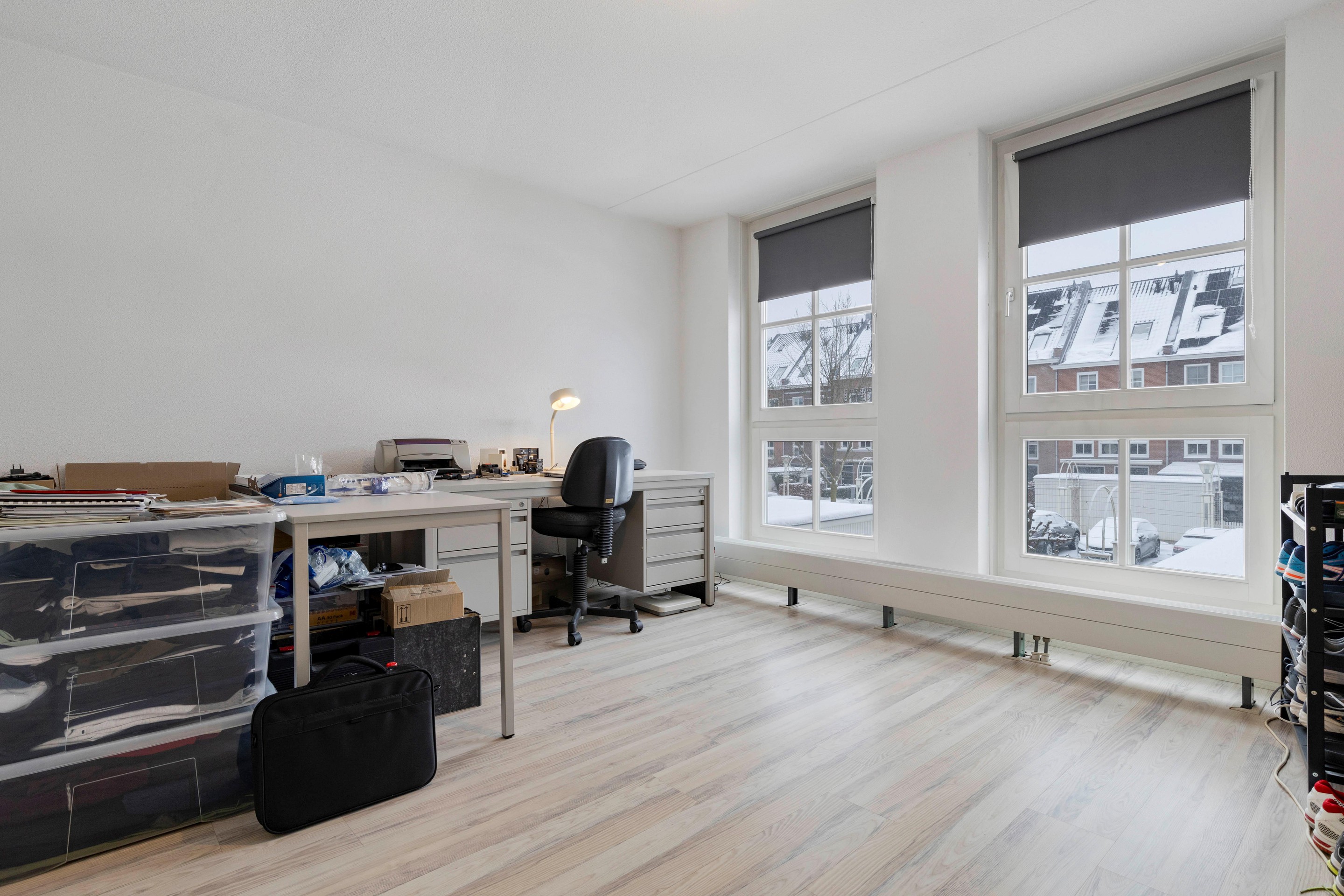 De slaapkamer aan de achterzijde is voorzien van grote draai-/kiepramen met uitzicht over het binnenterrein en een laminaatvloer met elektrische vloerverwarming.