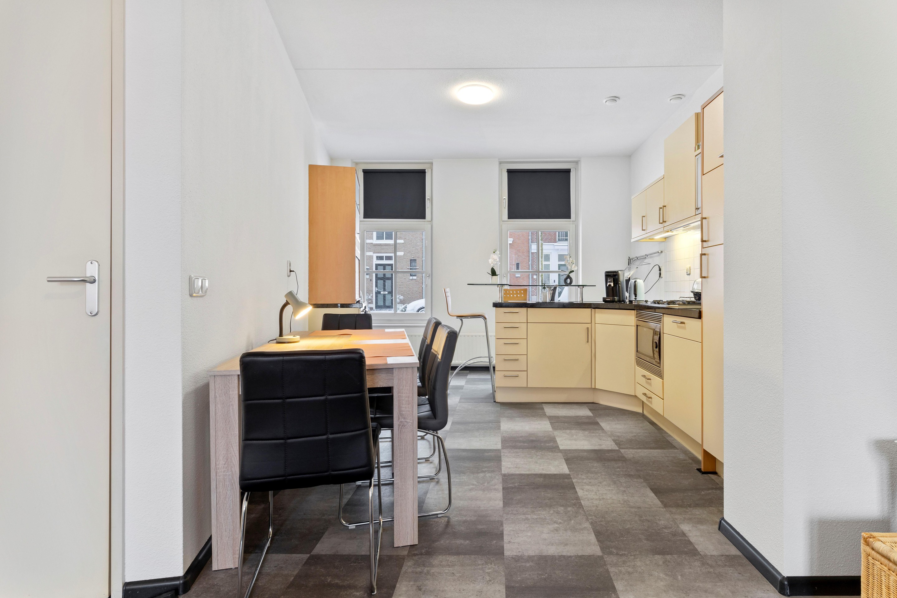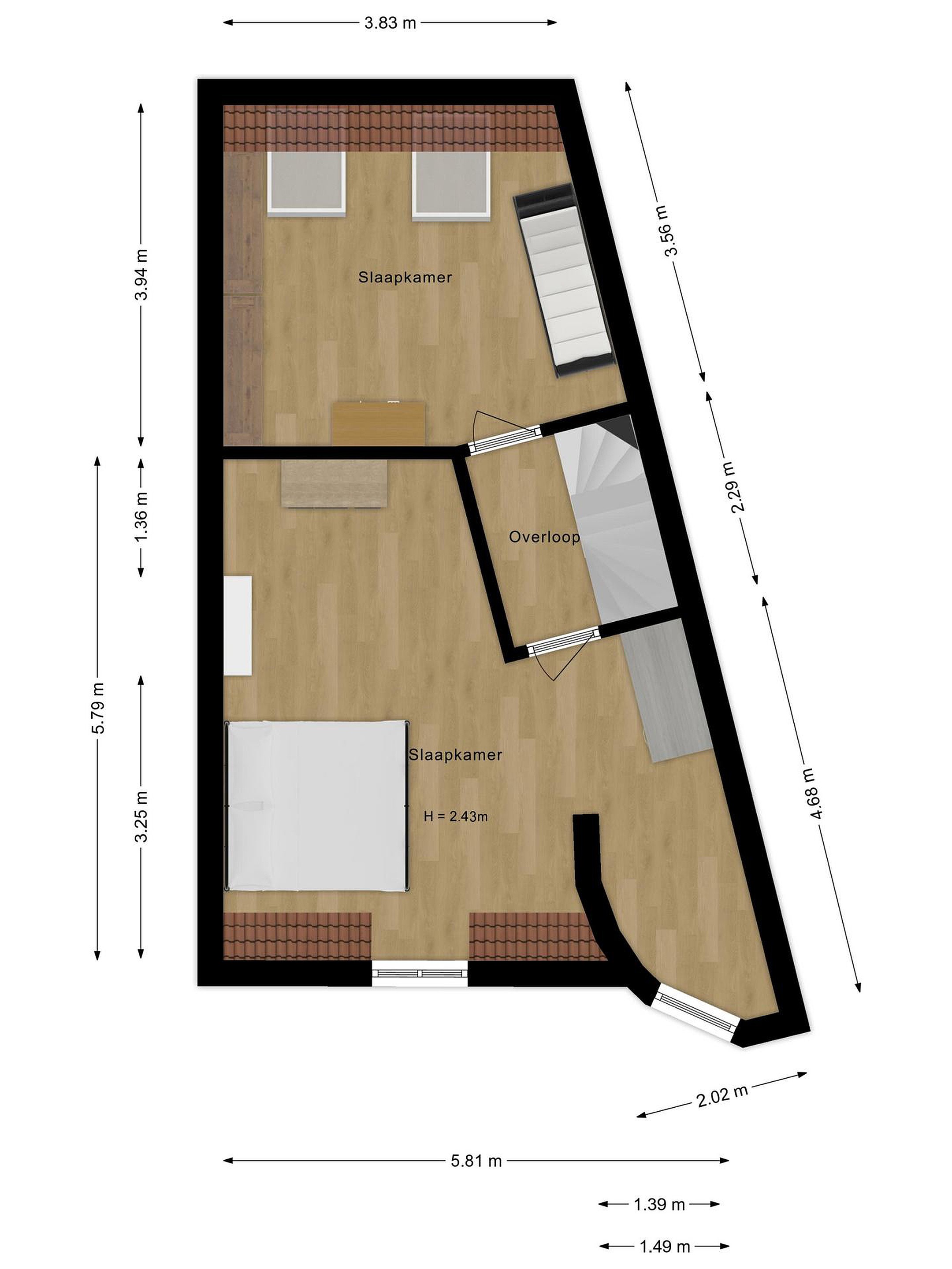 The full-sized second floor offers two large bedrooms. The bedroom at the front is again an attractive tower room with wooden window frames and HR++ double glazing. The bedroom at the rear features two Velux roof windows. Both rooms are finished with laminate flooring and textured plaster walls.