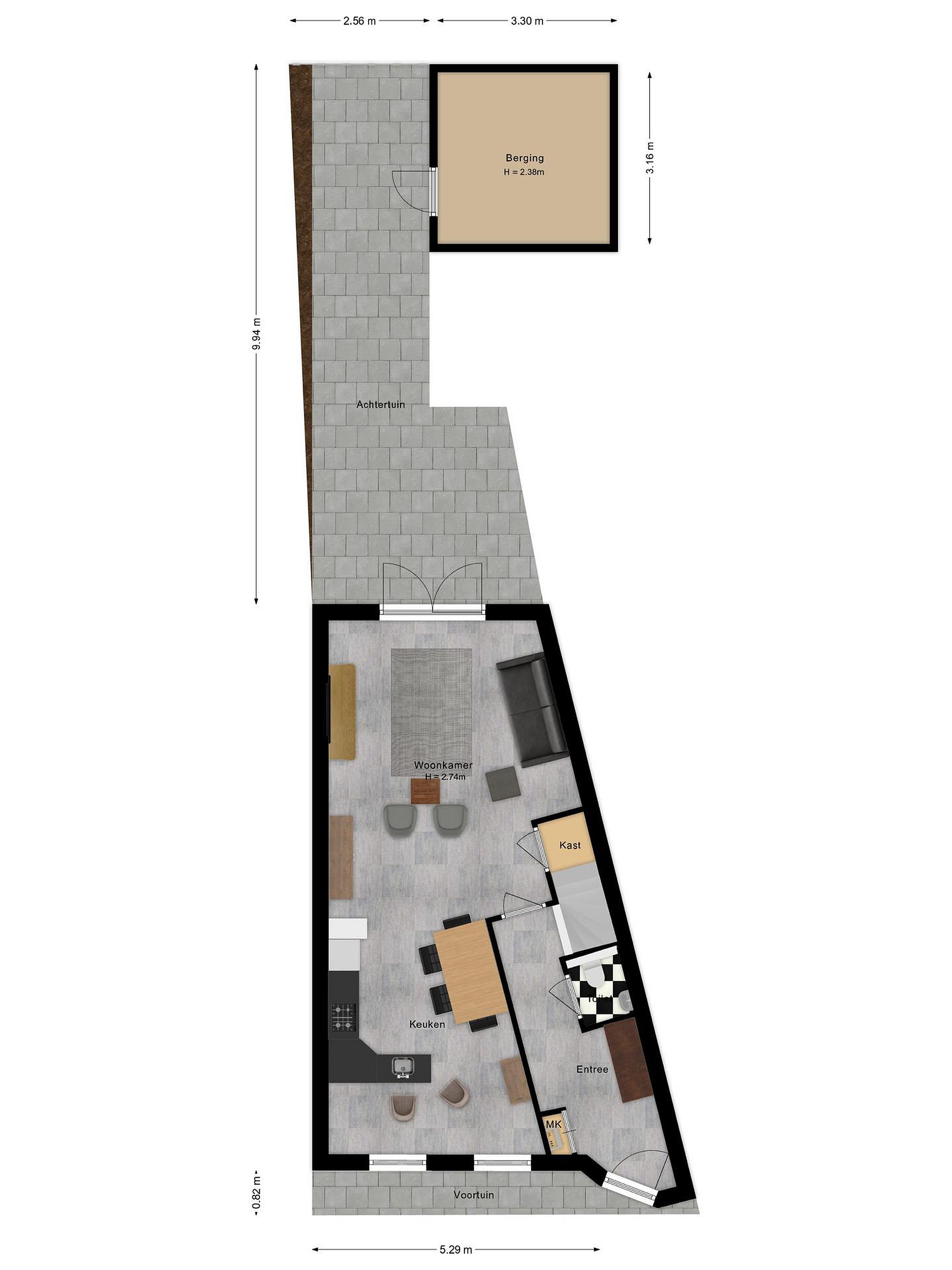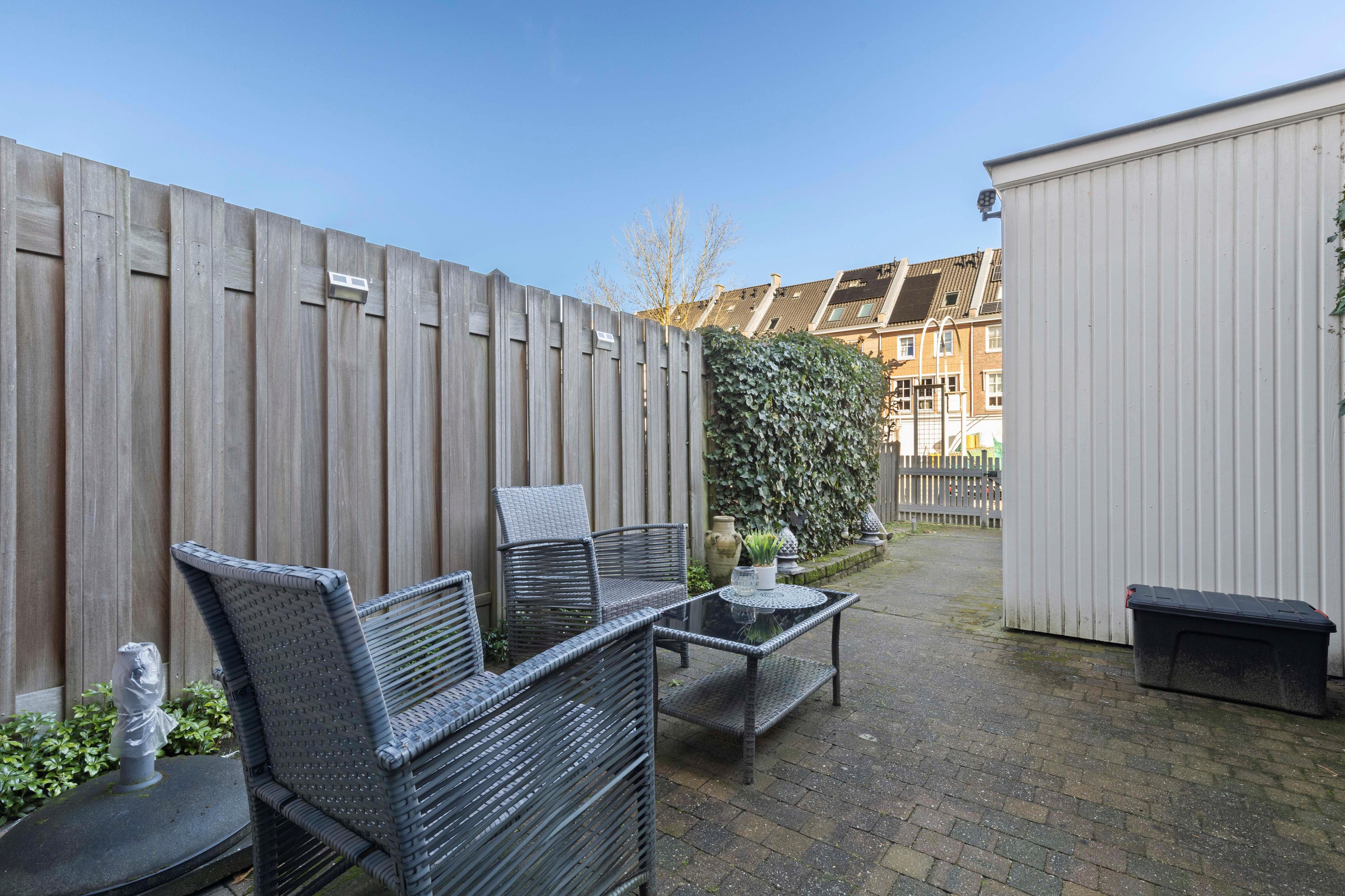 De achtertuin beschikt over een betegeld terras, een ruime berging en een achterom naar het gemeenschappelijke binnenterrein met een privé parkeerplaats.