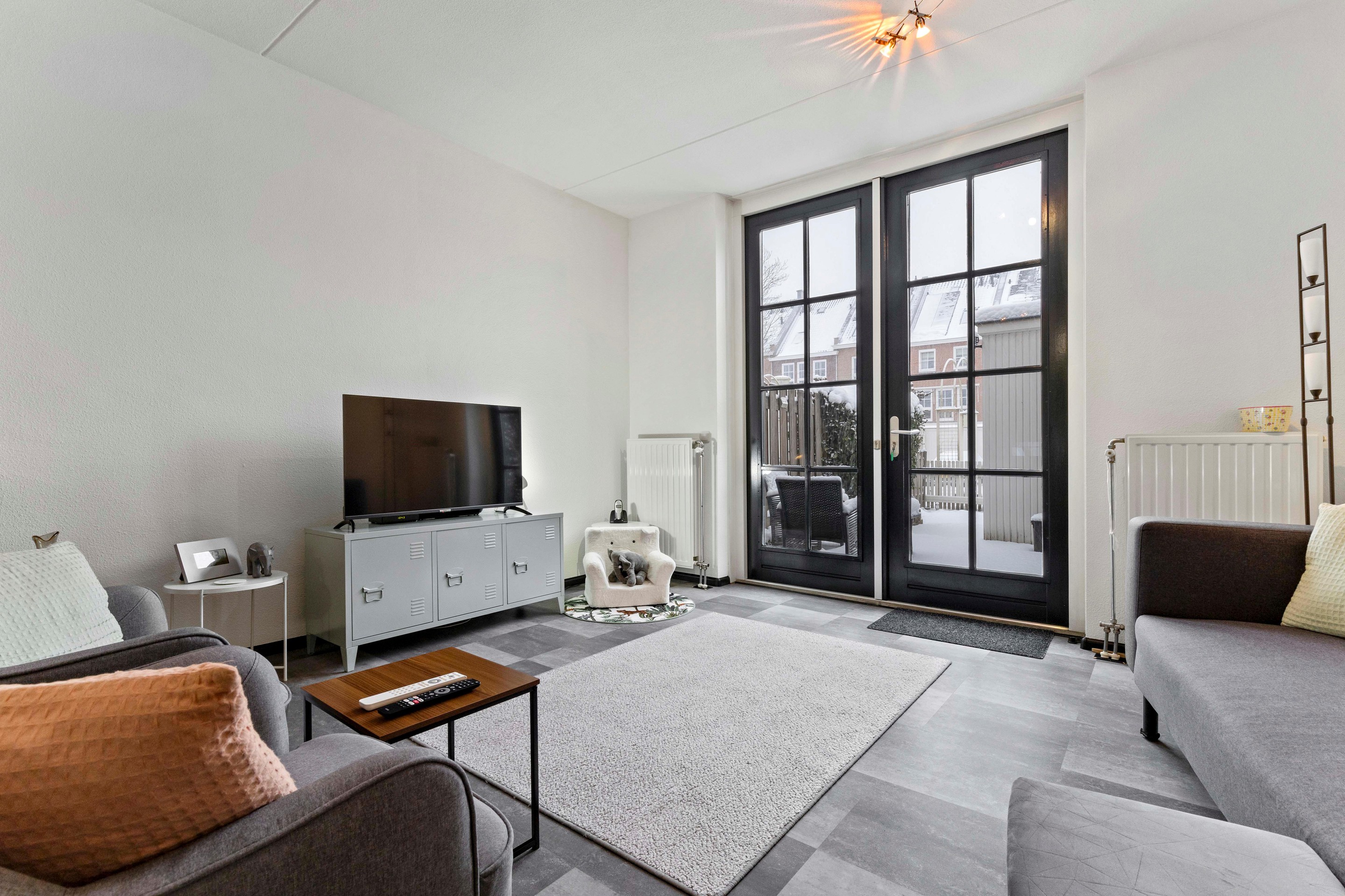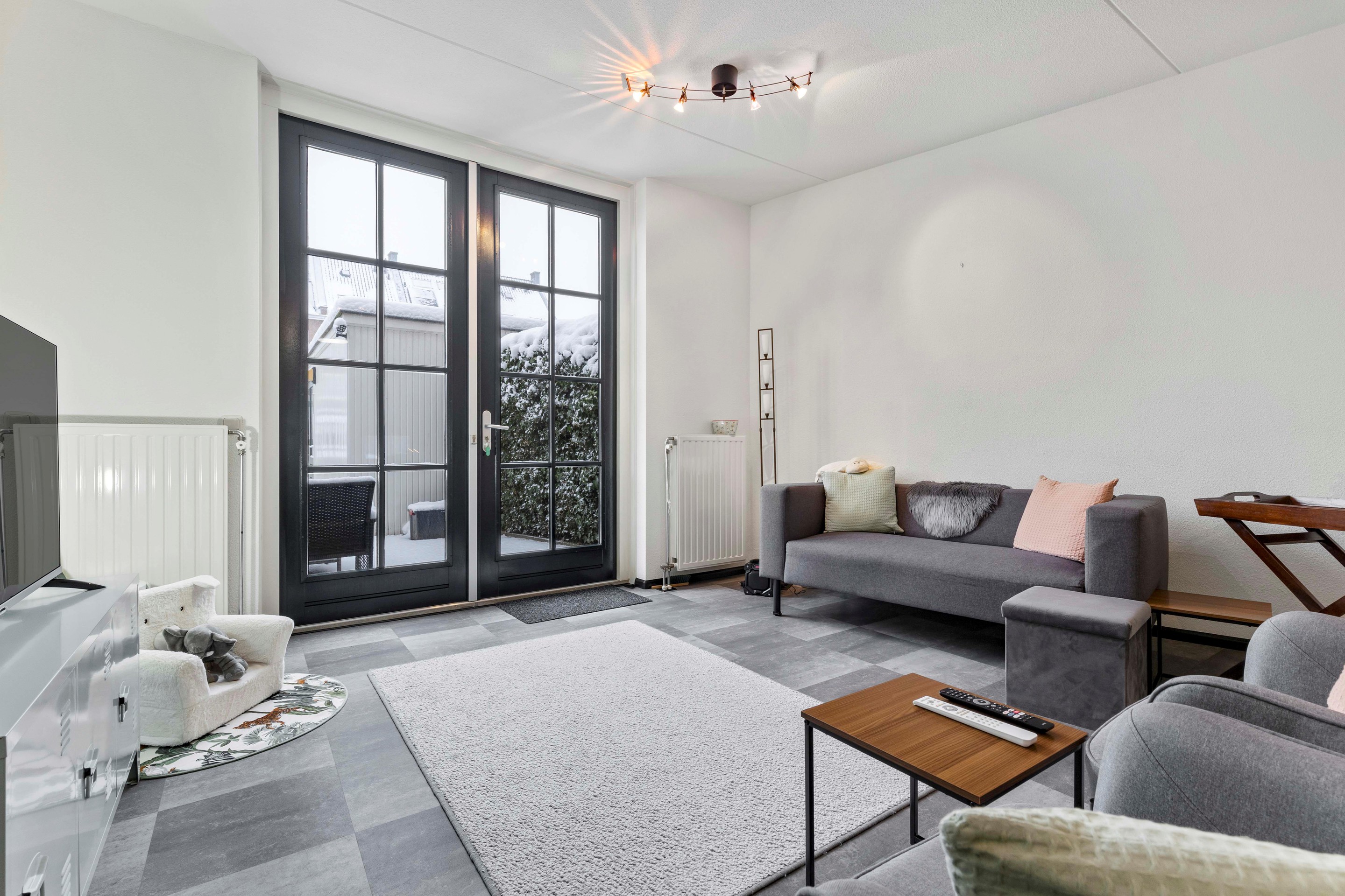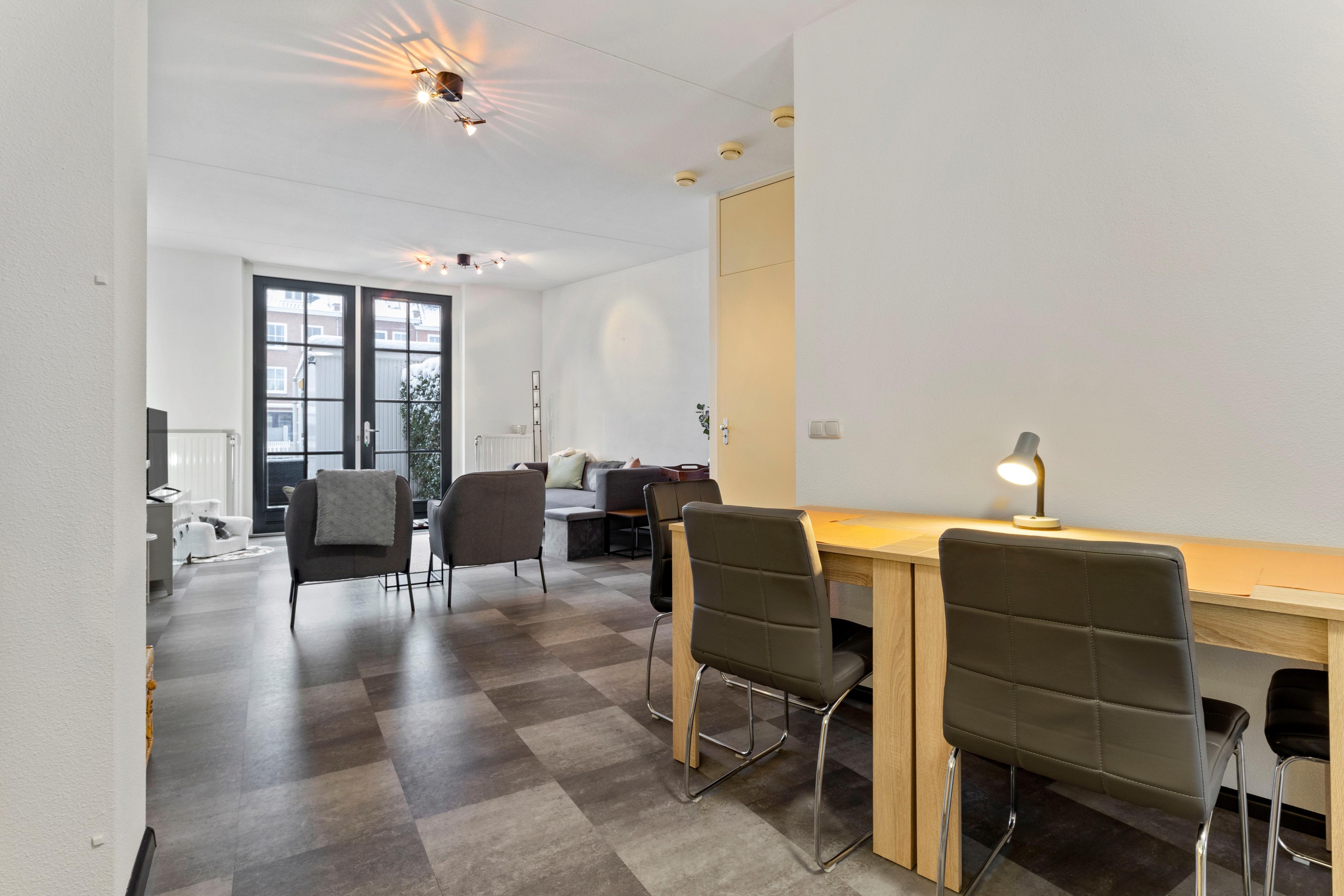 De woonkamer is licht en speels ingedeeld en biedt een prettig uitzicht op de achtertuin. De ruimte is afgewerkt met een laminaatvloer in tegellook en recent vernieuwd binnenschilderwerk. Via de openslaande tuindeuren staat de woonkamer in directe verbinding met de tuin.