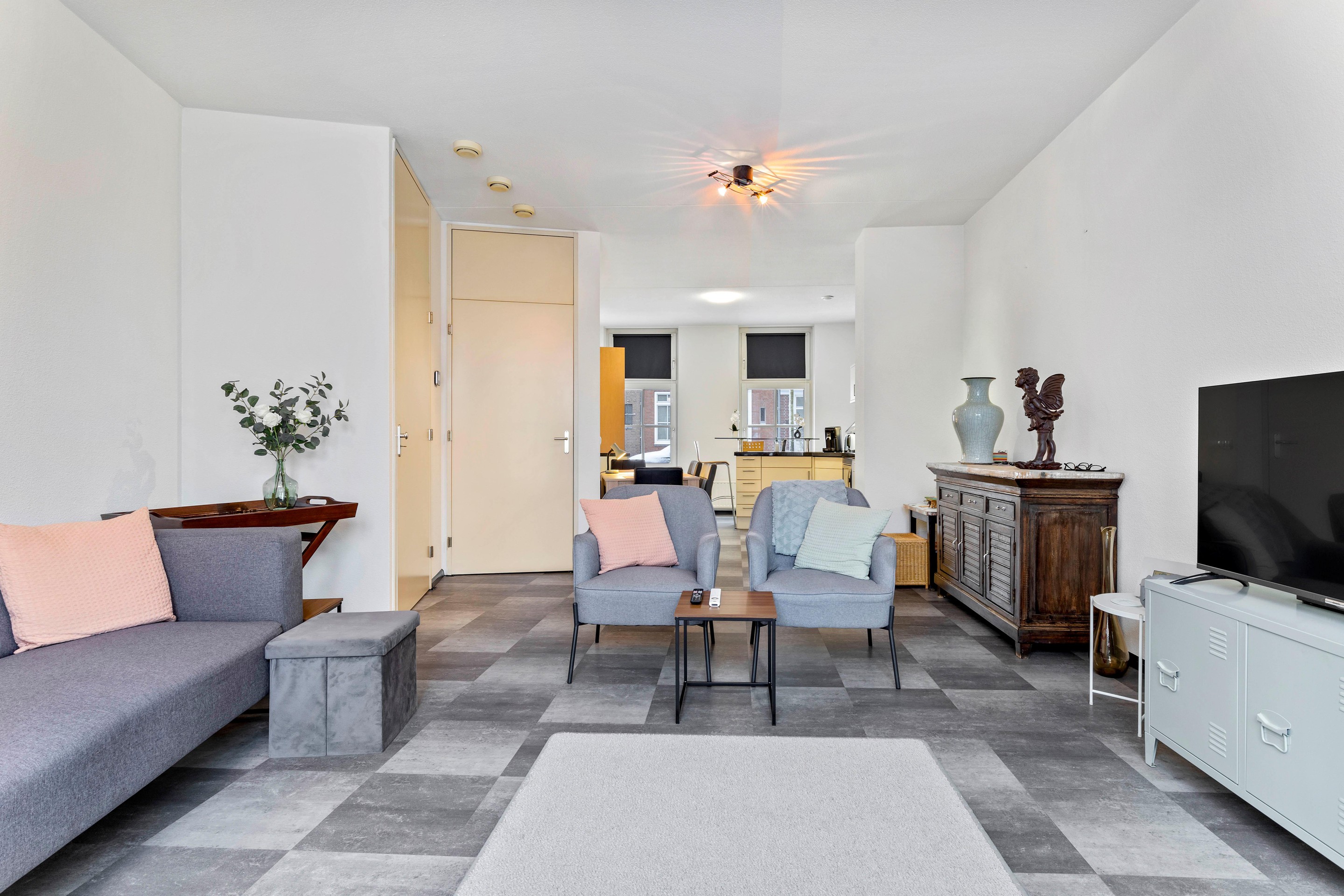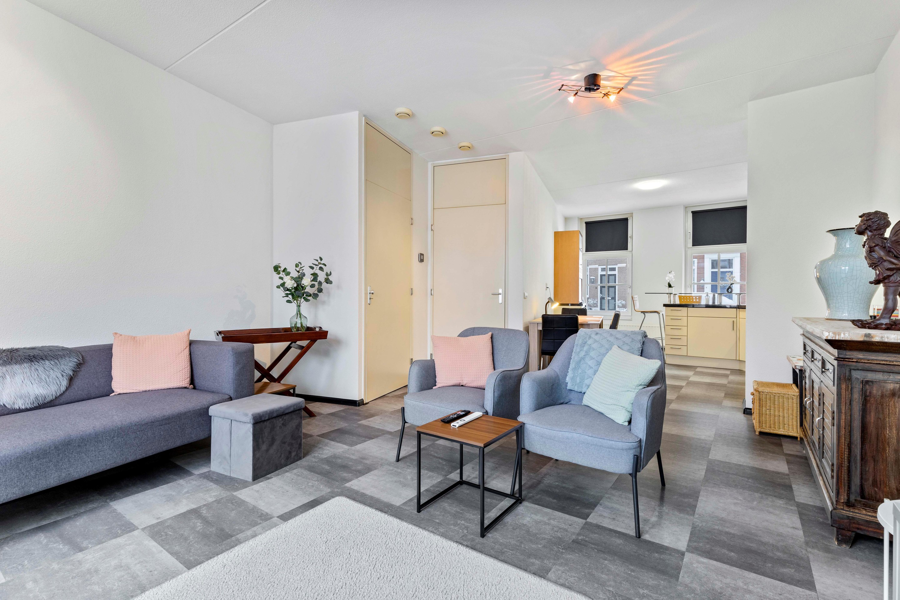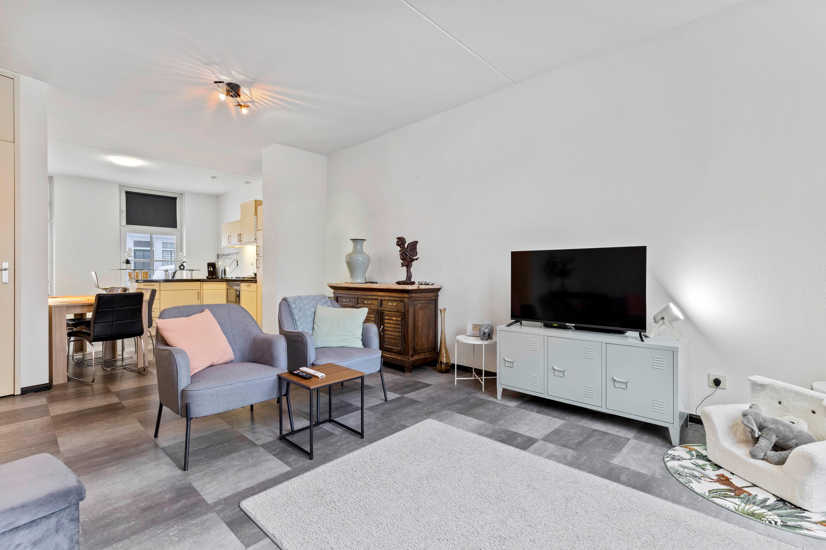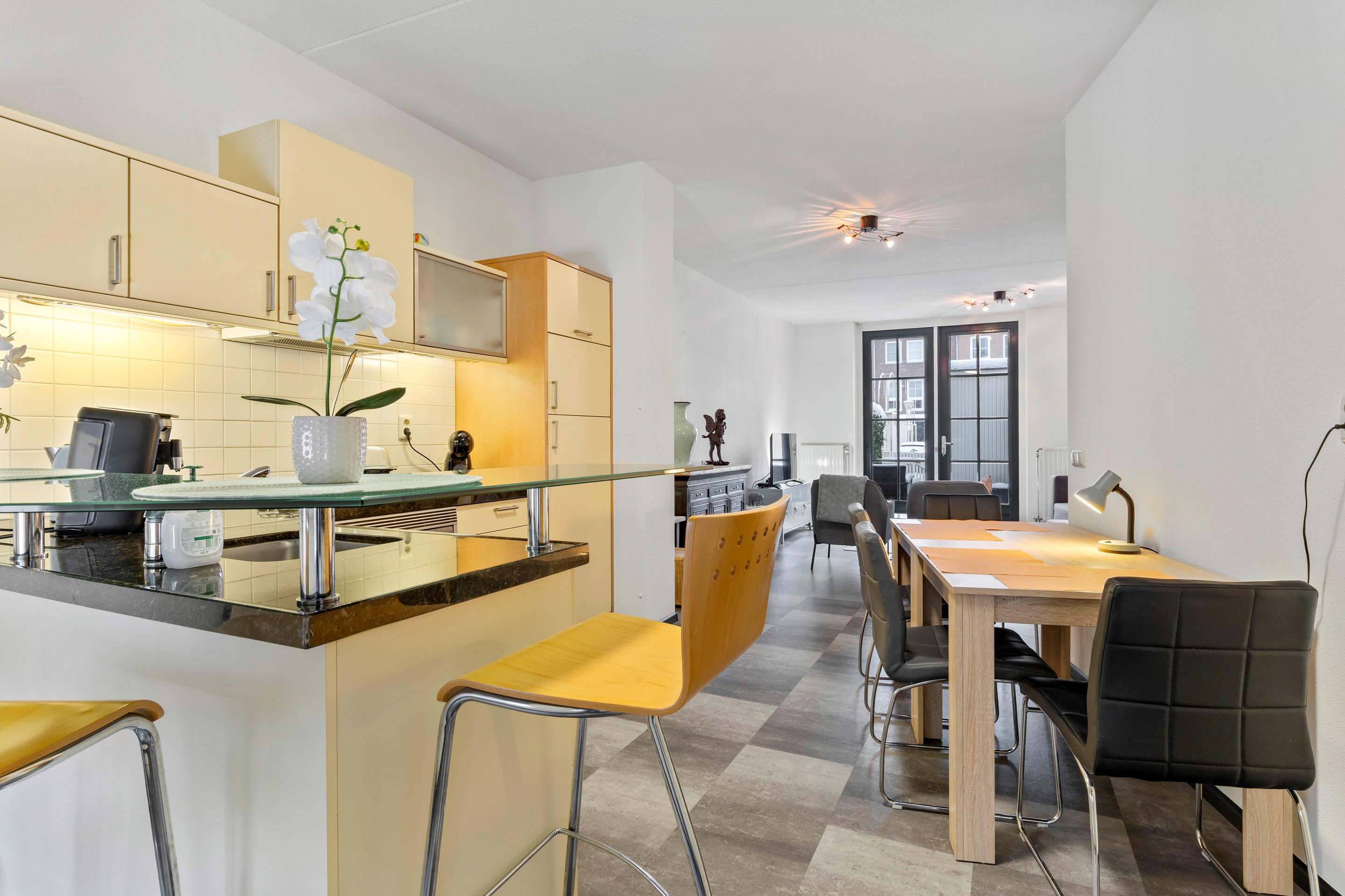De woonkamer is licht en speels ingedeeld en biedt een prettig uitzicht op de achtertuin. De ruimte is afgewerkt met een laminaatvloer in tegellook en recent vernieuwd binnenschilderwerk. Via de openslaande tuindeuren staat de woonkamer in directe verbinding met de tuin.