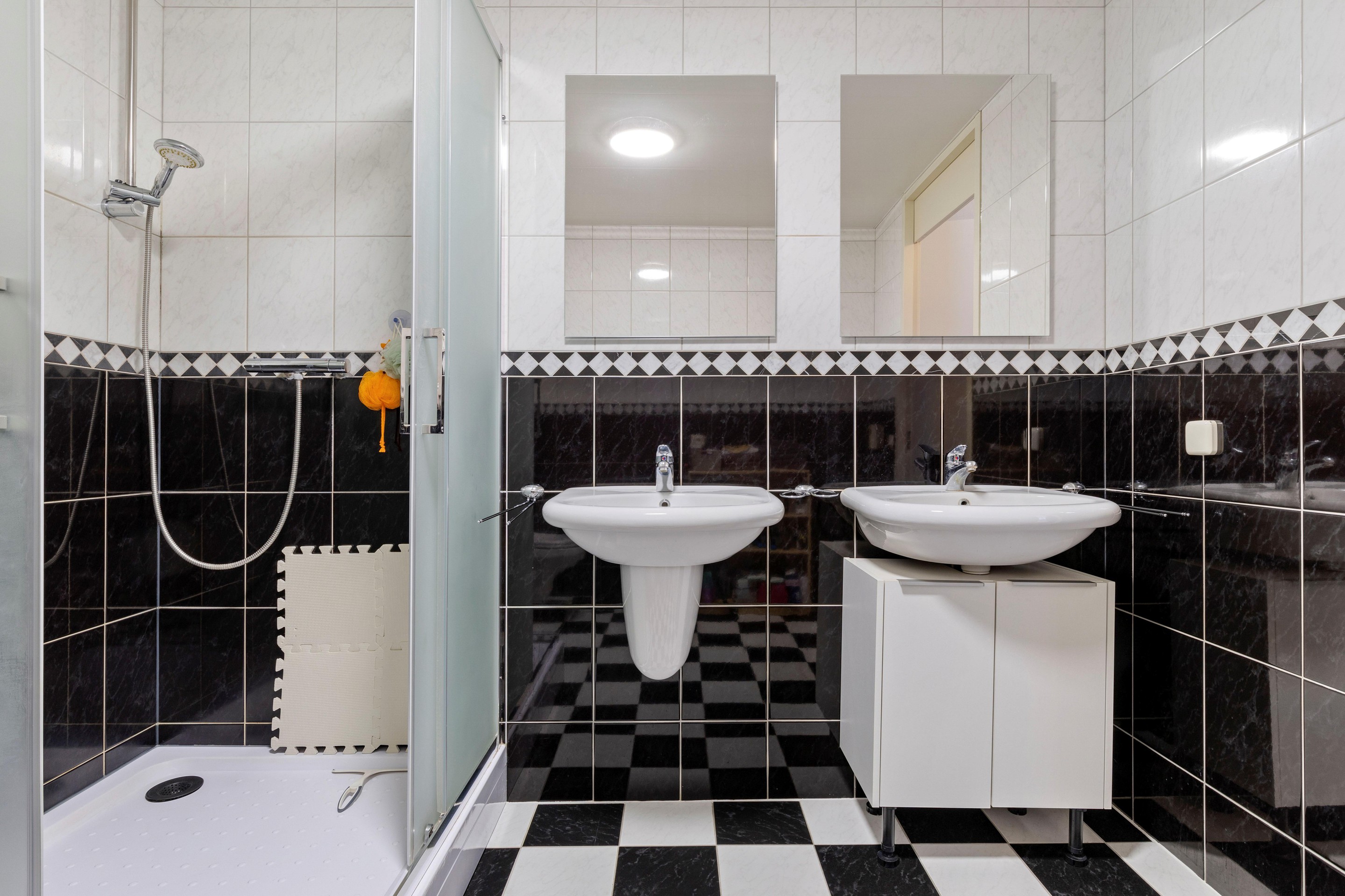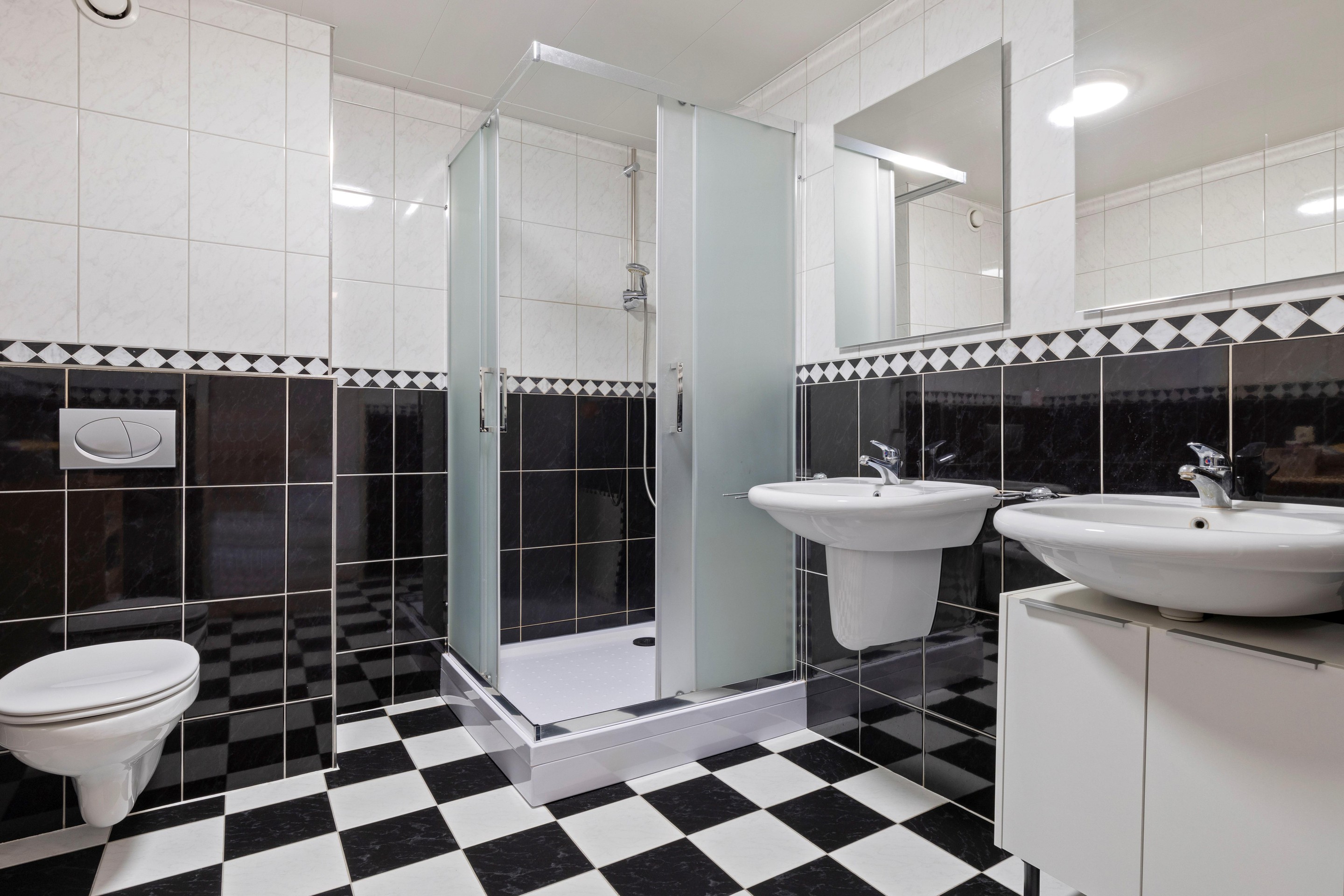 De badkamer is verzorgd en compleet ingericht met een vernieuwde douchecabine, twee wastafels met vernieuwde spiegels en een vrijhangend toilet. De ruimte is afgewerkt met een tegelvloer met elektrische vloerverwarming, tot het plafond betegelde wanden en mechanische ventilatie.