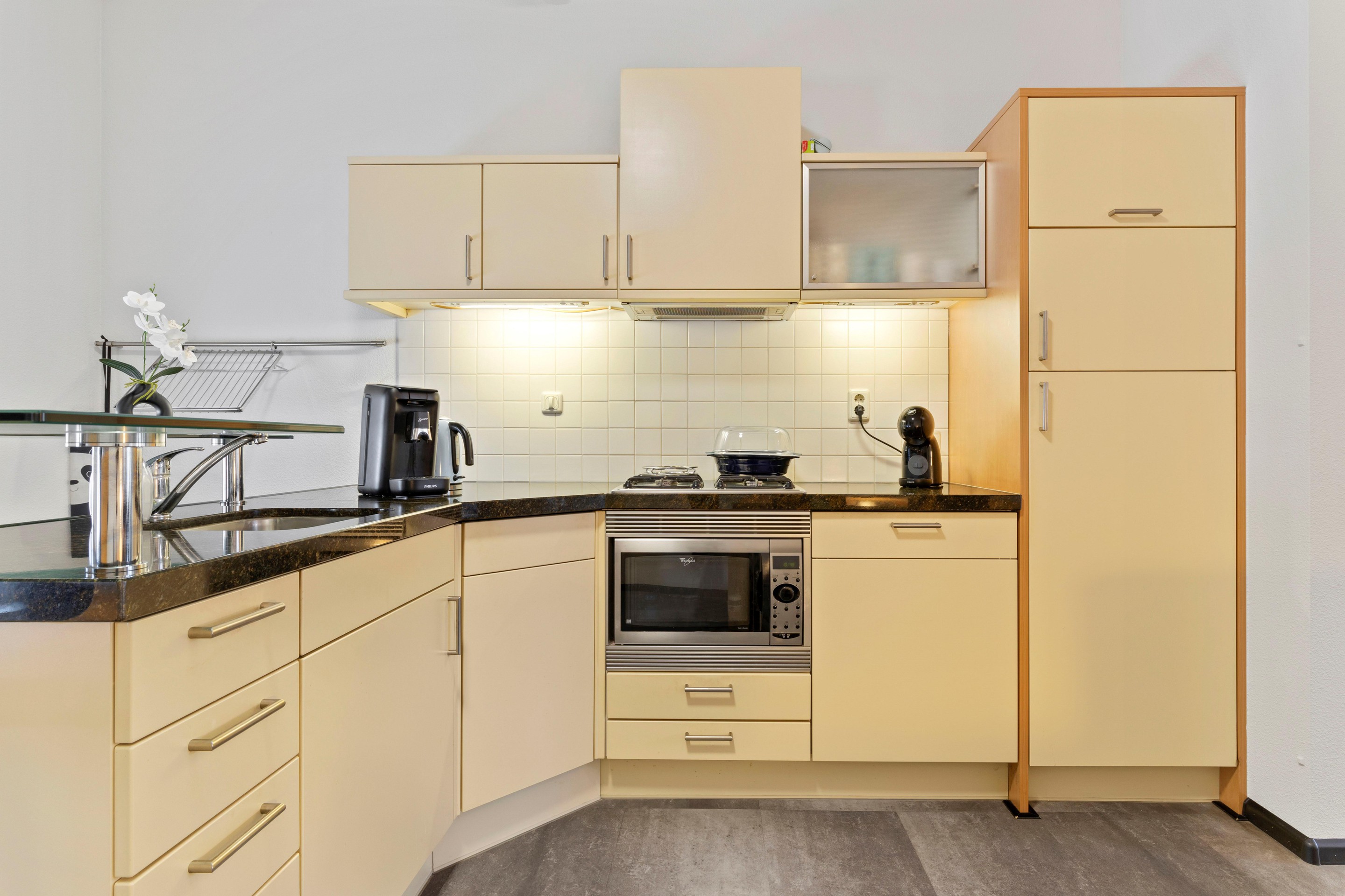 Aan de voorzijde bevindt zich de open keuken in hoekopstelling met barzit. Het keukenblok is voorzien van een hardstenen werkblad en compleet uitgerust met een 4-pits gaskookplaat, spoelbak met close-in boiler, inbouw combi-oven/magnetron, vaatwasser, koelkast, vriezer en diverse kastruimte. Onder de trap bevindt zich een praktische trapkast met volop berg- en proviandruimte.