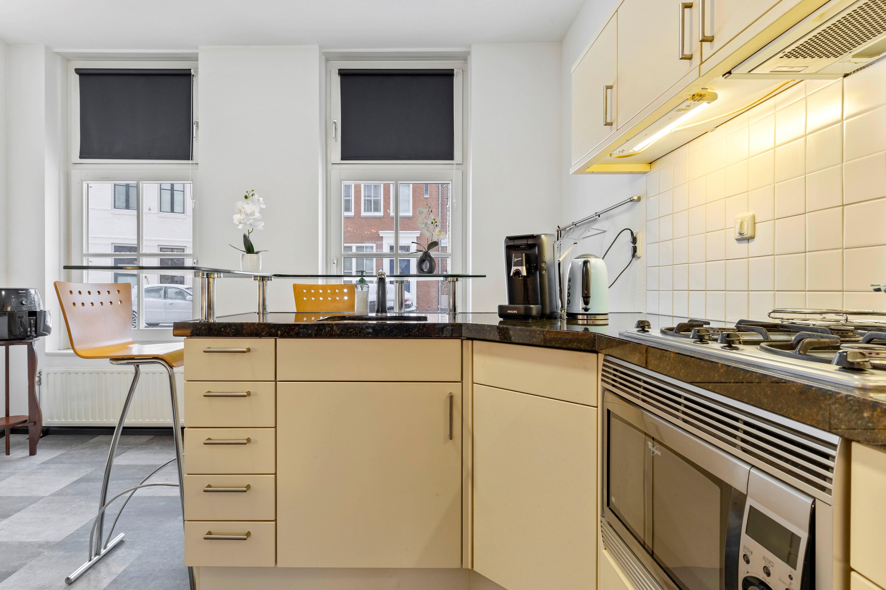 At the front of the house is the open-plan corner kitchen with a breakfast bar. The kitchen is fitted with a granite countertop and fully equipped with a four-burner gas stove, sink with close-in boiler, built-in combi oven/microwave, dishwasher, refrigerator, freezer, and ample cabinet space. Under the stairs, there is a practical storage cupboard with plenty of storage and pantry space.