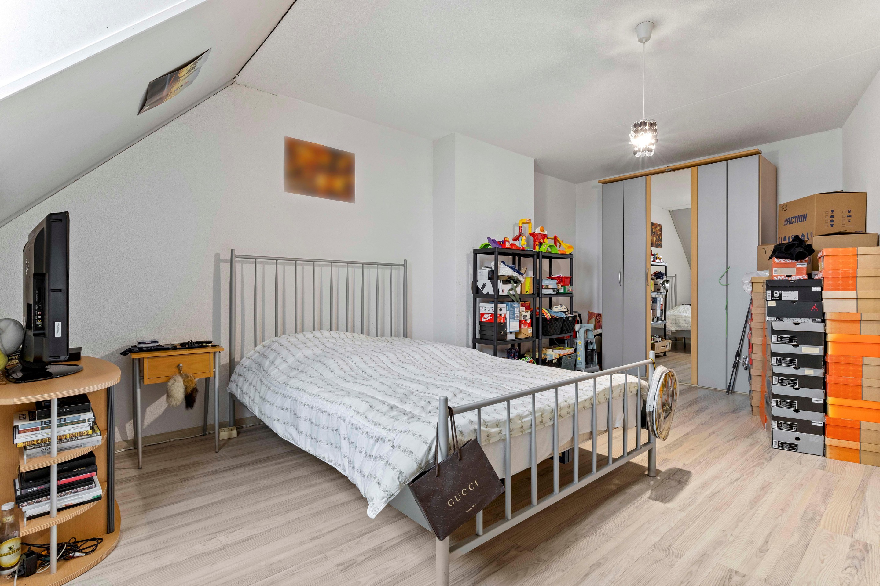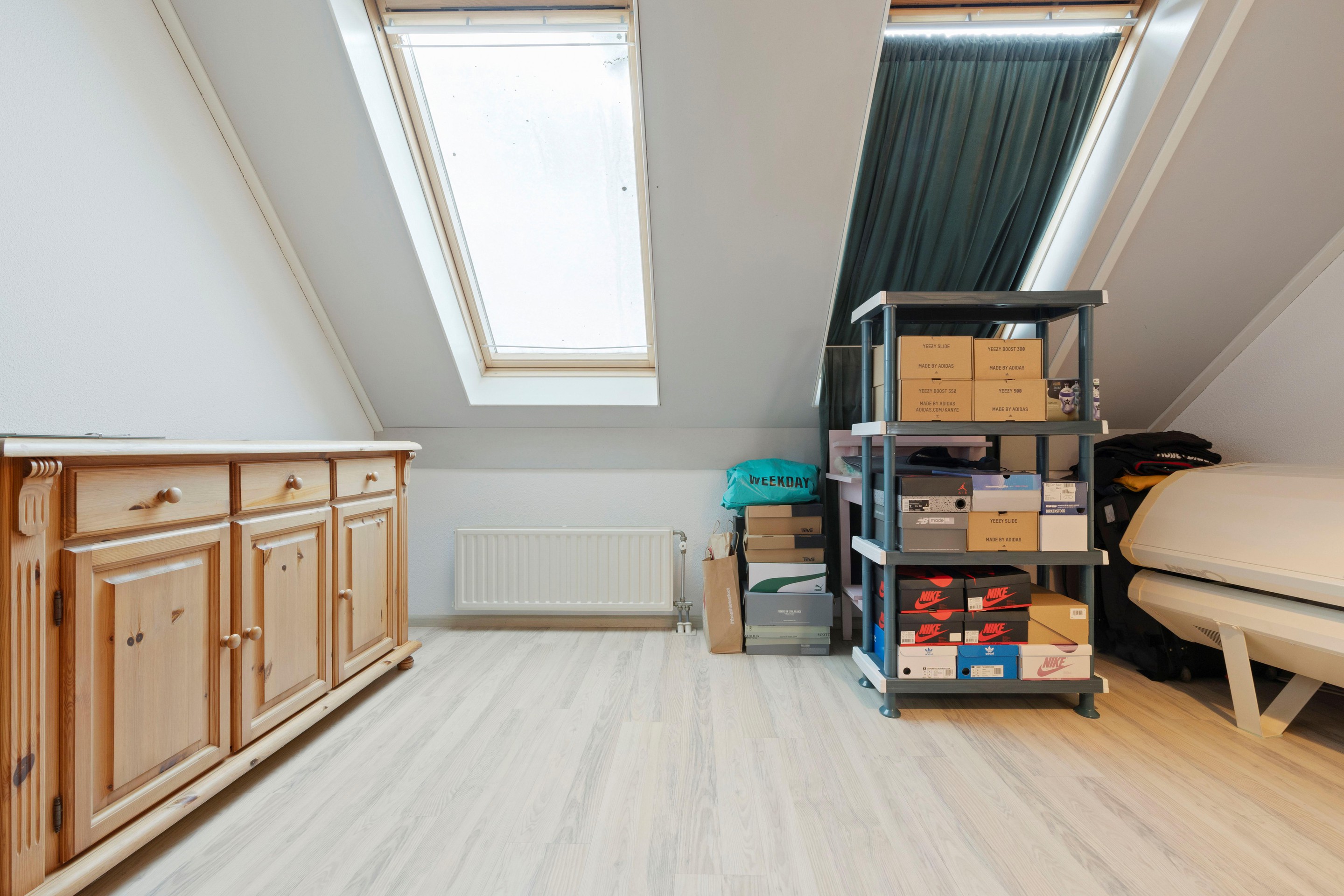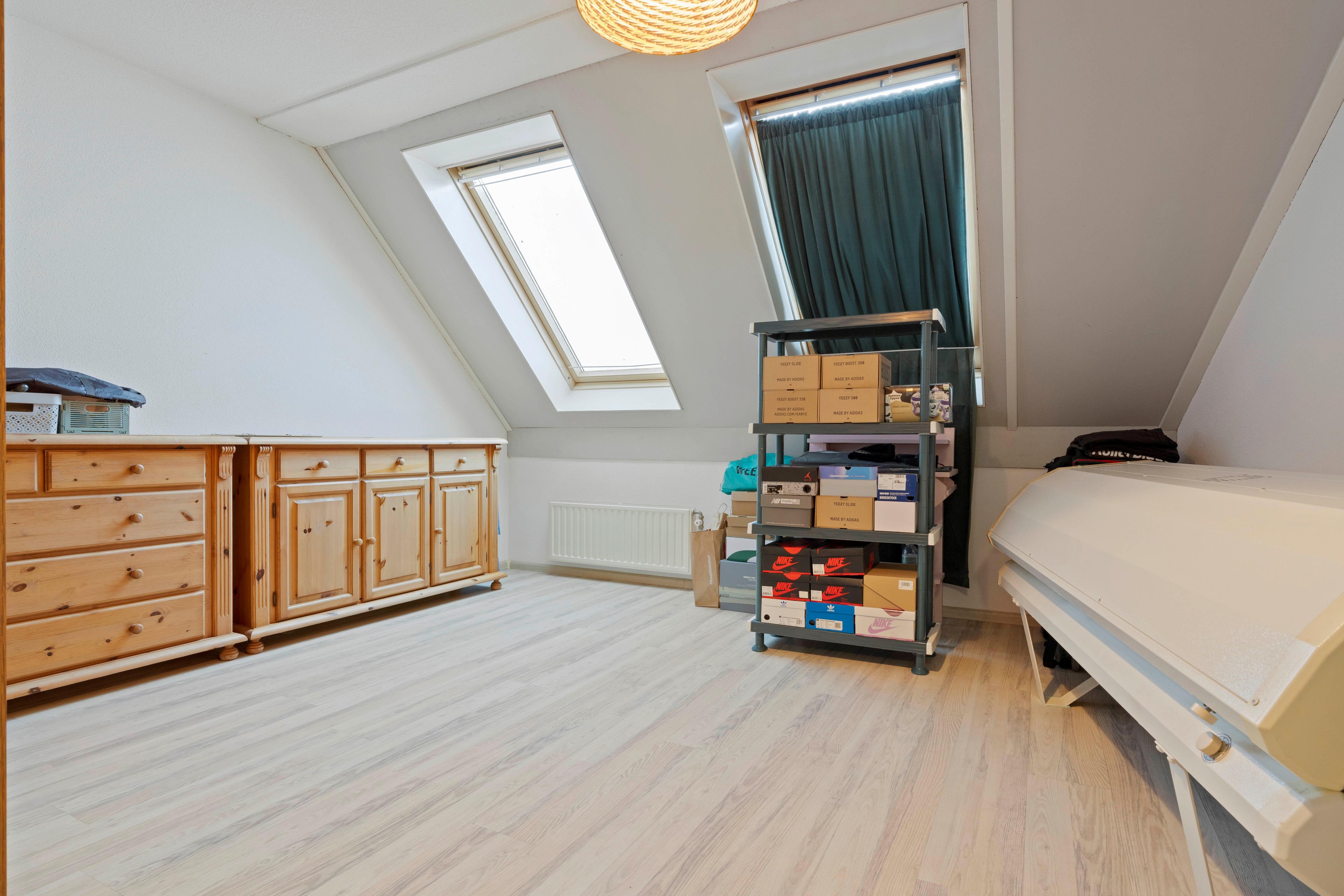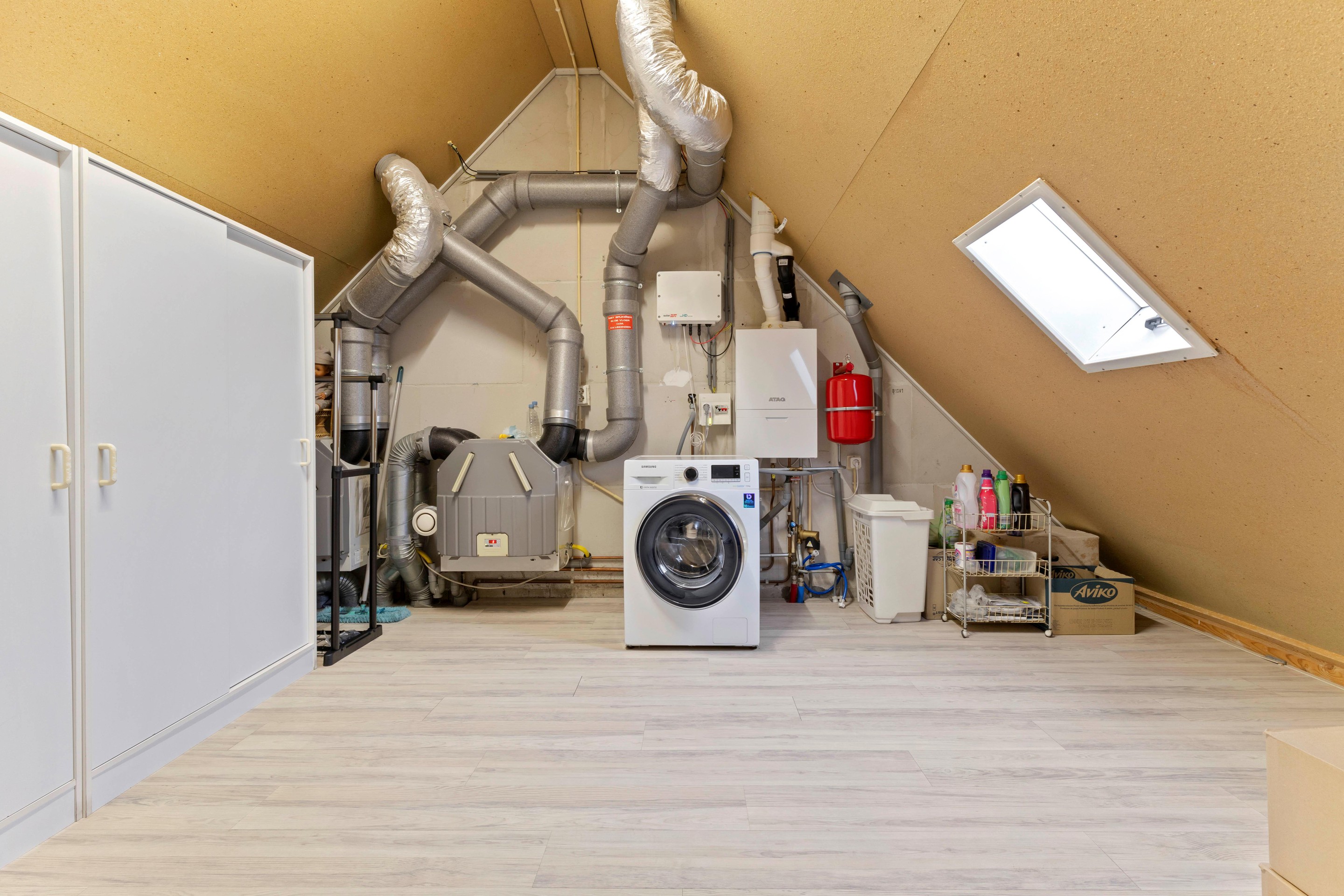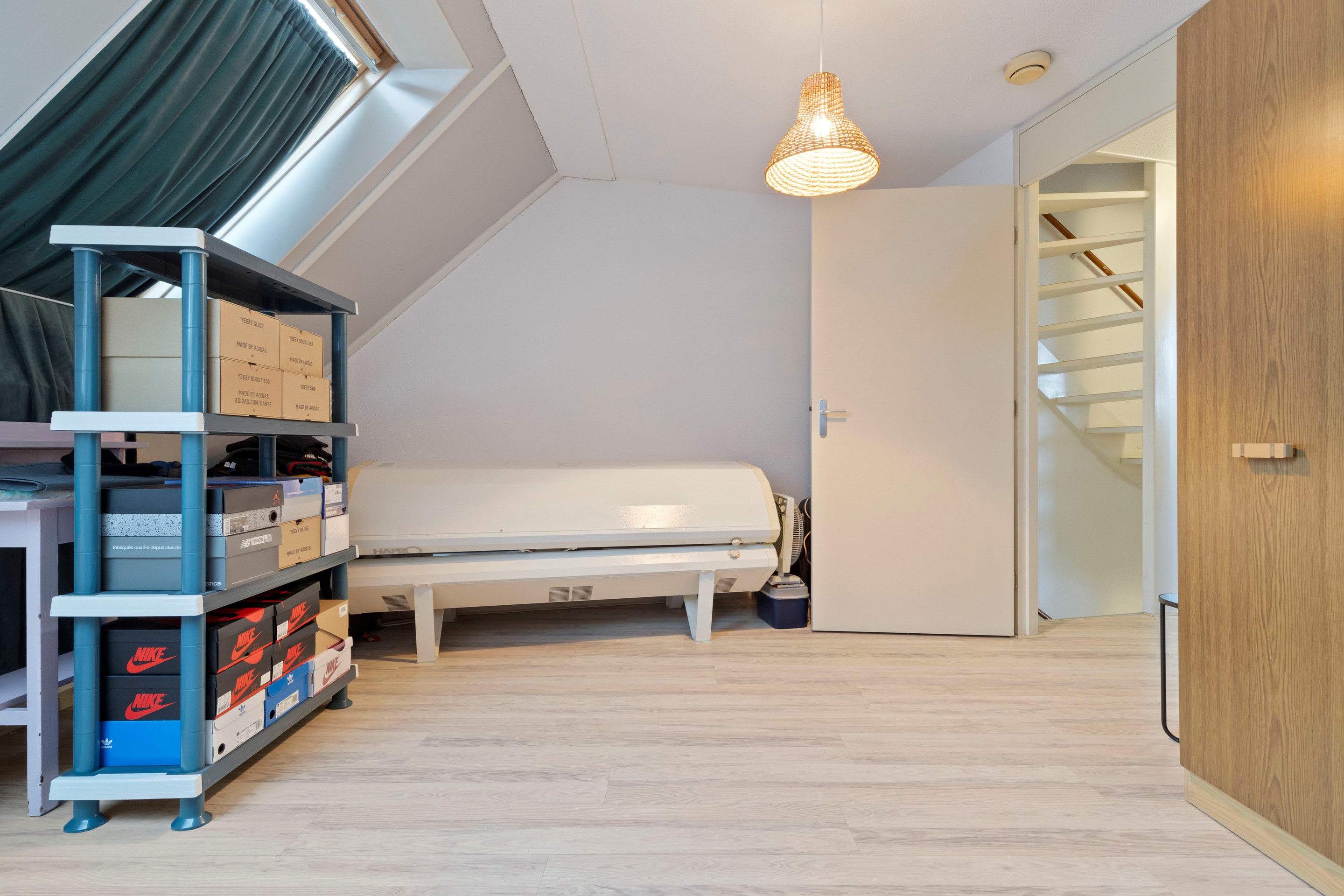 A fixed staircase leads to the attic floor with an open attic space and ample storage. Here you will find the connections for laundry appliances, the Atag central heating boiler from 2020, and a double heat recovery ventilation unit (HRV). The attic is fully insulated and fitted with a double-glazed roof window, radiator, and laminate flooring, making it possible to create a fifth (bed)room if desired.