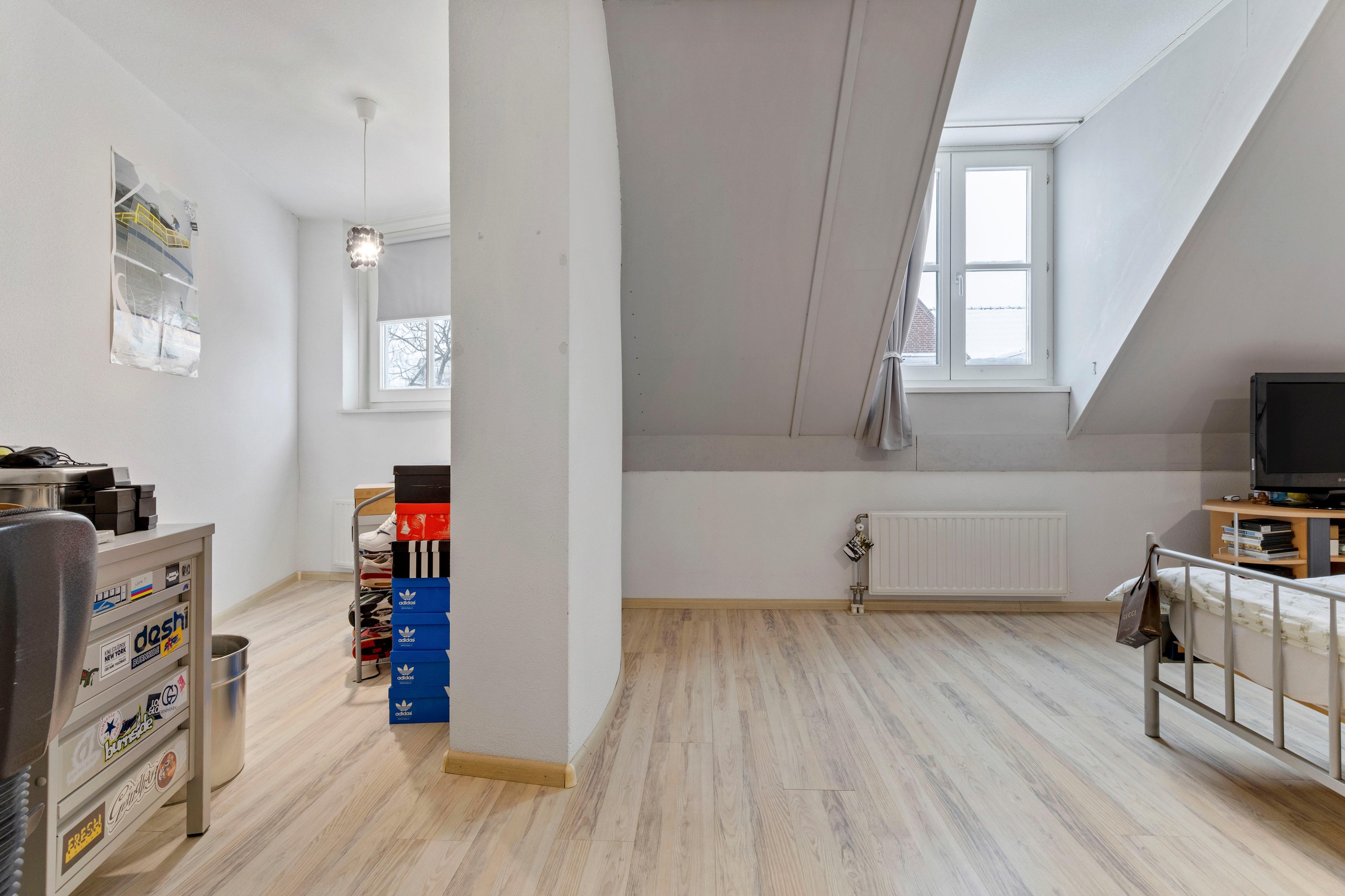 The bedroom at the front features a characteristic tower room with multiple tilt-and-turn windows that allow beautiful natural light. The room is finished with a laminate floor and textured plaster walls.