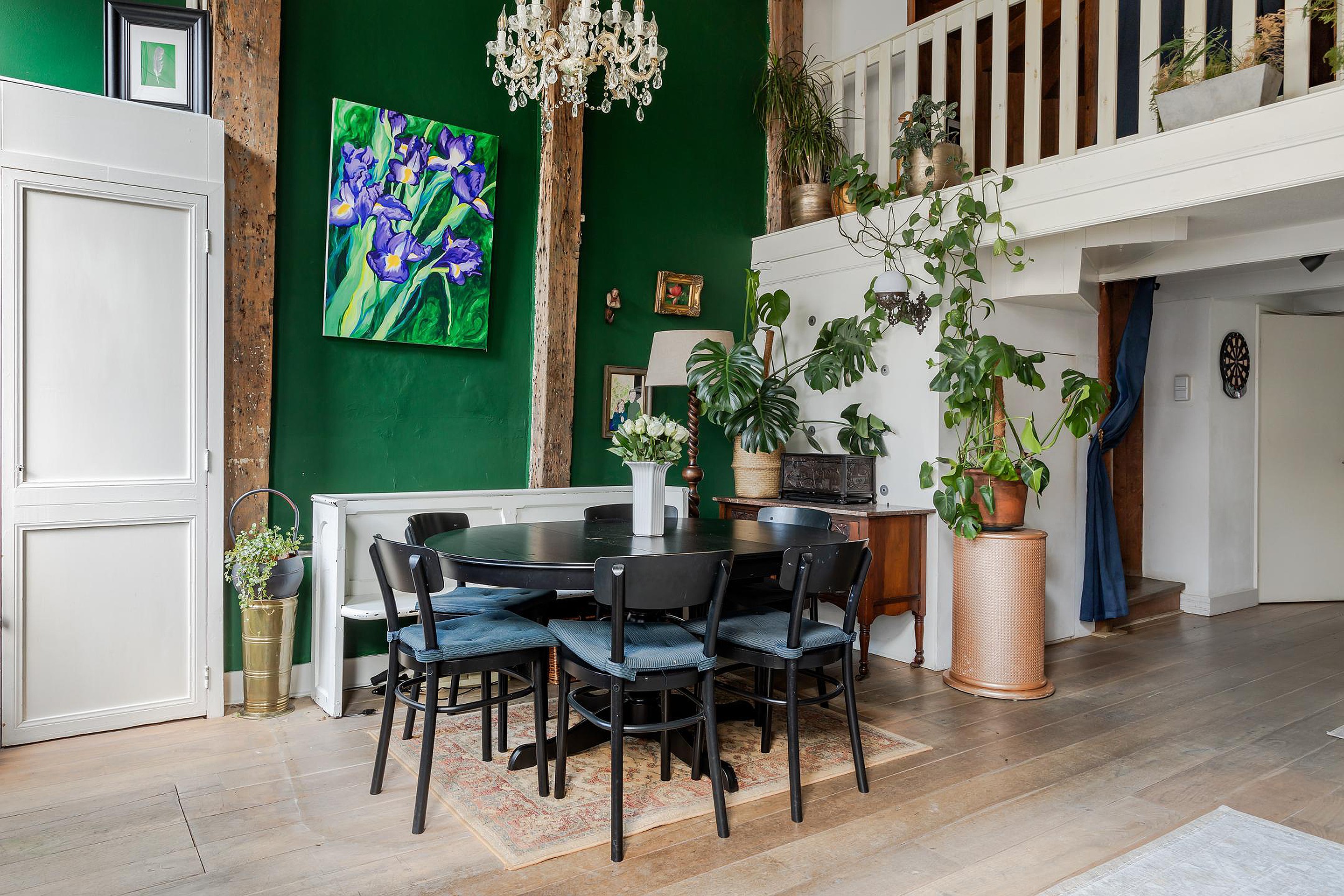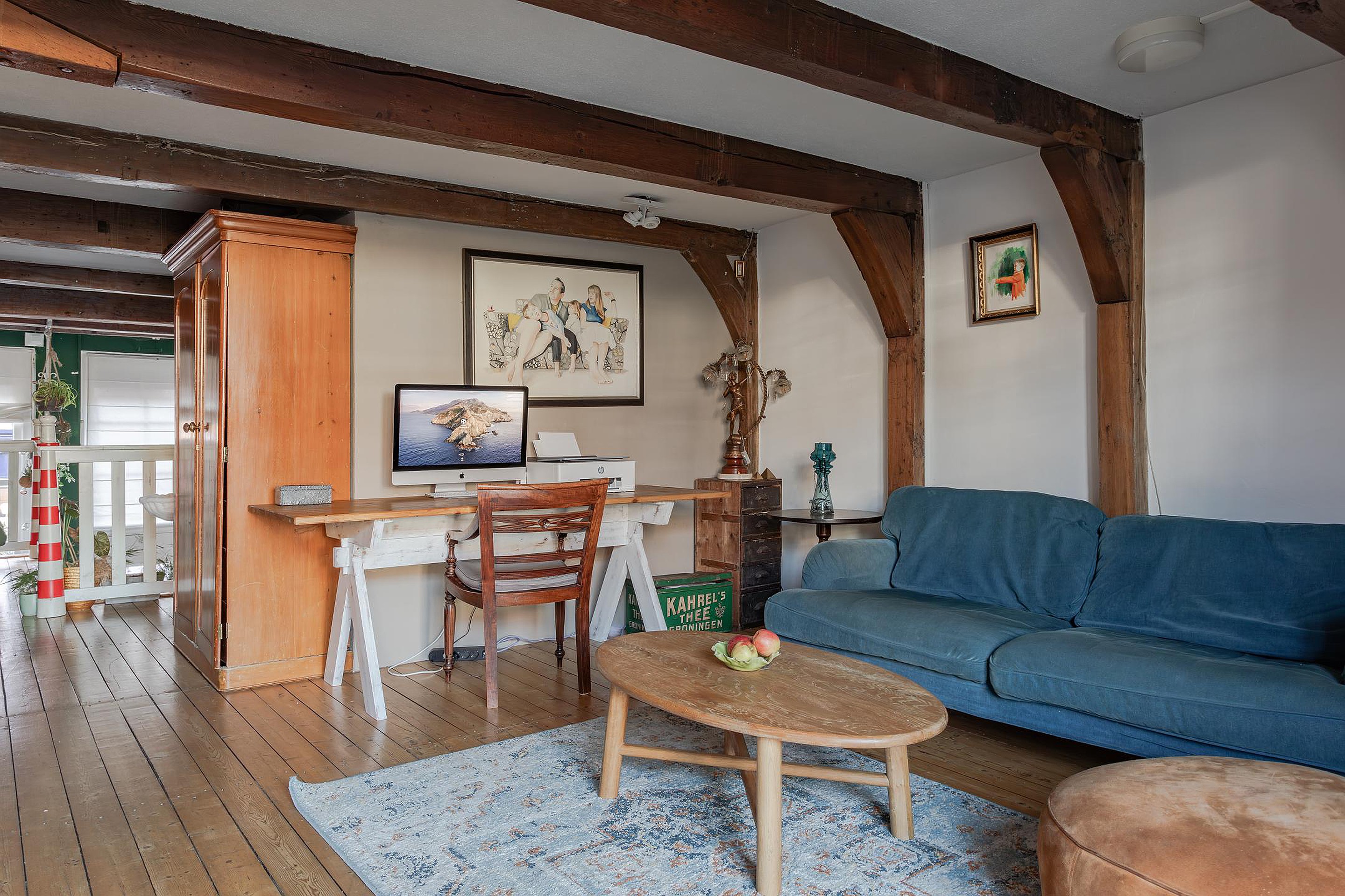 De gevel van dit bijzondere pand heeft een snijvoeg en bovenaan pronkt een fraaie klokgevel. Als u door de voordeur stapt wordt u verwelkomt door een prachtige leefruimte met hoog plafond met de vloerbalken in het zicht, alsmede de vide. Hoge roederamen met enkel glas geven veel lichtinval en in de zomer kunnen de elektrisch te bedienen markiezen worden uitgezet. Op de vloer ligt een massief eikenhouten vloer. Om de radiatoren zit een ombouw, vaste hoge kasten sieren de wanden en er zit een oude schouw met antieke tegeltjes die ook als drempels zijn geplaatst. Een lust voor het oog! In het vaste dressoir zit enorm veel bergruimte en en-suite deuren geven toegang tot de gezellige woonkeuken.