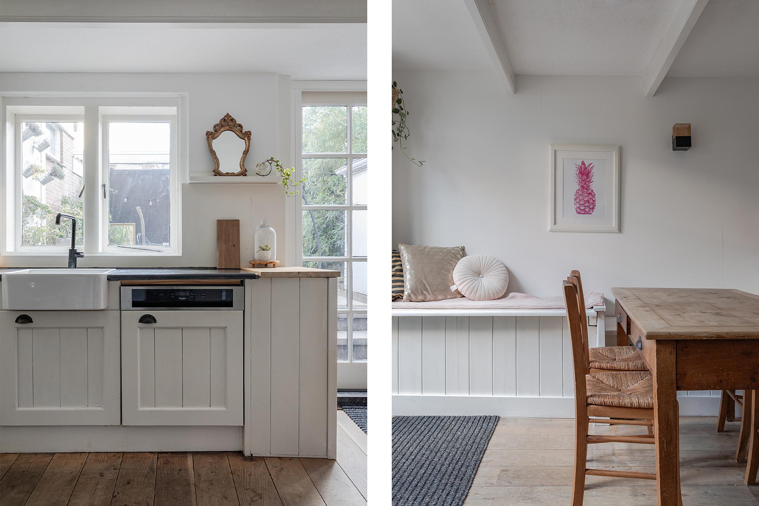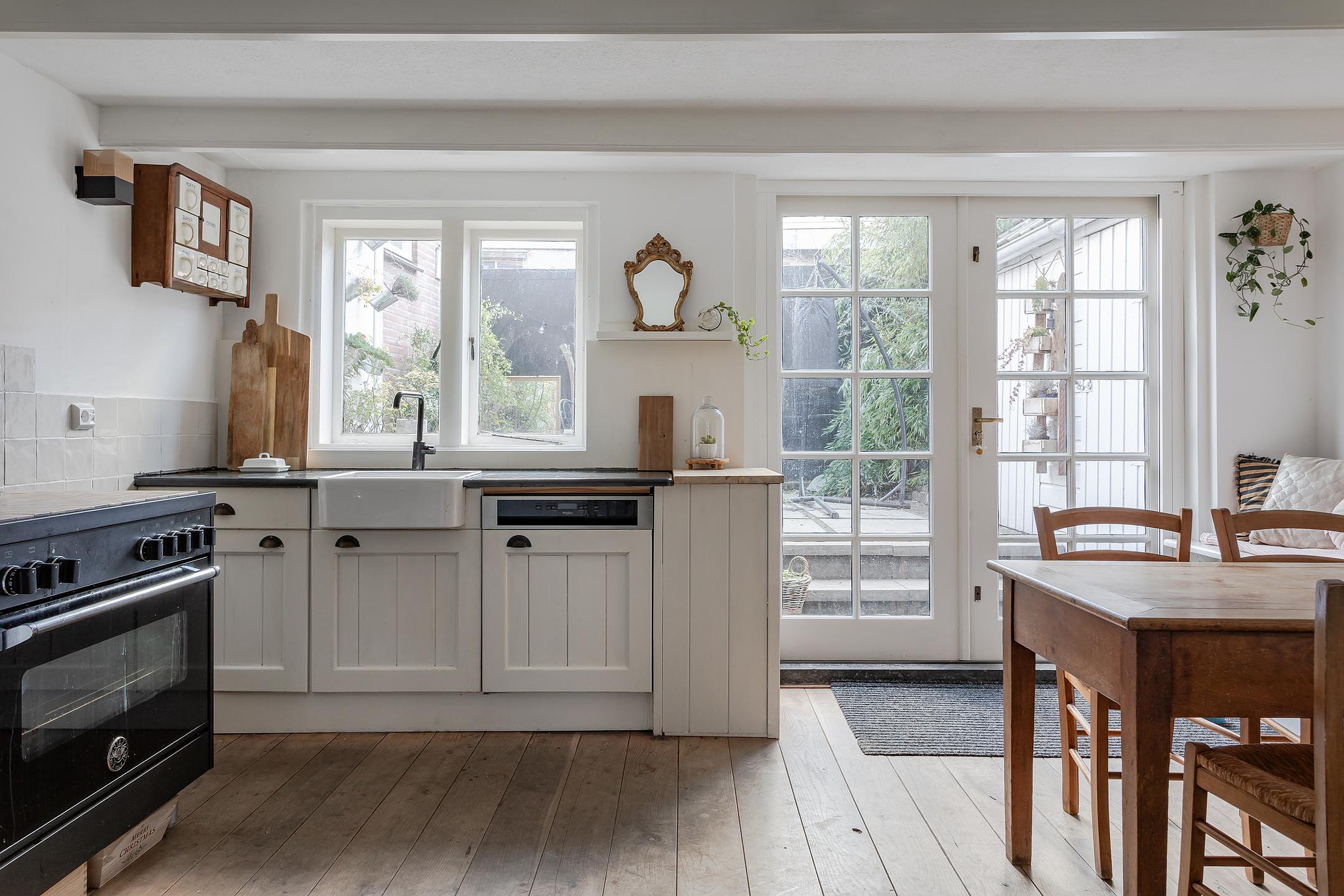 Juist de eenvoud siert deze gezellige woonkeuken waar je bijna verwacht dat Swiebertje en Saartje aan tafel zitten! De massief houten vloer is hier doorgelegd, er is een keukenblok met diep houten werkblad, porseleinen spoelbak, met witjes betegelde wand, de vaatwasser is 2½  jaar oud, de koelkast staat los in een hoek en koken kunt u op het Bertazzoni inductiefornuis met 5 zones en brede oven, ook 2½  jaar oud. Er is een vaste kast voor de wasmachine. Bij de eettafel is een zitplateau over de radiator geplaatst en openslaande deuren met roederamen geven toegang tot de sfeervolle tuin.