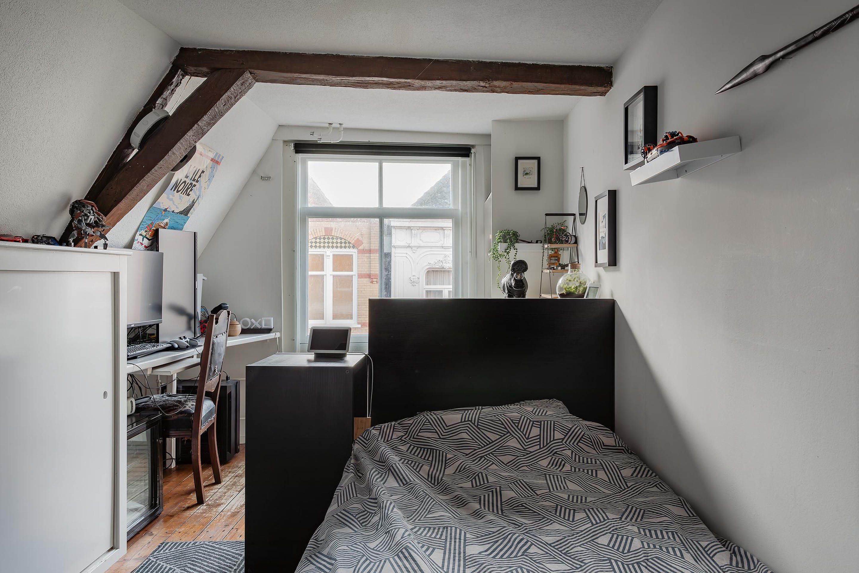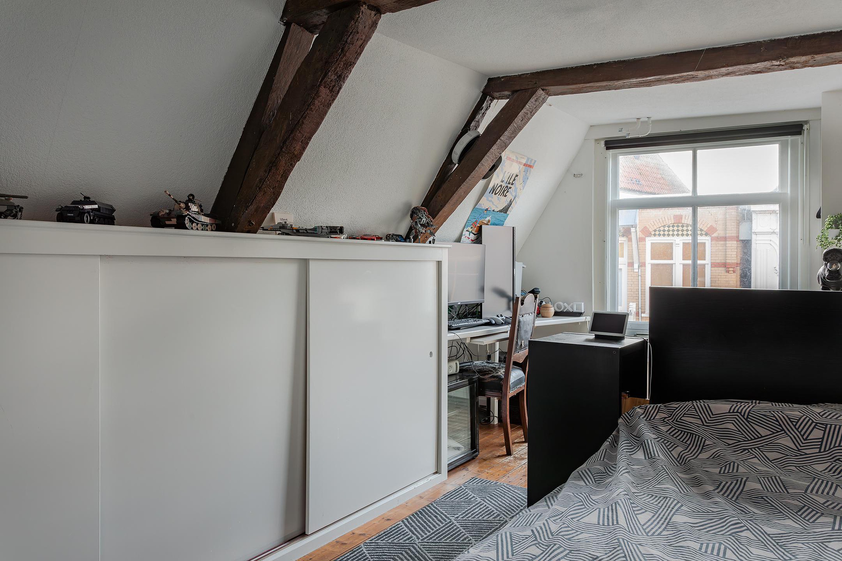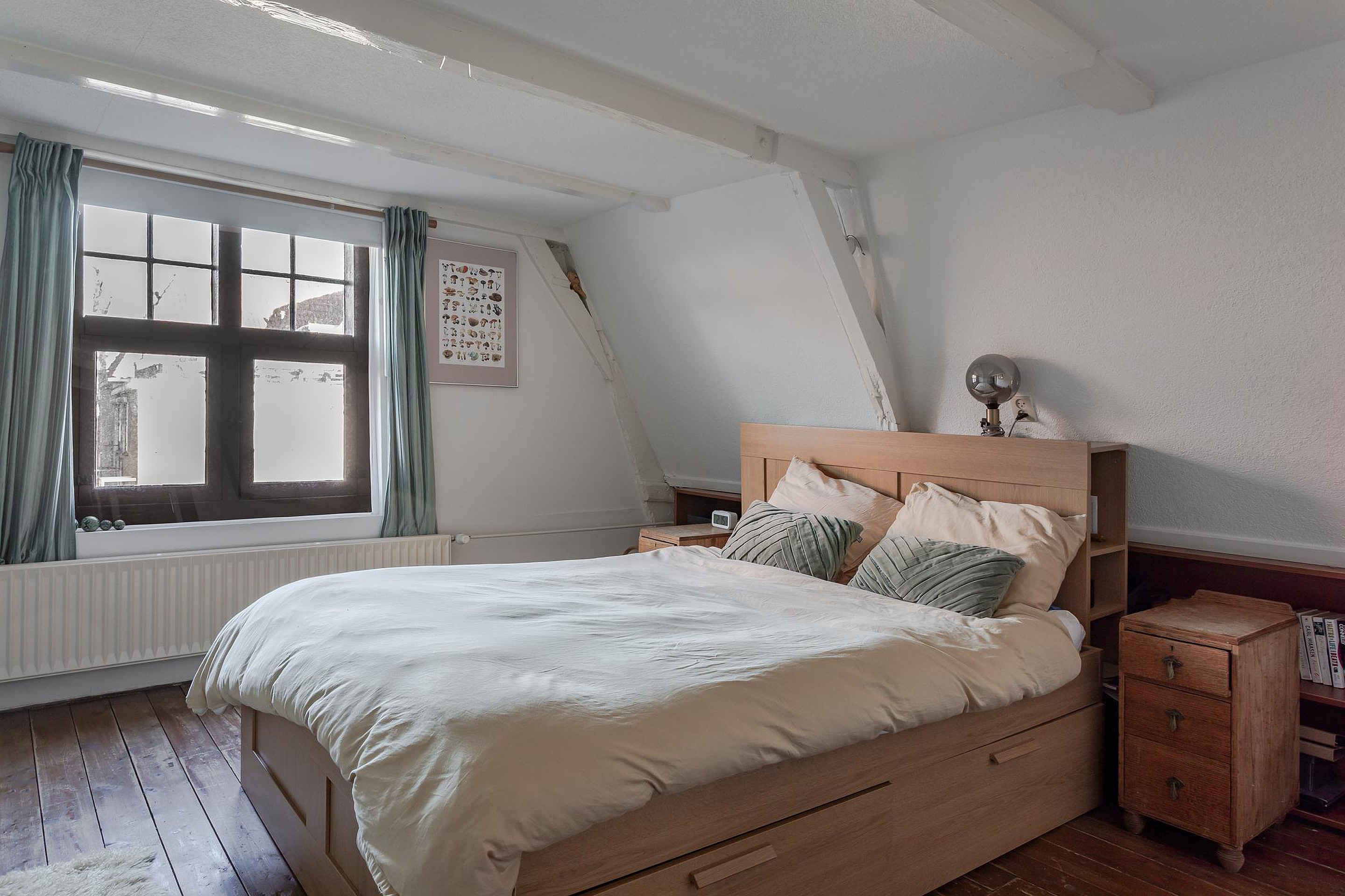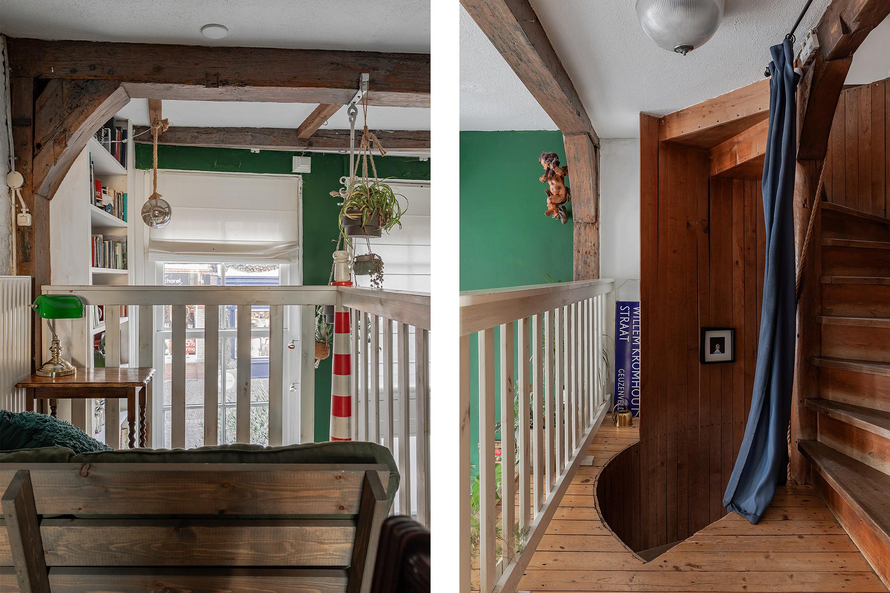 Vaste trap naar een hele leuke zolderverdieping die met gemak als 4e slaapkamer in gebruik kan worden genomen. De balken zijn in zicht gehouden wat een knusse sfeer geeft aan deze ruimte. De voorruimte is van binnenuit geïsoleerd, aan de straatzijde is een roederaam met enkel glas en voorzetraam, er is een groot Velux dakraam, houten vloerdelen op de houten verdiepingsvloer en veel bergruimte achter de hoge knieschotten met schuifdeuren.
