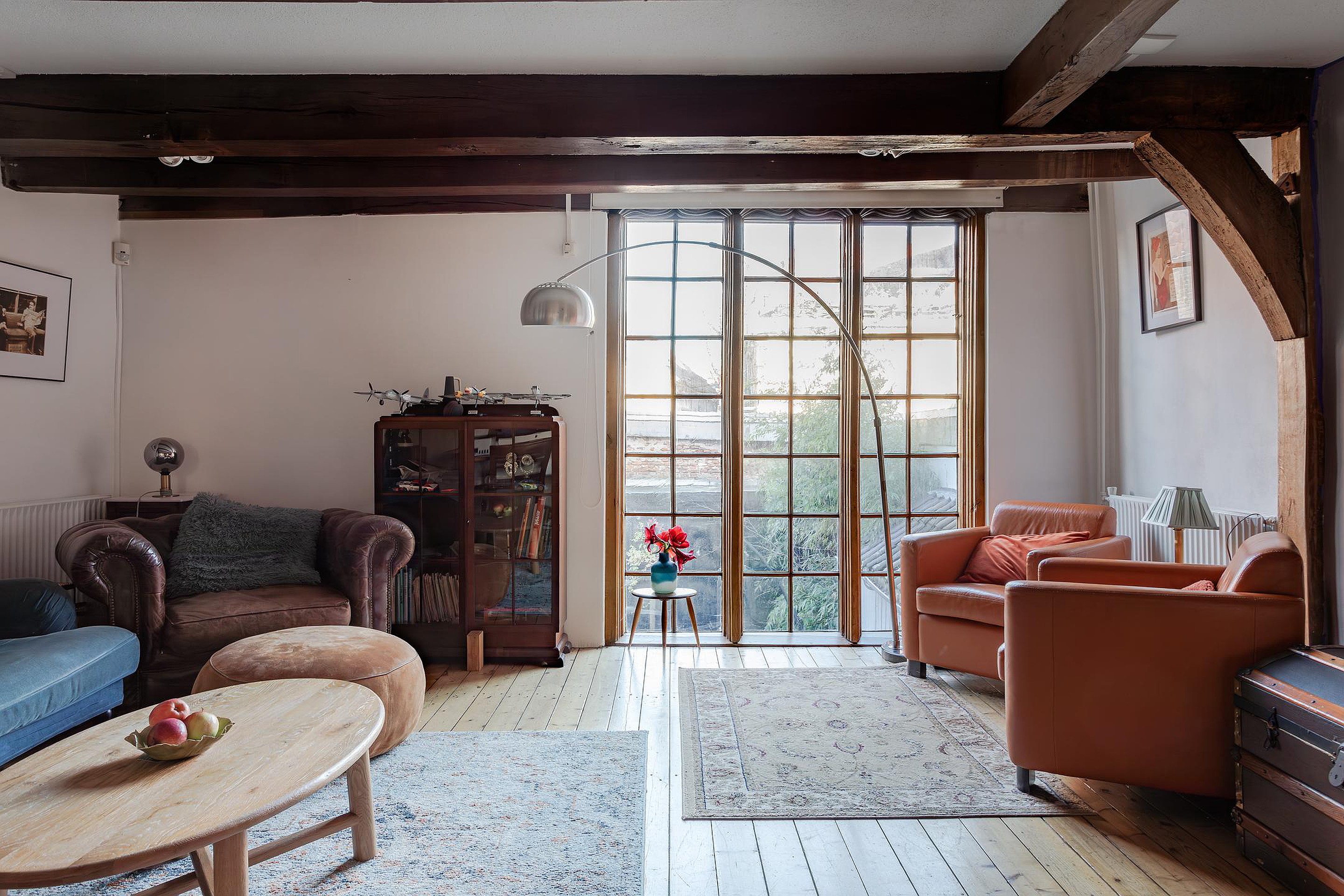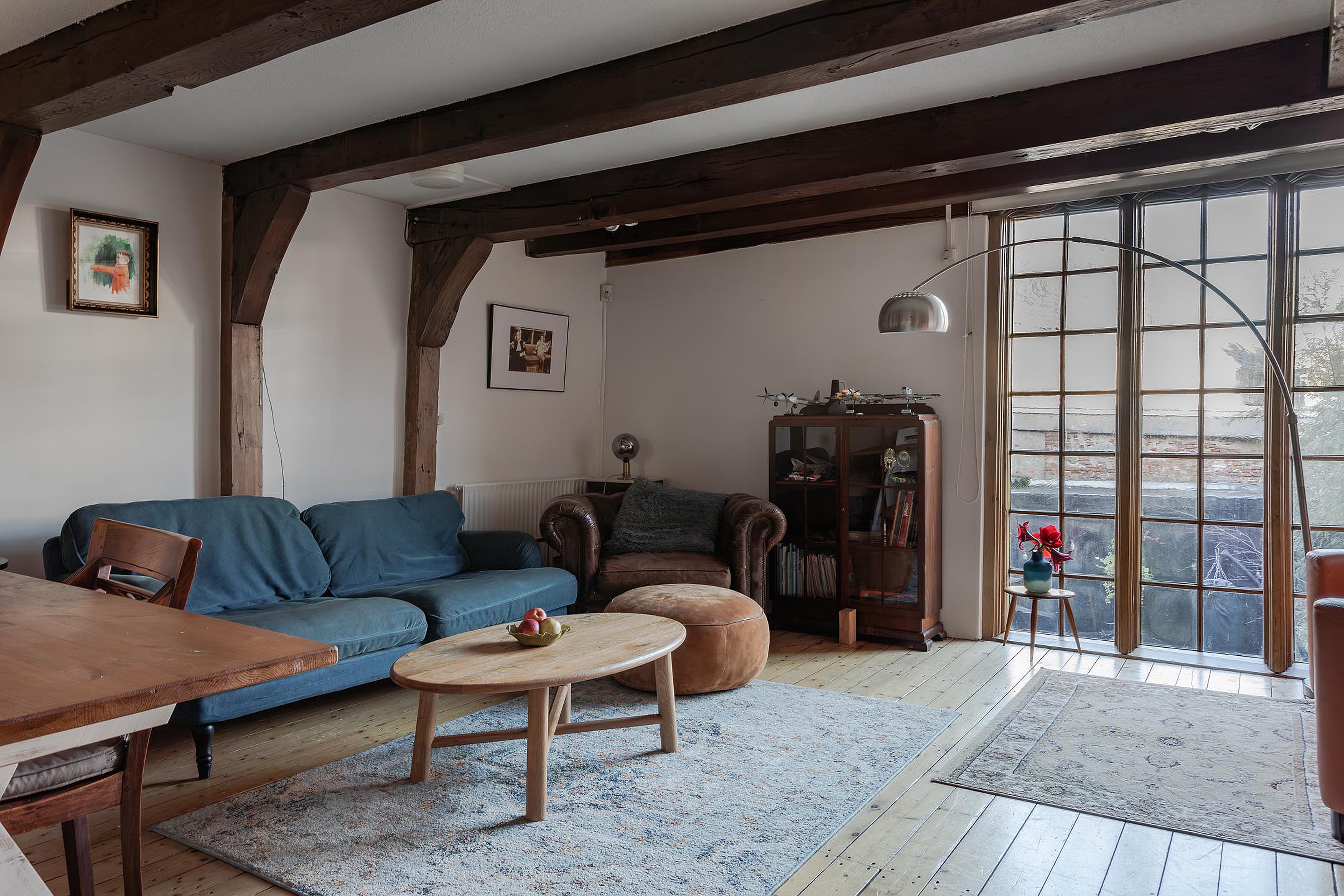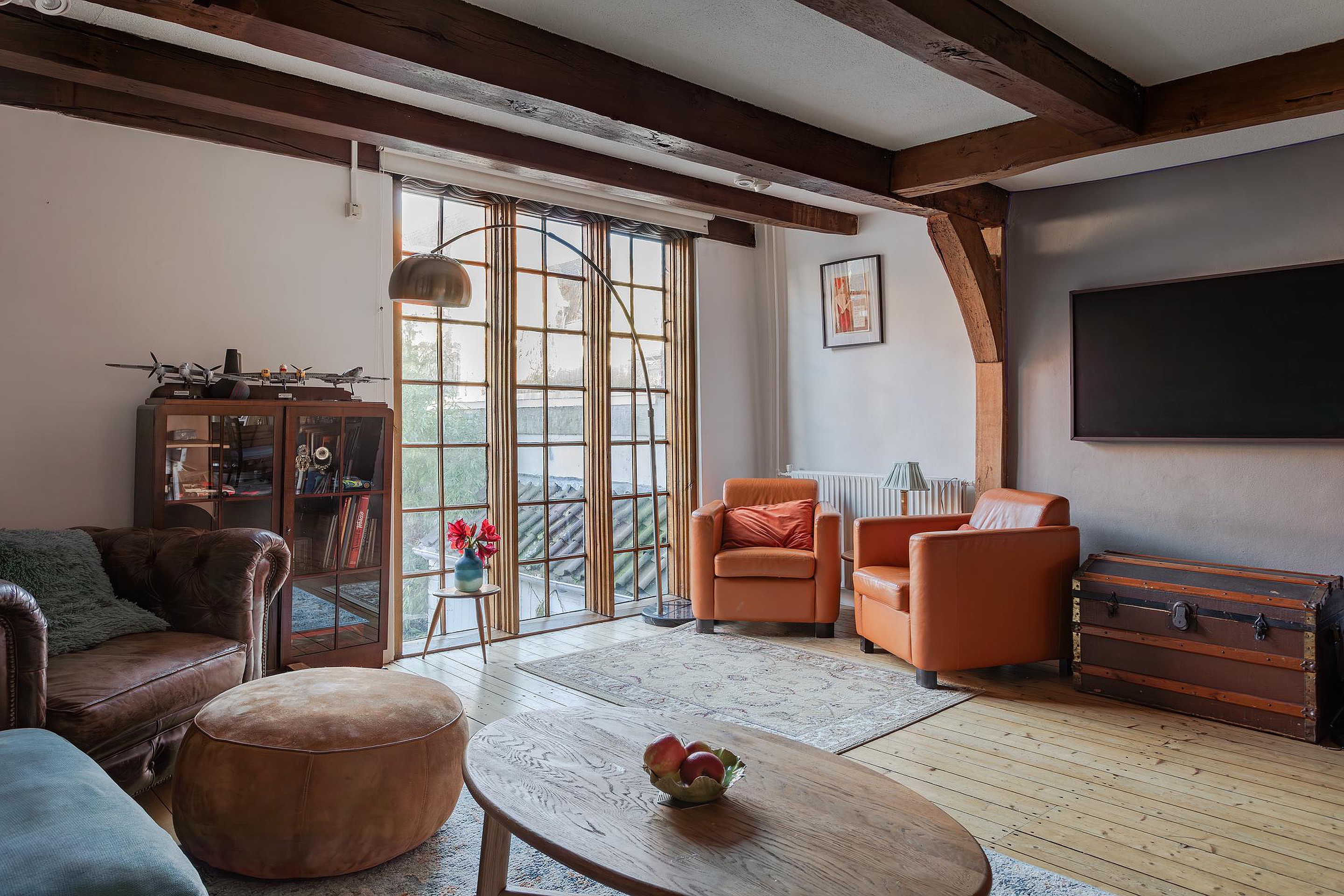 Als u de prachtige trap op bent gelopen is er eerst de vide met zicht op de benedenverdieping. Er ligt een massief houten vloer, de wanden zijn afwisselend gestuukt en schoon metselwerk, de robuuste wand- en plafondbalken geven een warme uitstraling aan de ruime living. Aan de tuinzijde geeft een grote raampartij van plafond tot de vloer met roederamen in een hardhouten kozijn veel lichtinval.