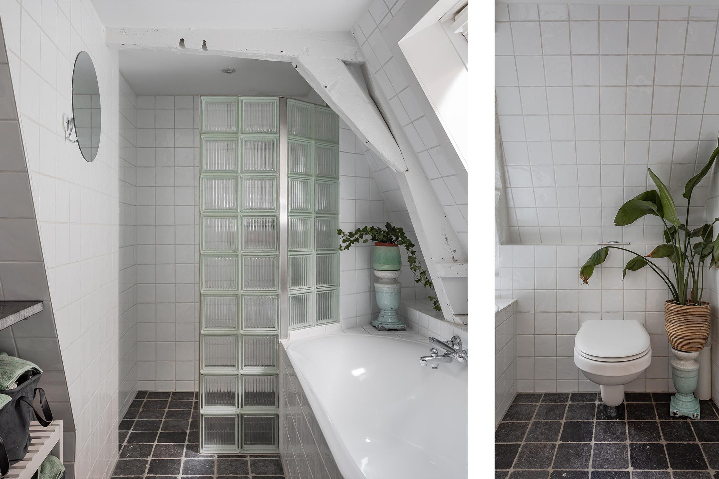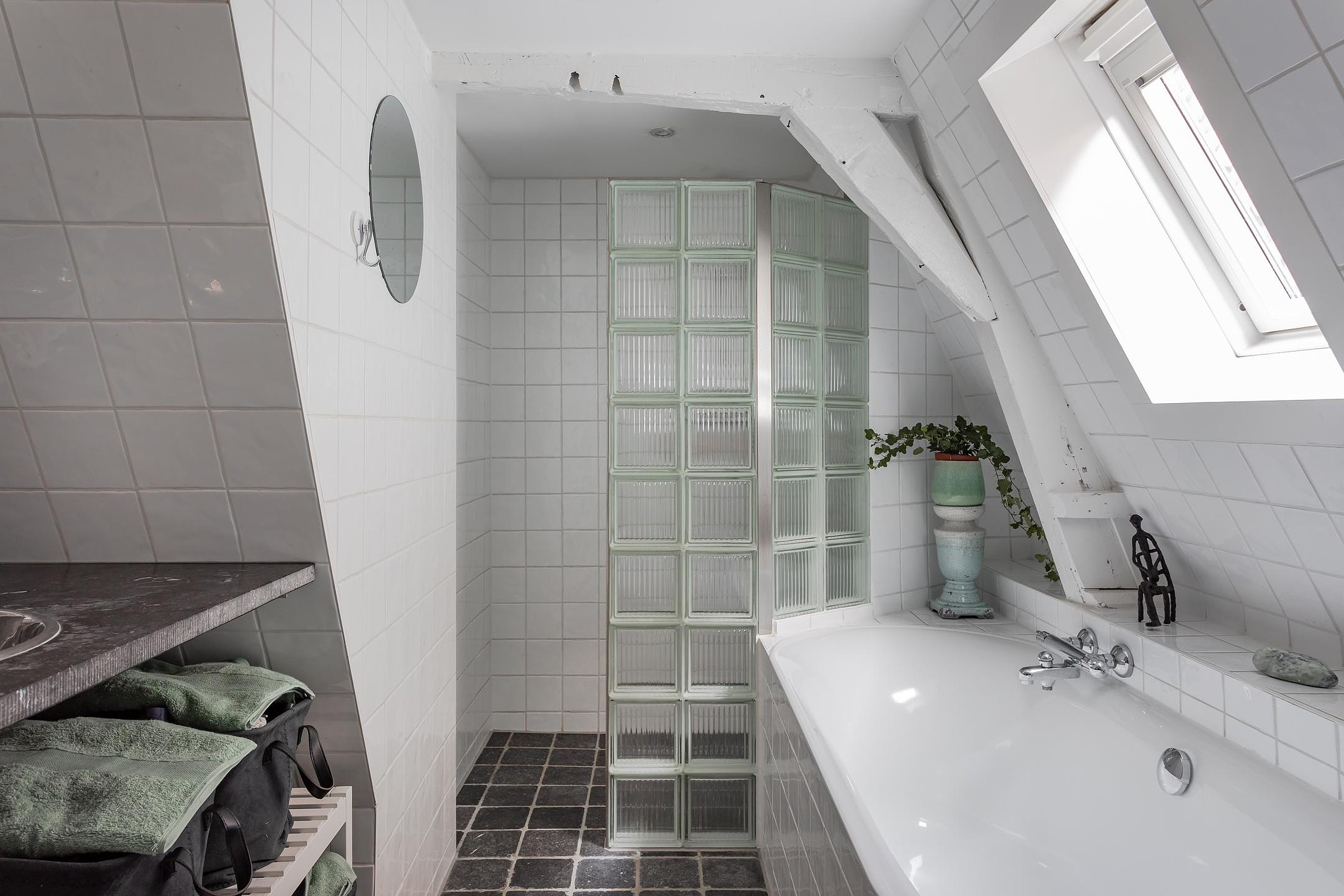 In de badkamer zijn de wanden met “witjes” betegeld, er liggen Belgisch hardstenen vloertegels en de wastafel is eveneens uitgevoerd in Belgisch hardsteen met een spiegelkastje en stopcontact. Verder treft u hier een duo ligbad met thermostaatkraan, 2e wandcloset, een designradiator en een achter de glasblokken wand een inloopdouche met thermostaatkraan. Er is een kunststof Velux raam voor het directe lichtinval en de natuurlijke ventilatie.