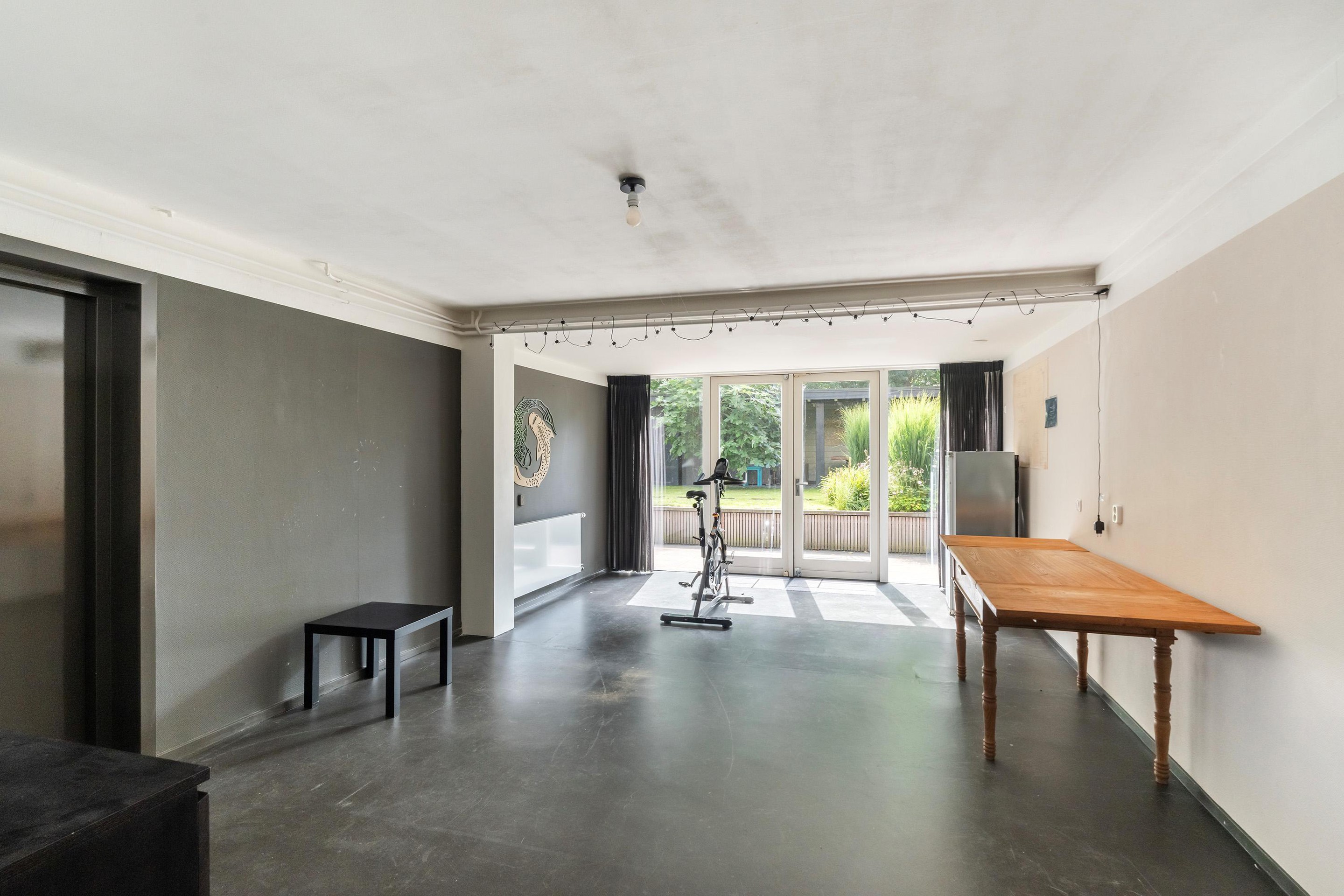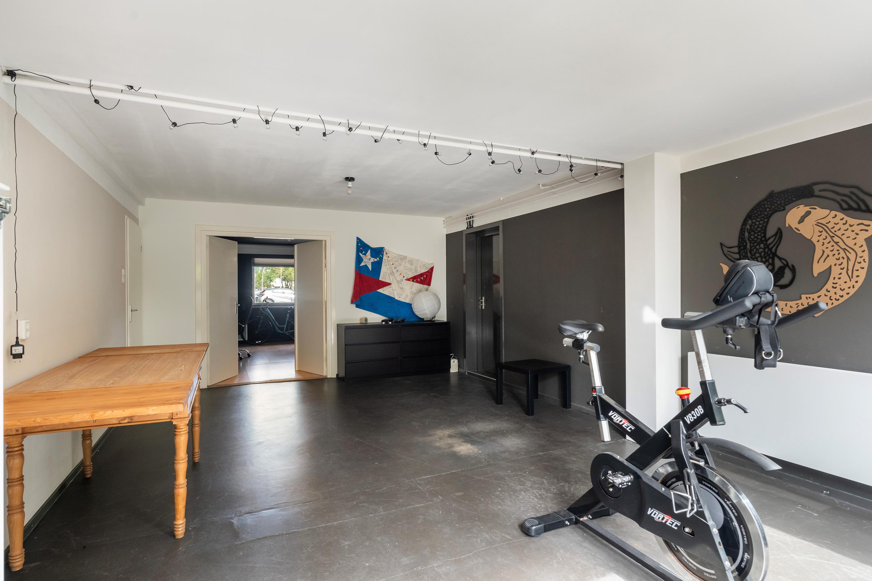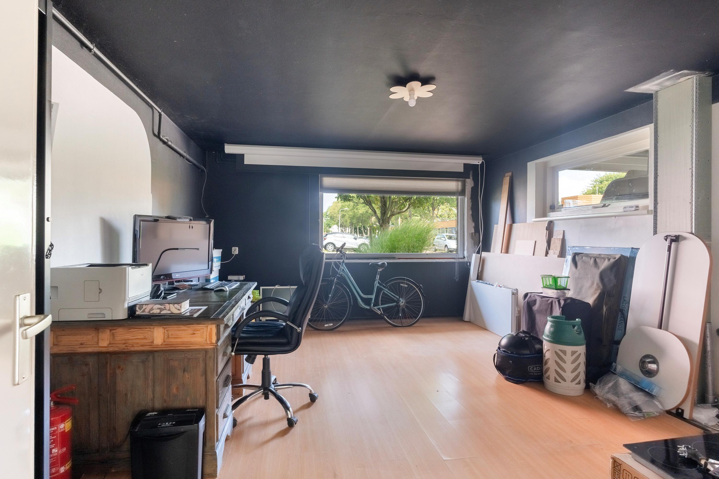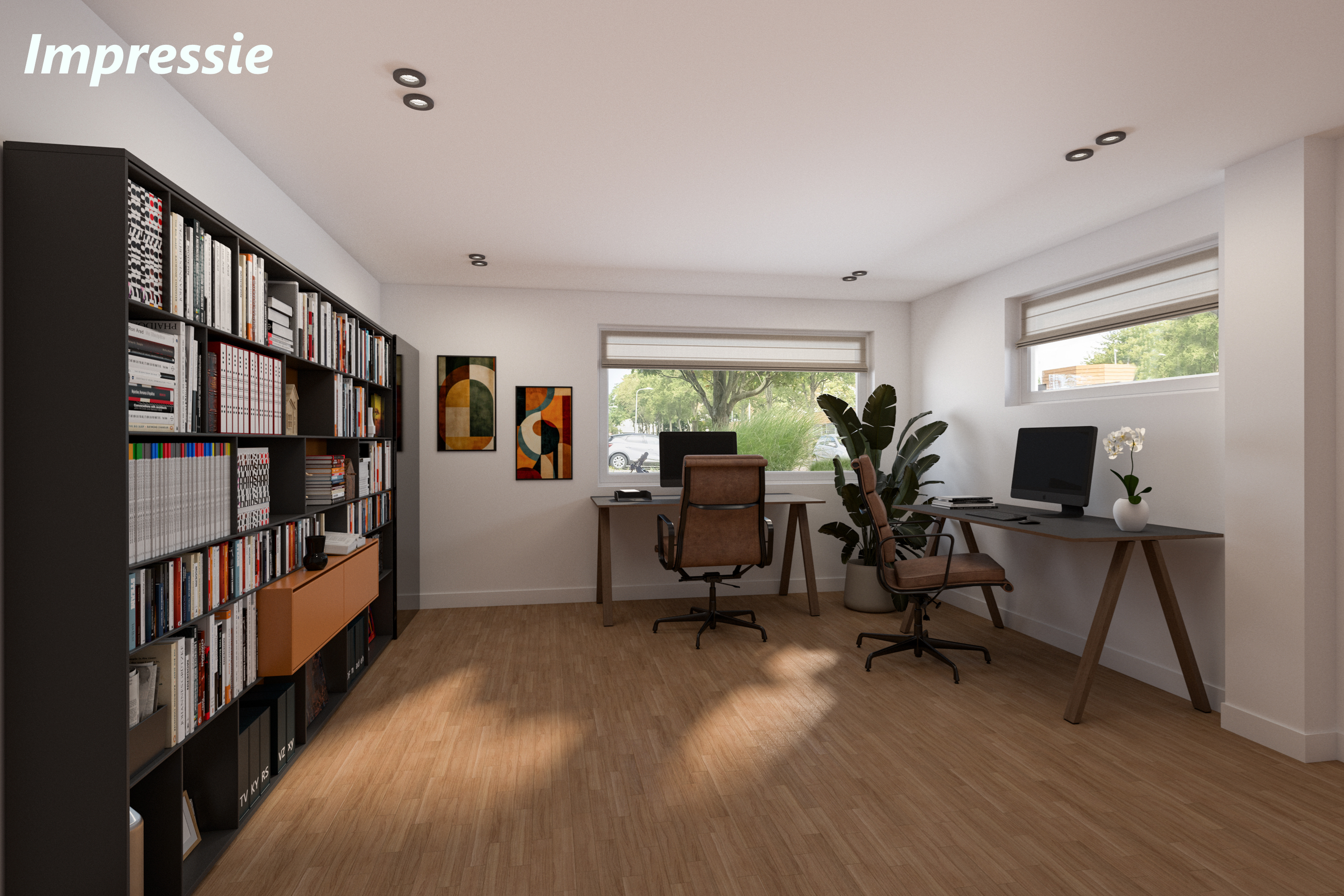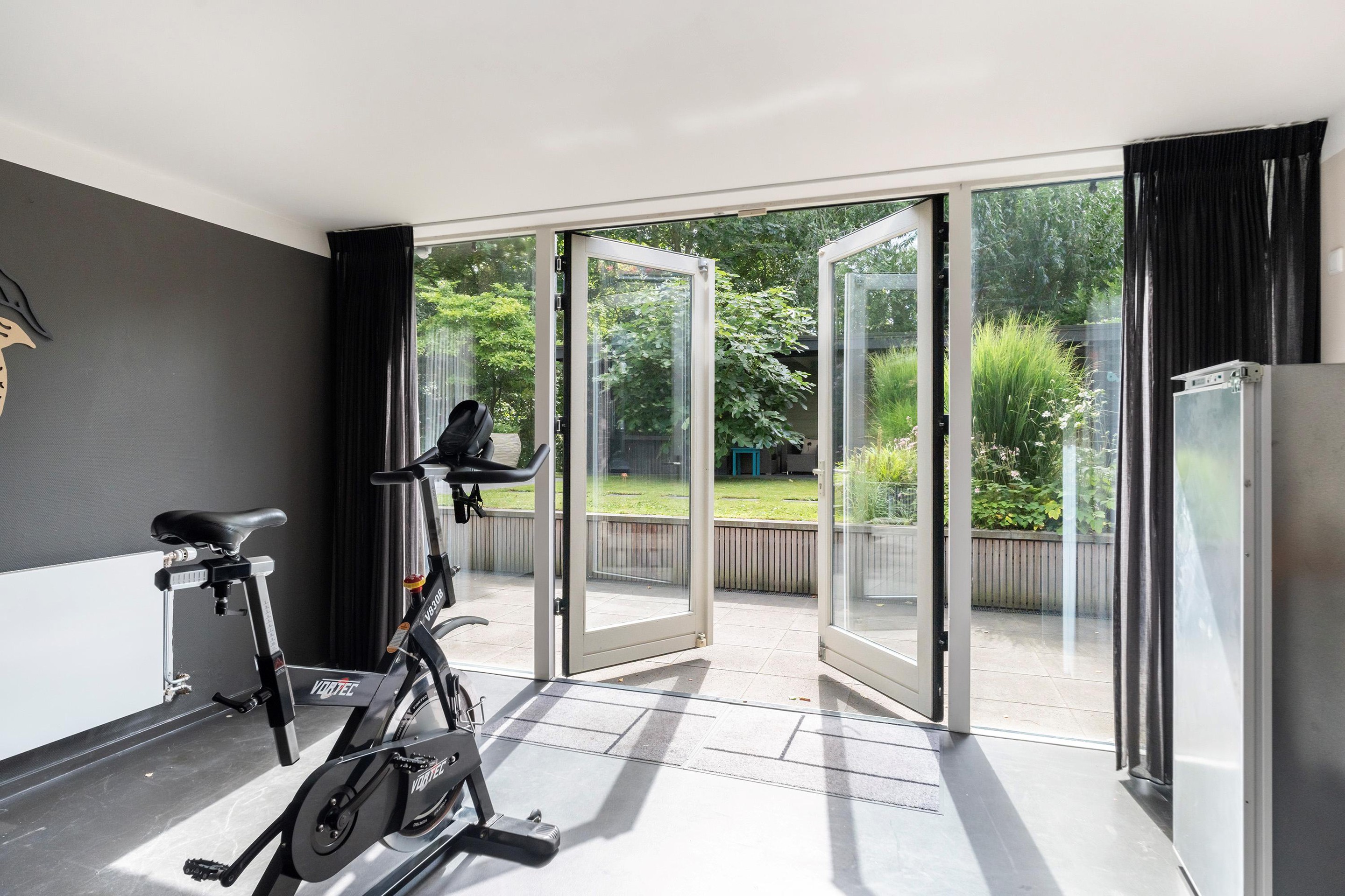 - Een multifunctionele ruimte, nu (impressie) ingericht als inspirerende kantoorruimte en gym (zie animatie foto's) met openslaande deuren naar tuin