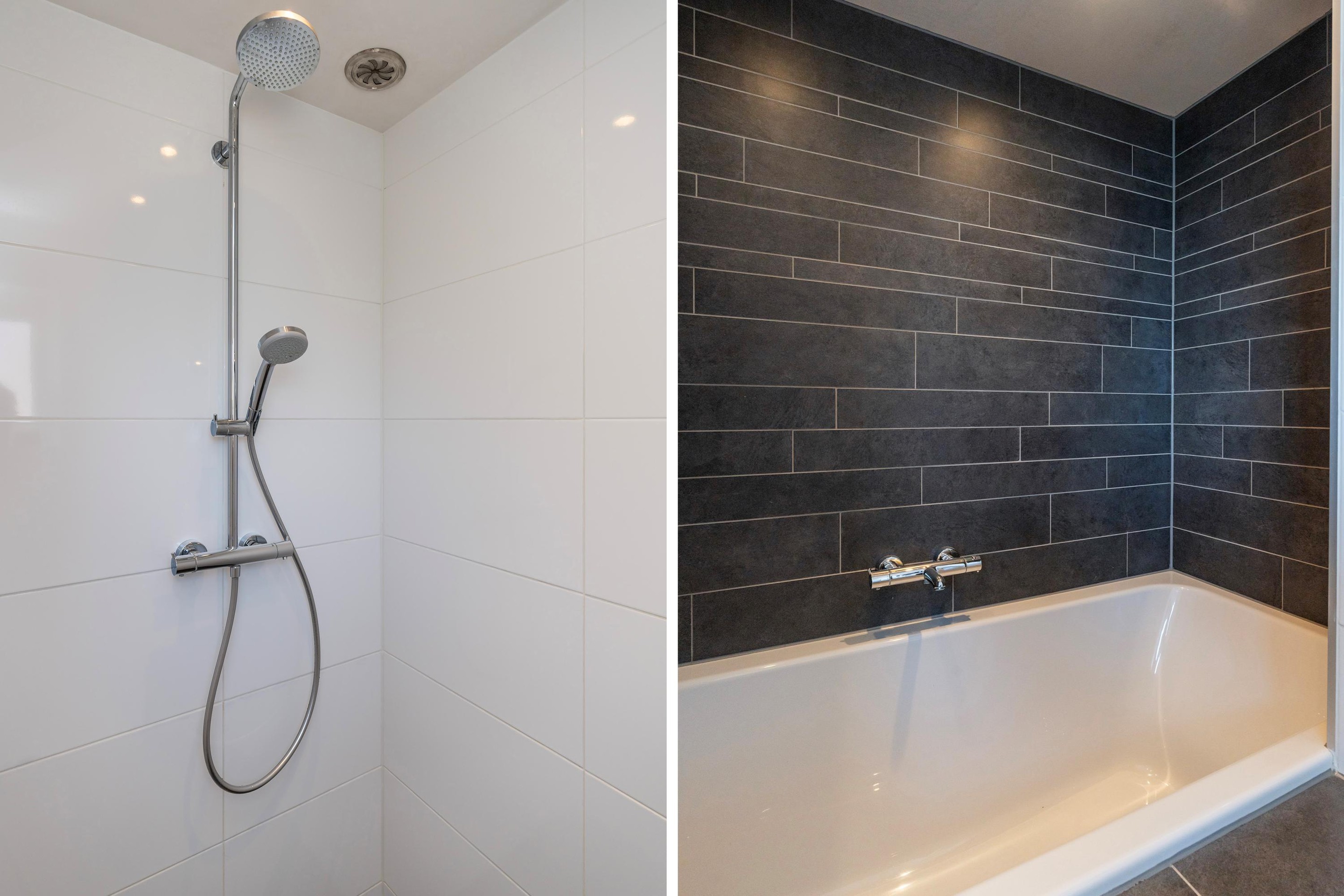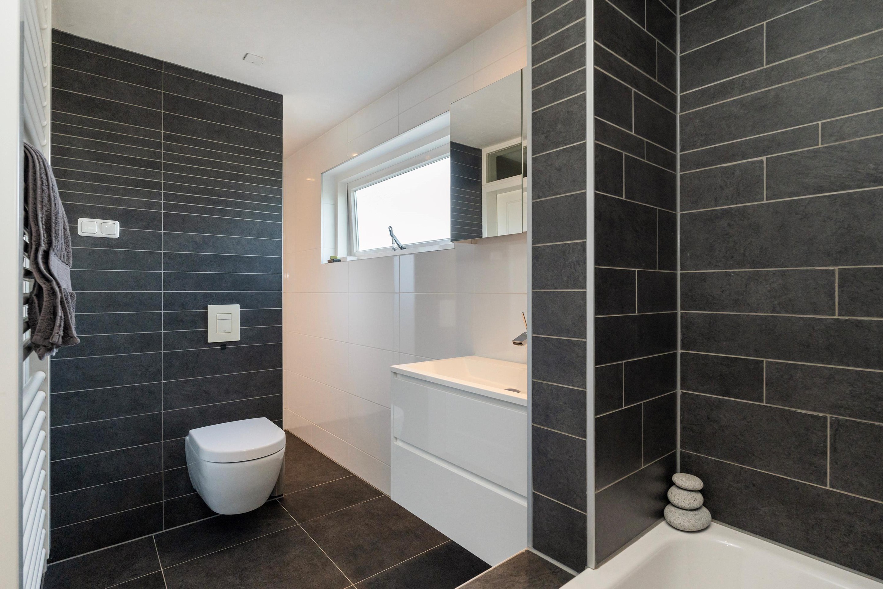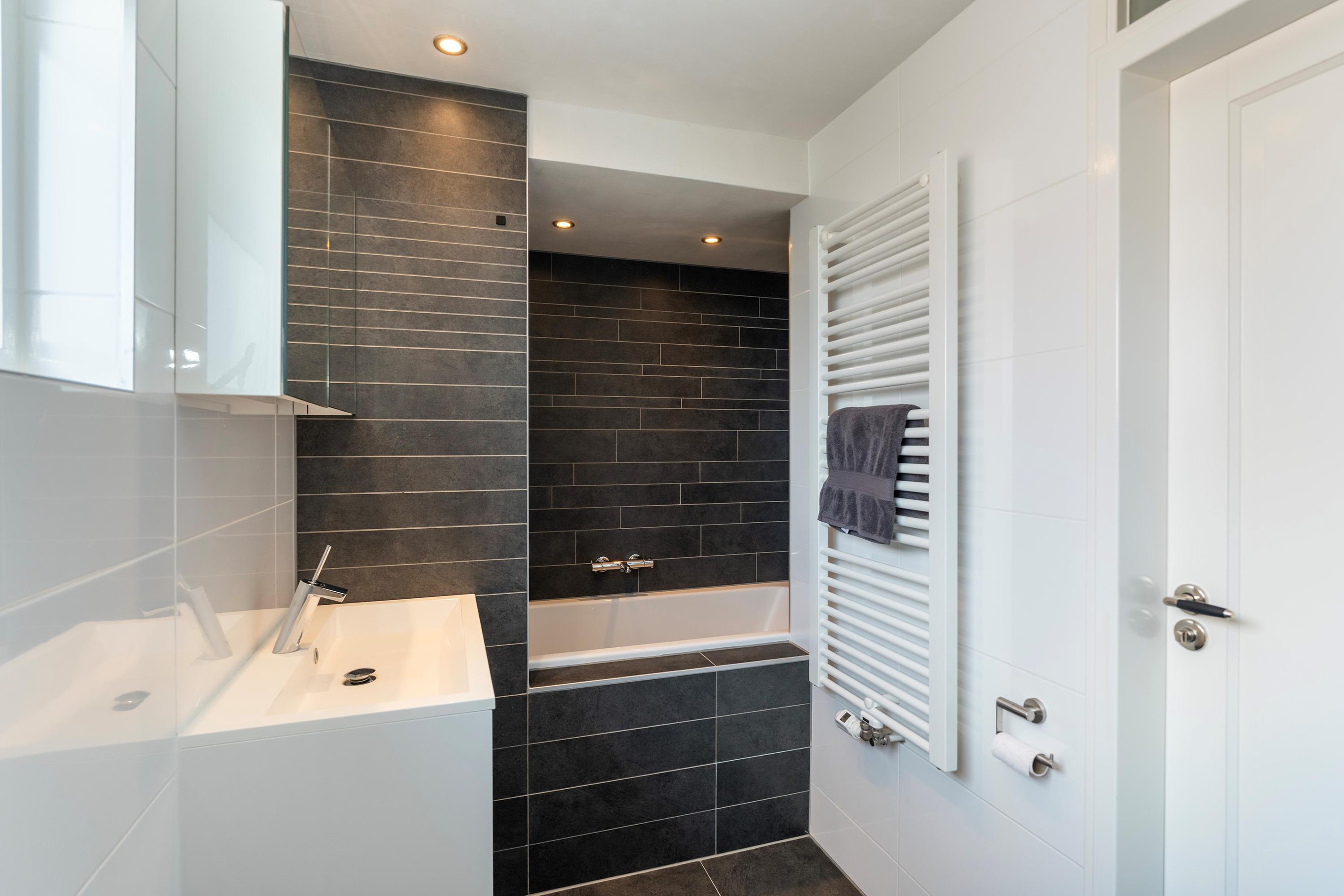 - Een tussenhal met toegang tot een moderne badkamer (inloopdouche, toilet, wastafelmeubel, handdoekradiator)