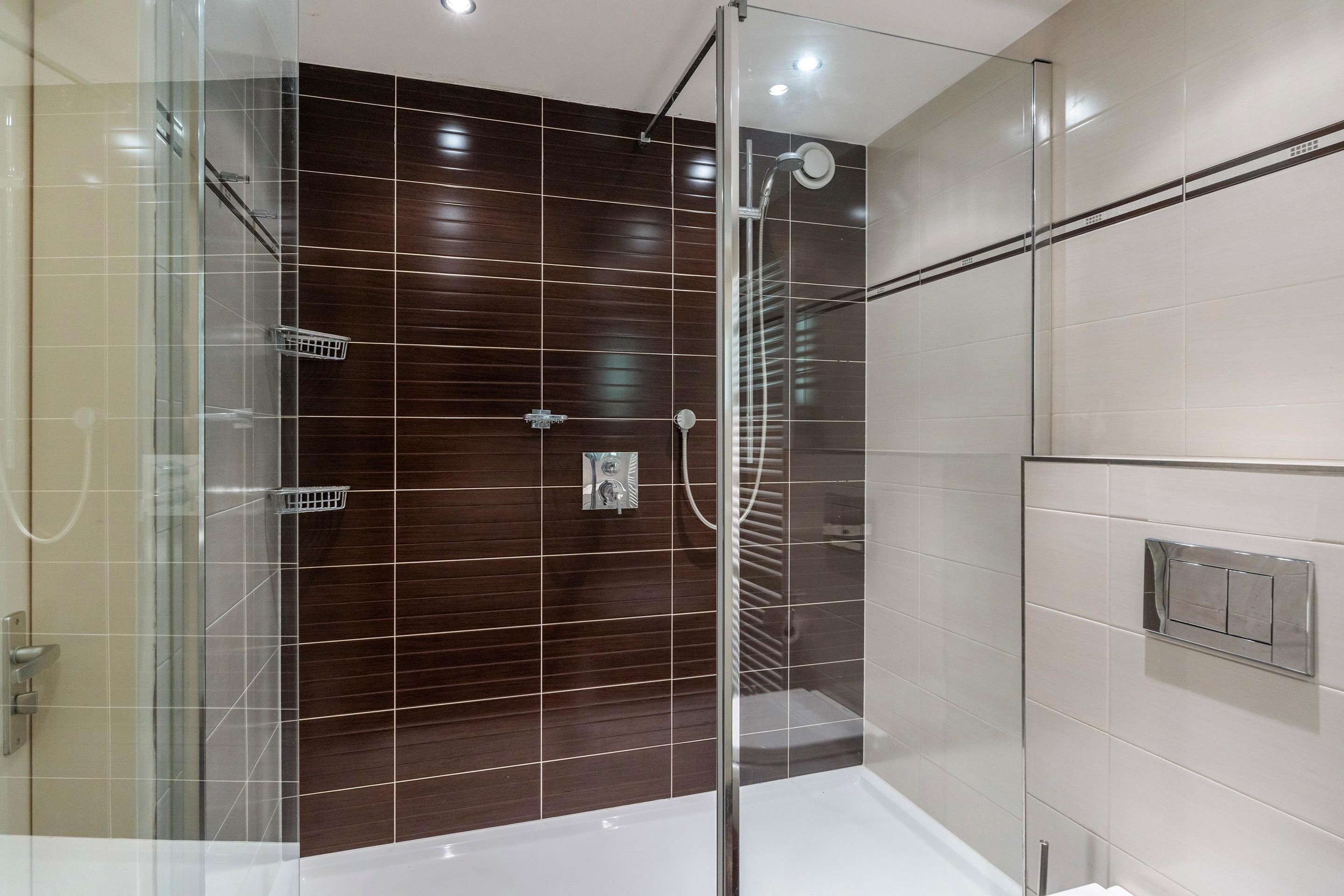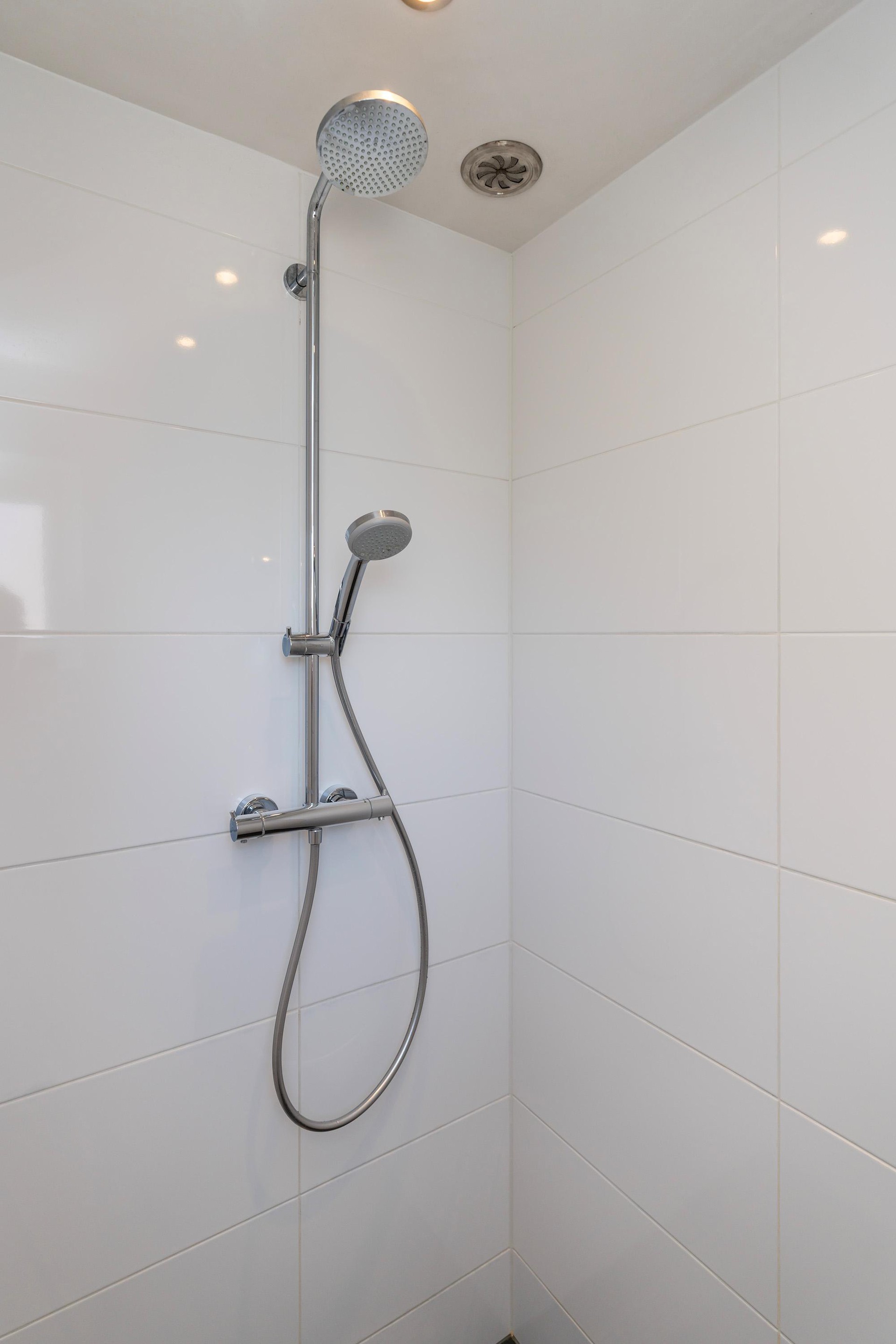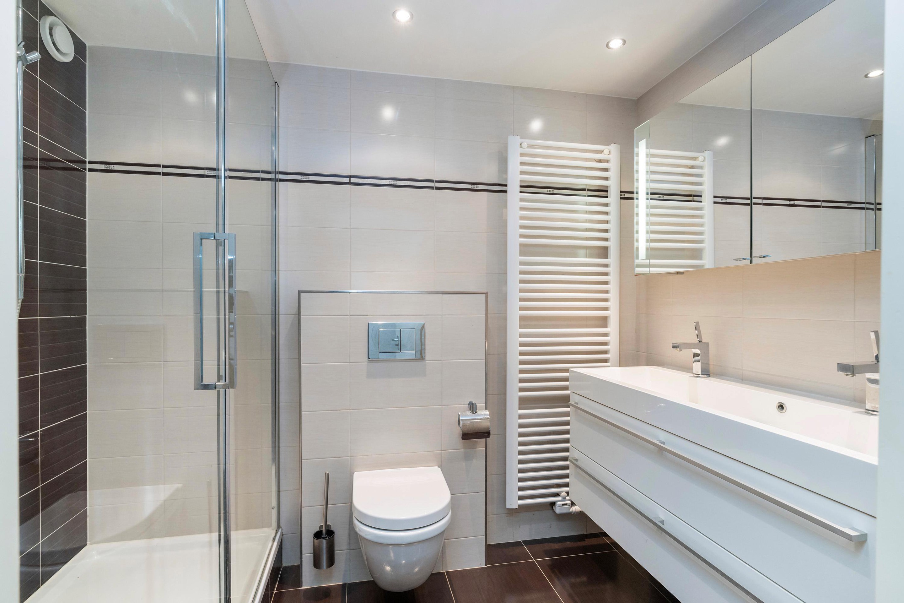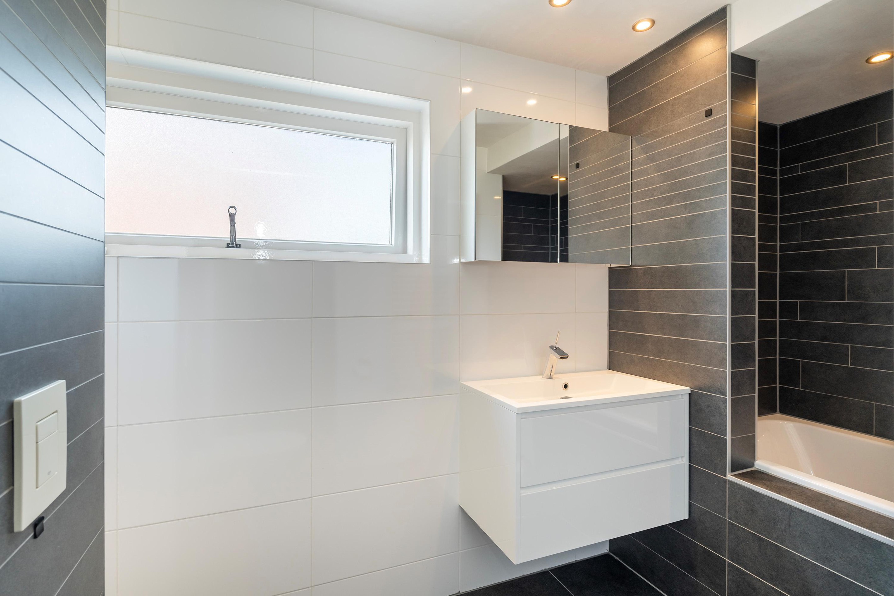 - Een tussenhal met toegang tot een moderne badkamer (inloopdouche, toilet, wastafelmeubel, handdoekradiator)