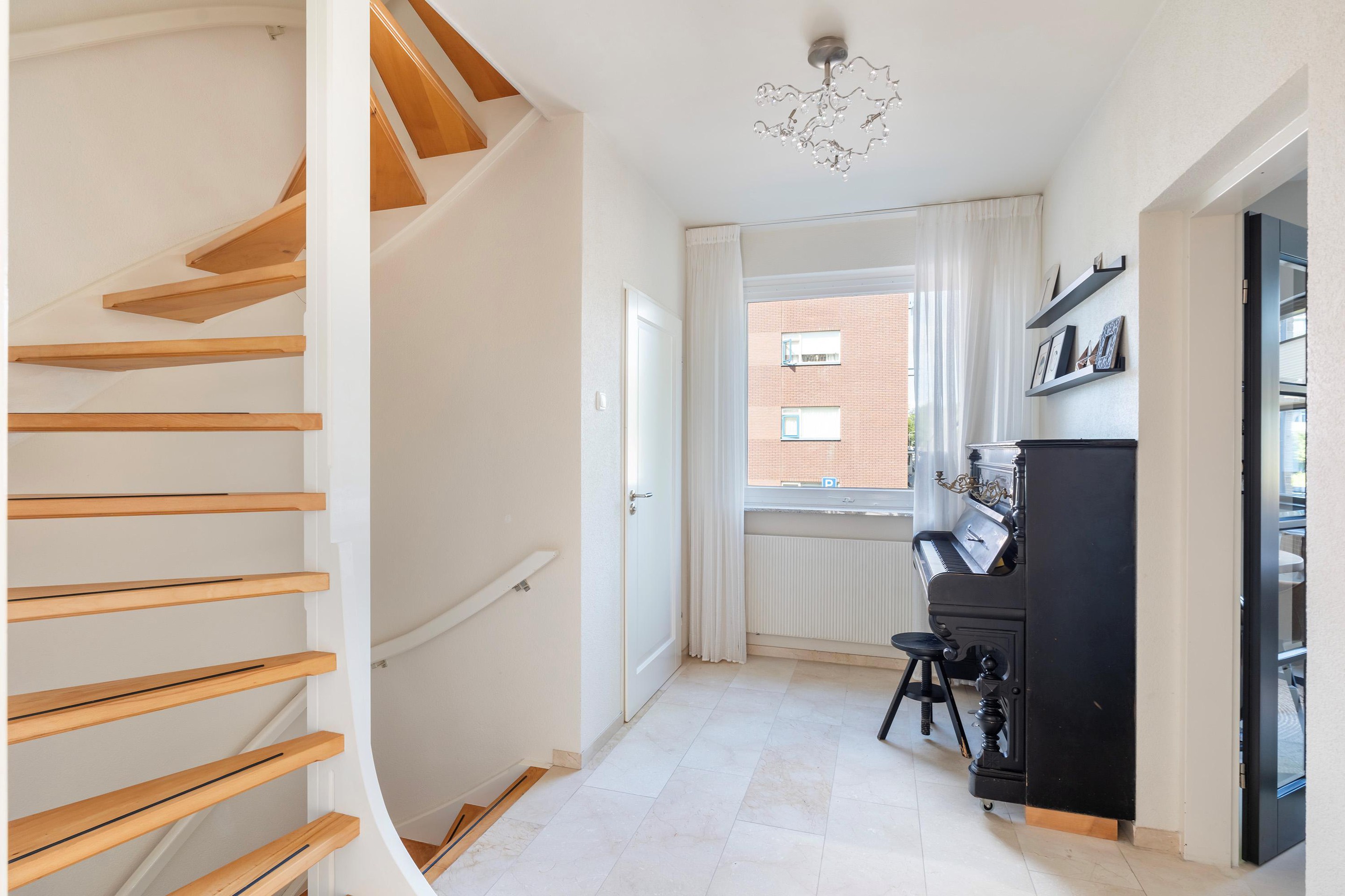 De hoofdentree van de woning op de begane grond straalt direct kwaliteit uit met een marmeren vloer en fraaie afwerking van de garderoberuimte, uitgebreide meterkast en een afsluitbare deur richting de multifunctionele ruimte erachter. Vanuit de centrale hal is er via een fraaie trapopgang toegang tot de 1e woonlaag.