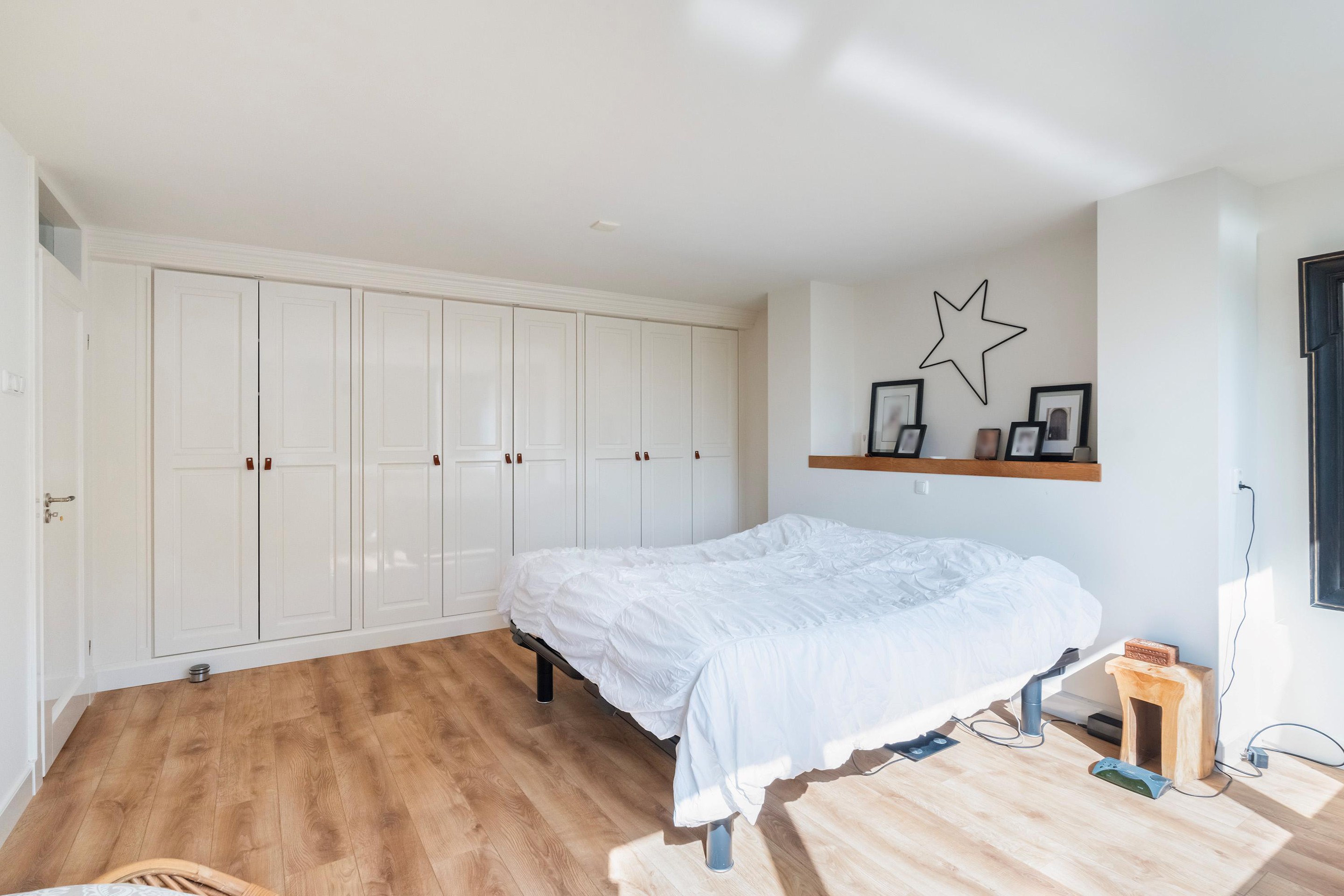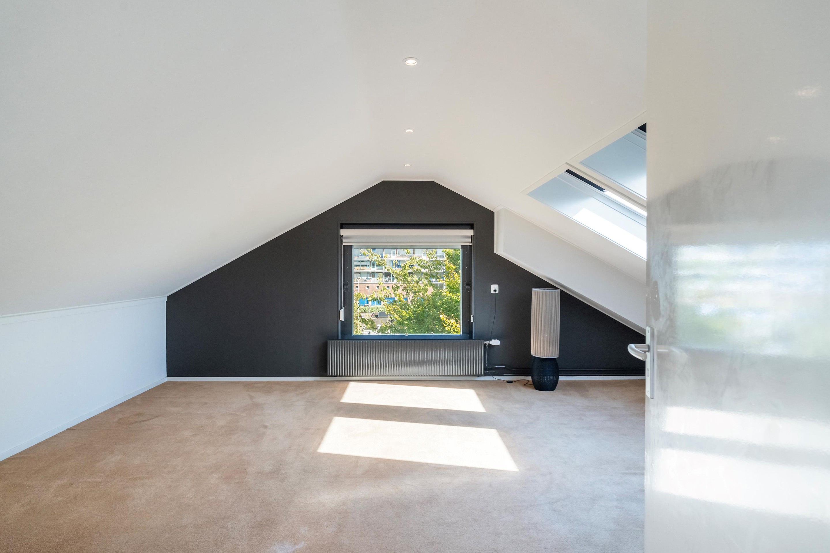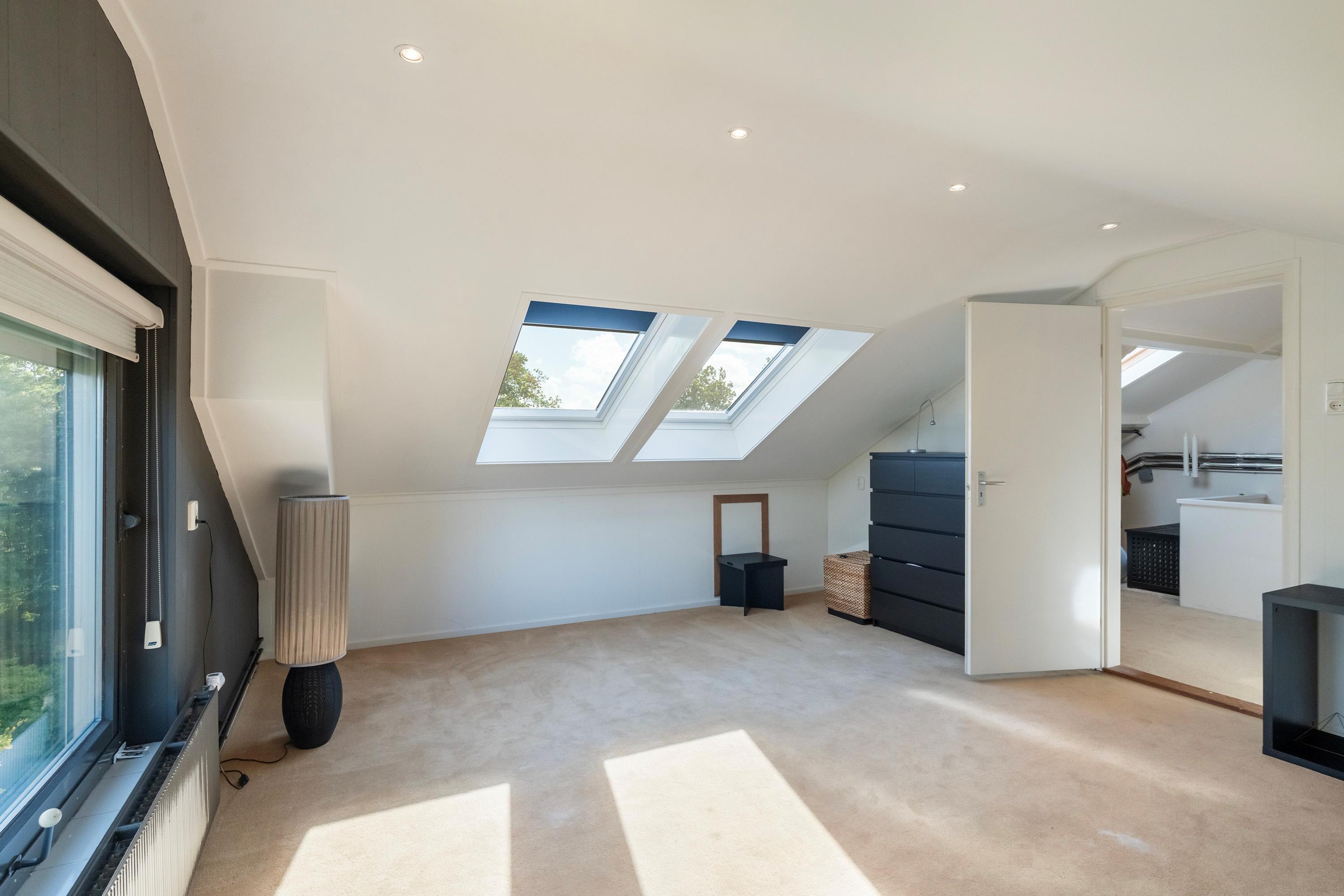 2e verdieping: Overloop met vaste kast en trap naar zolder. Drie goed formaat slaapkamers, waaronder een zeer ruime hoofdslaapkamer van ca. 24 m2 met maatwerk kastenwand. Luxe badkamer met inloopdouche, heerlijk ligbad, fraai wastafelmeubel, handdoekradiator en 3e toilet.