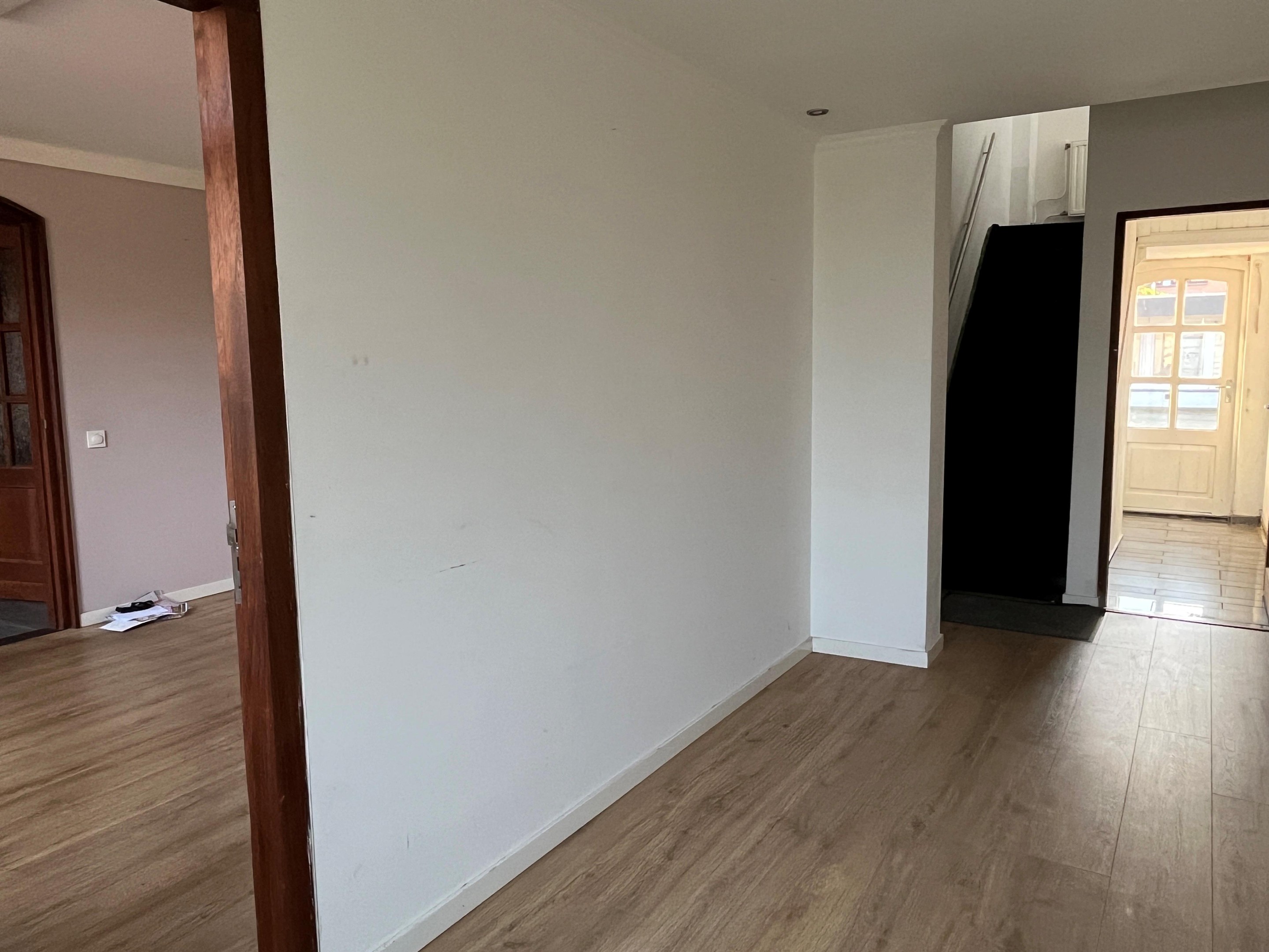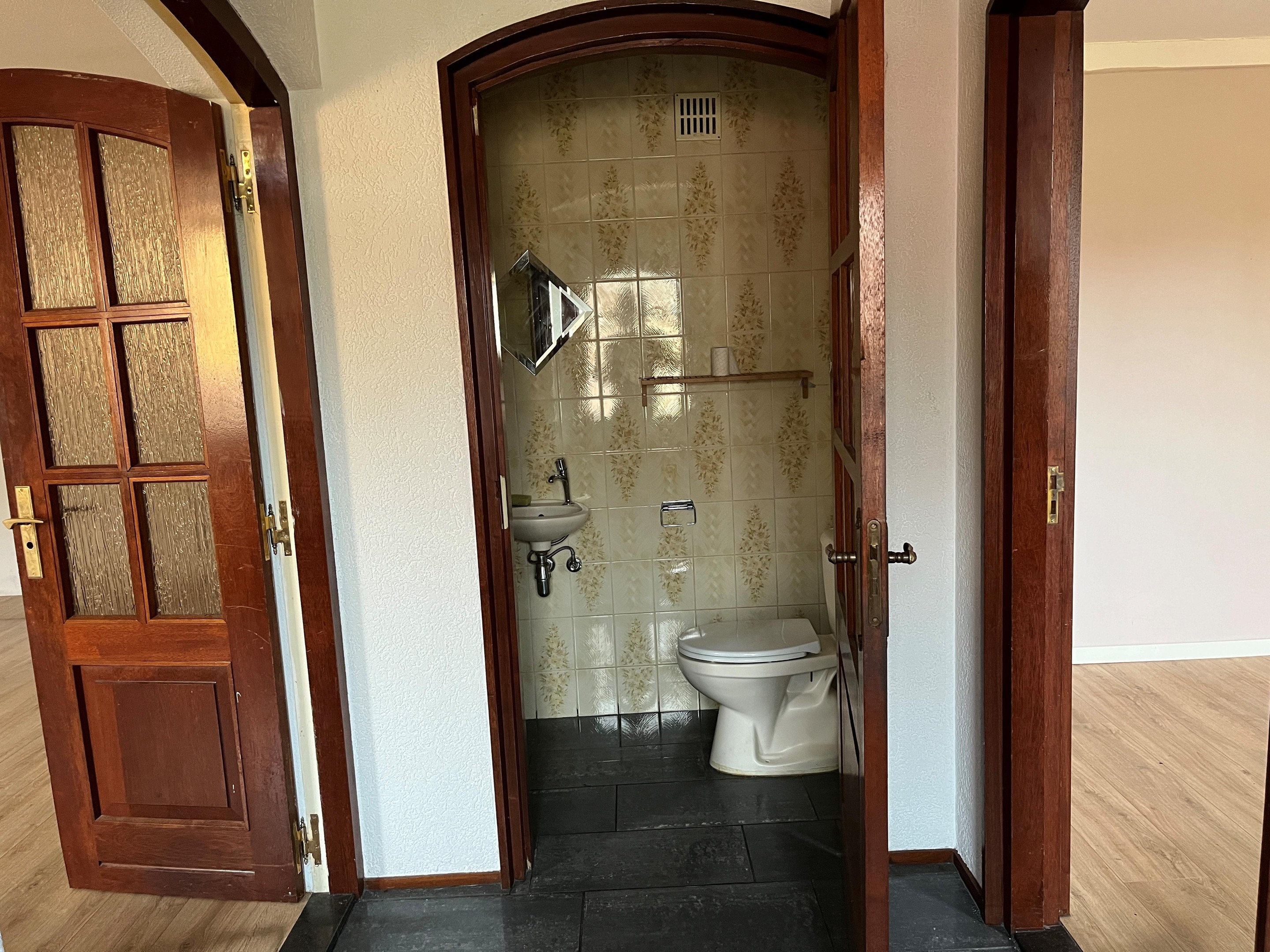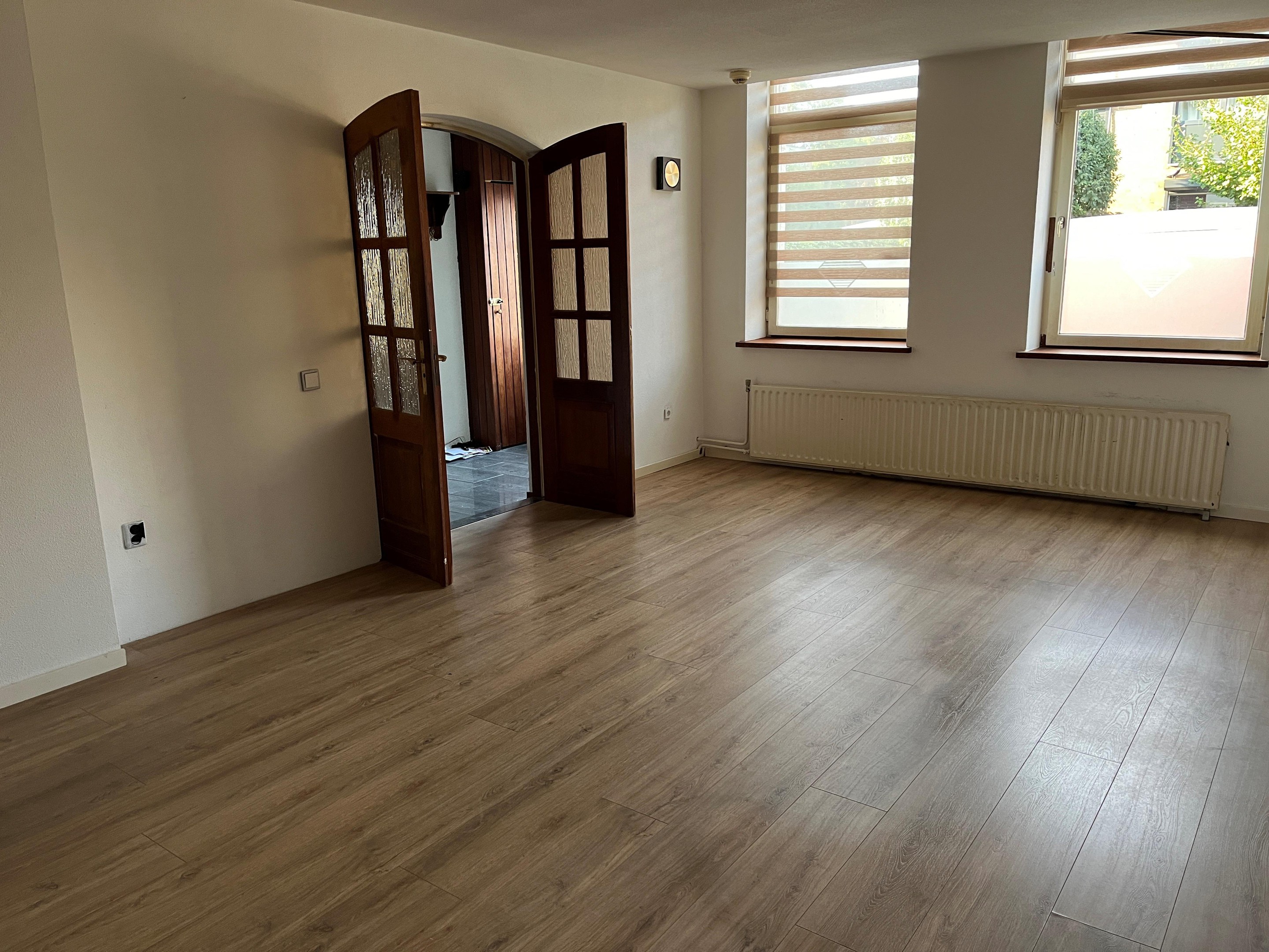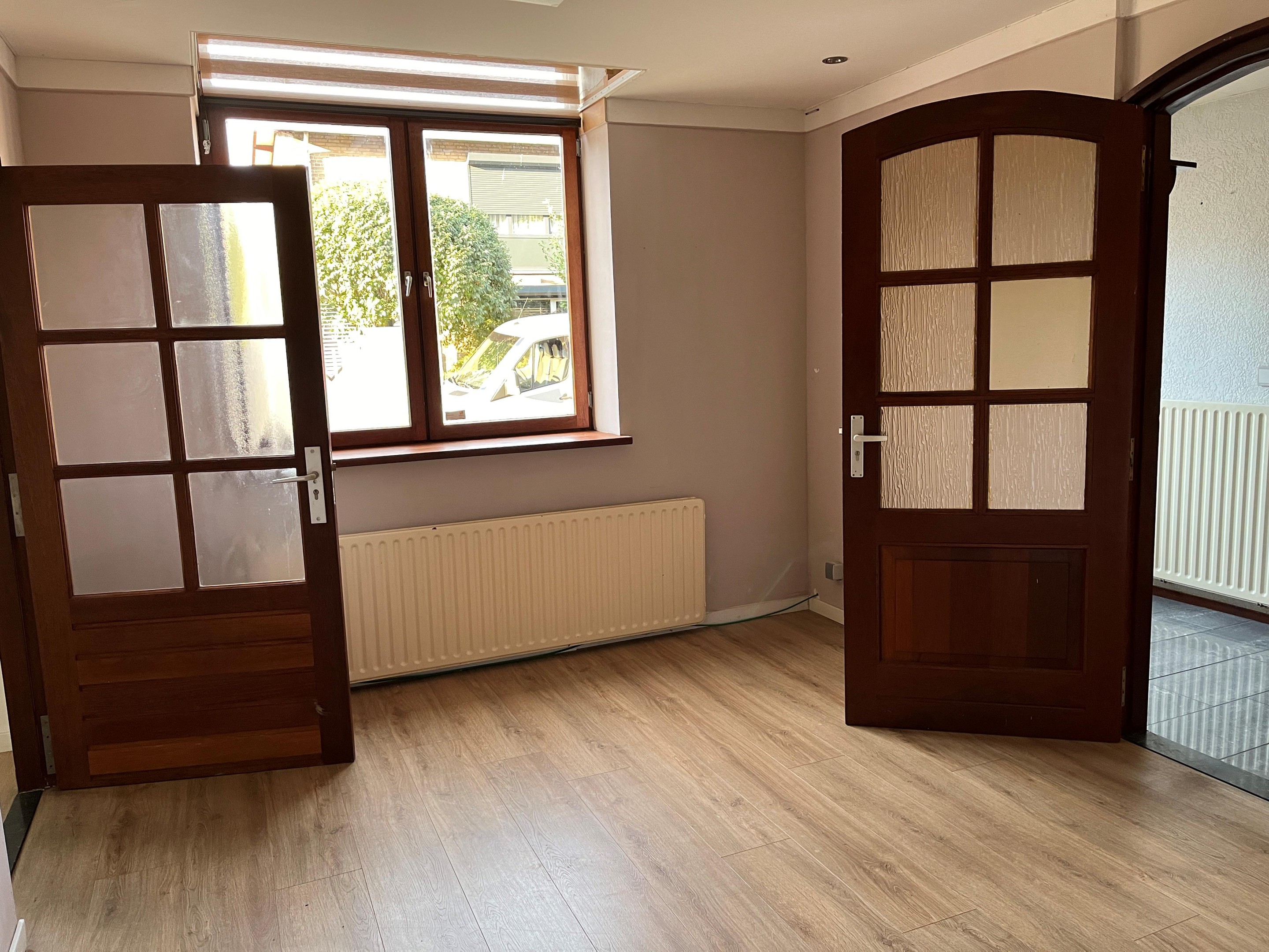De woonkamer in is voorzien van een laminaat vloer. Vanuit de woonkamer bereikt u de, hal met toilet en meterkast. Doorgang naar de zitkamer/kantoor.