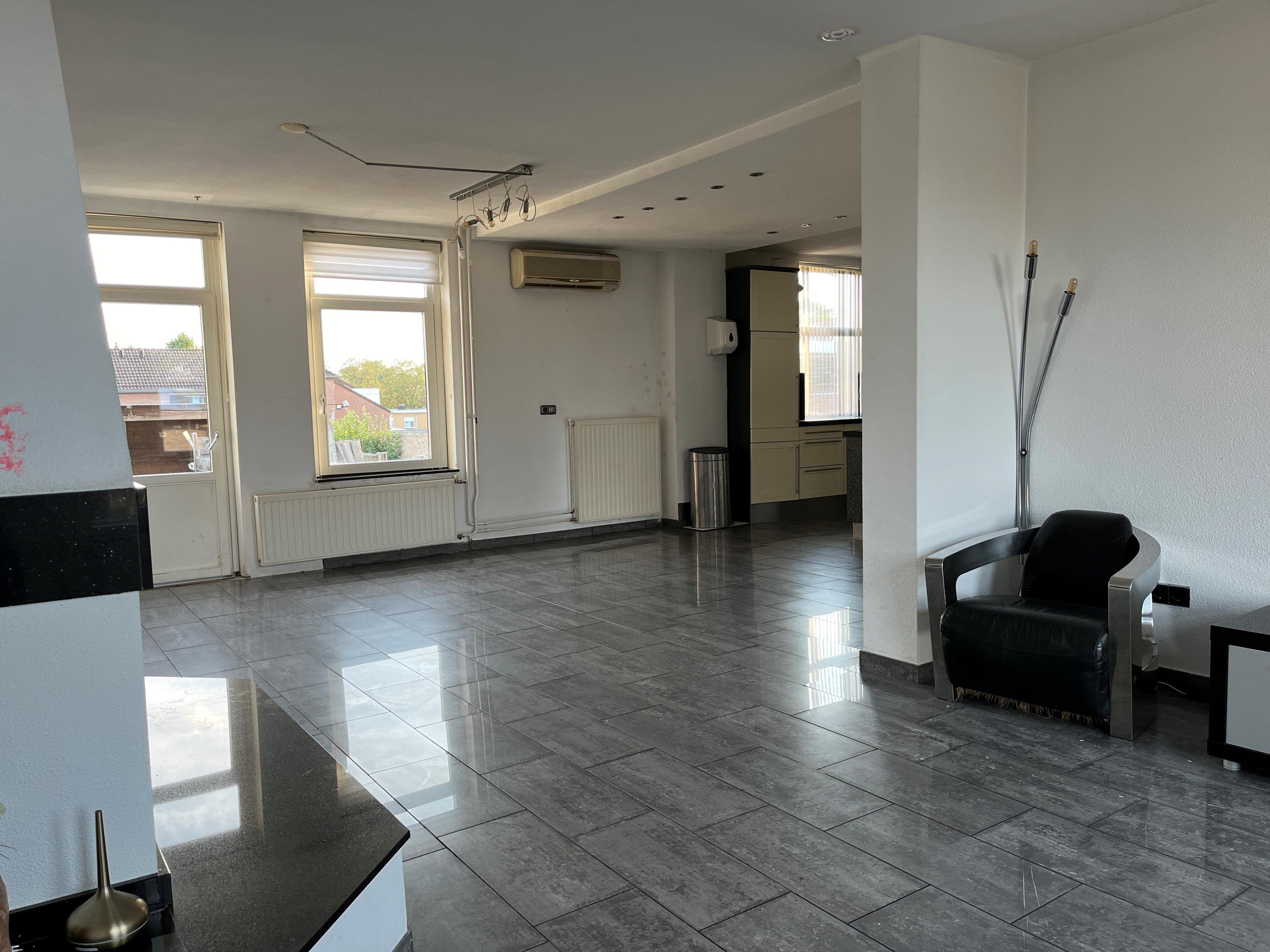 De woonkeuken en kamer lopen geheel in elkaar over en zijn voorzien van een marmeren tegelvloer. Vanuit de woonkamer bereikt u twee slaapkamers.