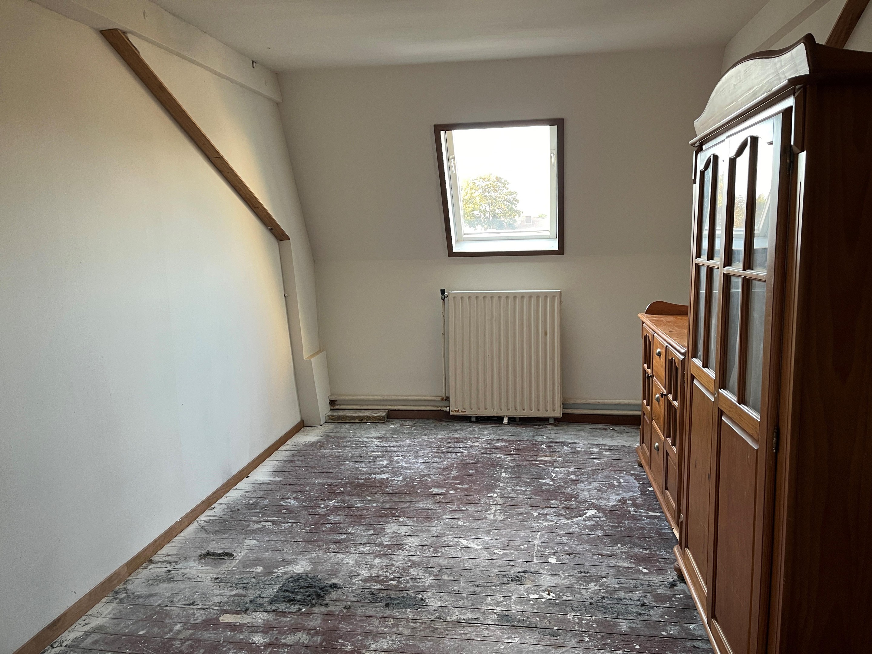 Deze leefruimte/woonkamer is aan de voorzijde voorzien van een dakkapel. Aan de achterzijde is een verstelbaar raam . Doorgang naar de badkamer en toilet.