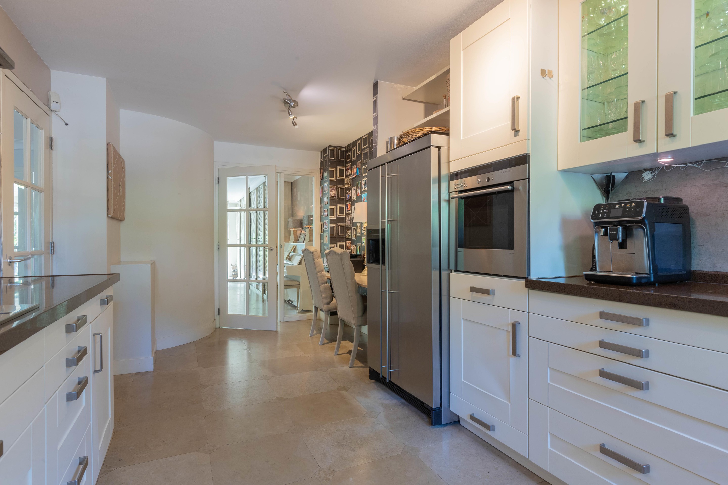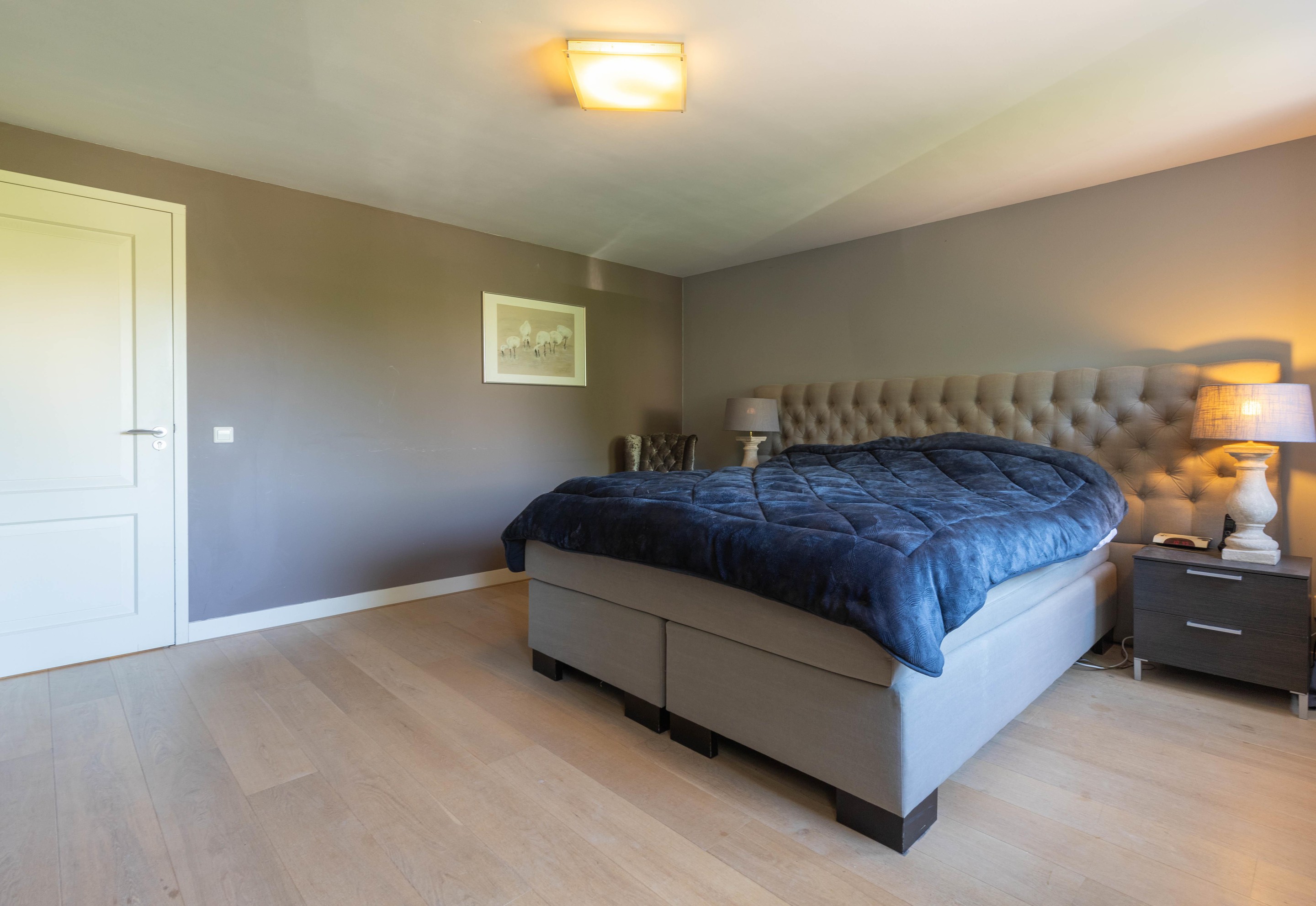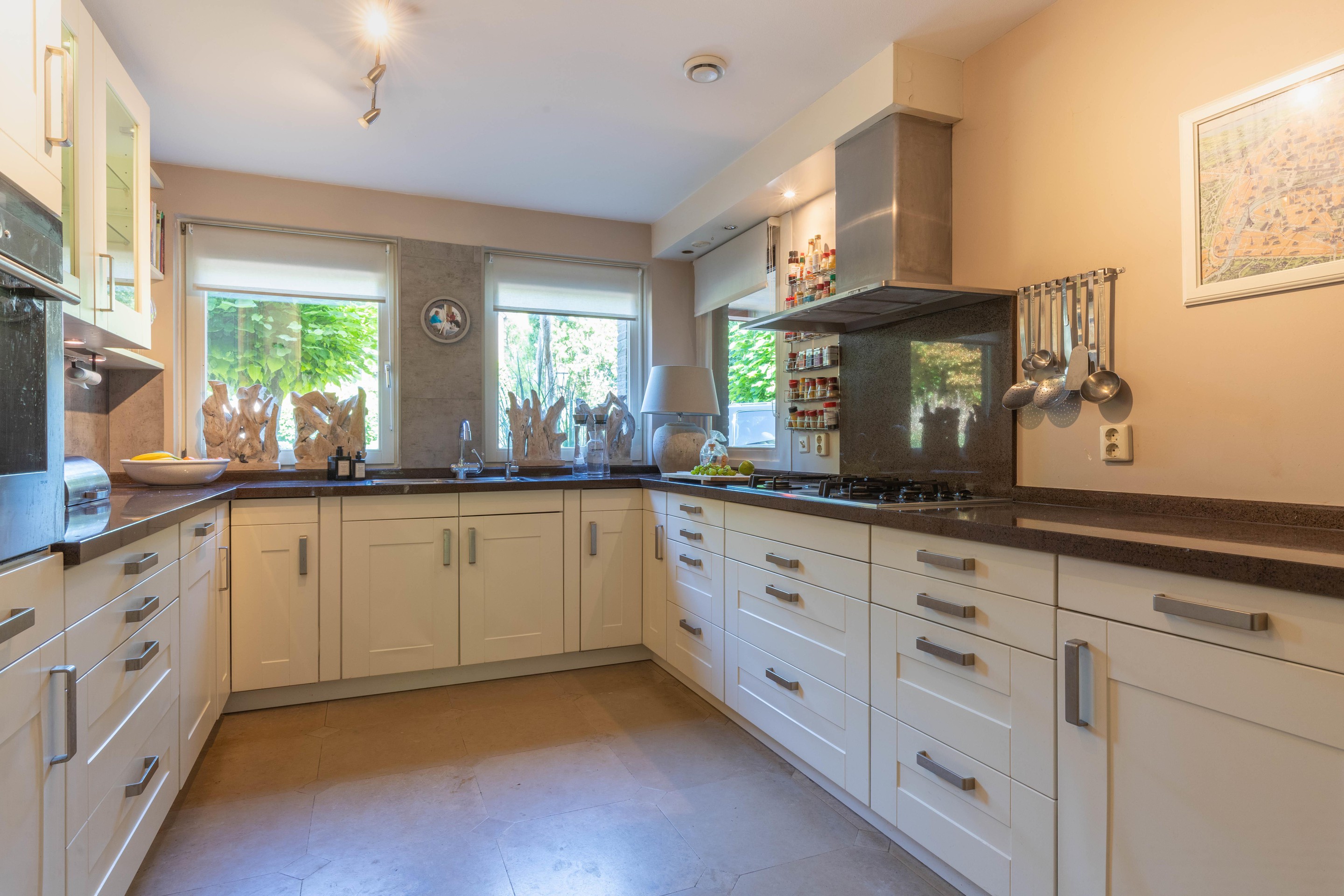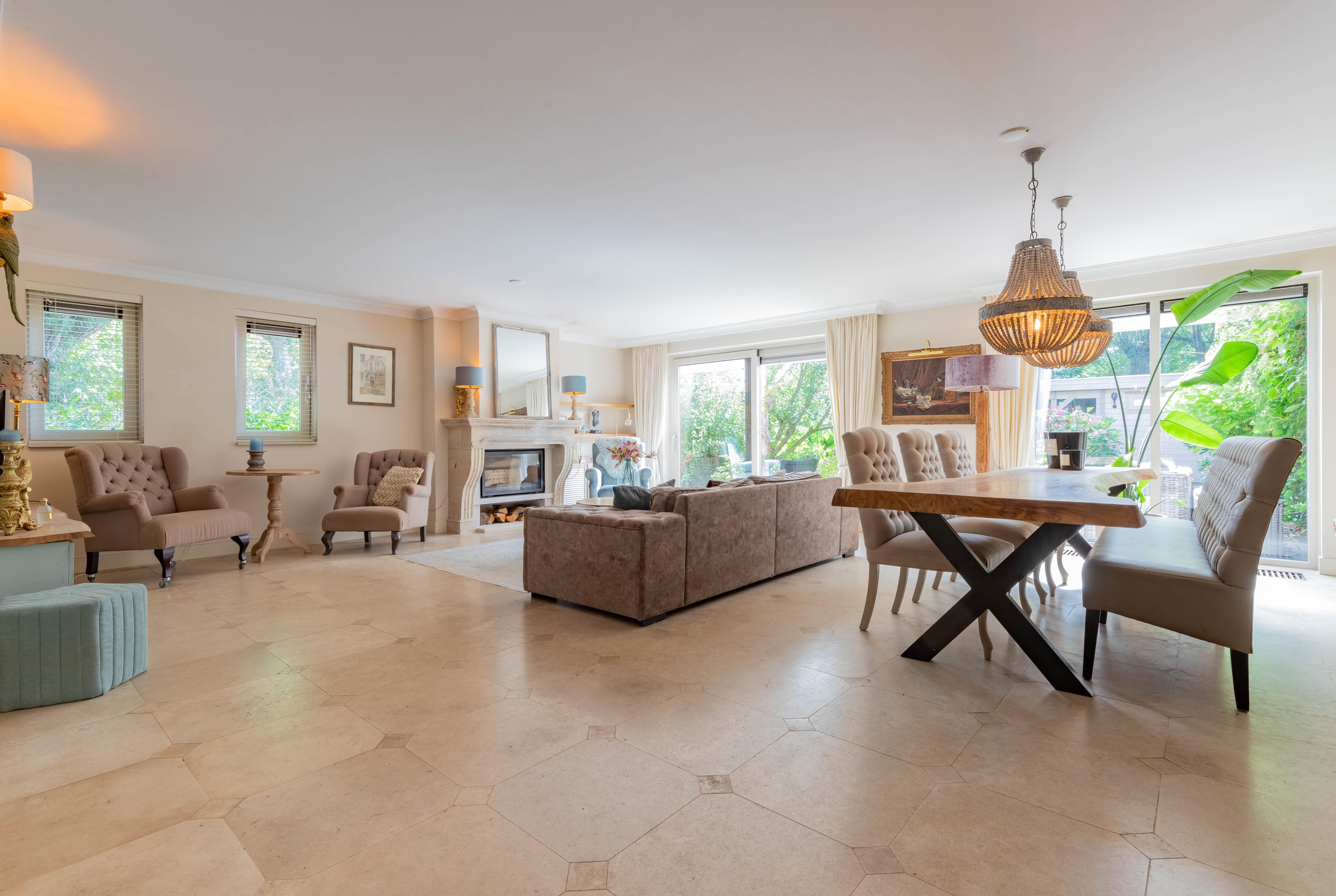 Zowel de hal, de woonkamer als de keuken zijn voorzien van vloerverwarming en een fraaie natuurstenen vloer, wat zorgt voor een aangename warmte en een stijlvolle, uniforme uitstraling. De royale woonkeuken is voorzien van diverse inbouwapparatuur, een ruim werkblad en veel kastruimte. De ruime woonkamer vormt het hart van het huis, waar licht en ruimte harmonieus samenkomen. Grote ramen bieden een prachtig uitzicht op de groene tuin en zorgen voor een aangename, natuurlijke lichtinval. " De woonkamer is verder uitgerust met een schuifpui die toegang biedt tot de fraai aangelegde, zonnige tuin. Hier kunt u ’s ochtends heerlijk ontbijten in één van de knusse zitjes, of na een dag hard werken ontspannen met een goed glas wijn. Binnen vindt u bovendien een fraaie open haard met hoog rendement, afgewerkt met een karakteristieke kalkzandstenen schouw – perfect voor extra sfeer en warmte tijdens de koudere maanden.