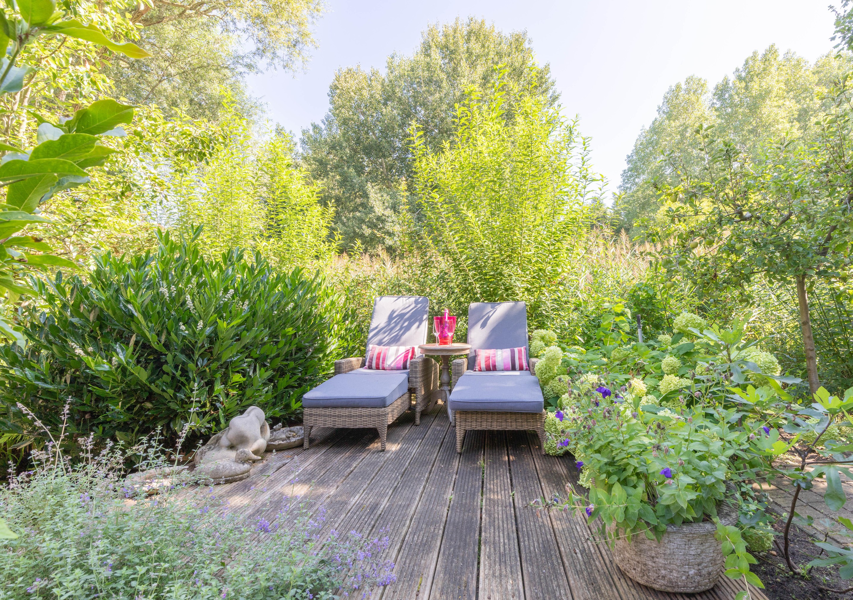 Tuin De fraai aangelegde, zonnige tuin biedt voor elk moment van de dag een fijne plek. In de ochtend kunt u er heerlijk ontbijten in één van de knusse zitjes, terwijl u ’s avonds, na een dag hard werken, ontspannen geniet van een goed glas wijn.