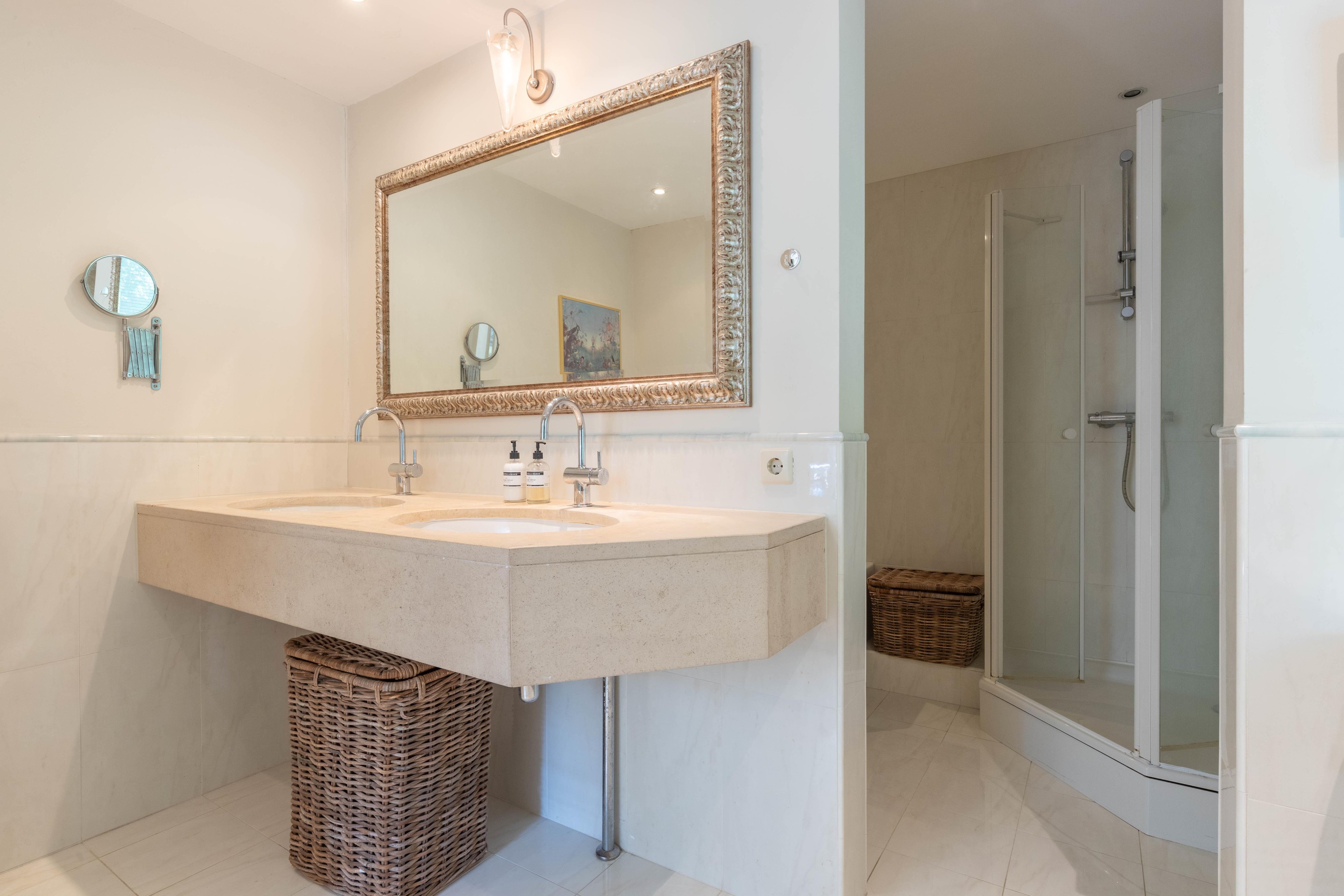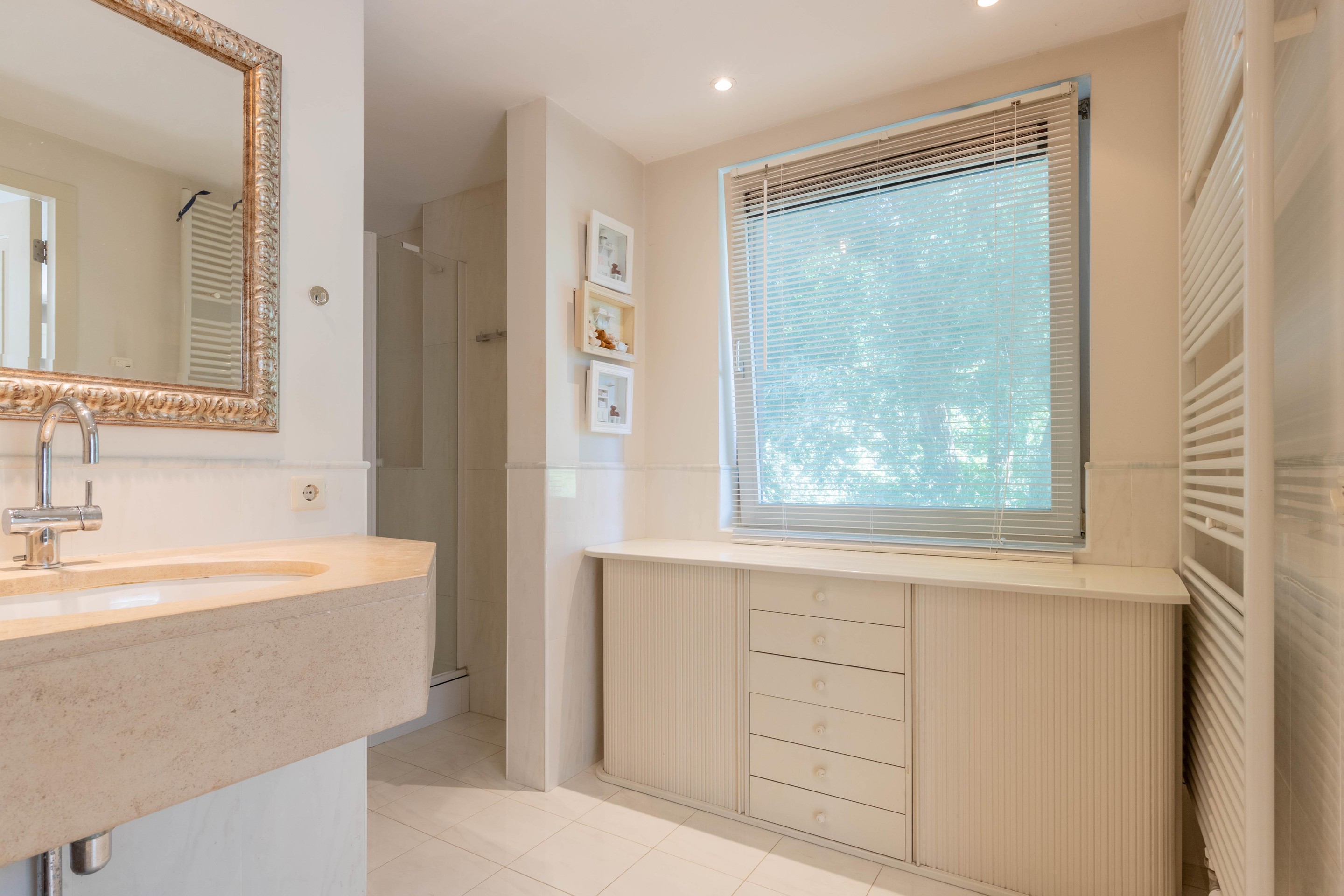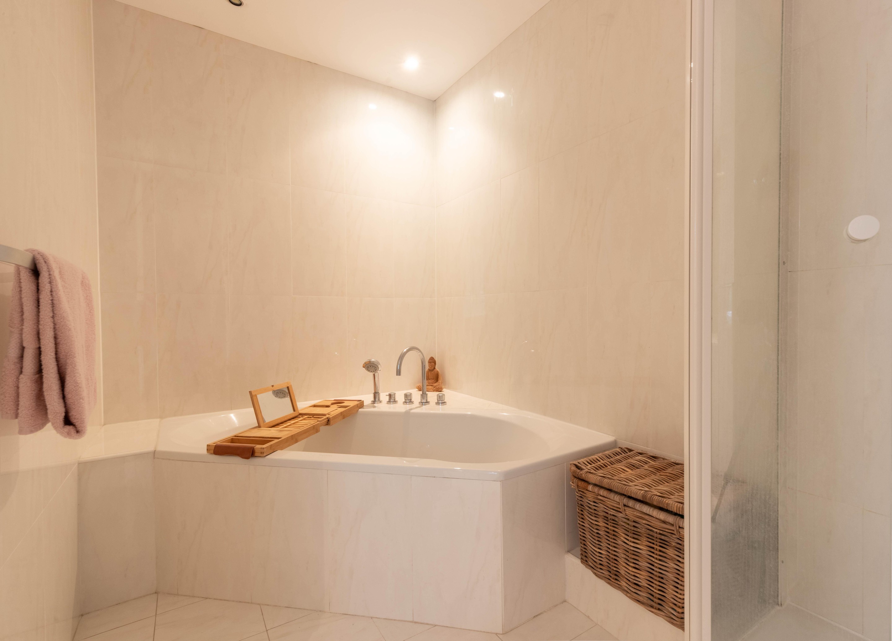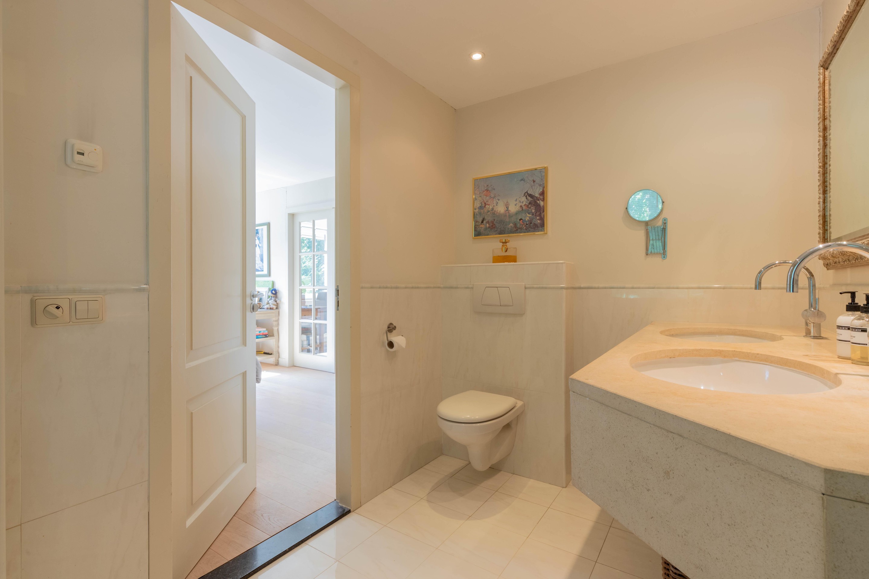 Aan de achterzijde bevindt zich de indrukwekkende ruime master bedroom, Direct verbonden met de master bedroom vindt u een royale badkamer, voorzien van een dubbele wastafel, een zwevend toilet, een ligbad en een douchecabine , de ideale plek om in alle rust te ontspannen.