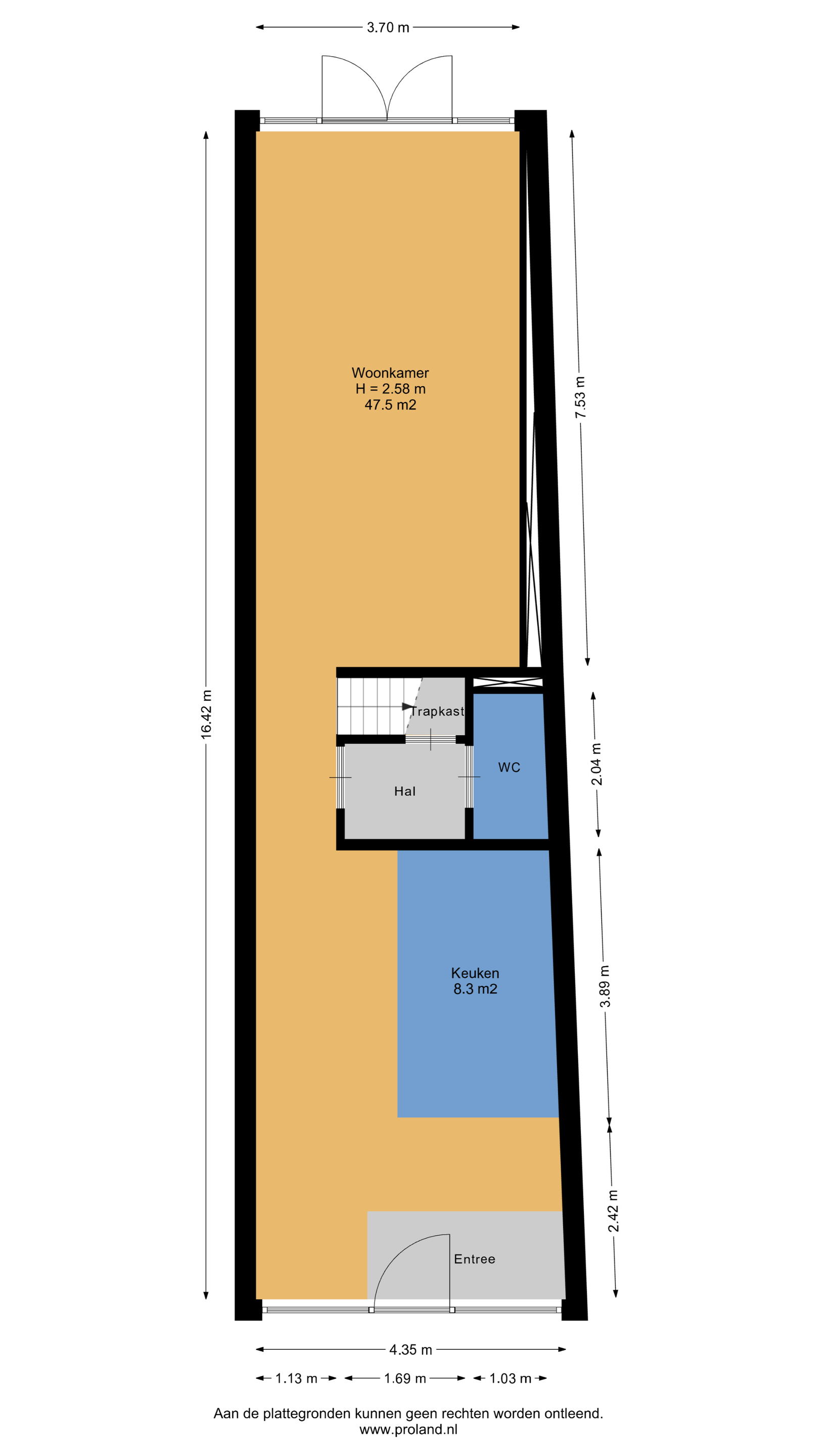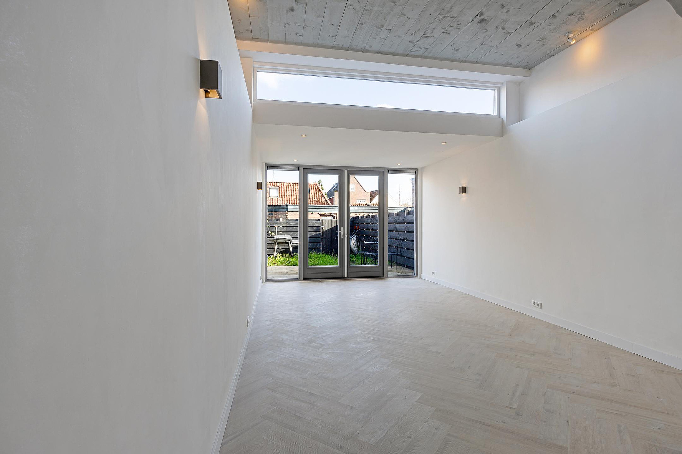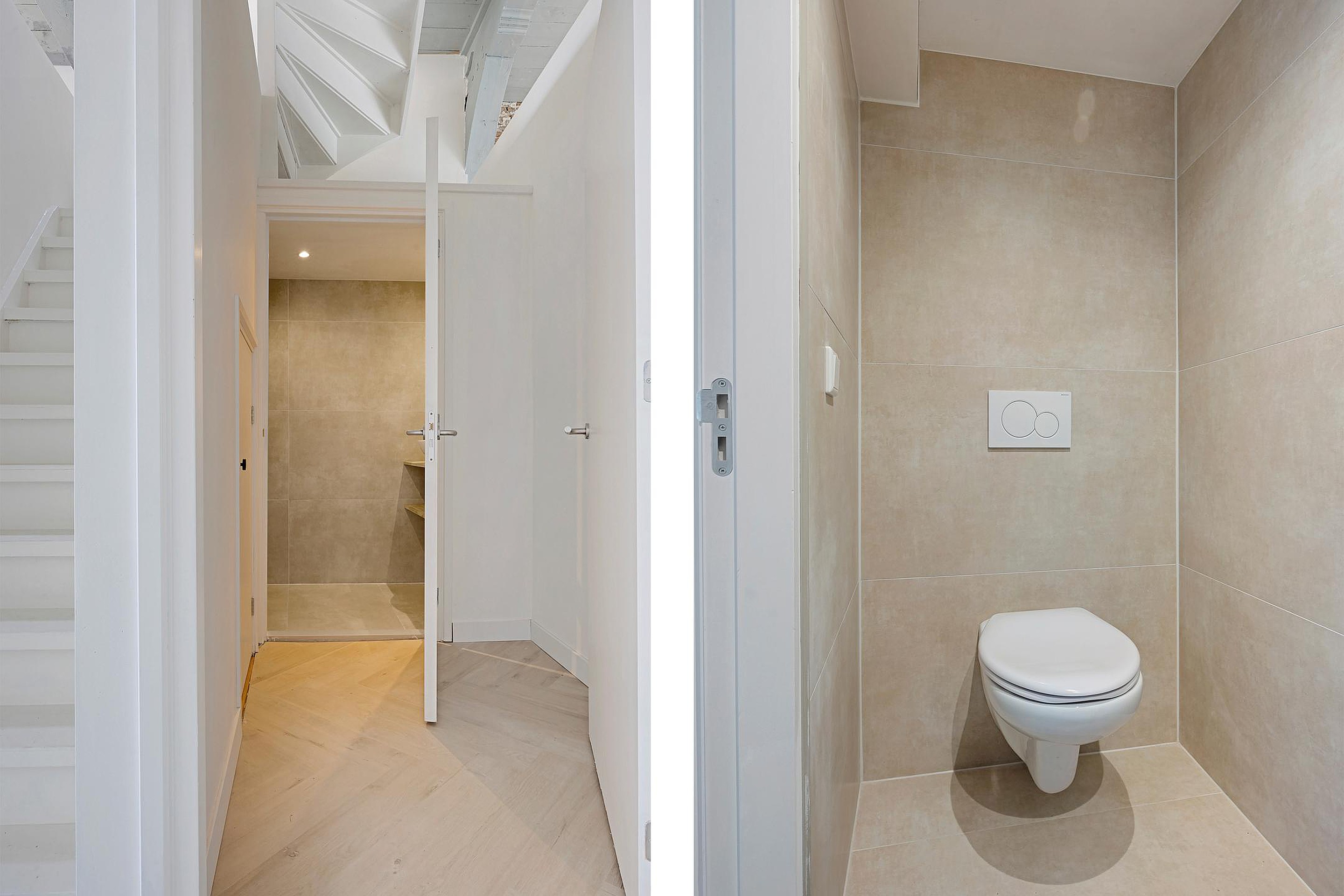 De begane grond is slim opgedeeld in twee delen, door in een tussengedeelte een vaste trap naar de eerste verdieping te realiseren, met onder de trap het moderne toilet met wastafelmeubel. Aan de achterzijde bevindt zich de woonkamer, die extra veel lichtinval heeft door de gerealiseerde lichtstraat. Ook zijn hier recent openslaande deuren naar de achtertuin geplaatst.