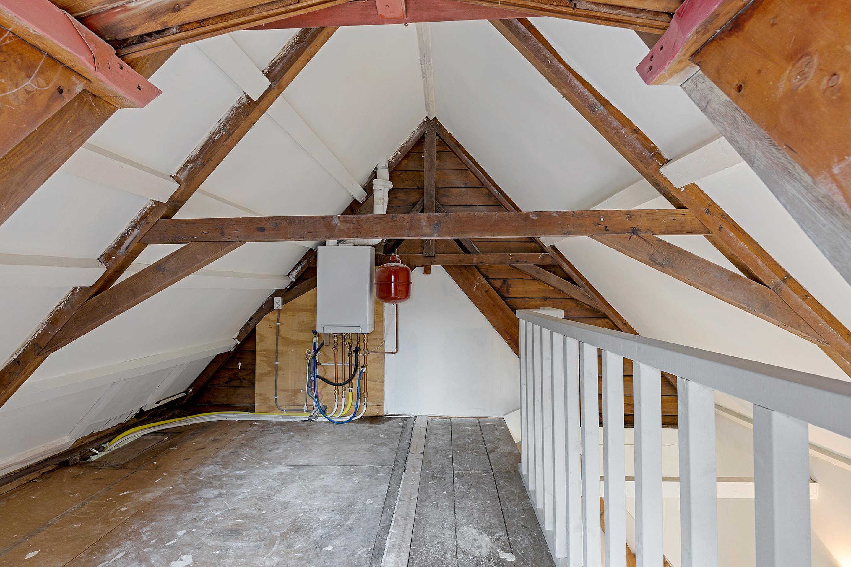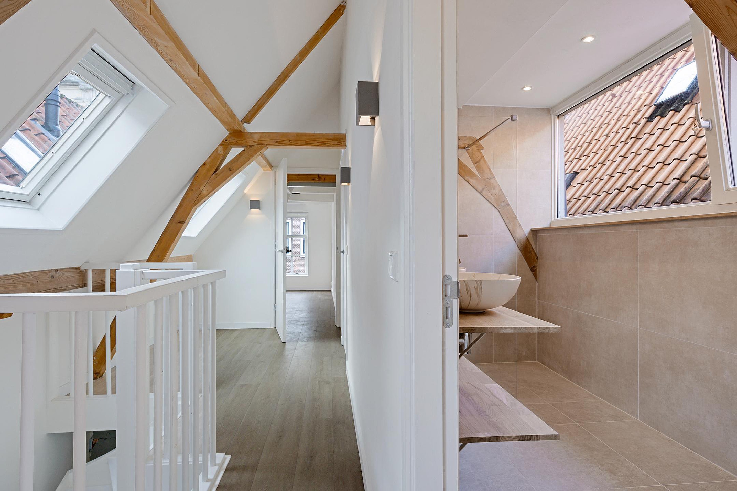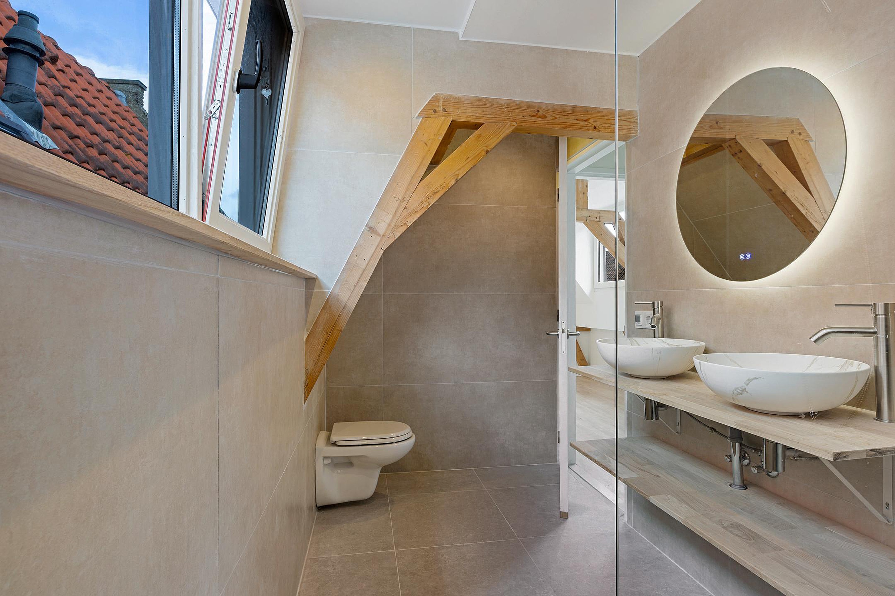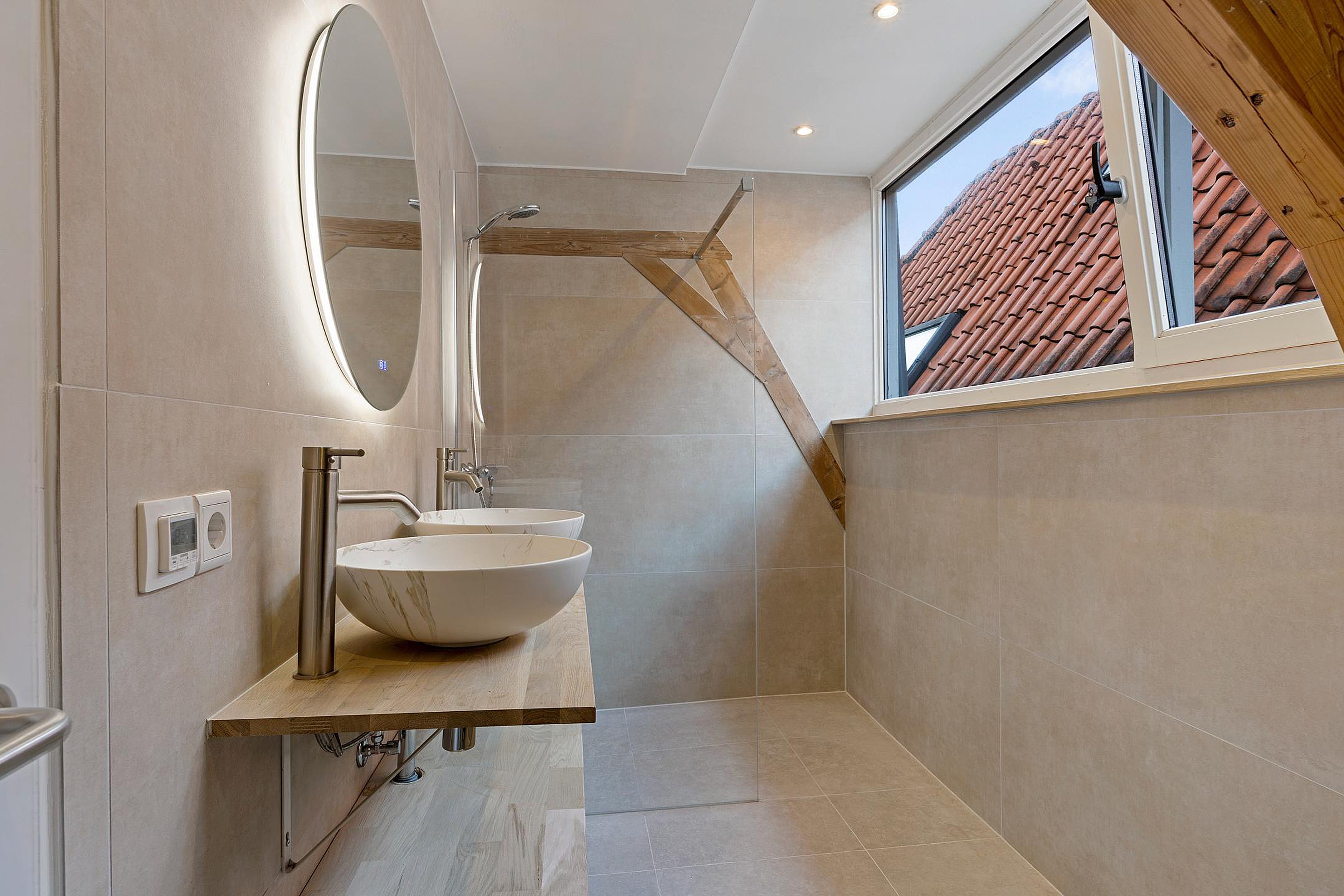 De overloop op de eerste etage heeft daglicht dankzij de dakramen en ook hier is de combinatie van oud met nieuw mooi zichtbaar. Ook op deze etage is het comfortabel dankzij vloerverwarming onder de houtlook vloer. Vanaf de overloop bereik je alle vertrekken. De ouderslaapkamer is gelegen aan de rustige achterzijde. De fraaie dakconstructie is hier in het zicht gelaten. Aan de voorzijde bevinden zich 2 ruime slaapkamers, waarvan één met een verrassende trap naar de nokverdieping. Hierdoor is een mooie extra ruimte gecreëerd: een leuke slaapplek of speelplek voor de kinderen. Hier is ook de Cv-ketel te vinden (Intergas, 2025). De moderne badkamer heeft een royale inloopdouche, dubbele wastafel en een tweede toilet. Tot slot is er aan de overloop nog een wasruimte gerealiseerd, met aansluiting voor wasmachine en droger.
