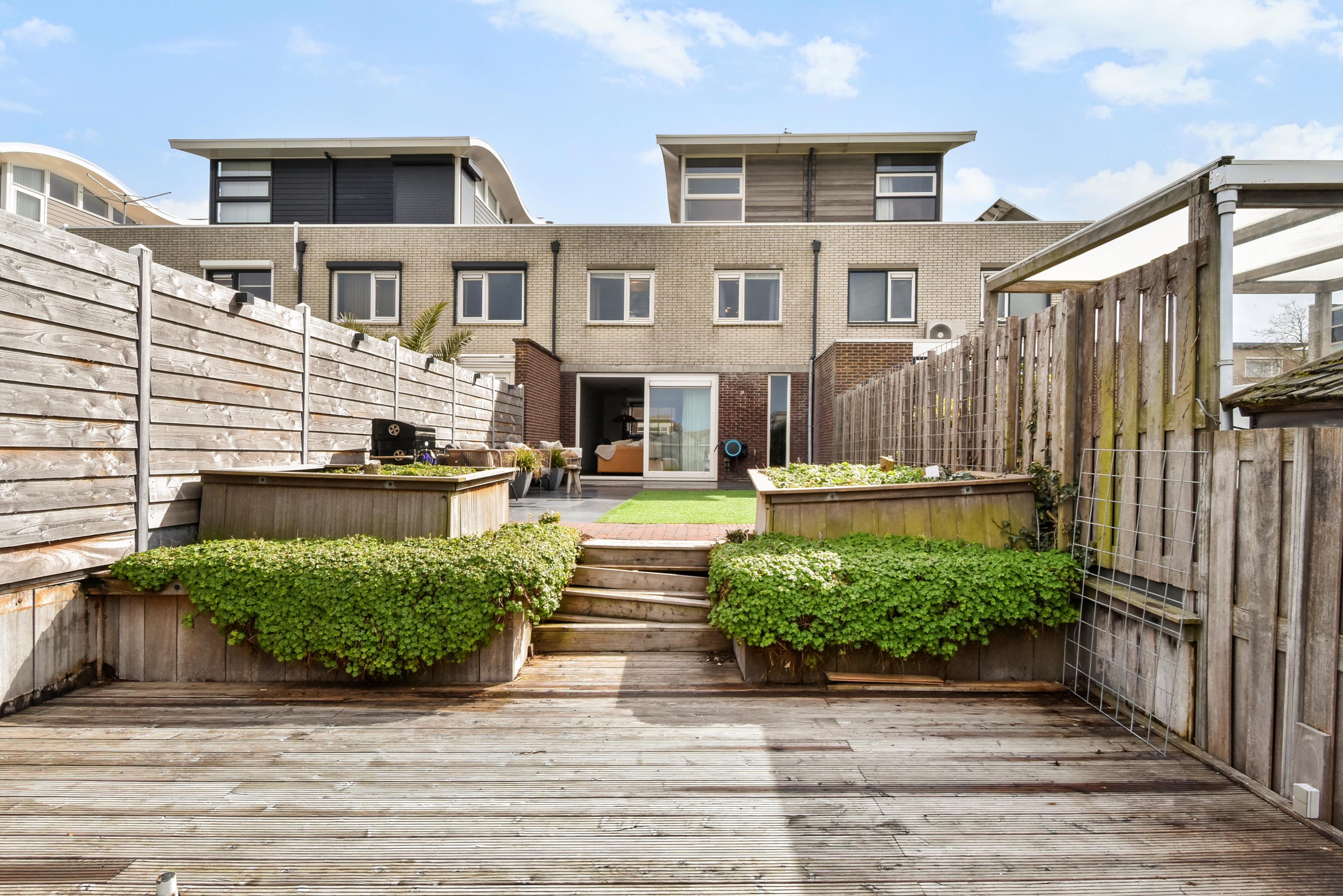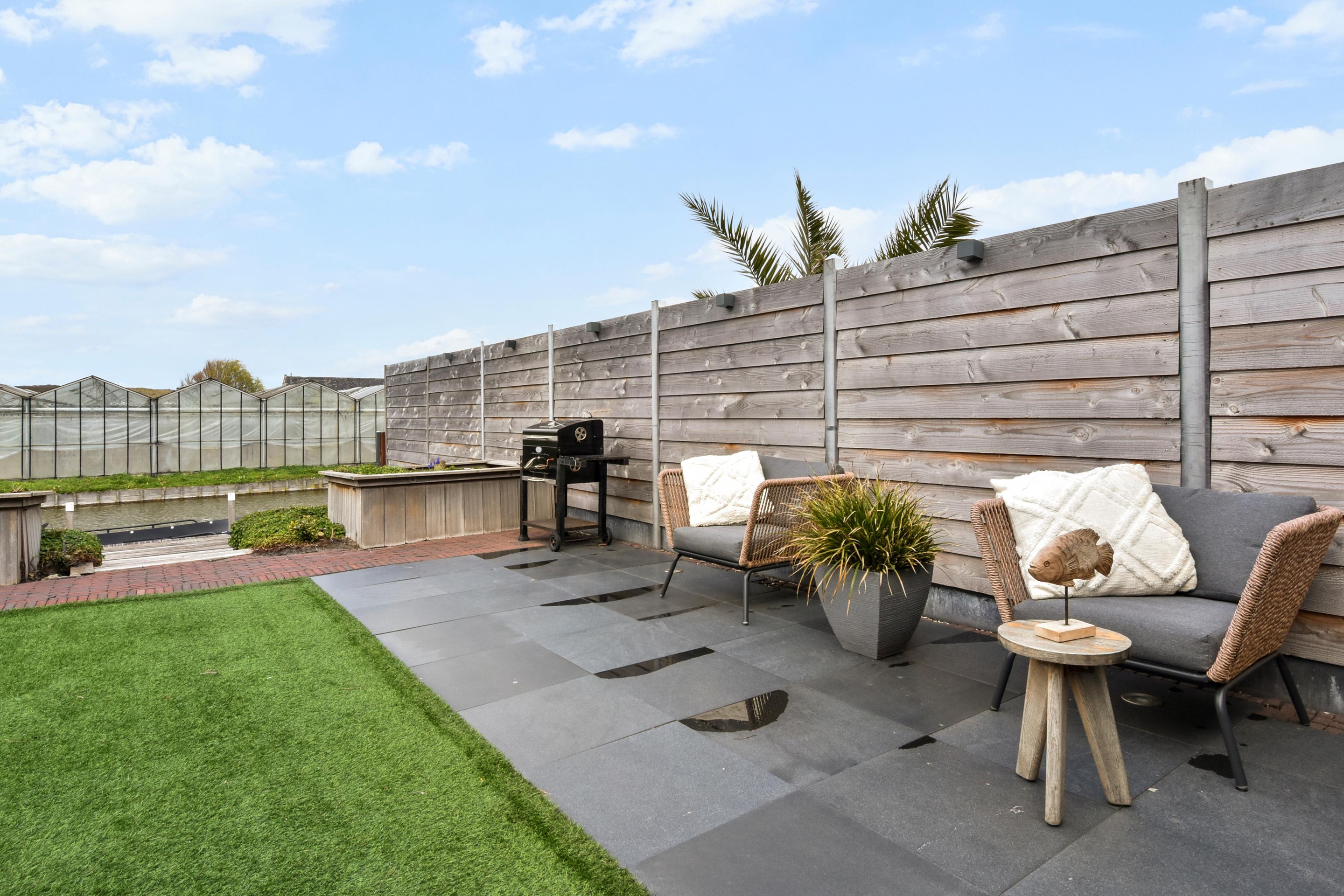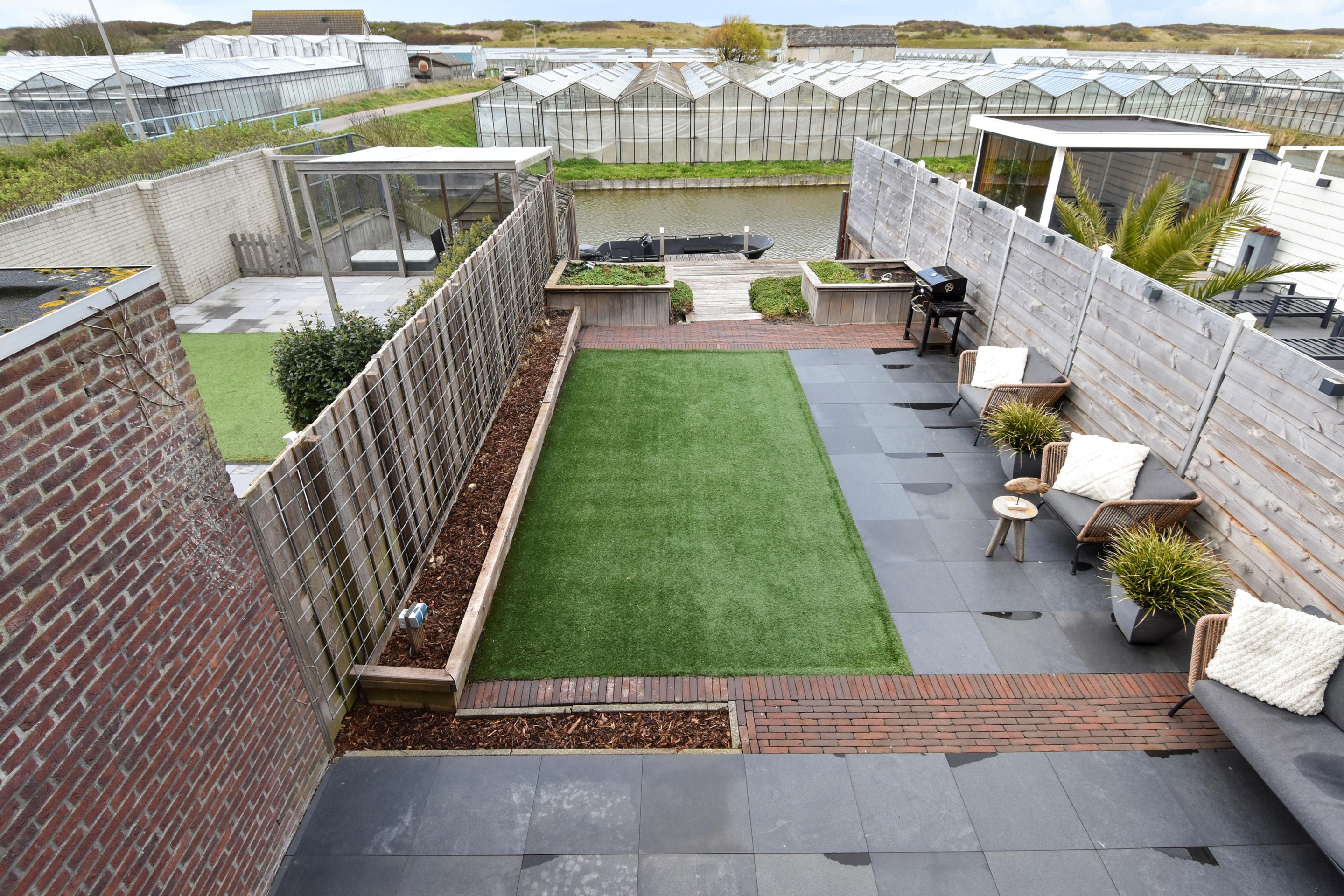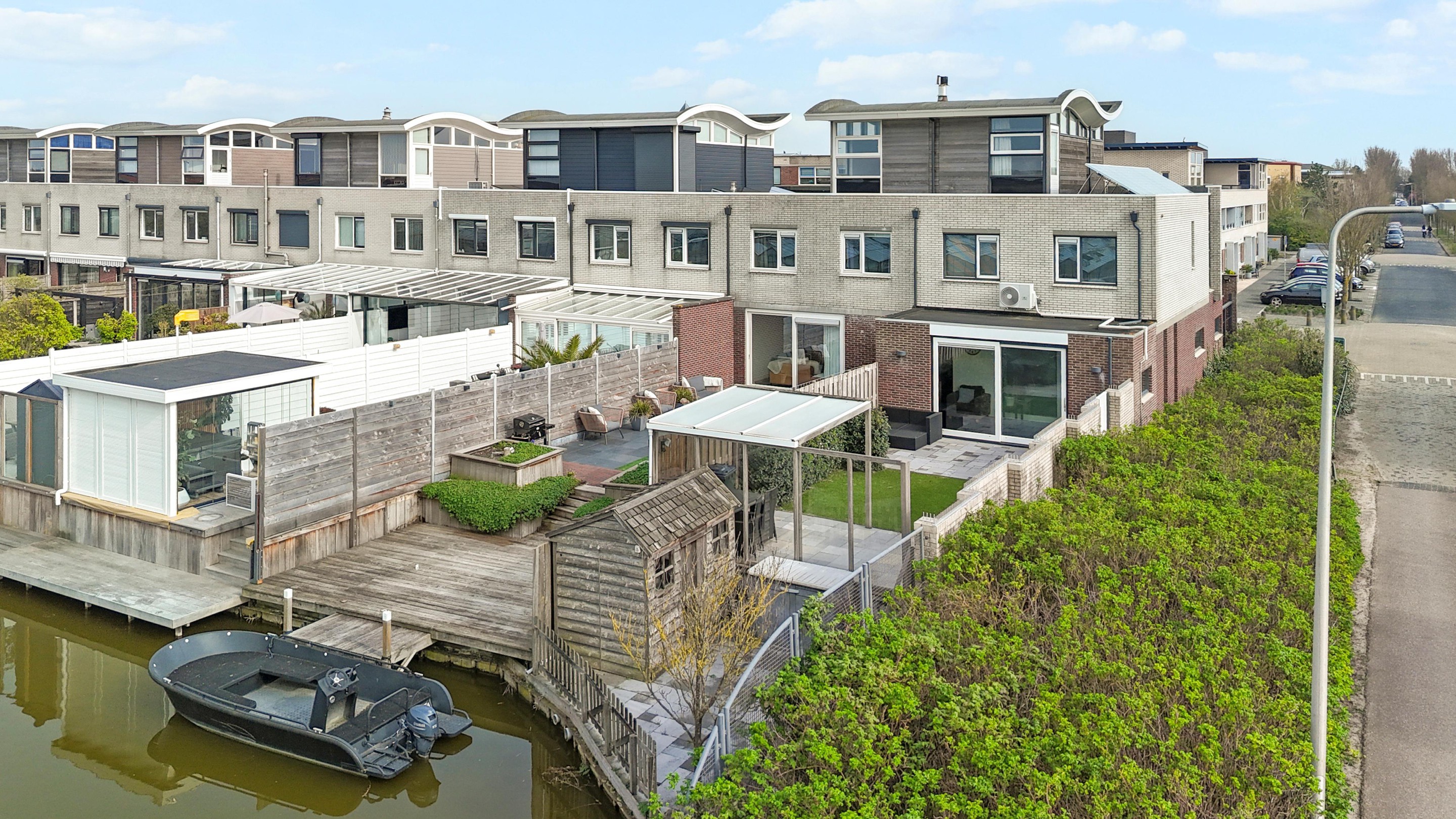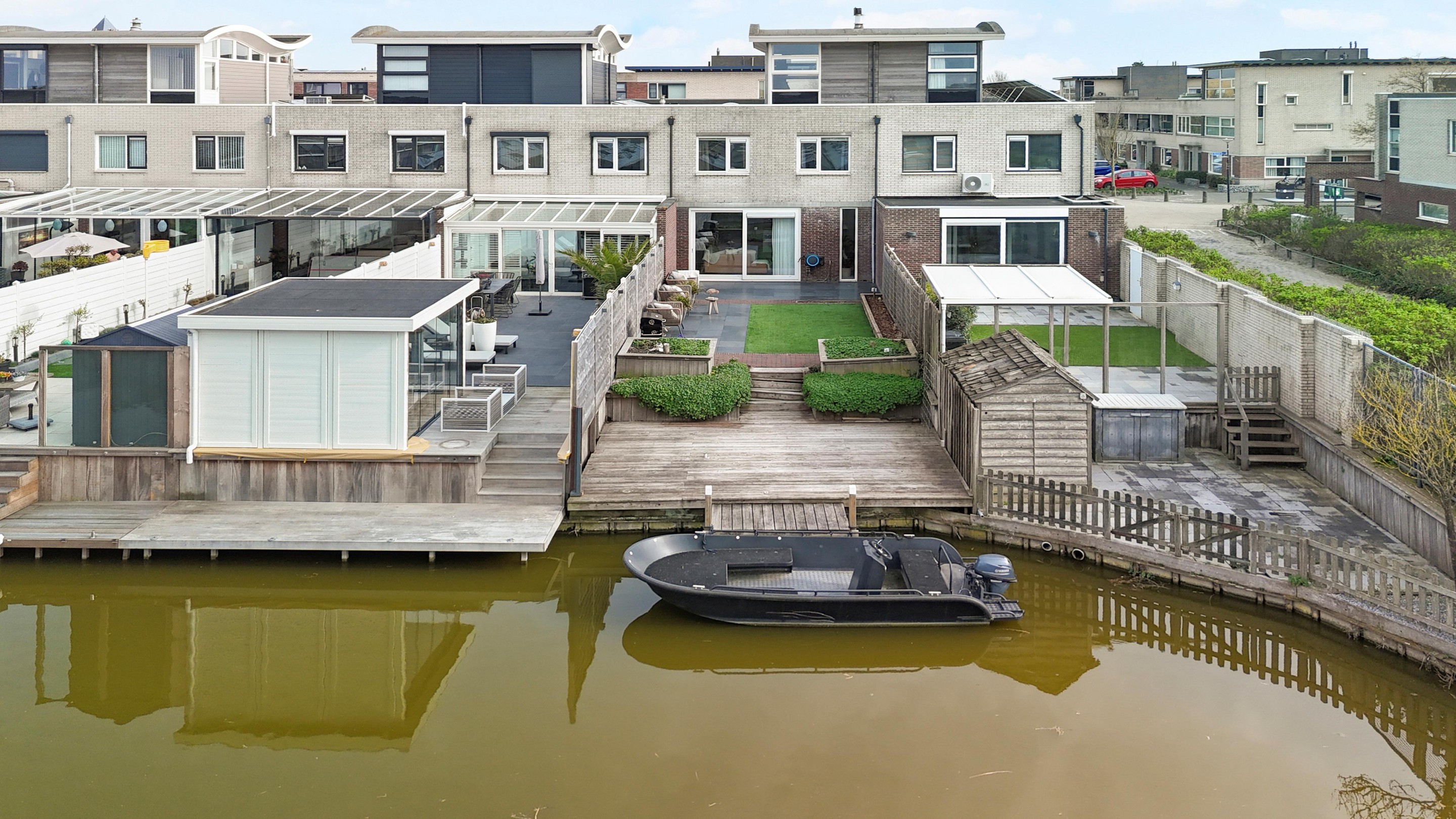 Via een schuifpui bereik je de verzorgd en zonnig aangelegde achtertuin waar je tot zonsondergang kunt genieten van de zon. De tuin is 17 meter diep en voorzien van een groot terras, meerdere zonplekken en een ruime vlonder met aanlegsteiger.