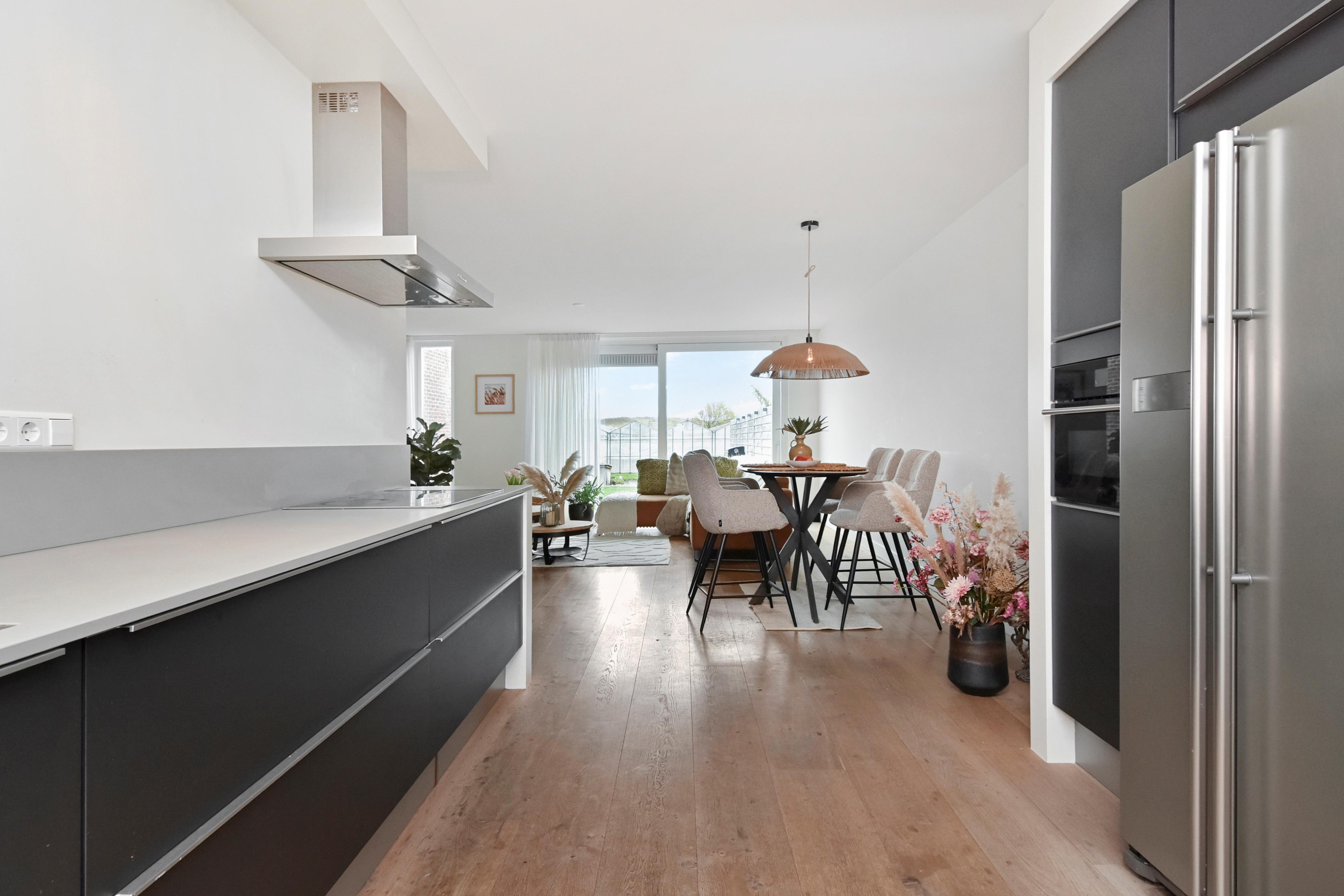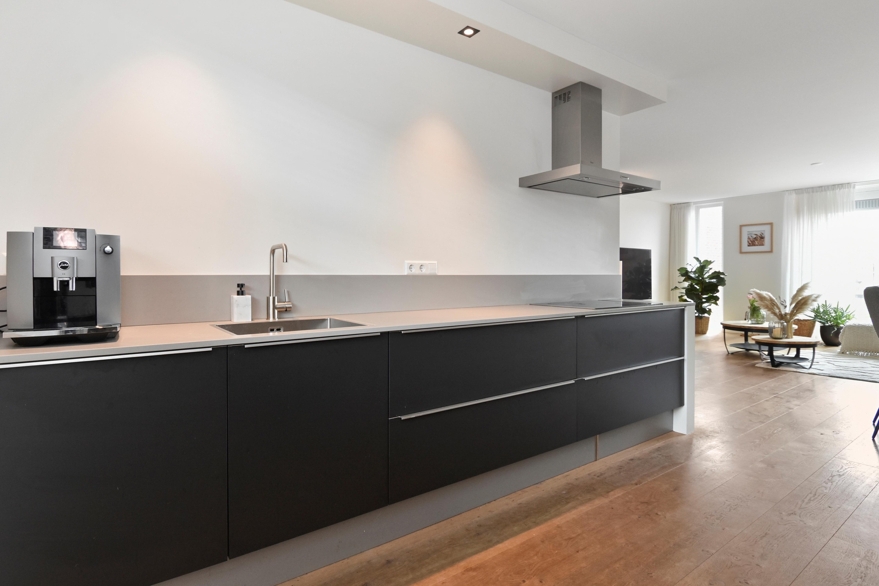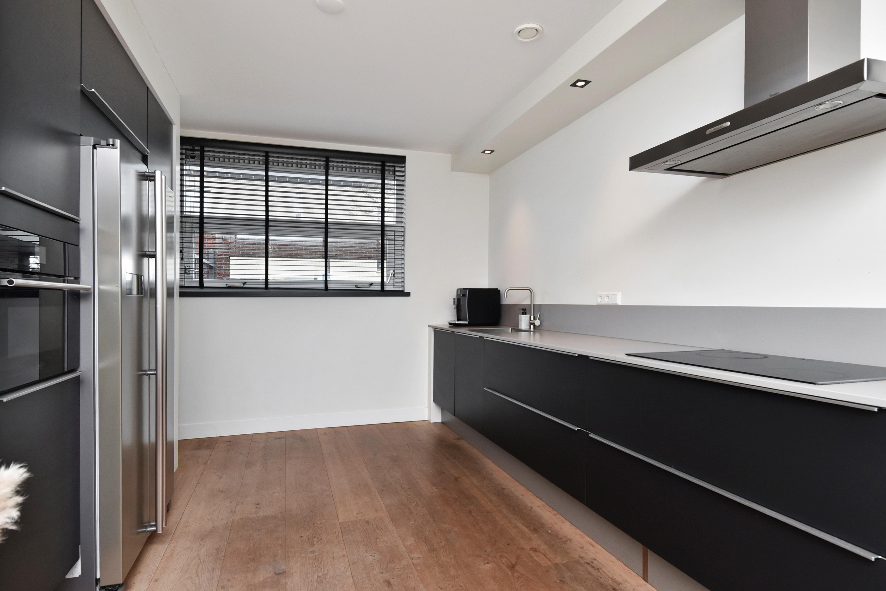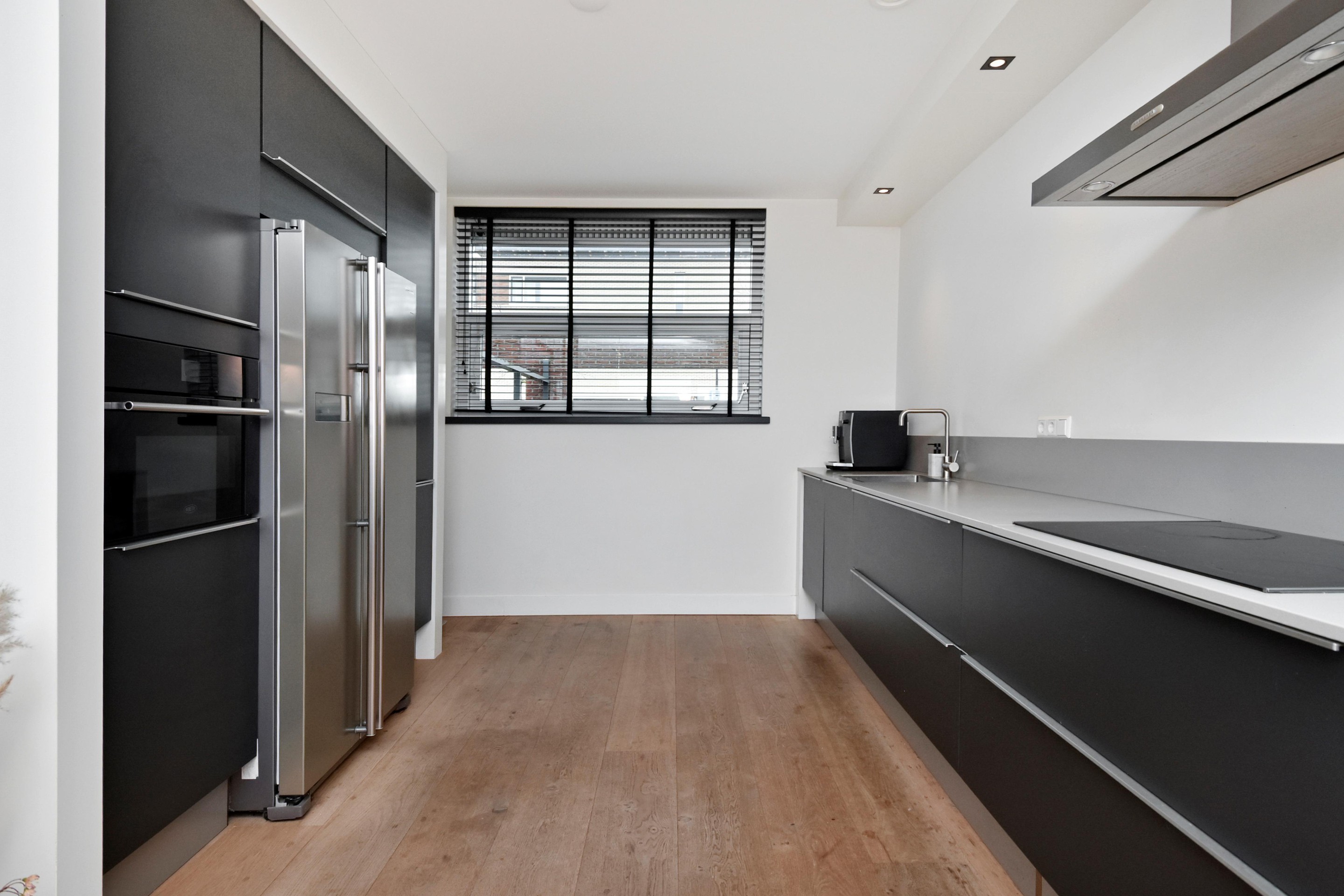 De woonkamer is goed afgewerkt met houtenvloeren, gestuucte wanden en plafonds en handige trapkast. De open keuken is te vinden aan de voorzijde en is door de breedte een ruim. De keuken is voorzien van combi-oven, grote koel-/vriescombinatie, inductiekookplaat met afzuigkap en vaatwasser.