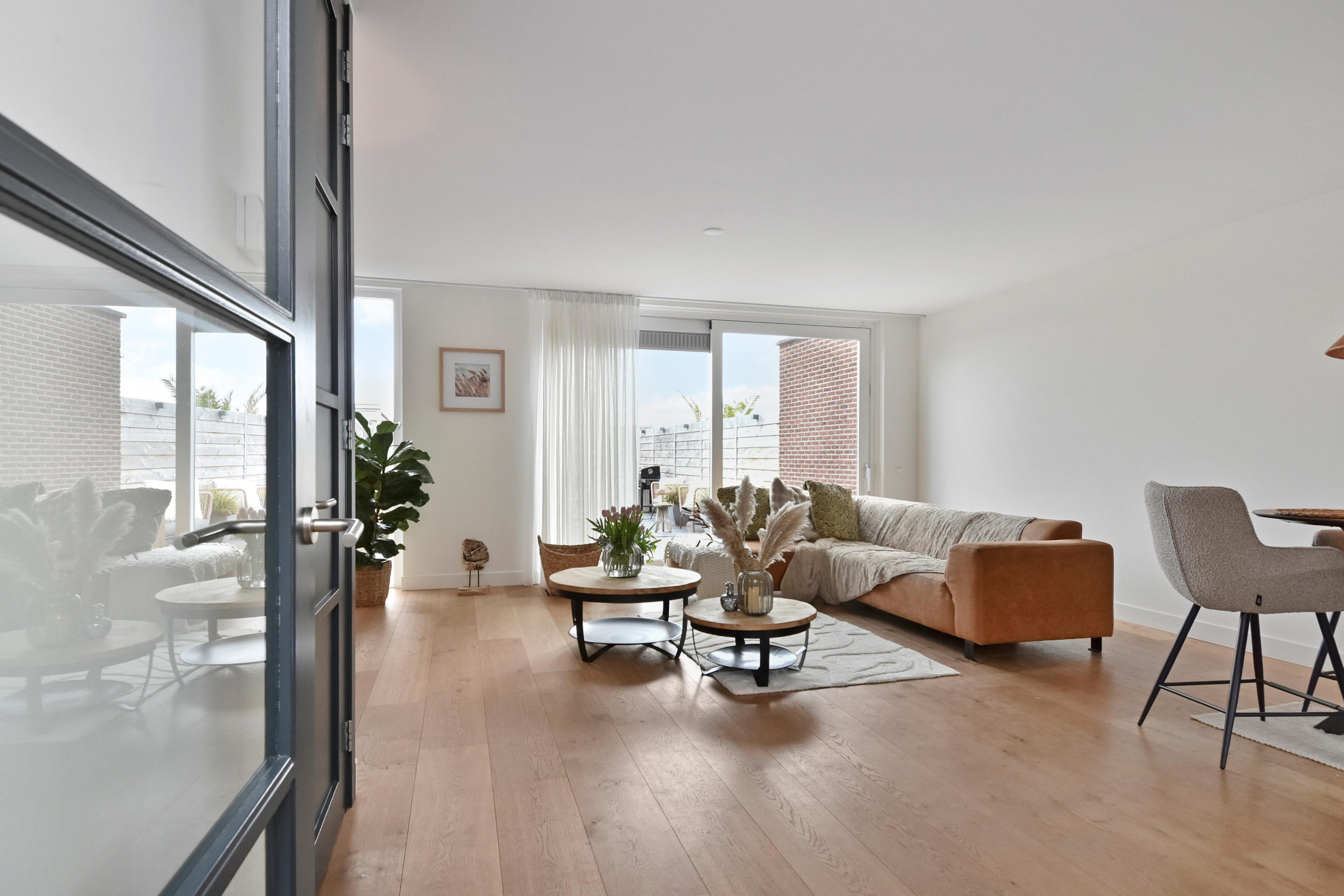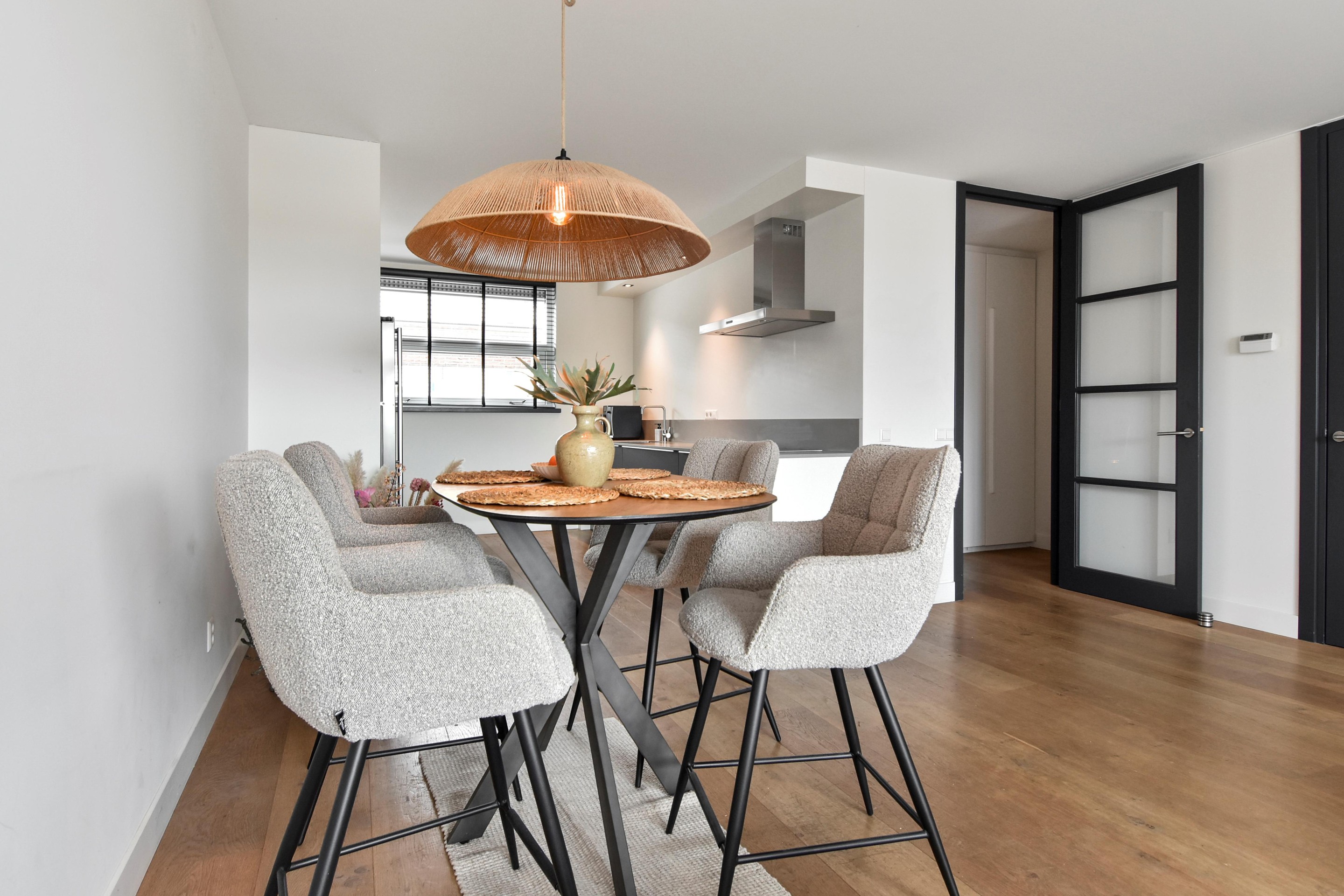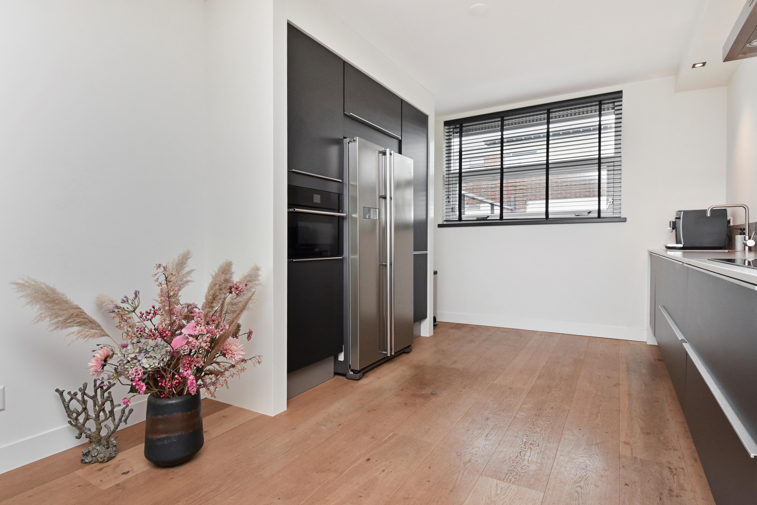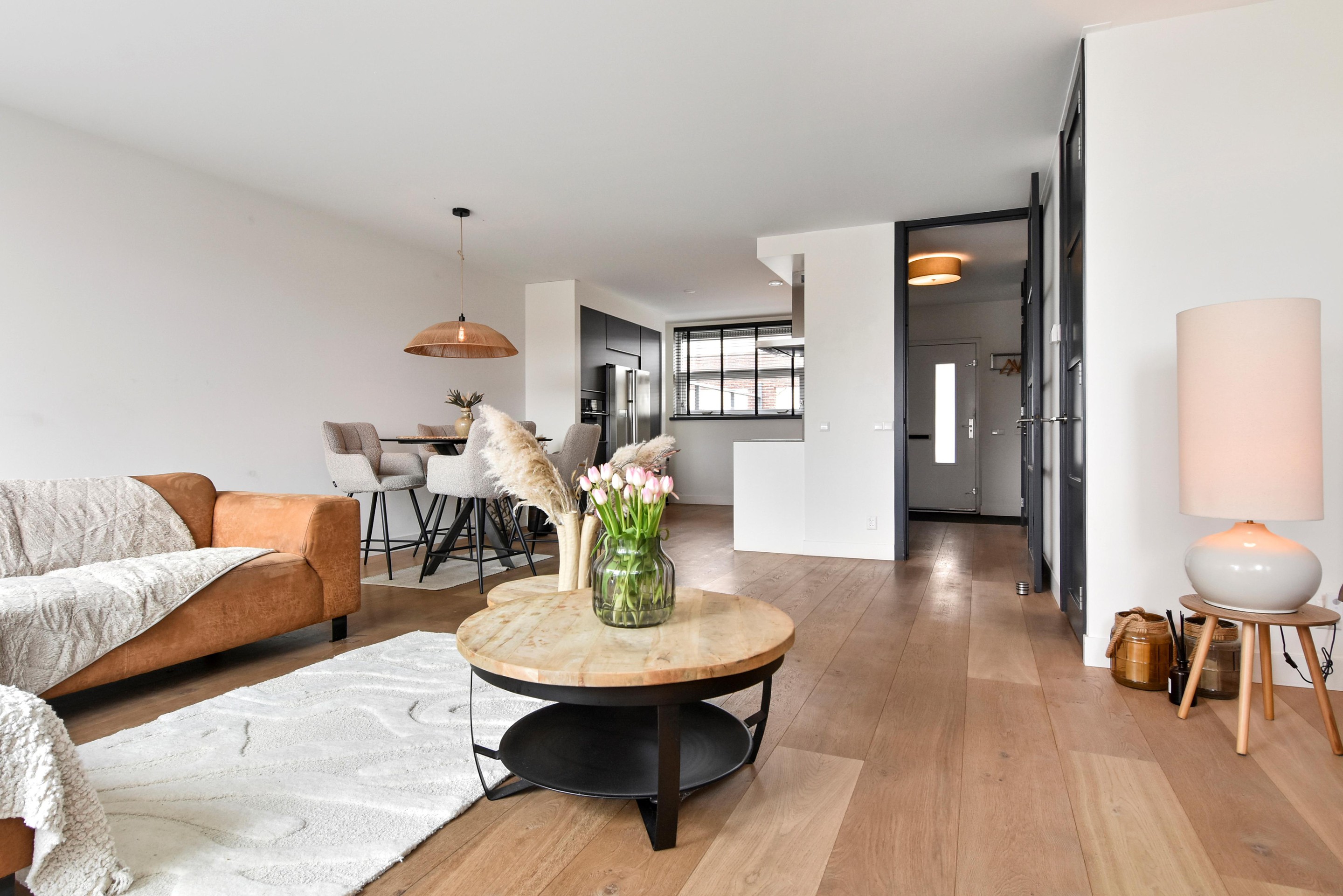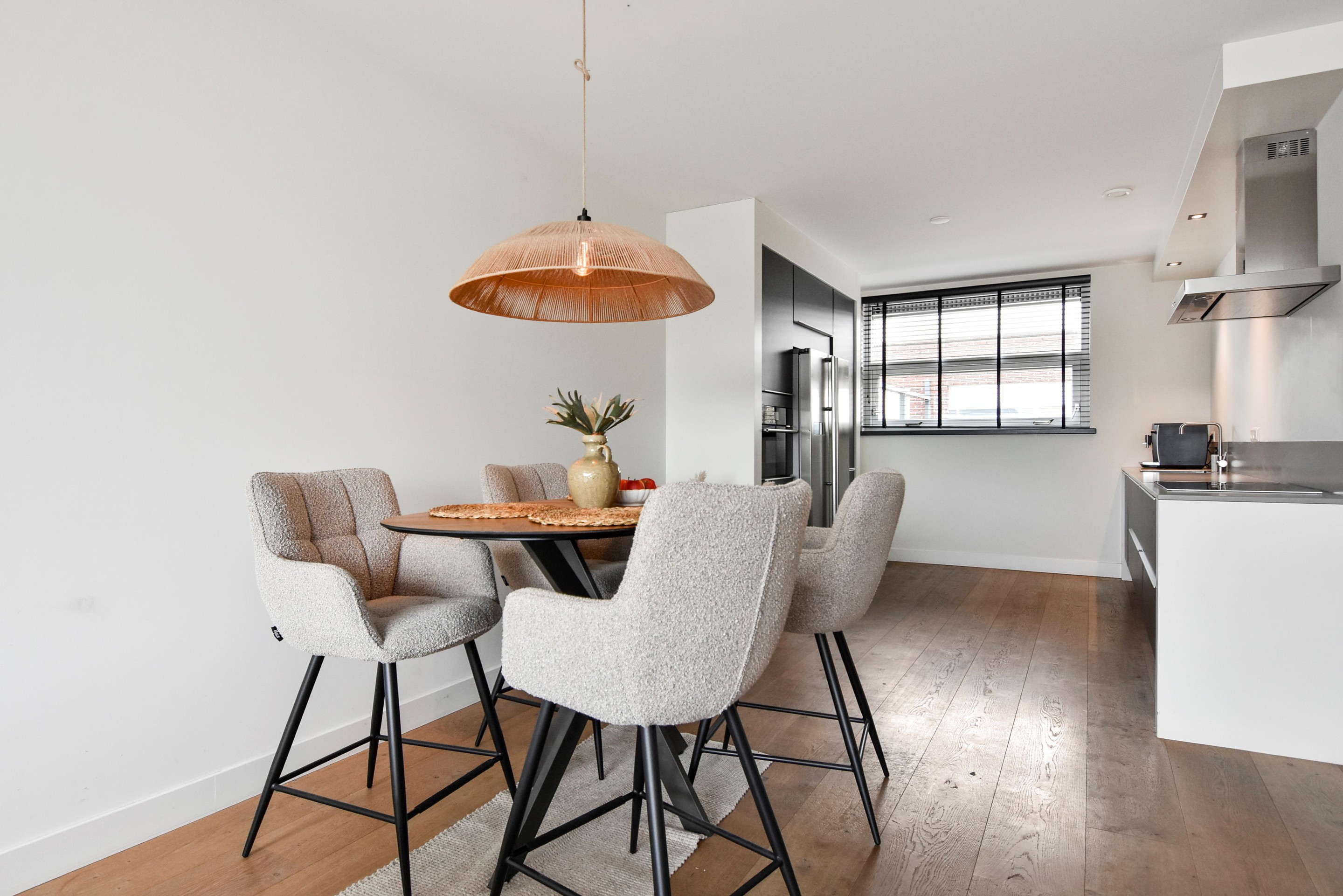 De woonkamer is goed afgewerkt met houtenvloeren, gestuucte wanden en plafonds en handige trapkast. De open keuken is te vinden aan de voorzijde en is door de breedte een ruim. De keuken is voorzien van combi-oven, grote koel-/vriescombinatie, inductiekookplaat met afzuigkap en vaatwasser.